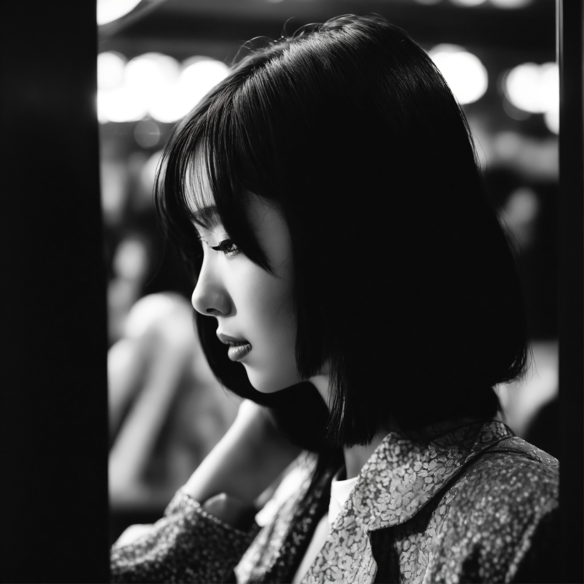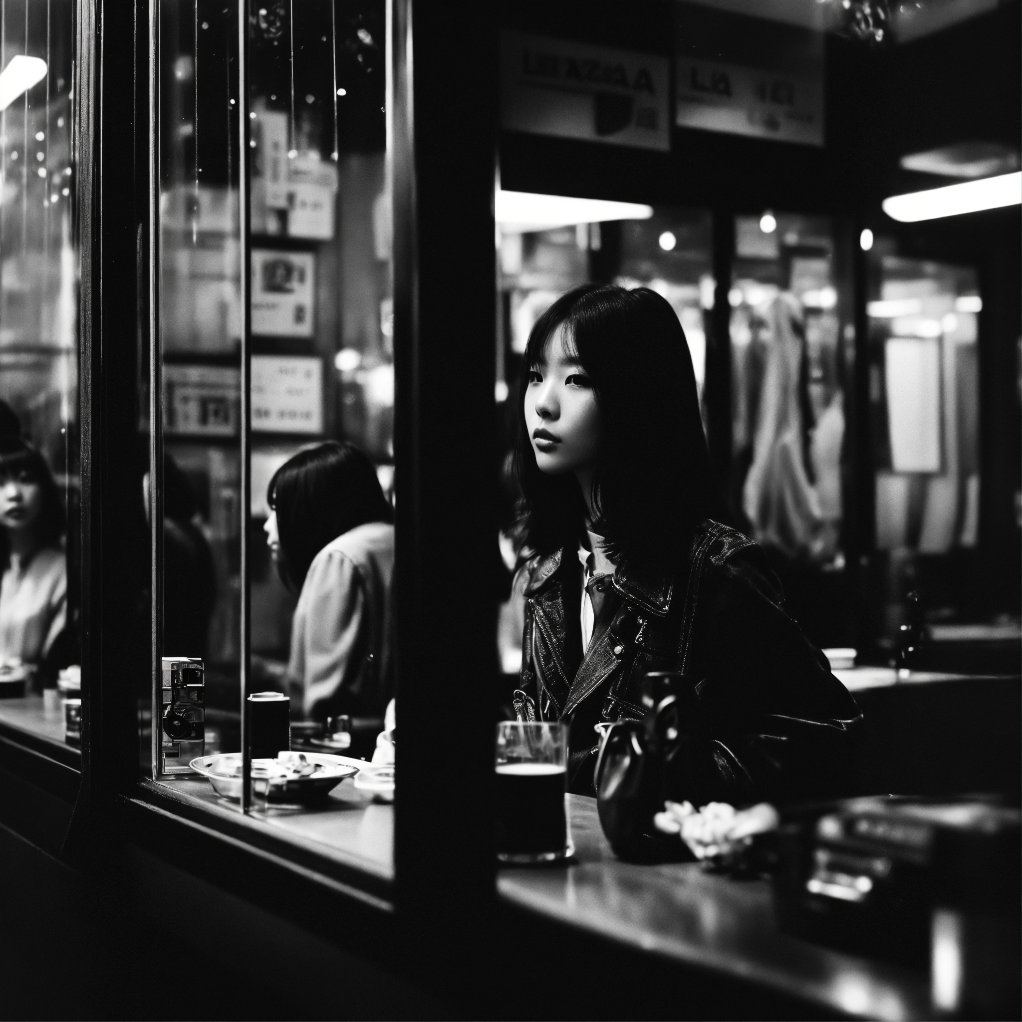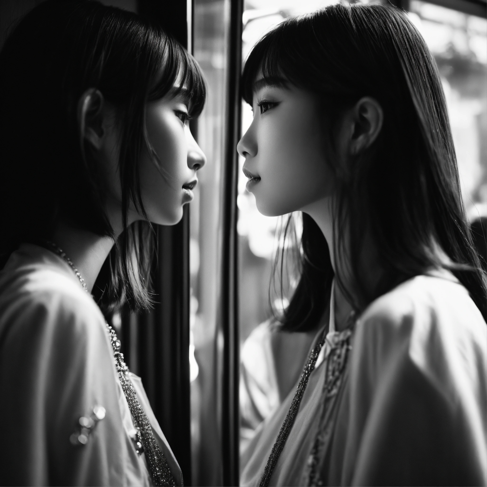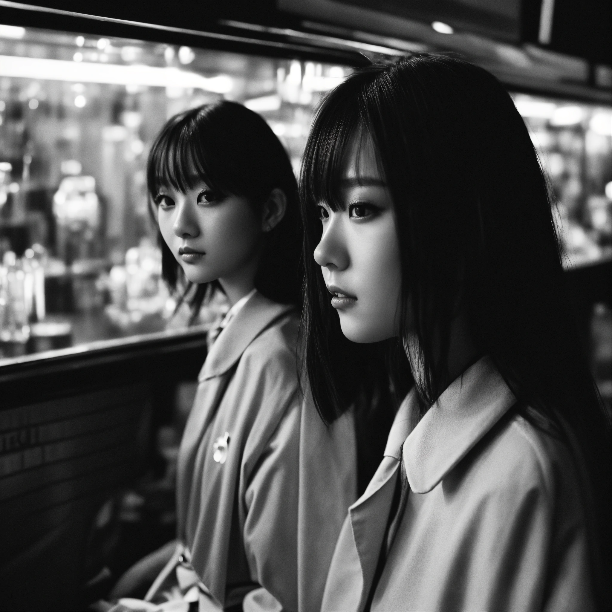 Extremely detailed photographic image, grained image, beautifully composed, monochrome image, 00's fashionable image, fashionable magazine photography, leica summicron 35mm f2.0, kodak 400tx, fashion photography, fashionable model, two beautiful japanese cute idol high school girls with close to face to face across the glass without any intimacy