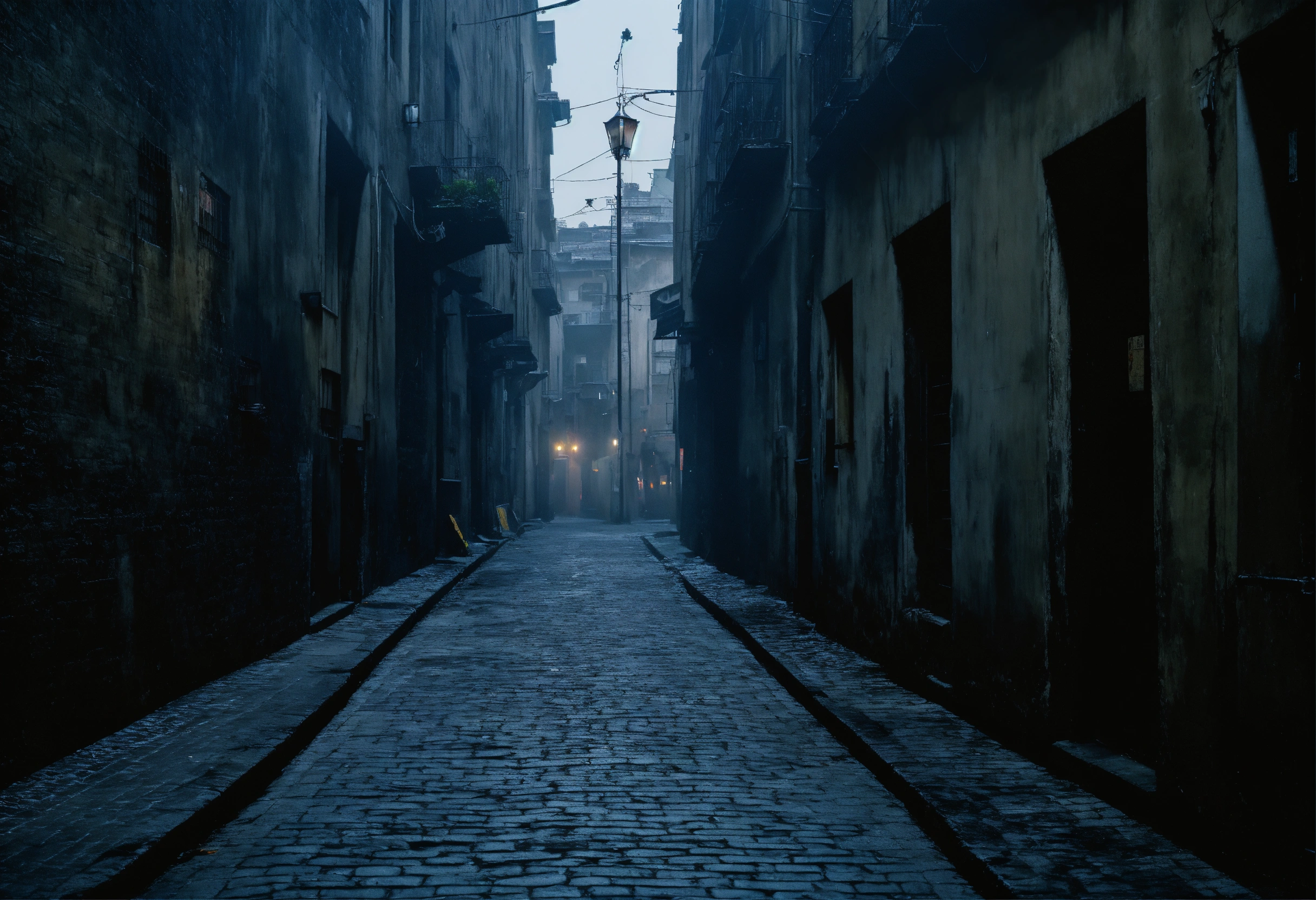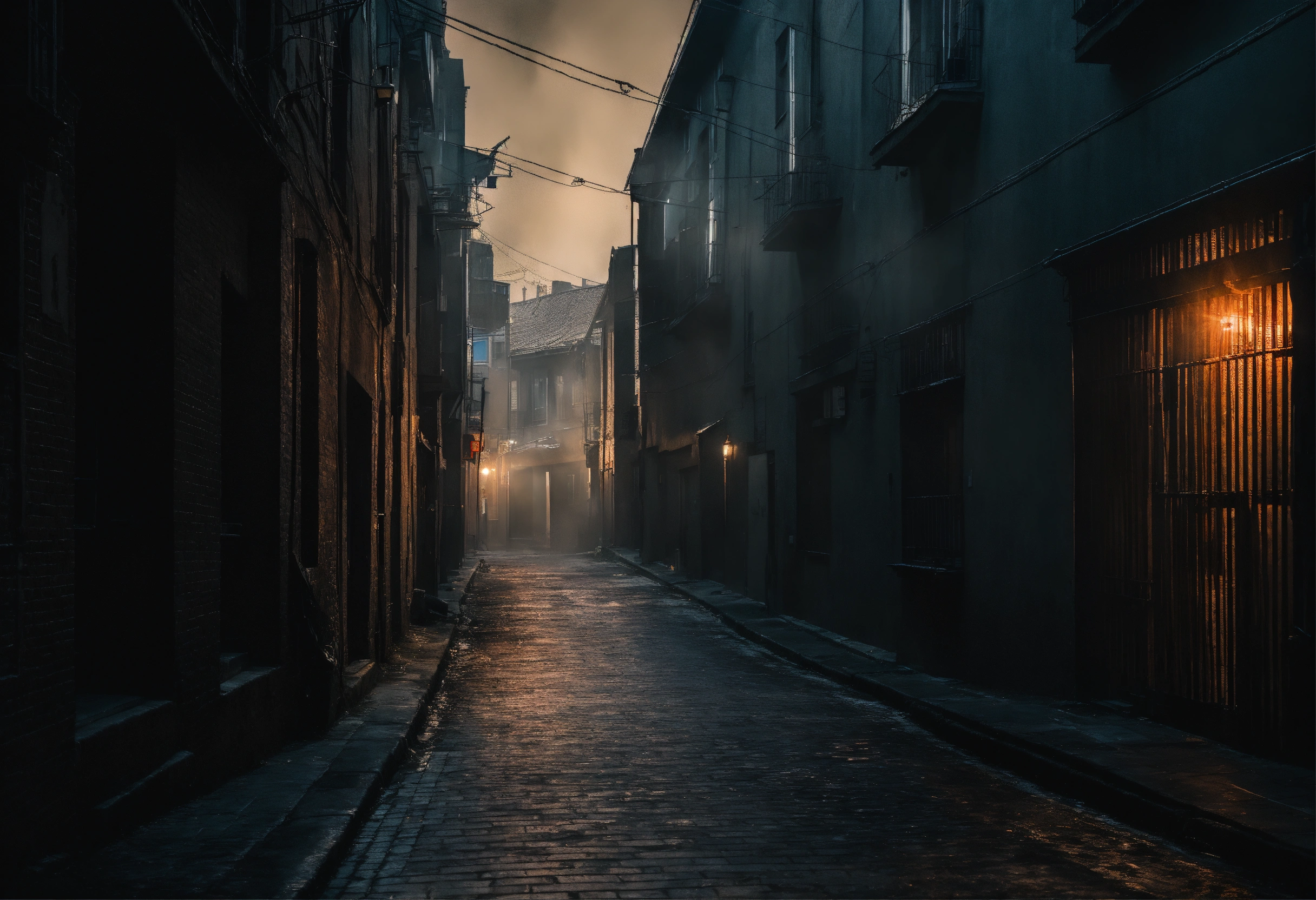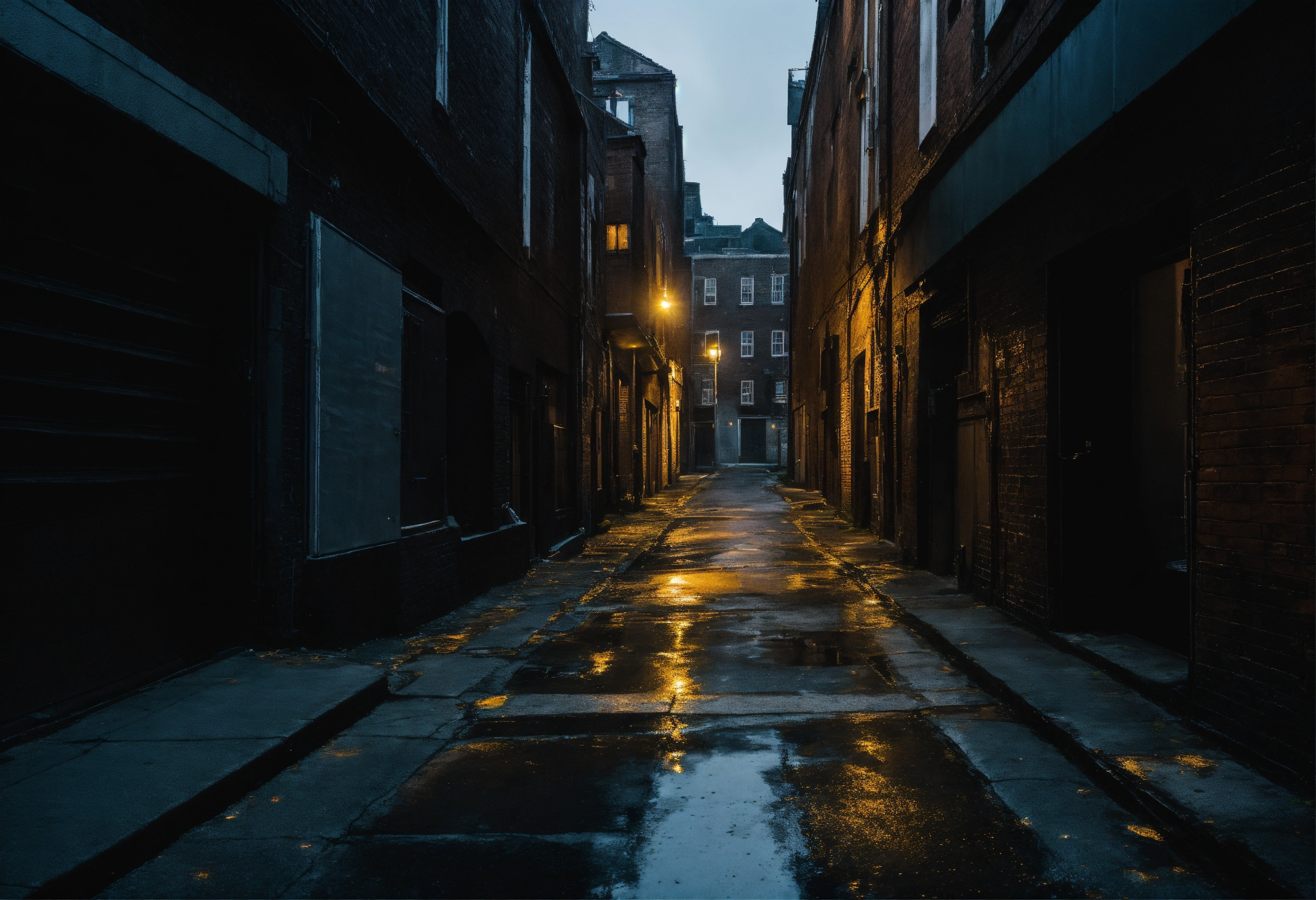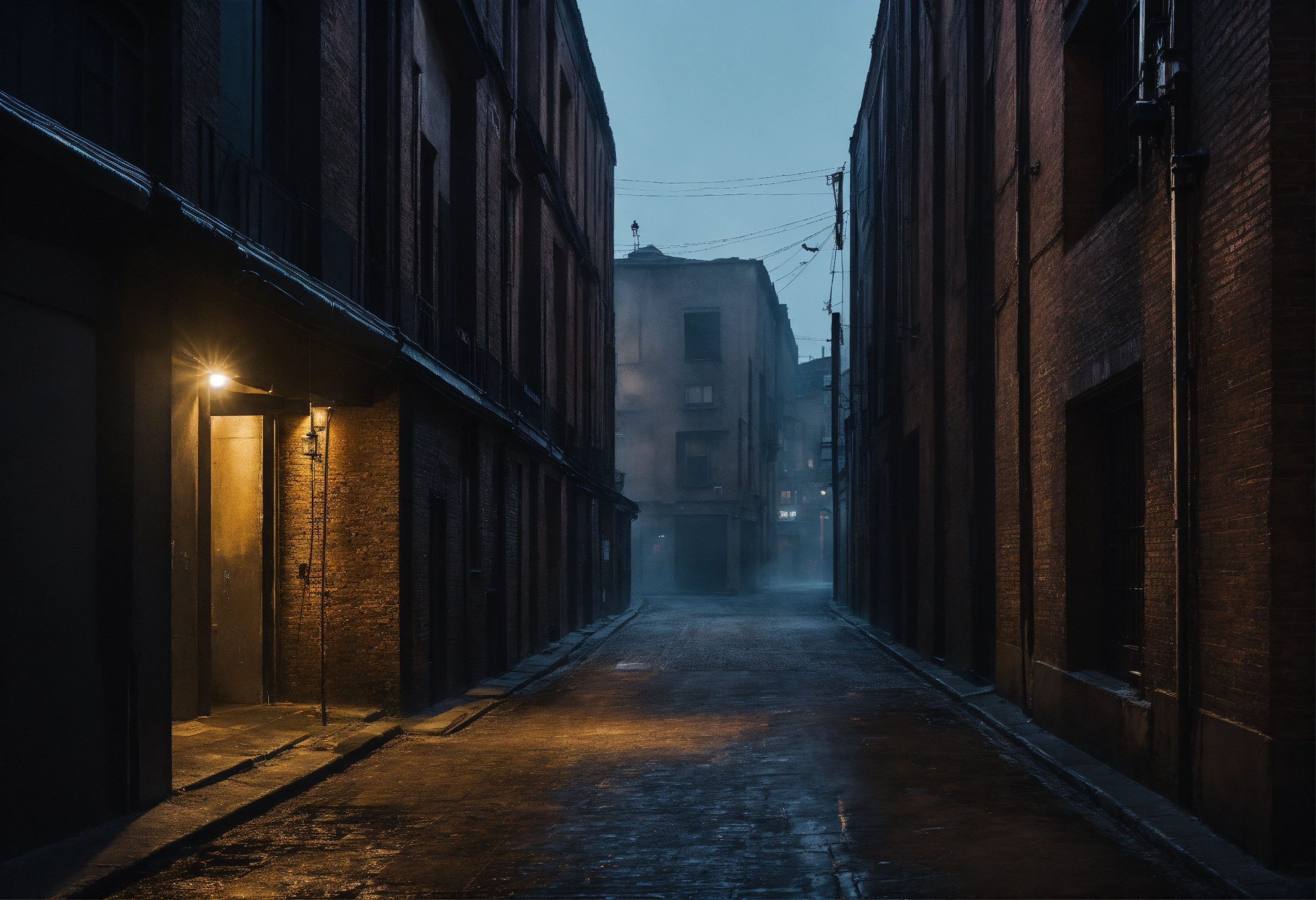 A dark alley with buildings on the side, view from alley entrance and dissolving into obscurity, street, dark city