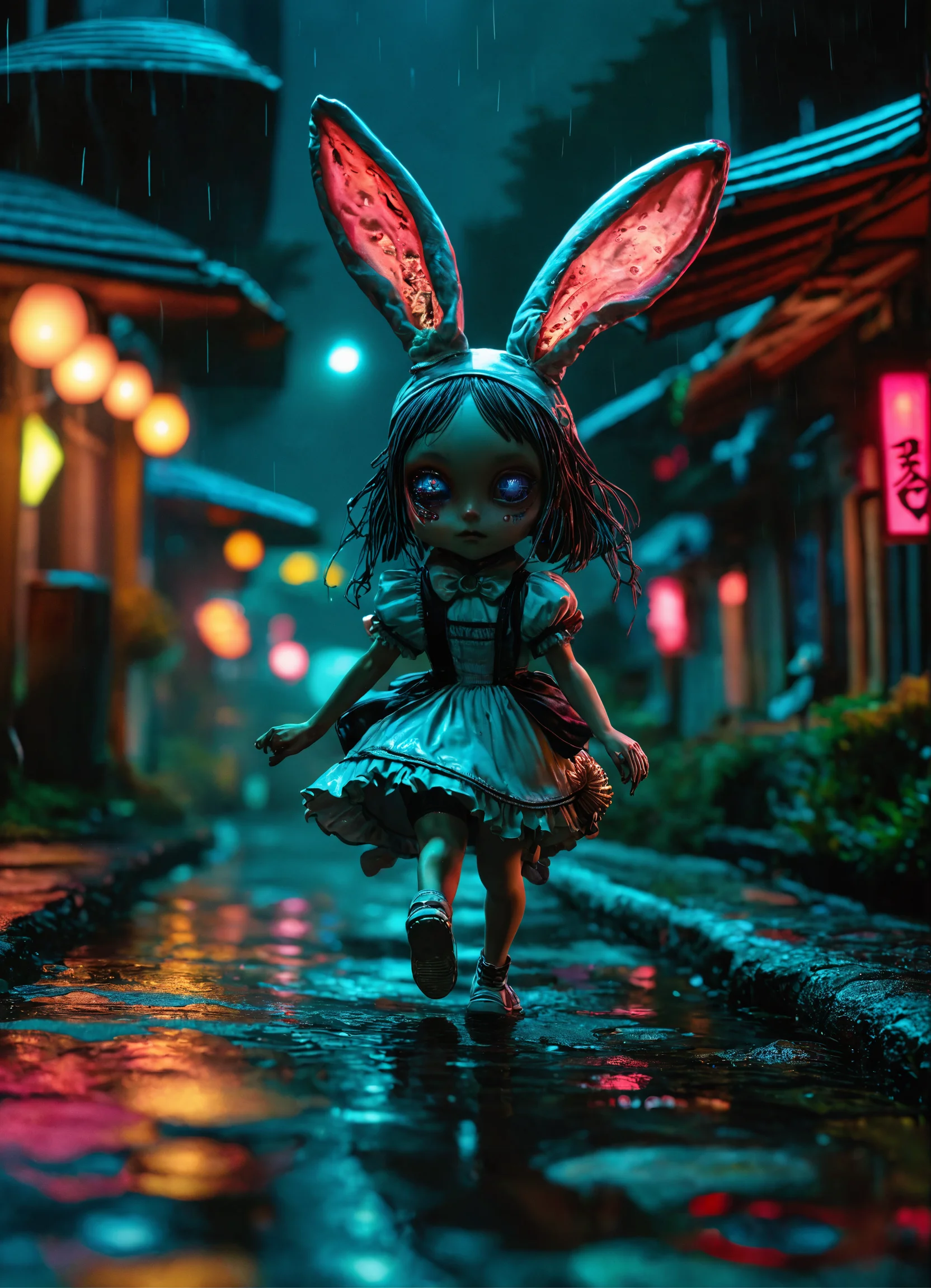 Running creepy little japanese alien anime alice in wonderland with bunny ears, detailed scene, black, perfect face, intricately detailed photorealism, trending on artstation, neon lights, rainy night, stunning full body anime art by mark ryden