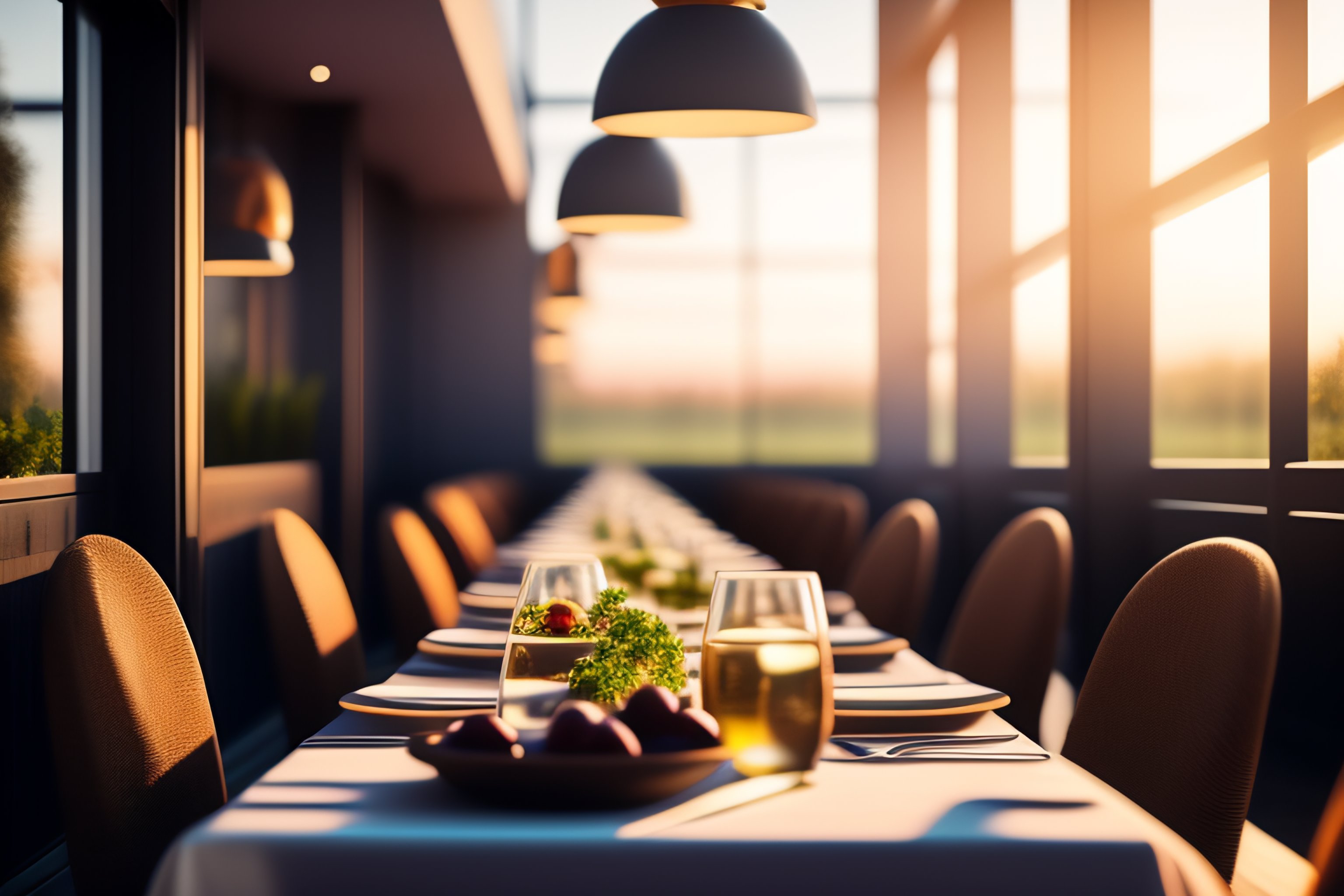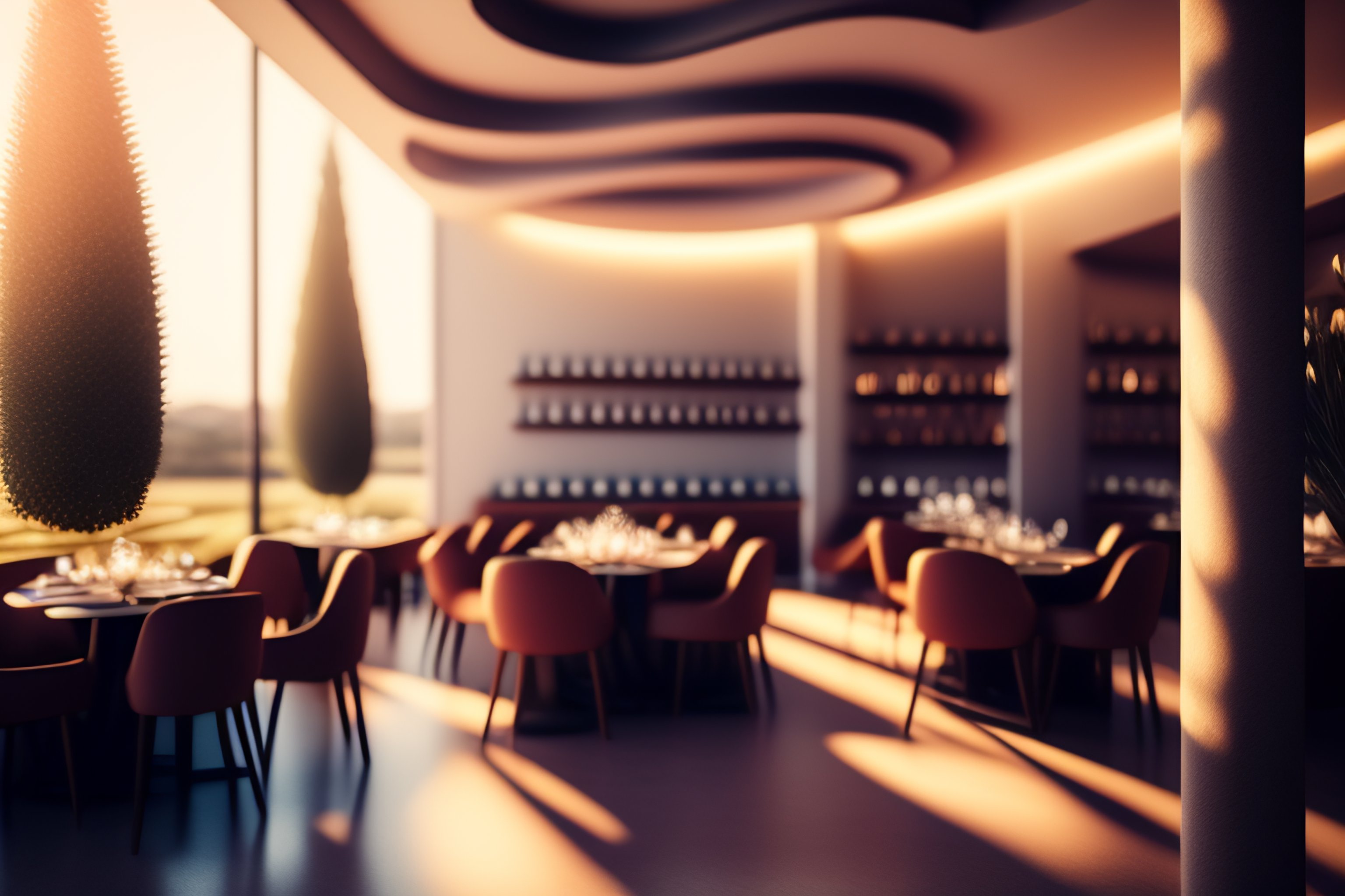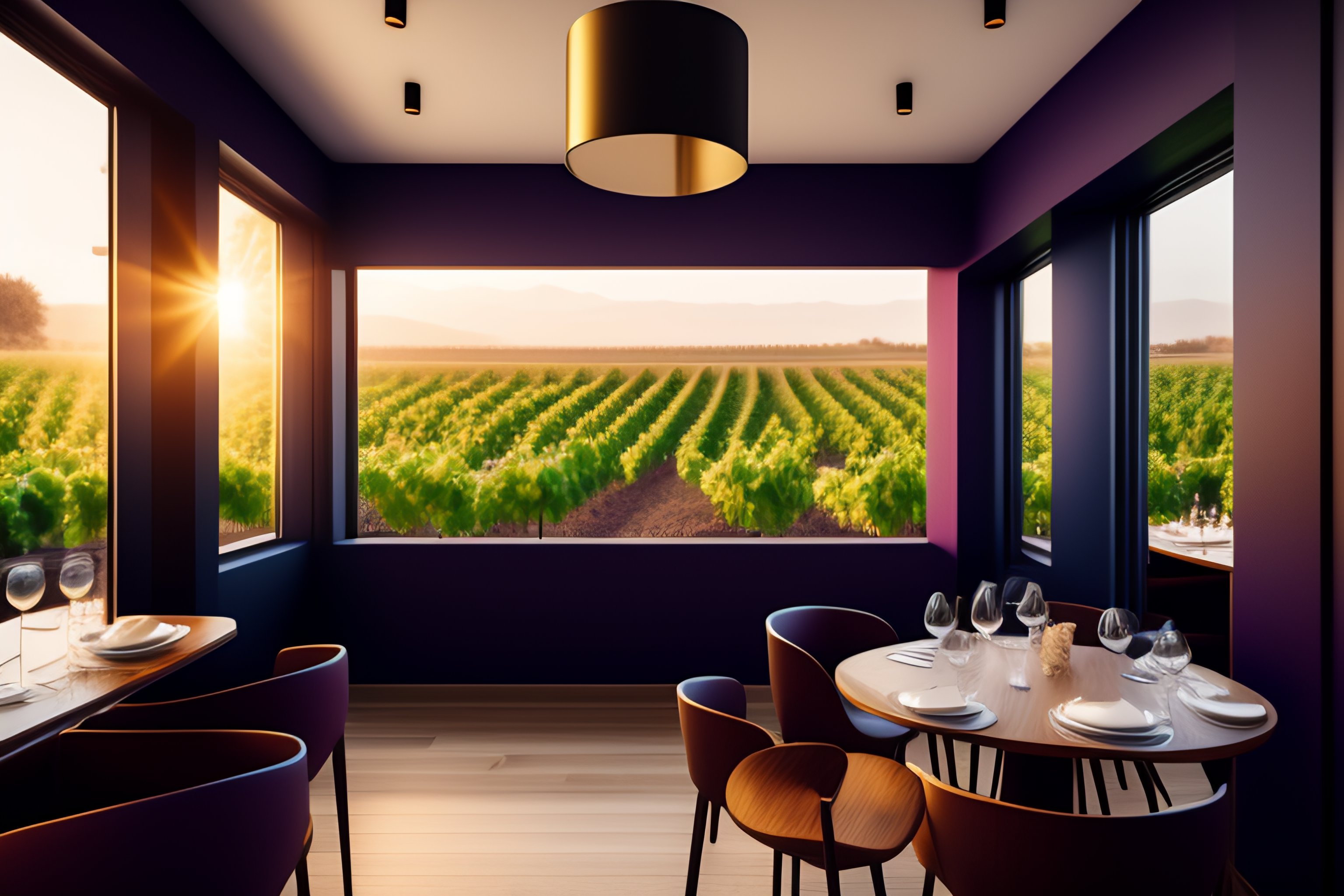 A natural light modern restaurant, grape wine pots on wall, high ceiling, 4k, interior design, light, 50mm, soft light