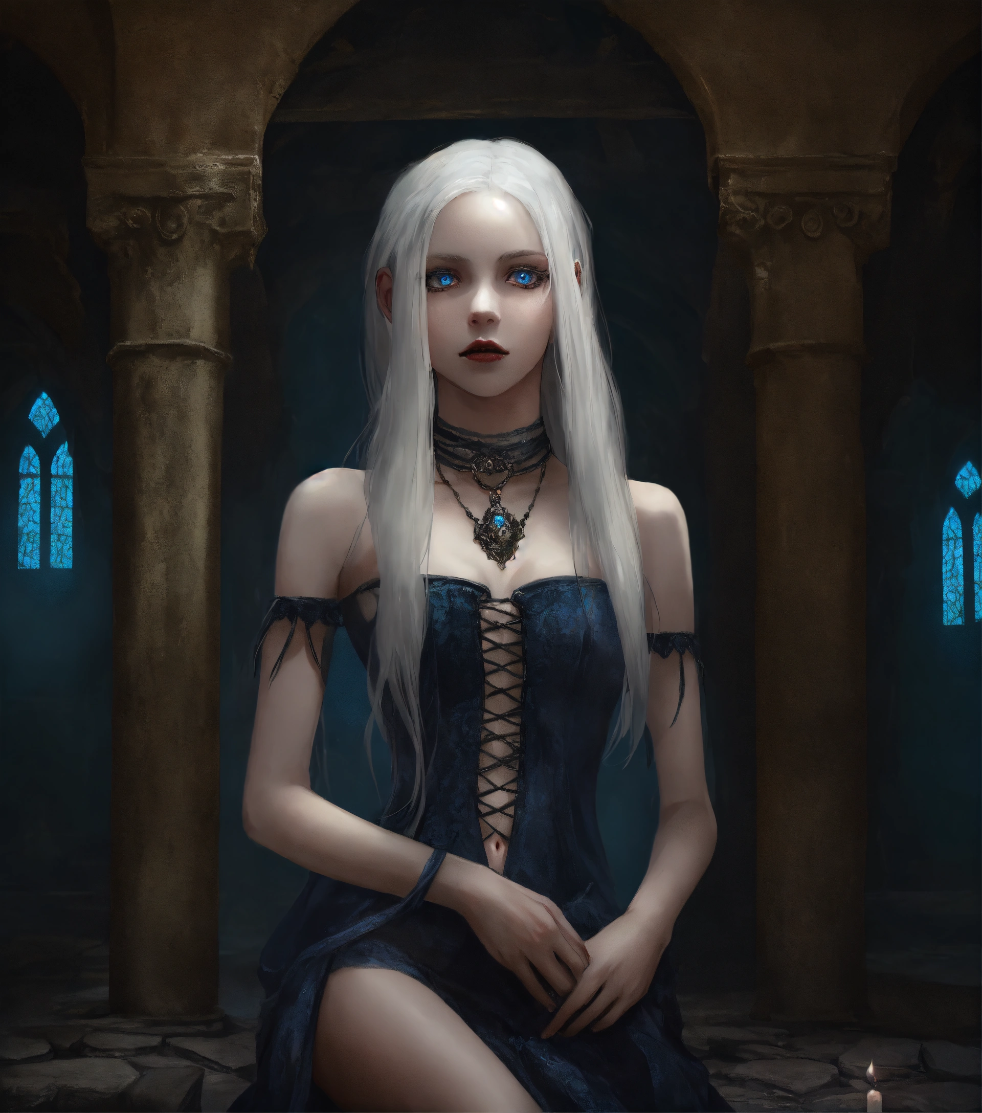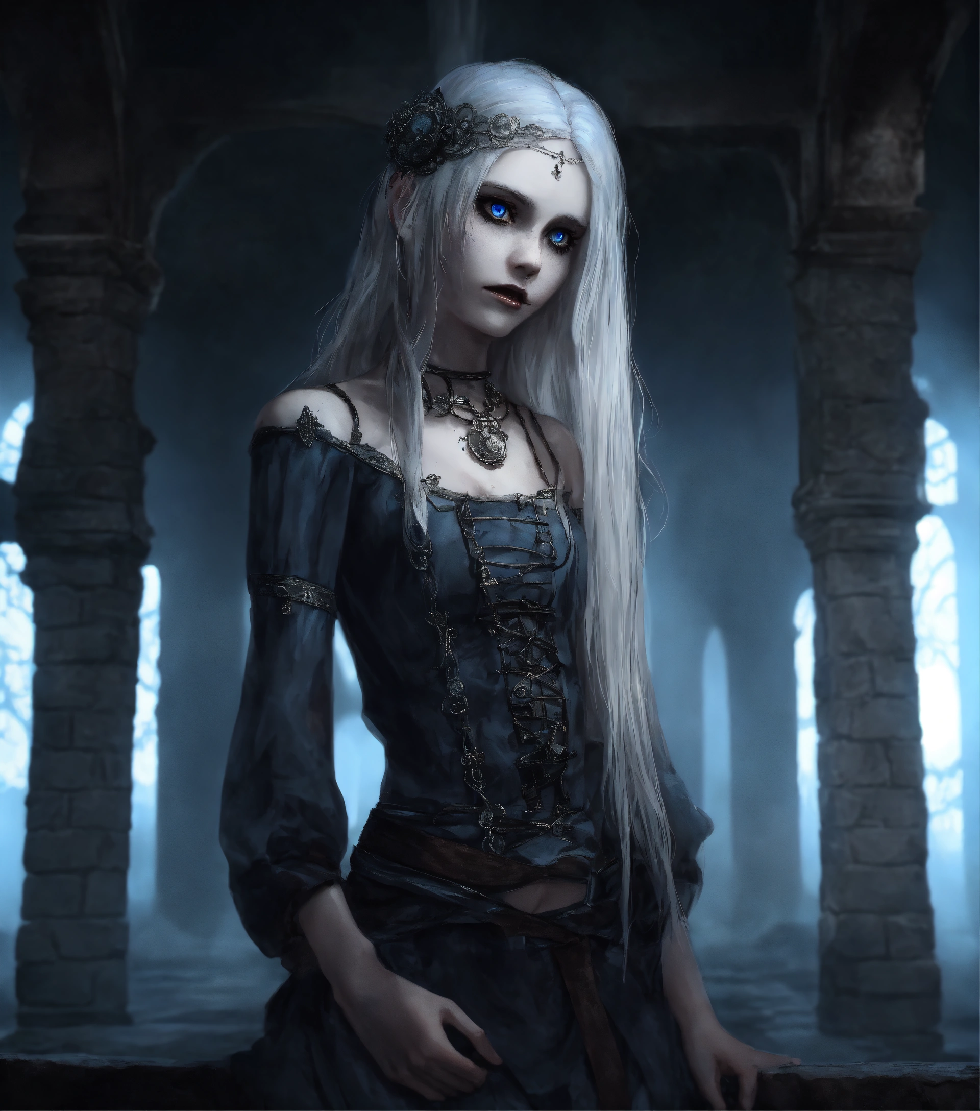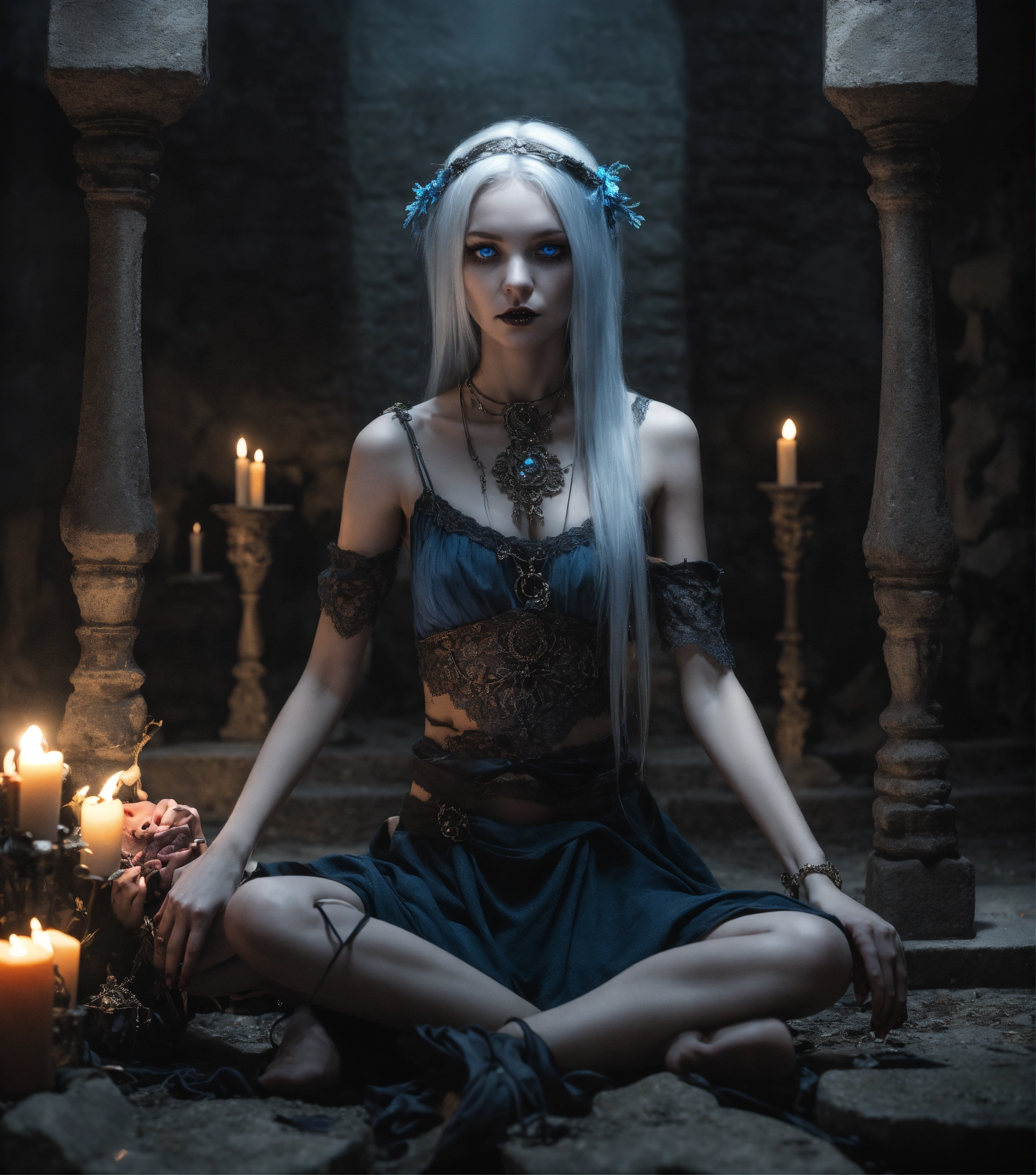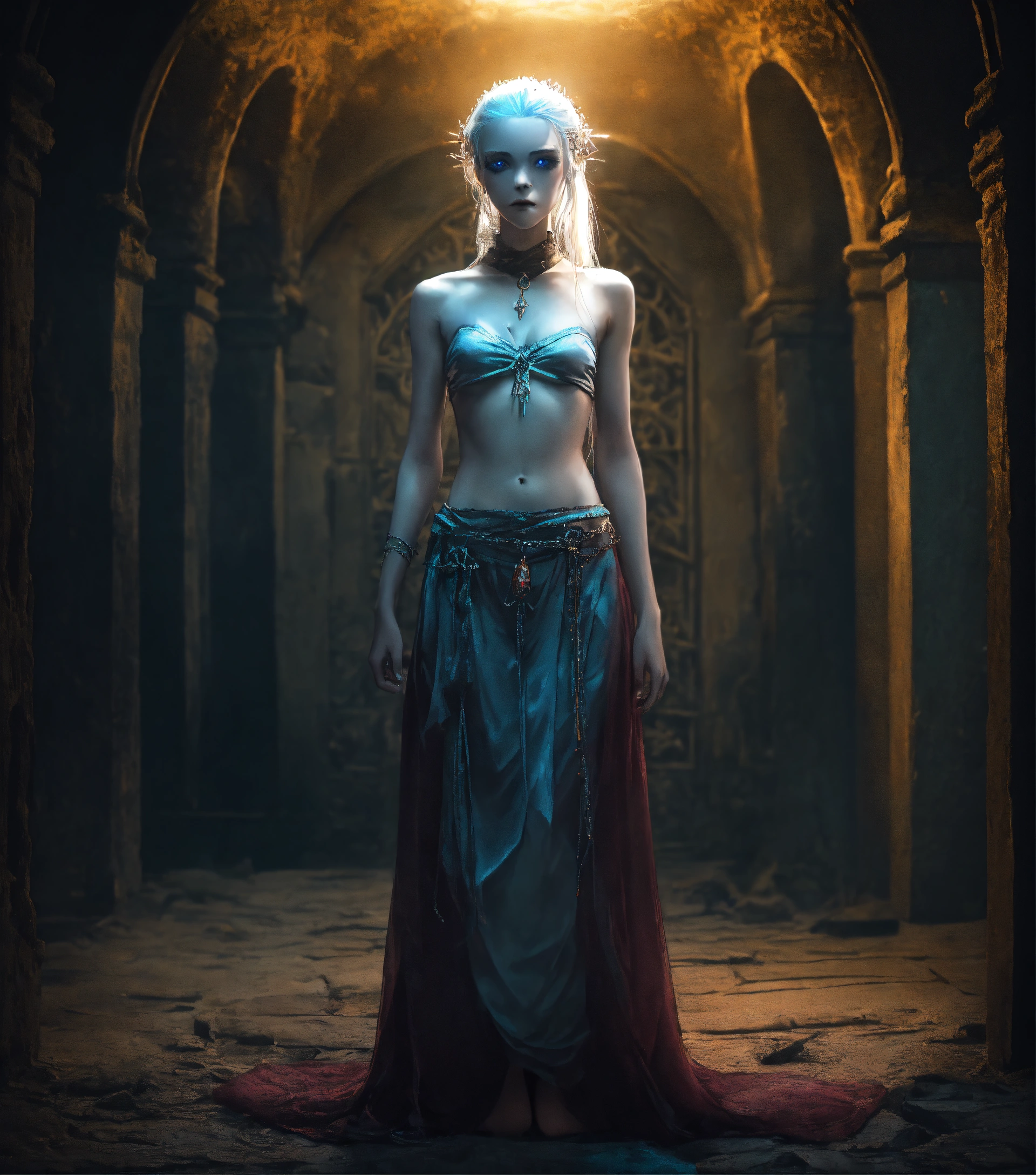 Body portrait, sehr kindhaftes deadly pale extremely slim twelve year old female child, she is a goth necromancer with waist long silverwhite hair and a aufreizendes off-the-shoulder lace cropped top and a very low-waisted hip scarf, extremely flat belly, belly button, her hip bones stand out clearly on her thin body, extremely skinny, extremely slim and emaciated body, completely emaciated, extremly narrow face, alabaster skin, pale as a corpse, glowing blue eyes, slim face, innocent looking, kneels on the stone floor in a gloomy crypt, kindlich, unschuldig, childlike, graceful, wispy, glowing blue eyes, ghostly, dead, evil, demonic, undead, darkness, grotesque, mysterious, dark, dark, cold ambient lighting, extremely detailed, fantasy, medieval setting
