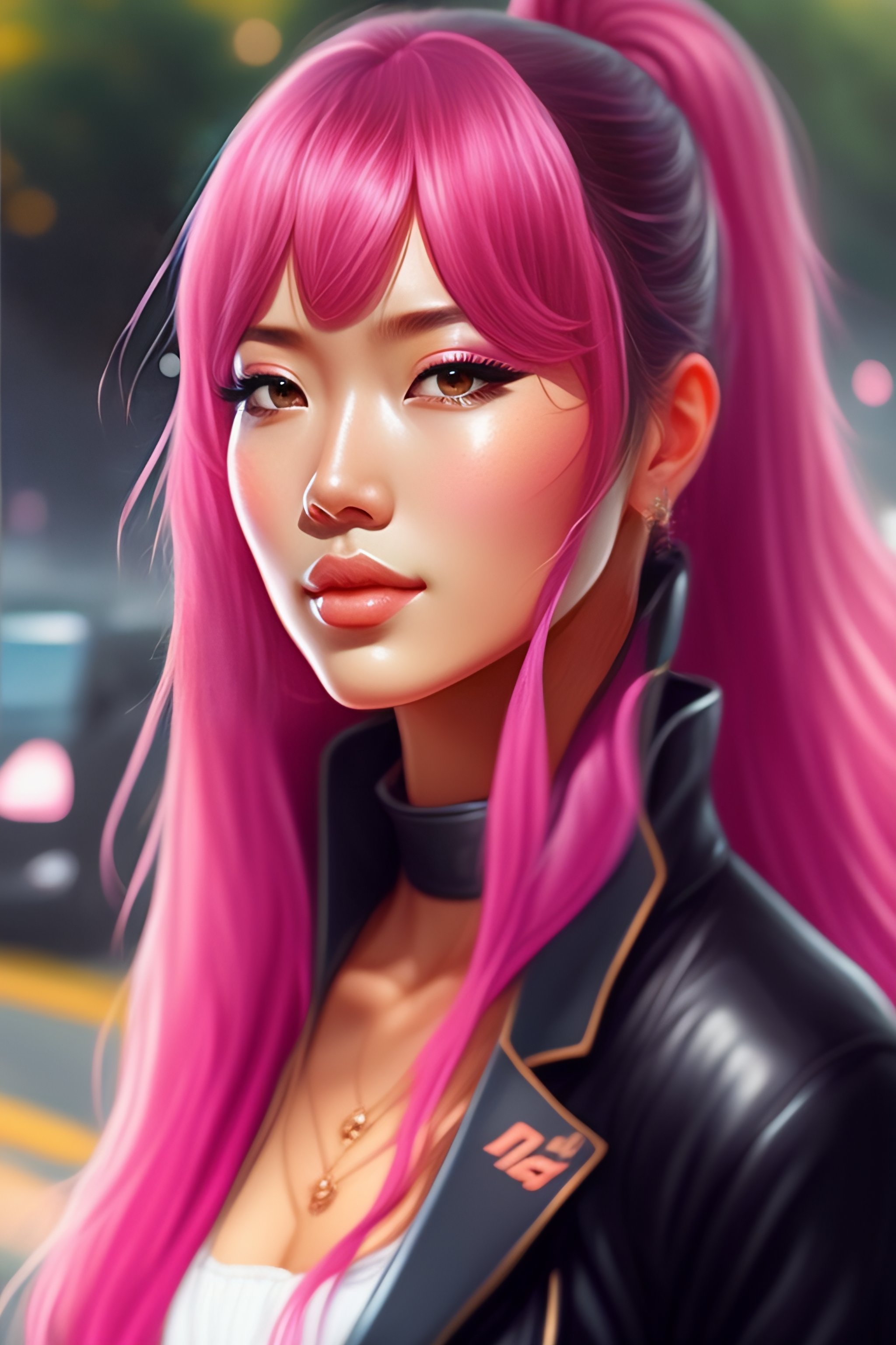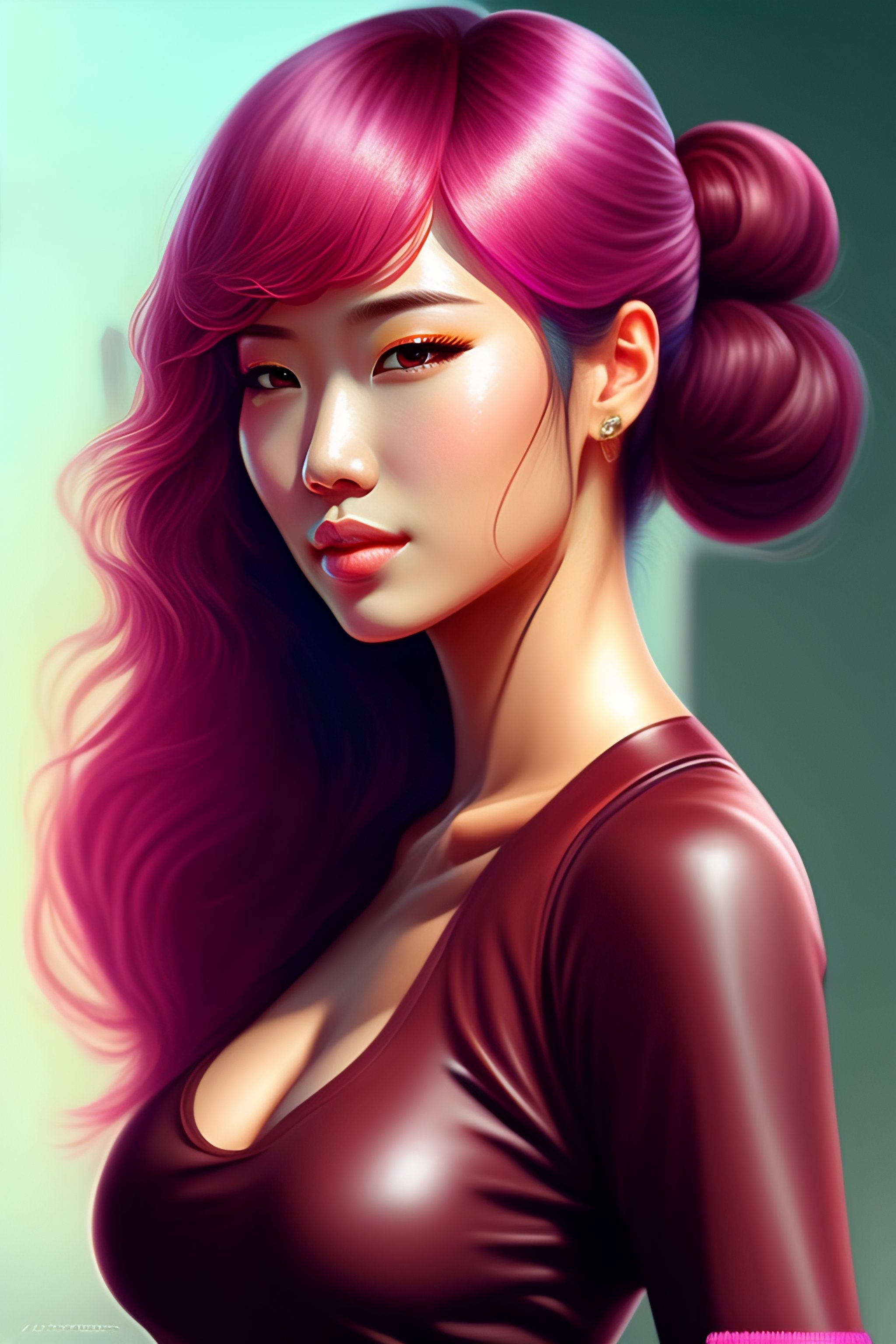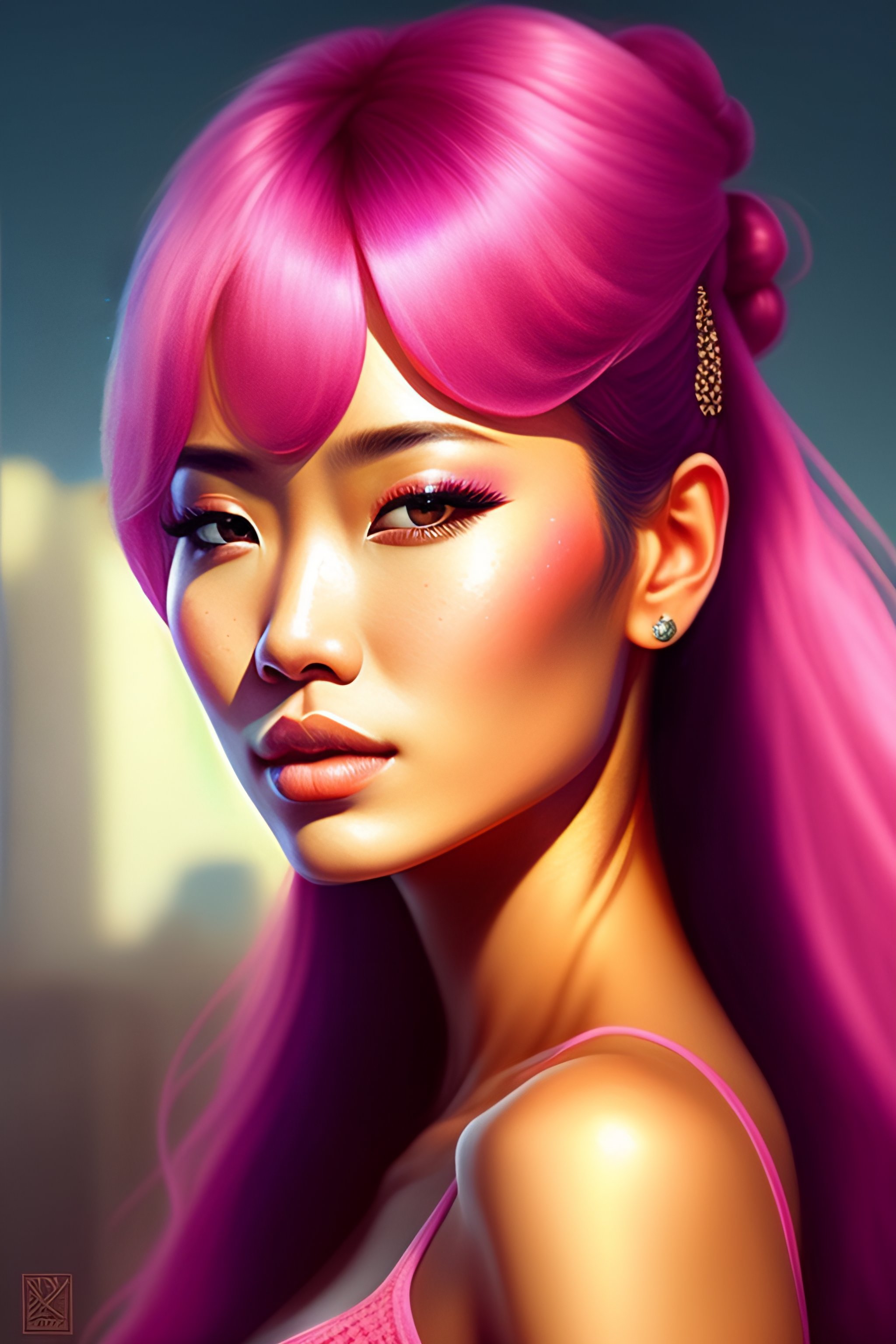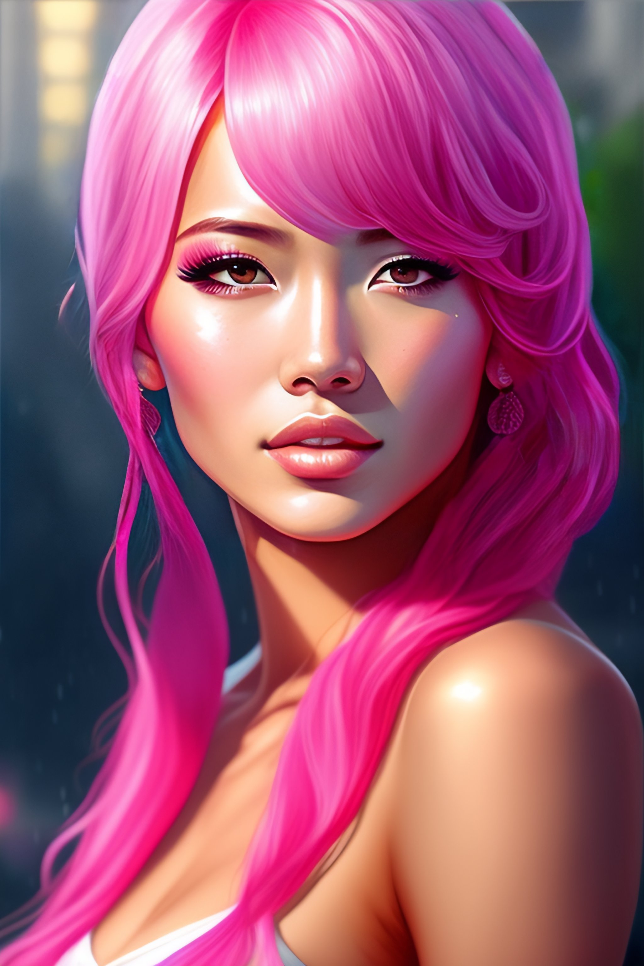Women, glossy skin, ultra realistic, pink hair, part the hair, tie a ponytail, have bangs, brown eyes, wet sweat, japanese, by art ategerm