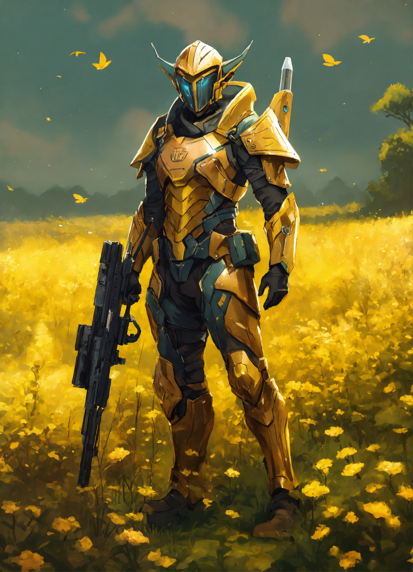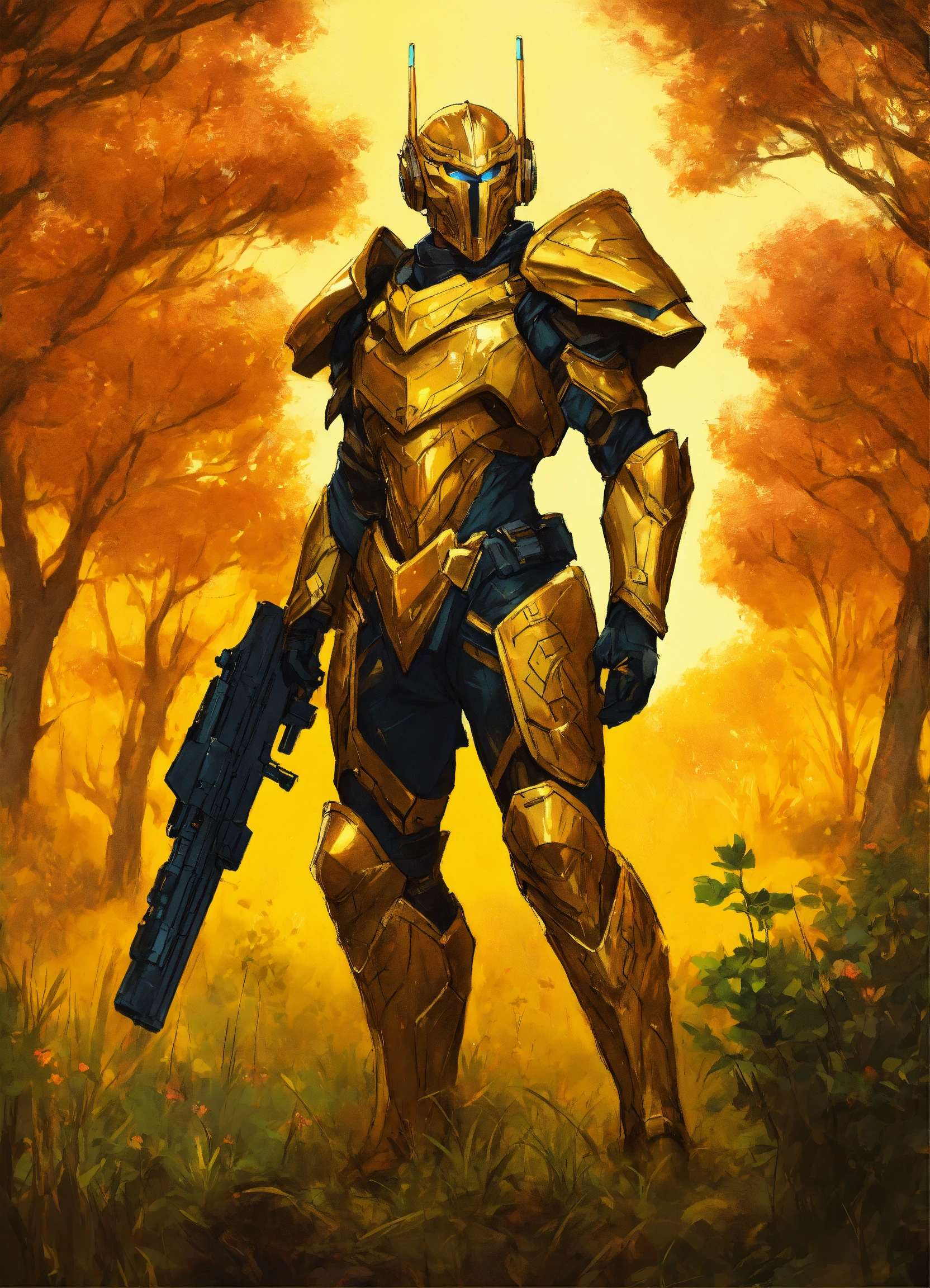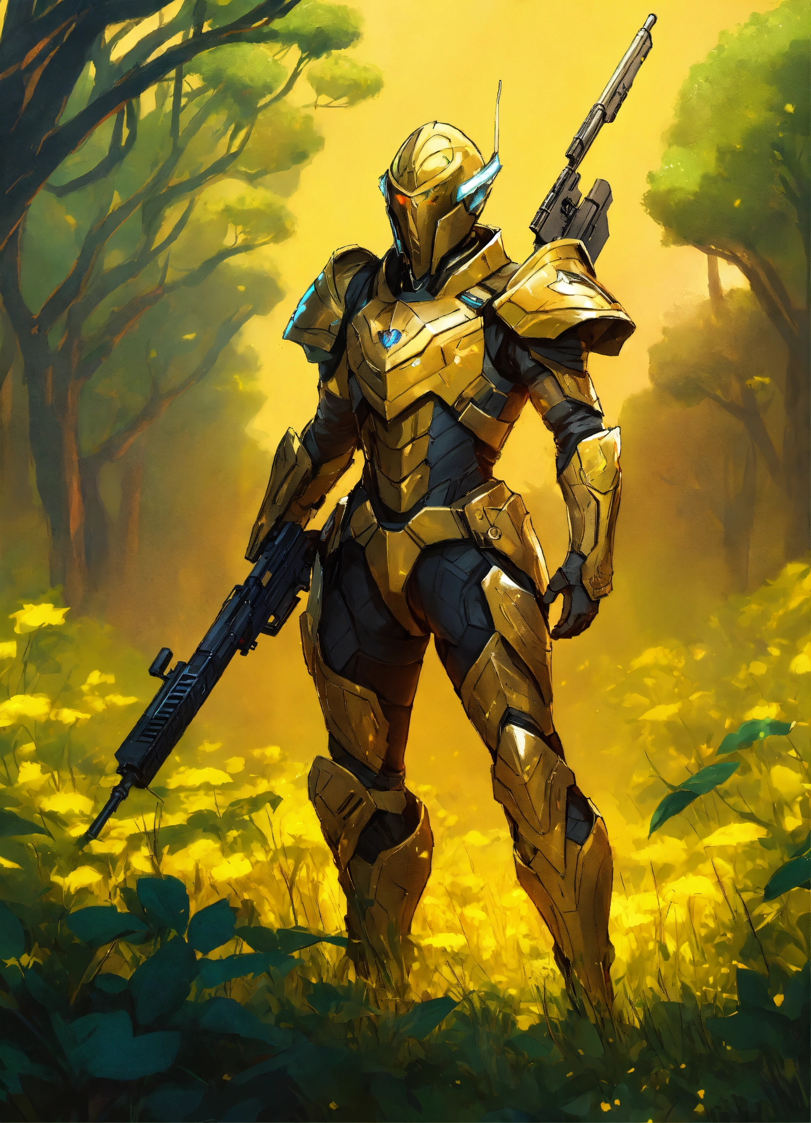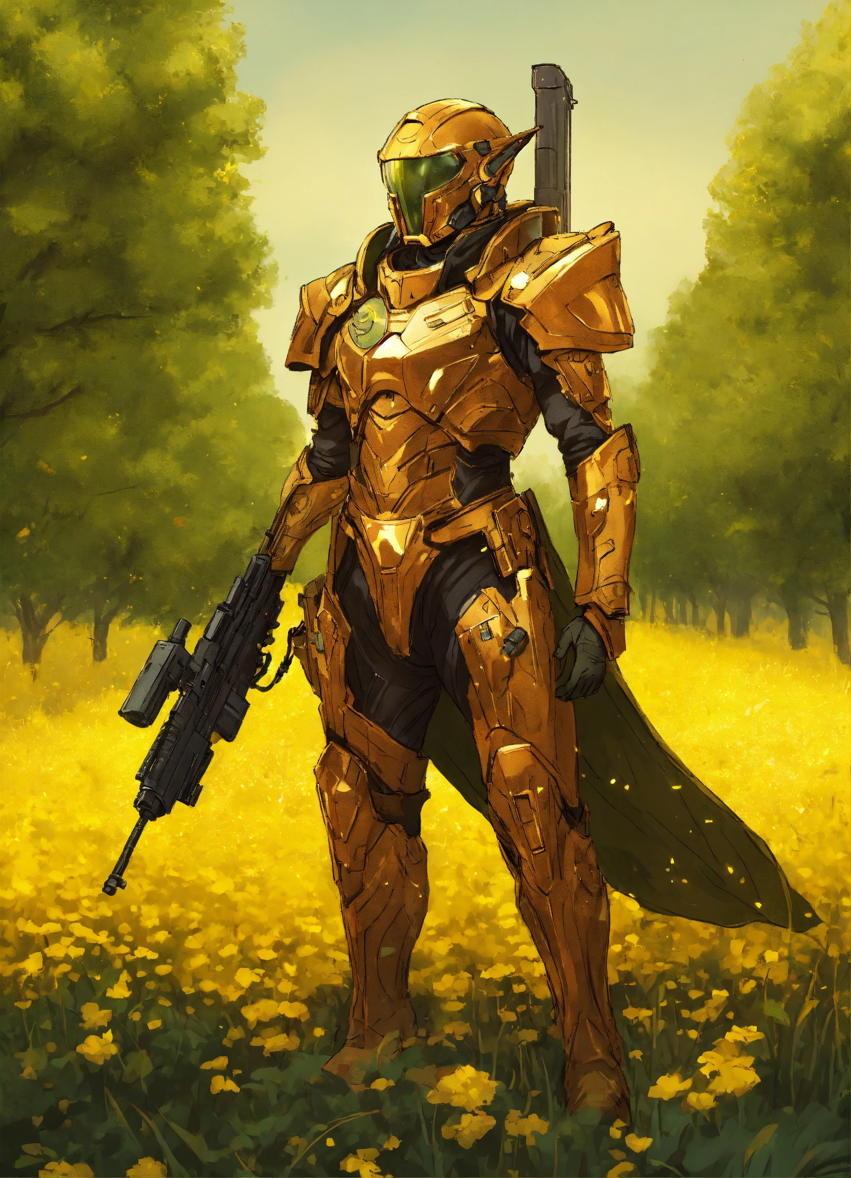 Epic drawing of a full body of a high elf sci fi soldier wearing sci fi armor, copper and yellow sci fi armor, boots, male, holding a machine gun, standing in a field of hedgerows