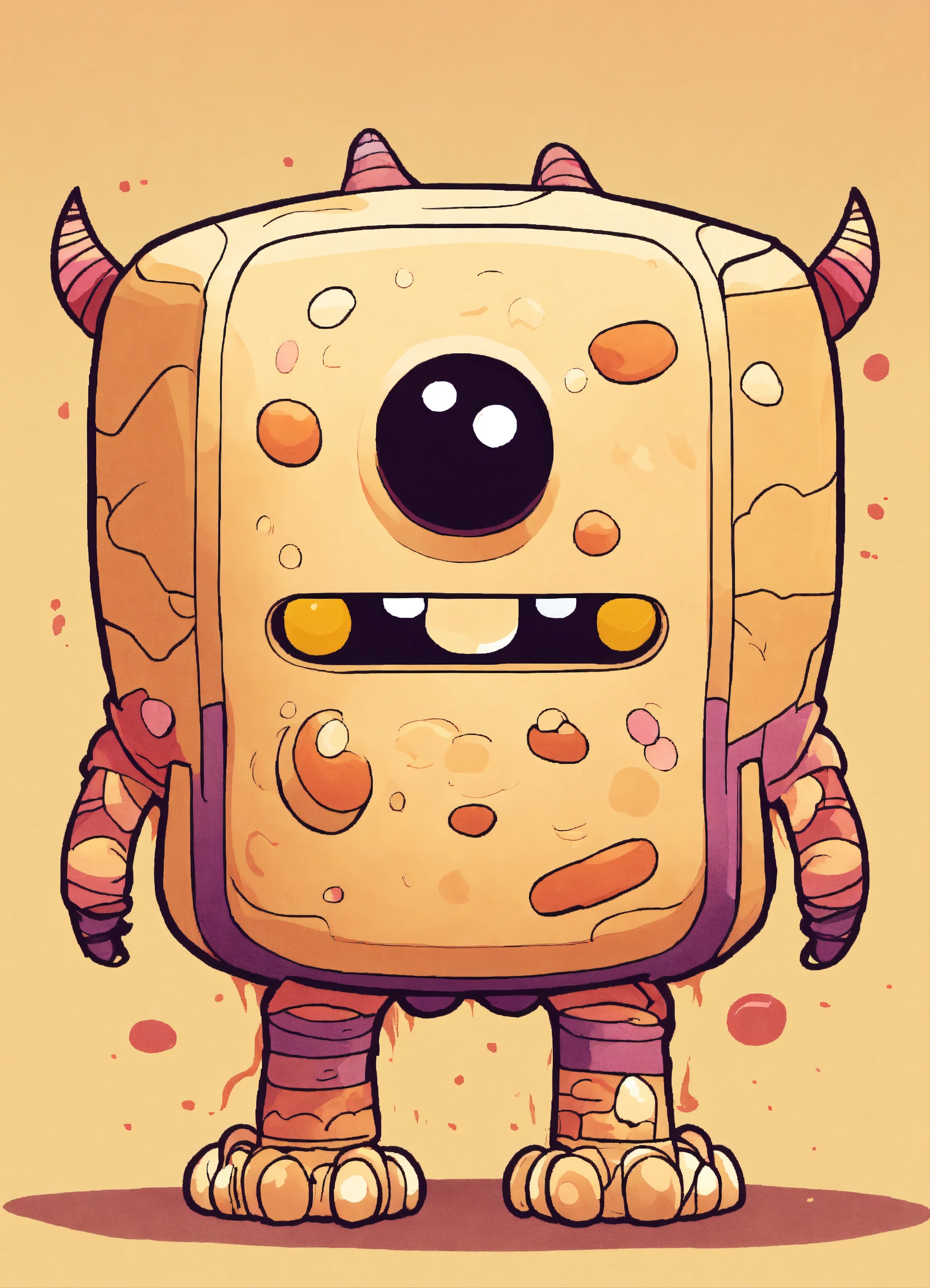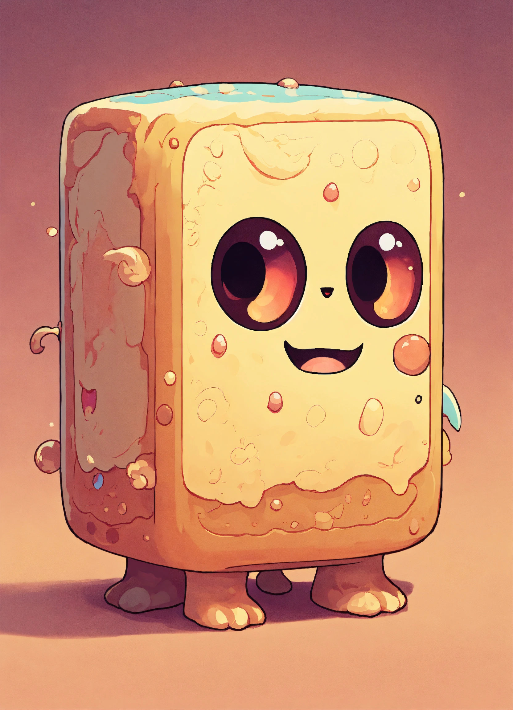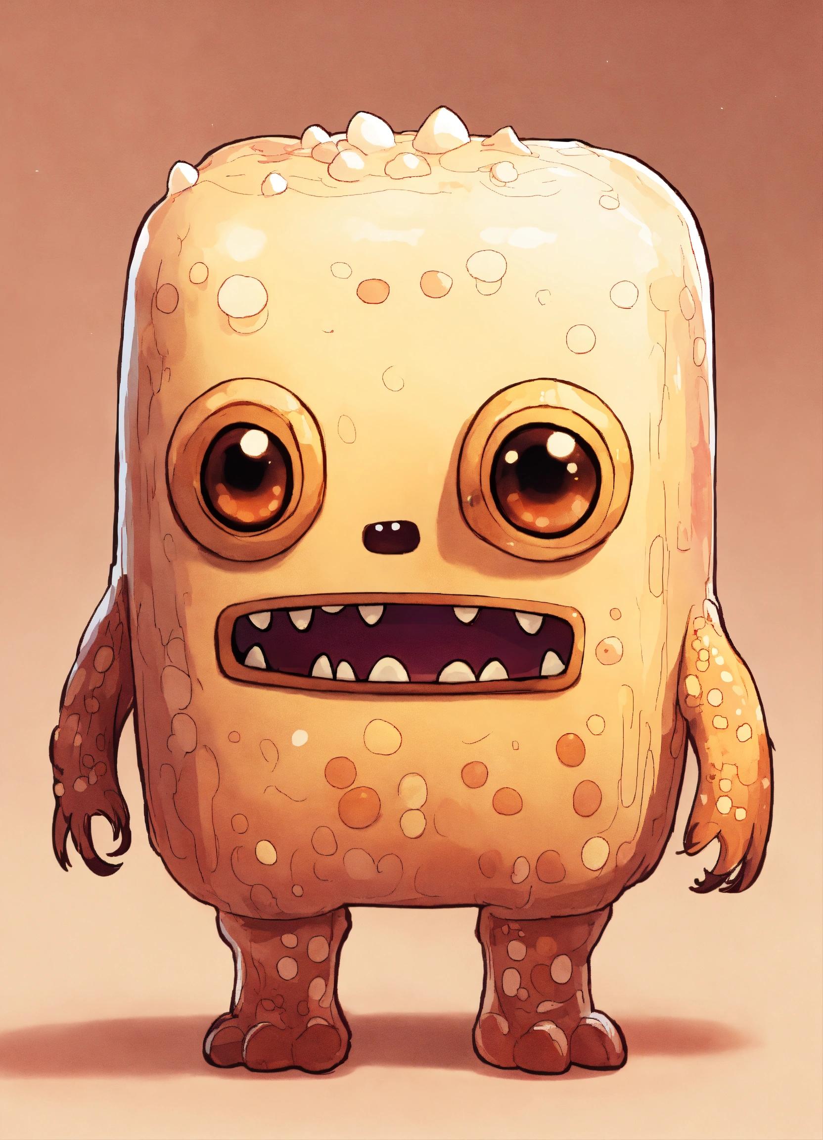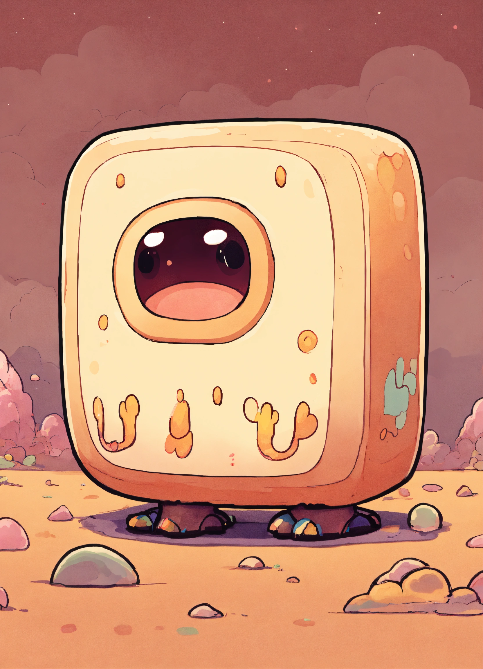 A cream-colored kawaii rectangle monster, it has a pensive expression and bi-colored colored eyes and no limbs