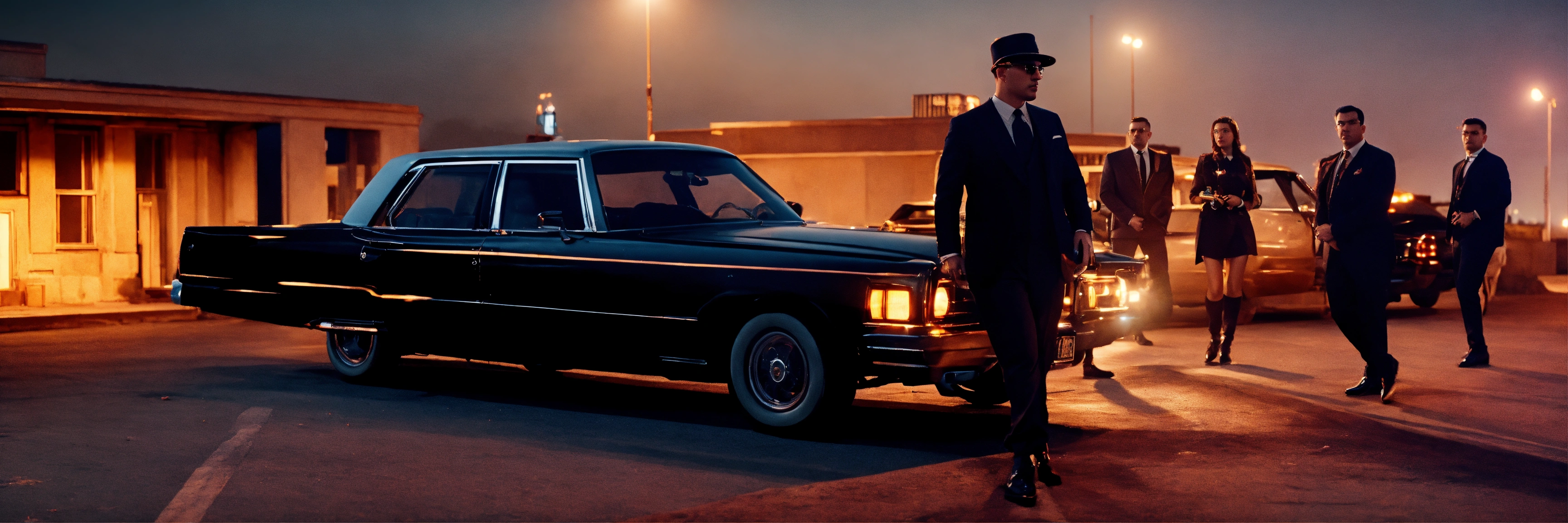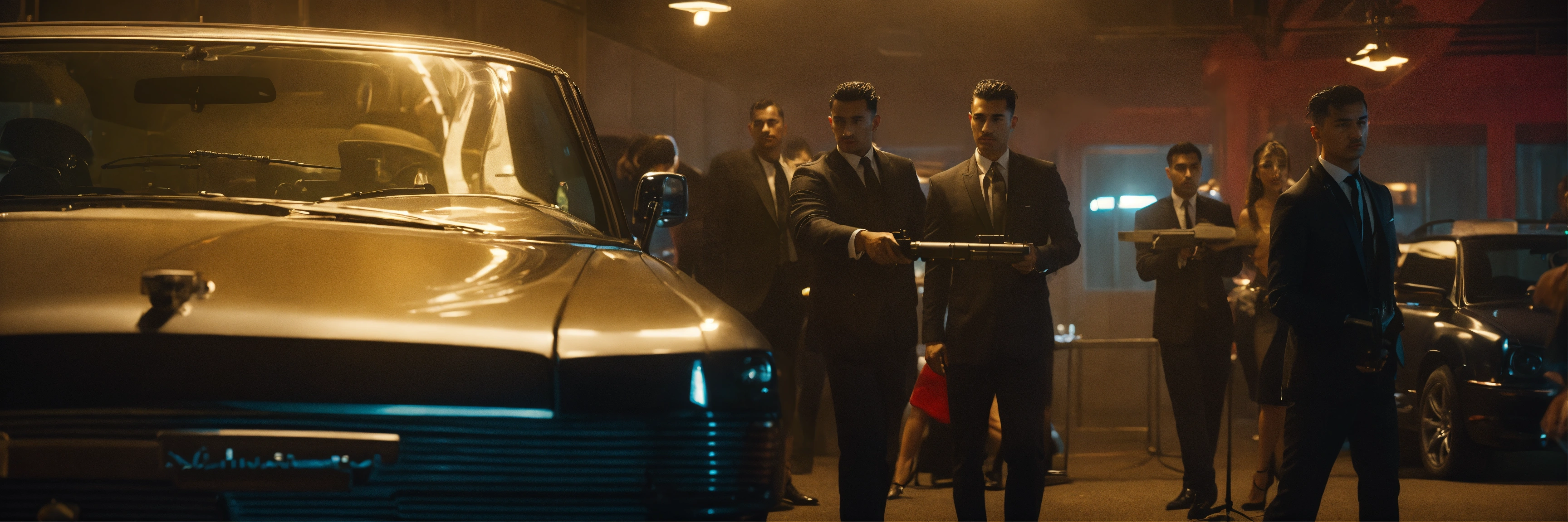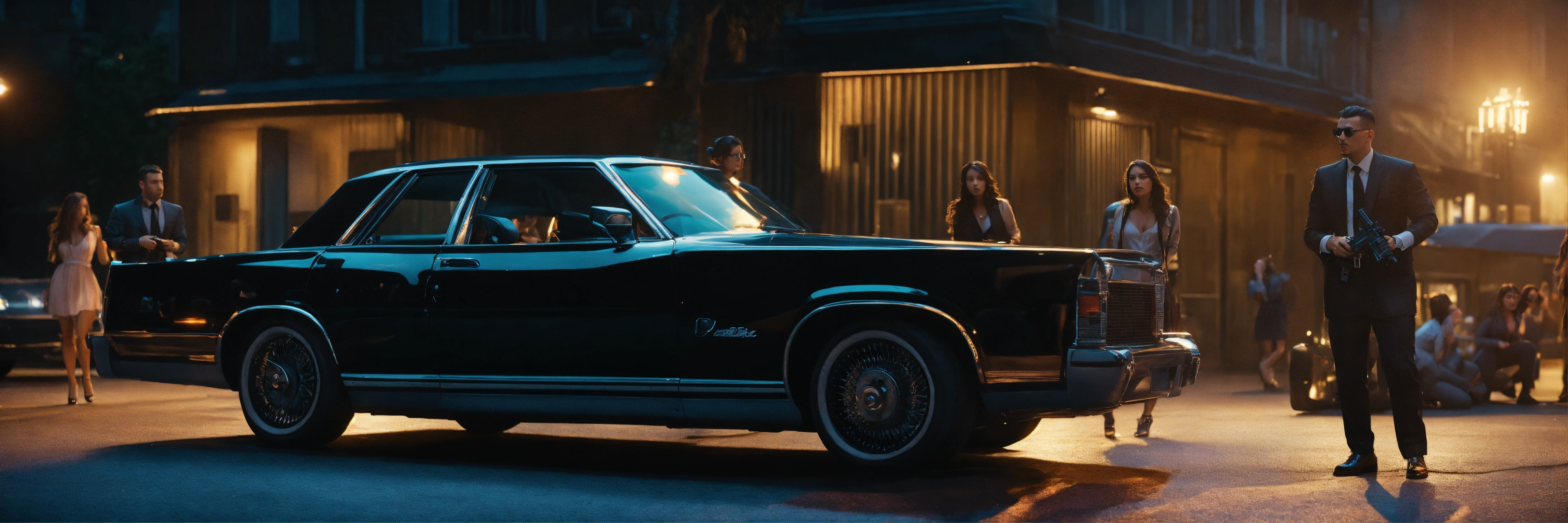 Group of mafia male with riffles surrounded by girls, interior night time, black car with machine gun coming out from sunroof, mood lighting, wide front shot, 8k, luxcorerender, earthly colour, cinematic photography, real humans, real images, matte finish, shot on arri anamorphic, extreme wide shot, smooth, sharp focus, ornate, highly dynamic, particulate, hyperreal, wide shot