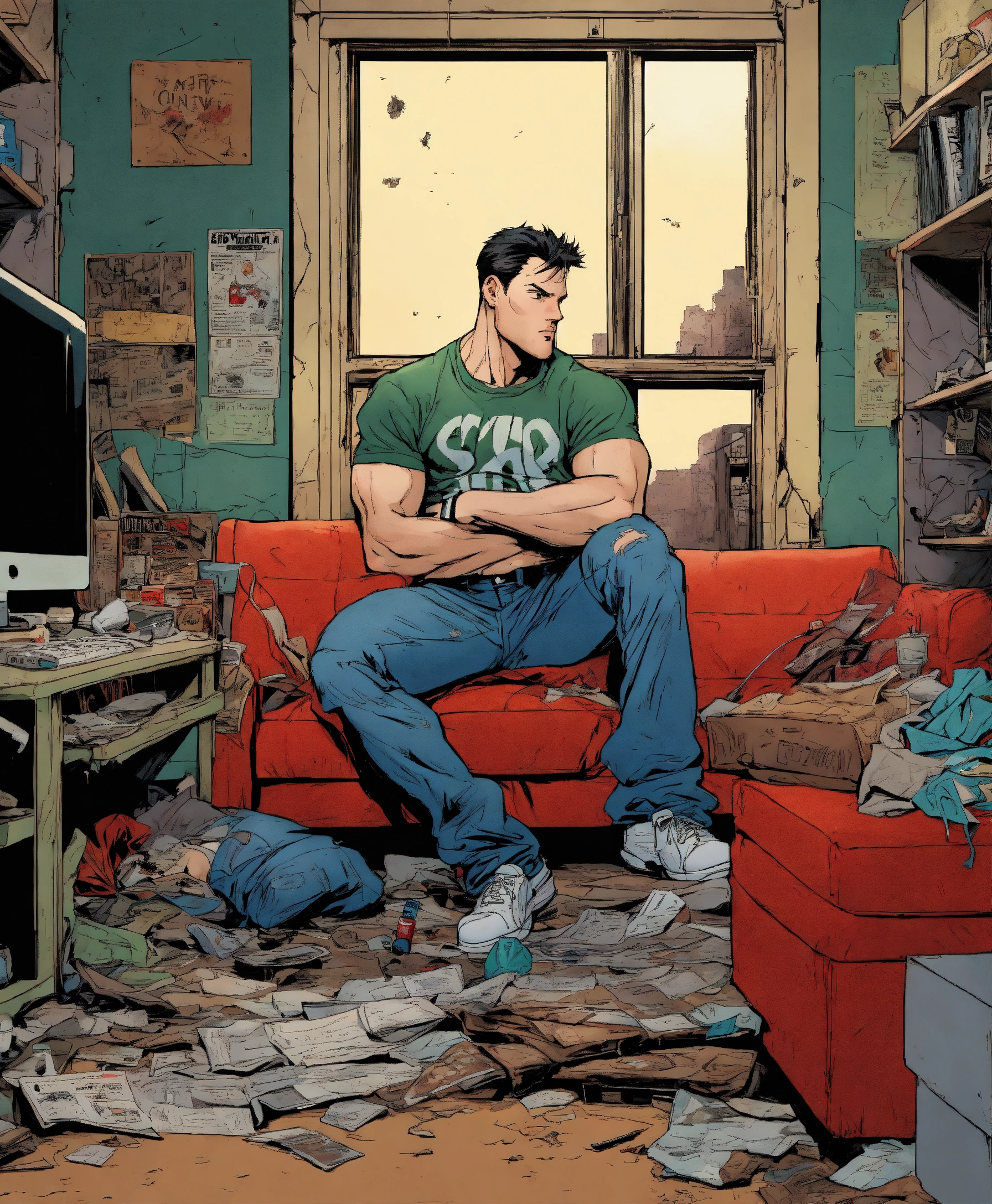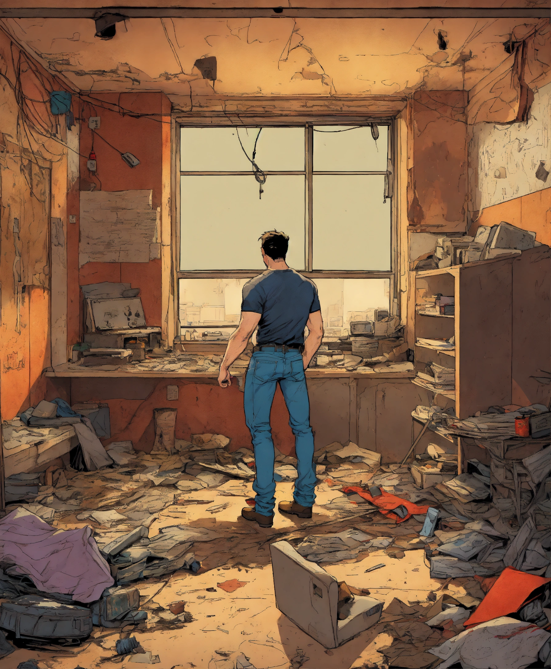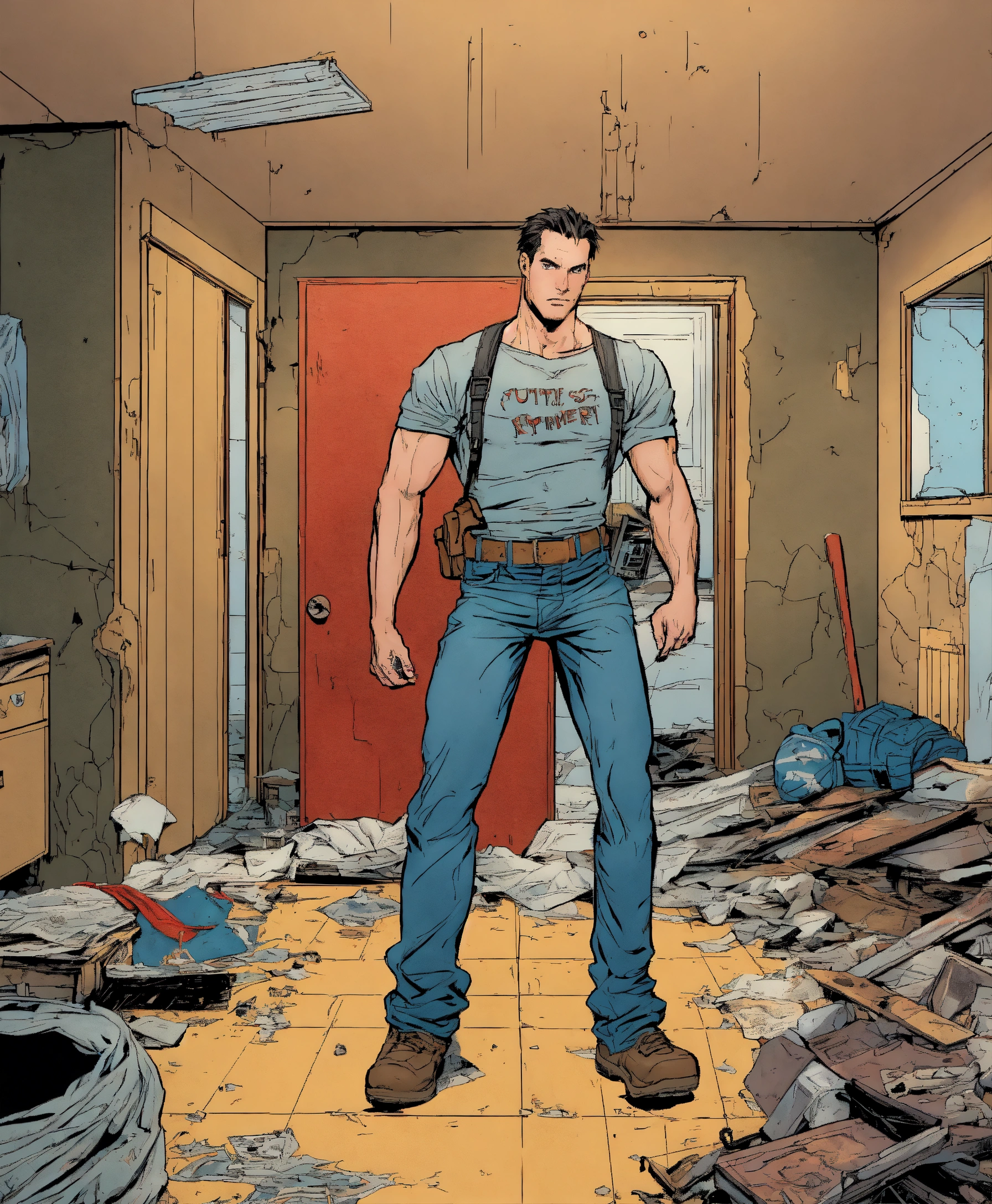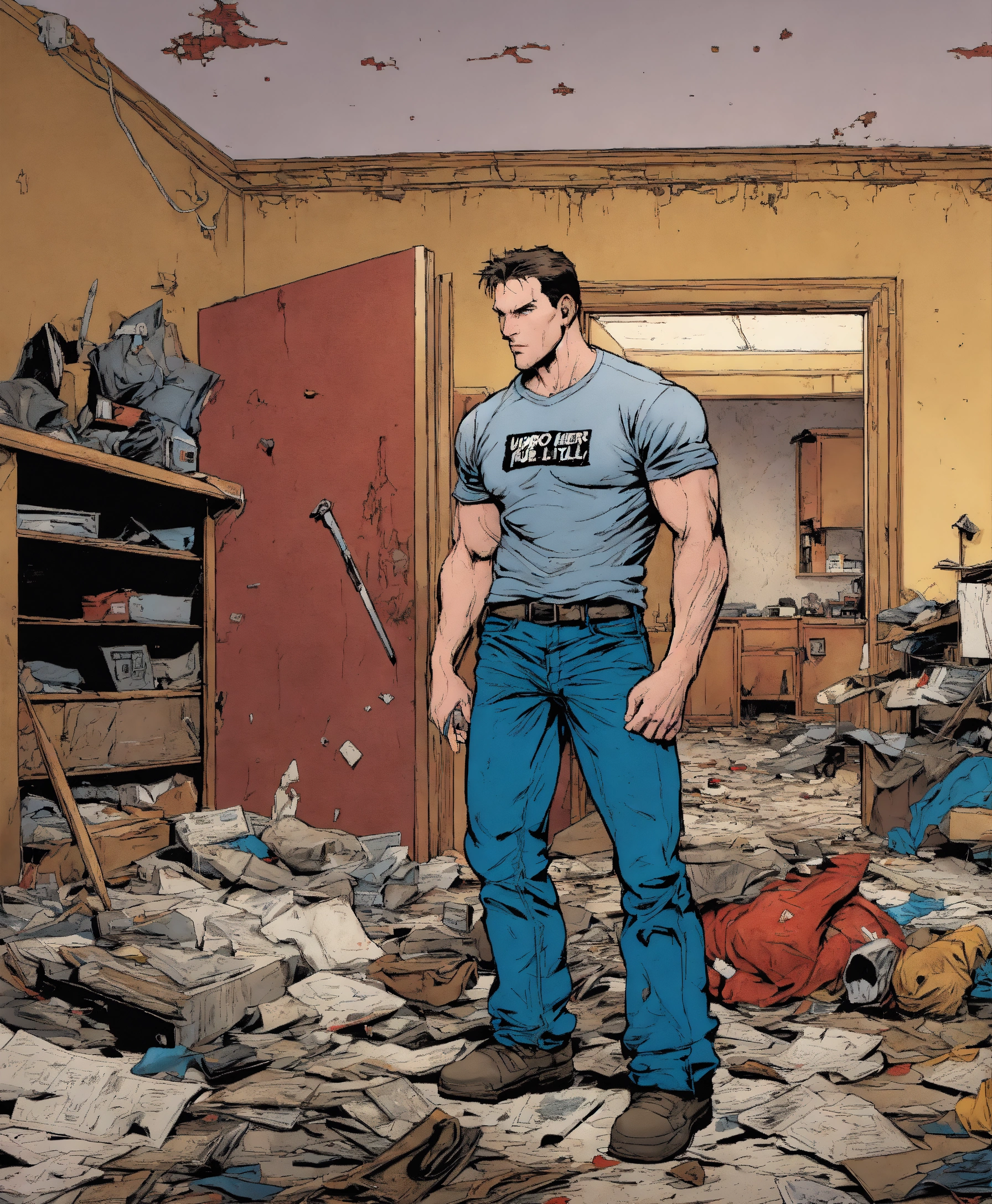 U.s comic type illustration, inside a derelict apartment, like todd mcfarlane, casual jeans and t-shirt. the hero fights a serial killer.