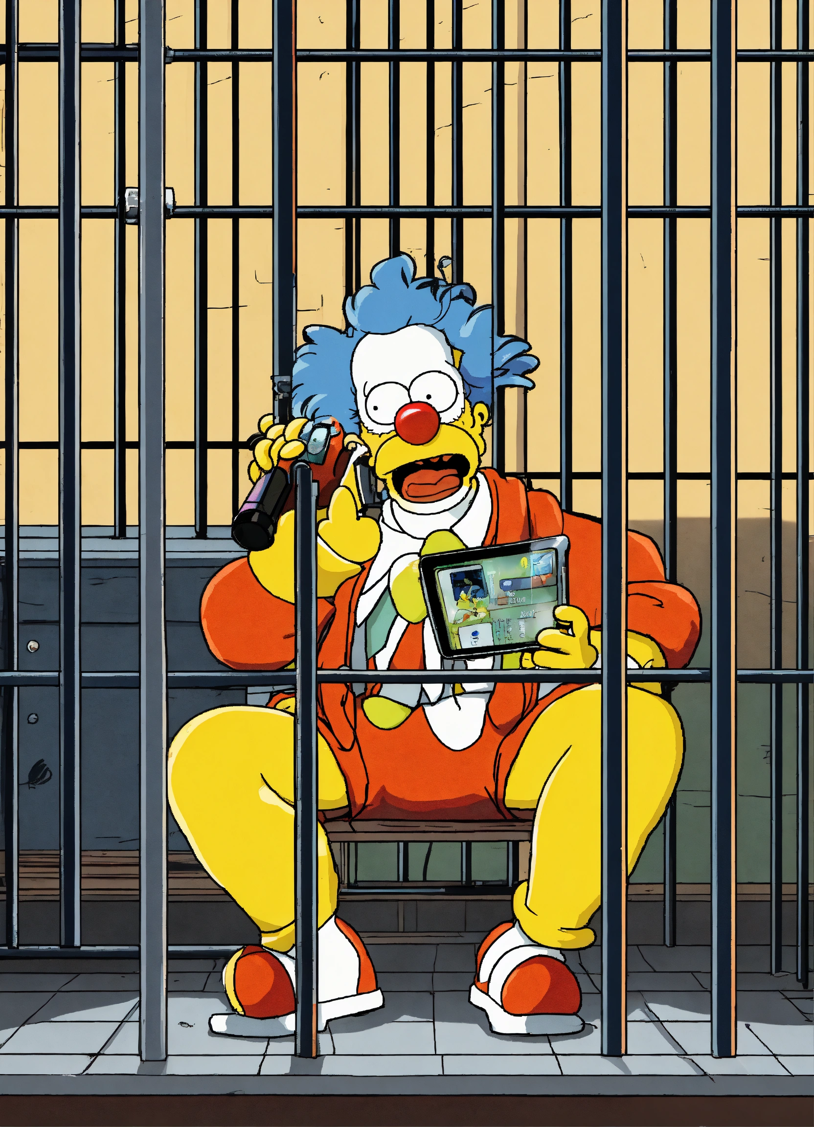 A clown from the simpsons cartoon is sitting in jail talking on a cell phone, there are stock charts on the wall, simpsons cartoon