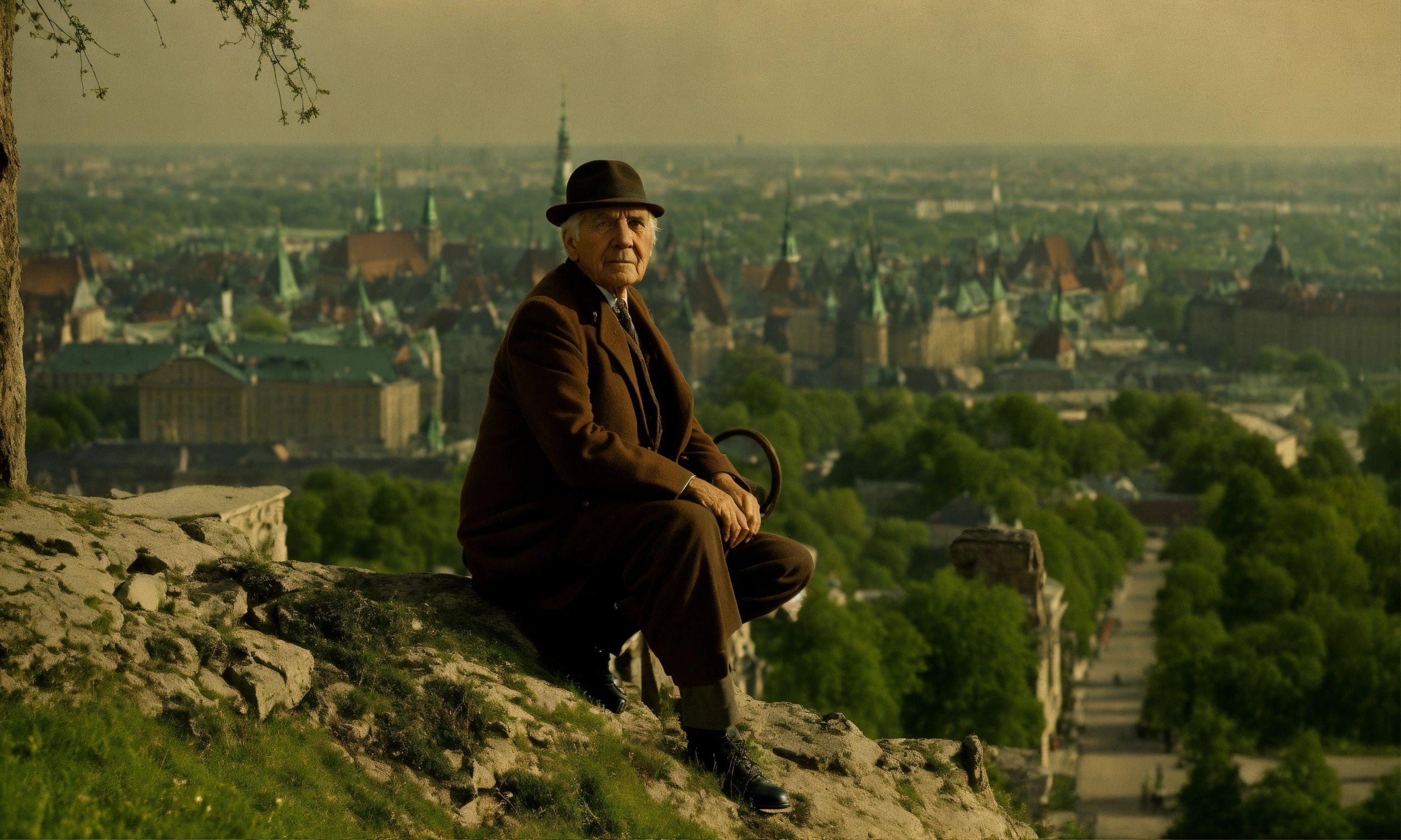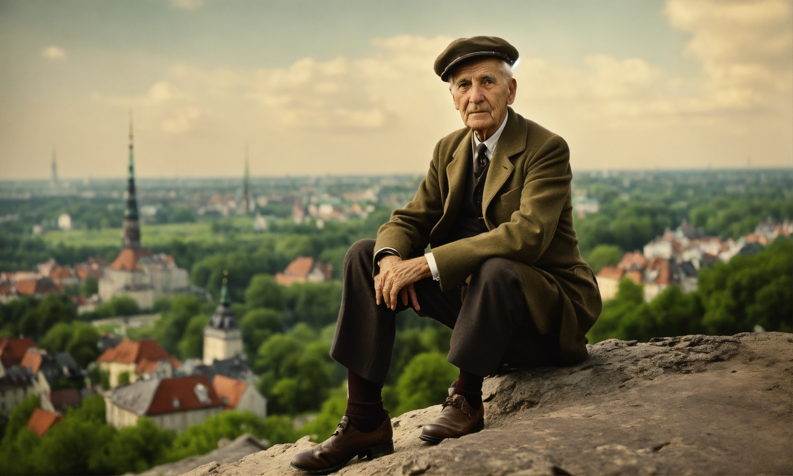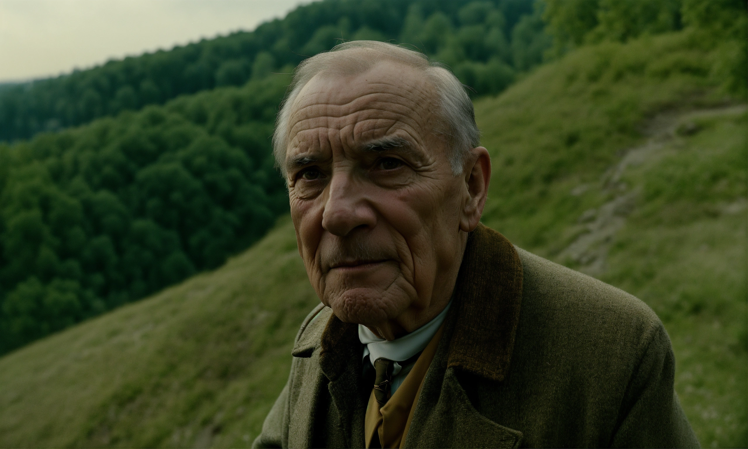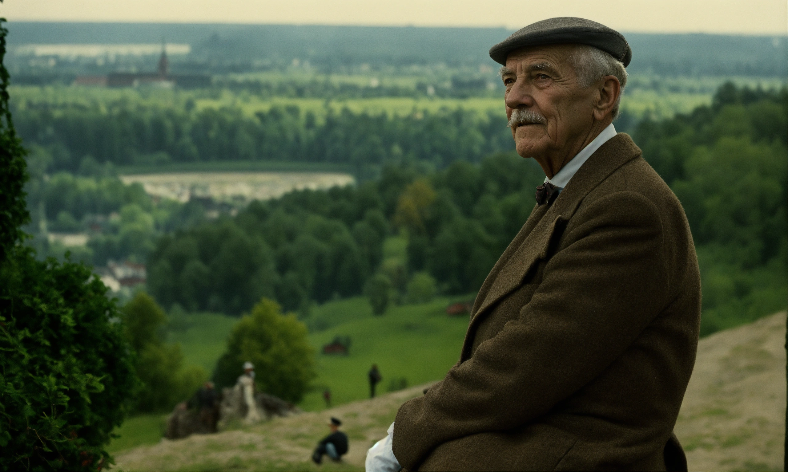 Retro warszawa 1920-1930, elderly gentleman, on top of a mountain, looks at the camera at half height, short hair.