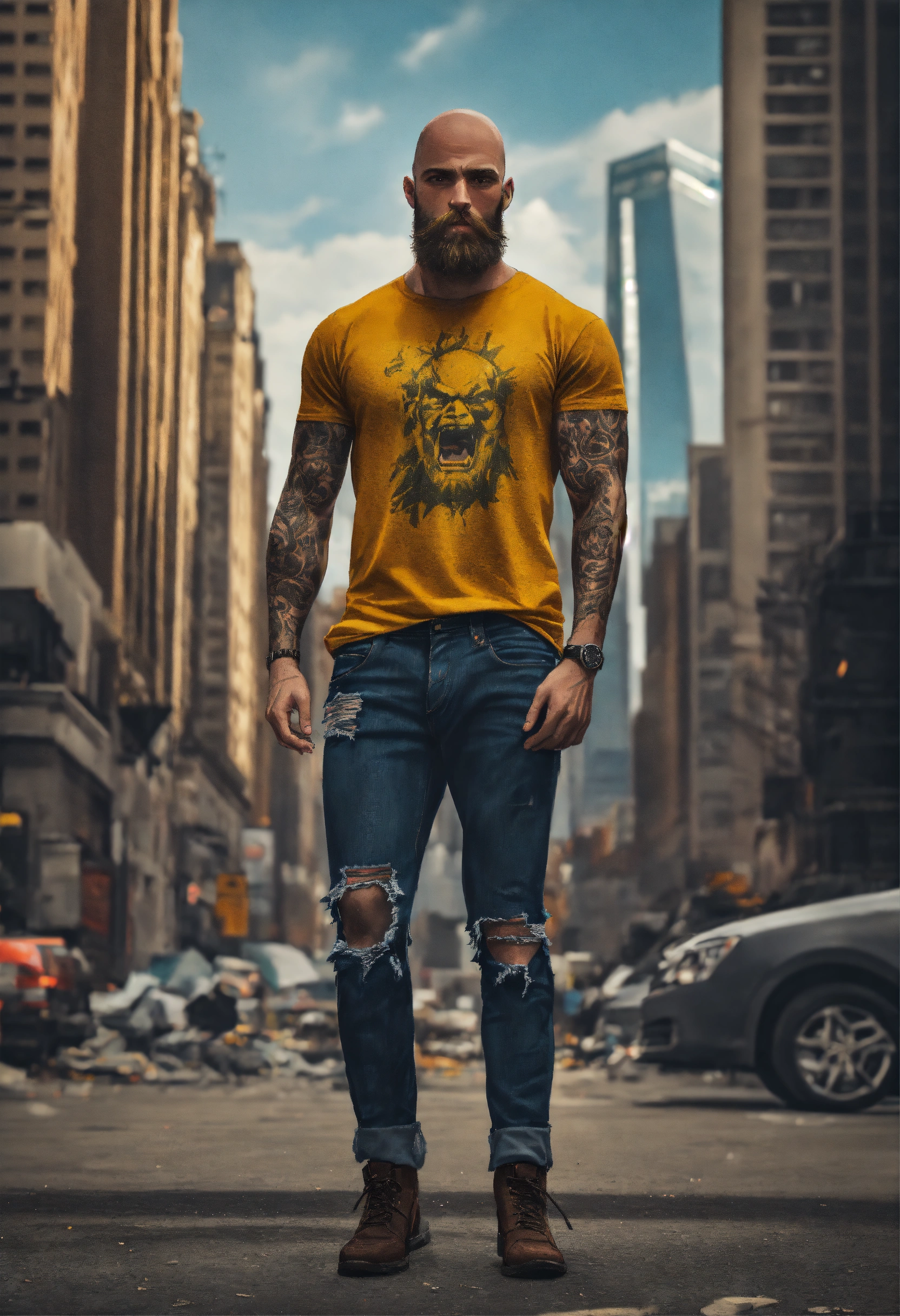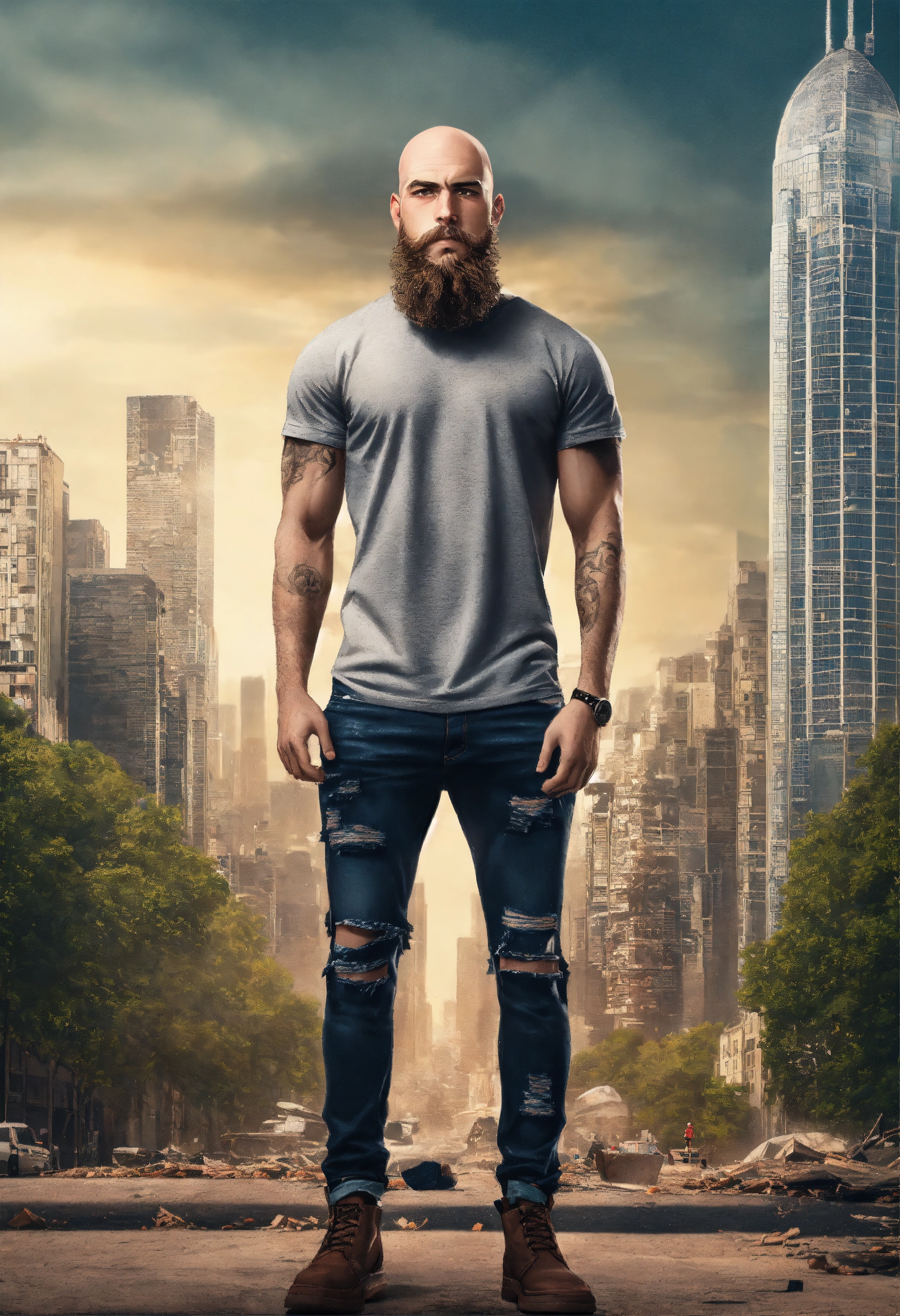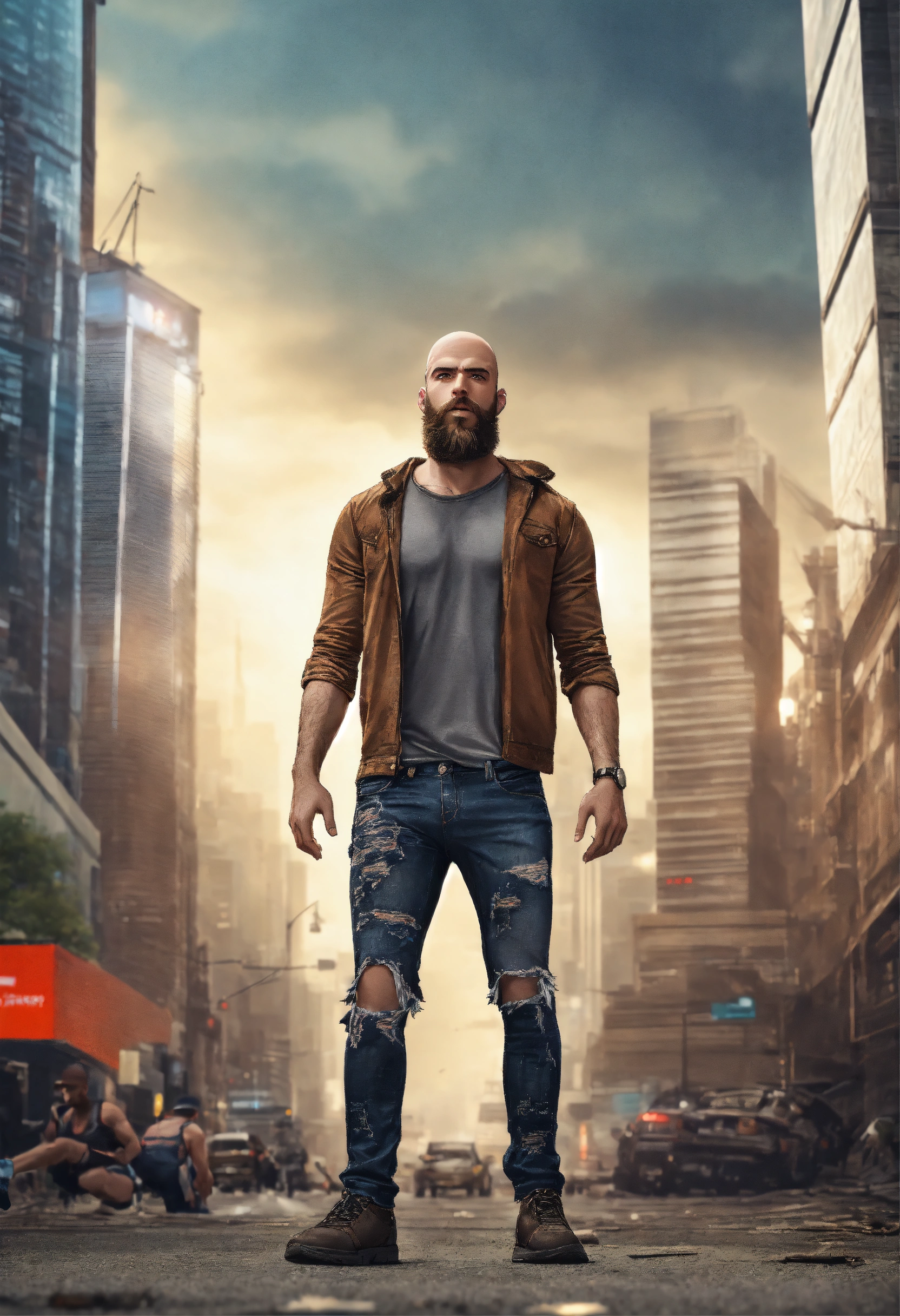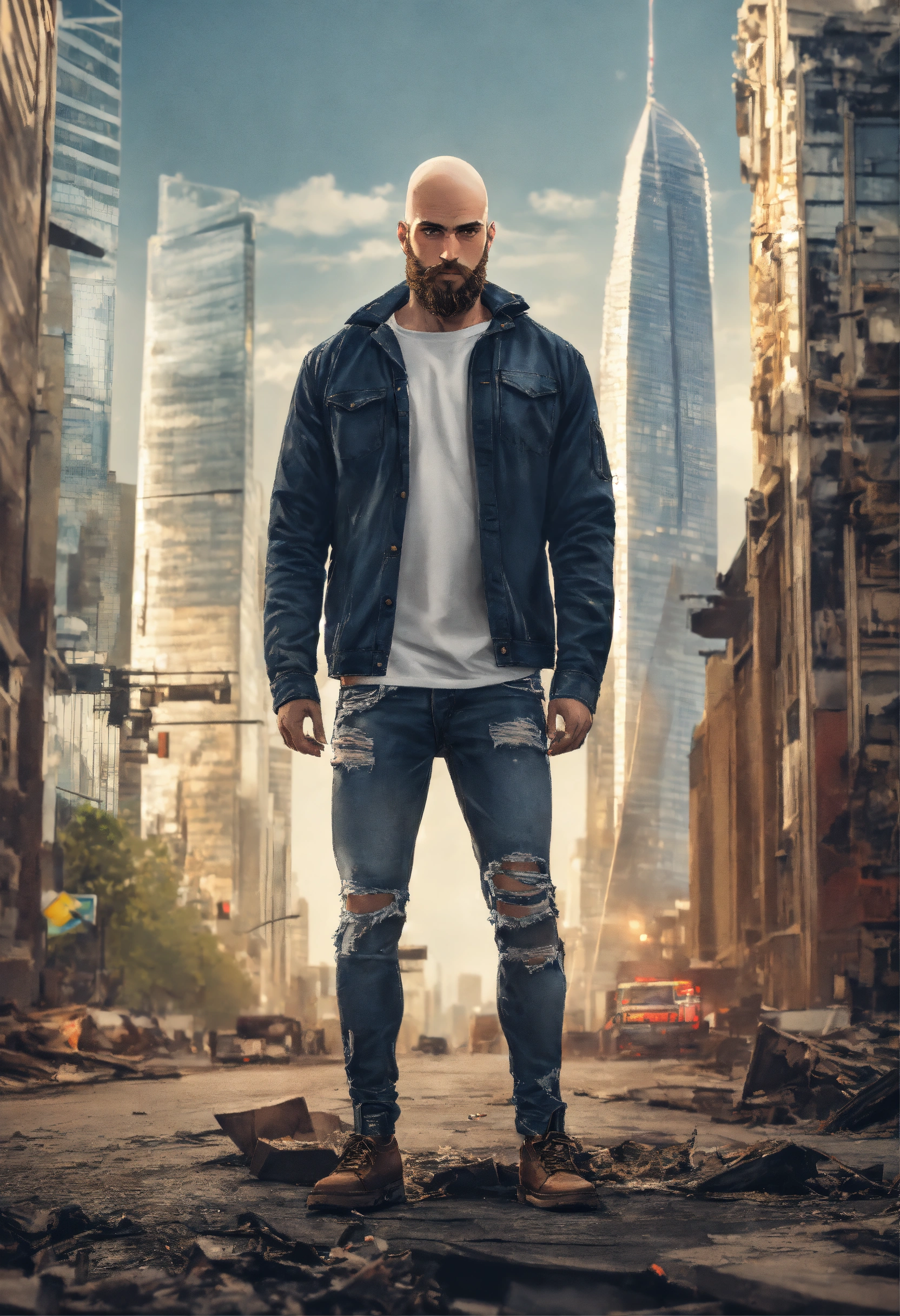 A young bald man with beard 8k modern day 2023 clothing t shirt and ripped jeans generate a gigantic a young bald man with a medium sized beard monster rampaging through a cityscape, with skyscrapers crumbling under its colossal feet