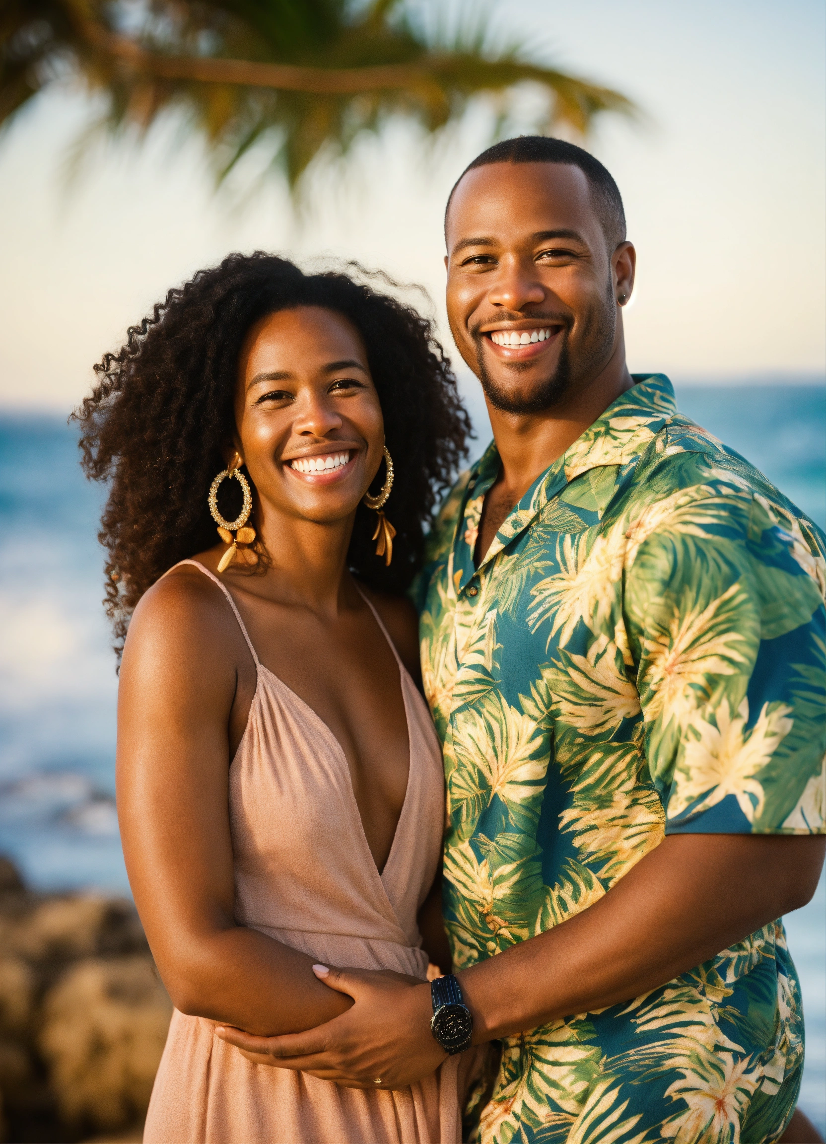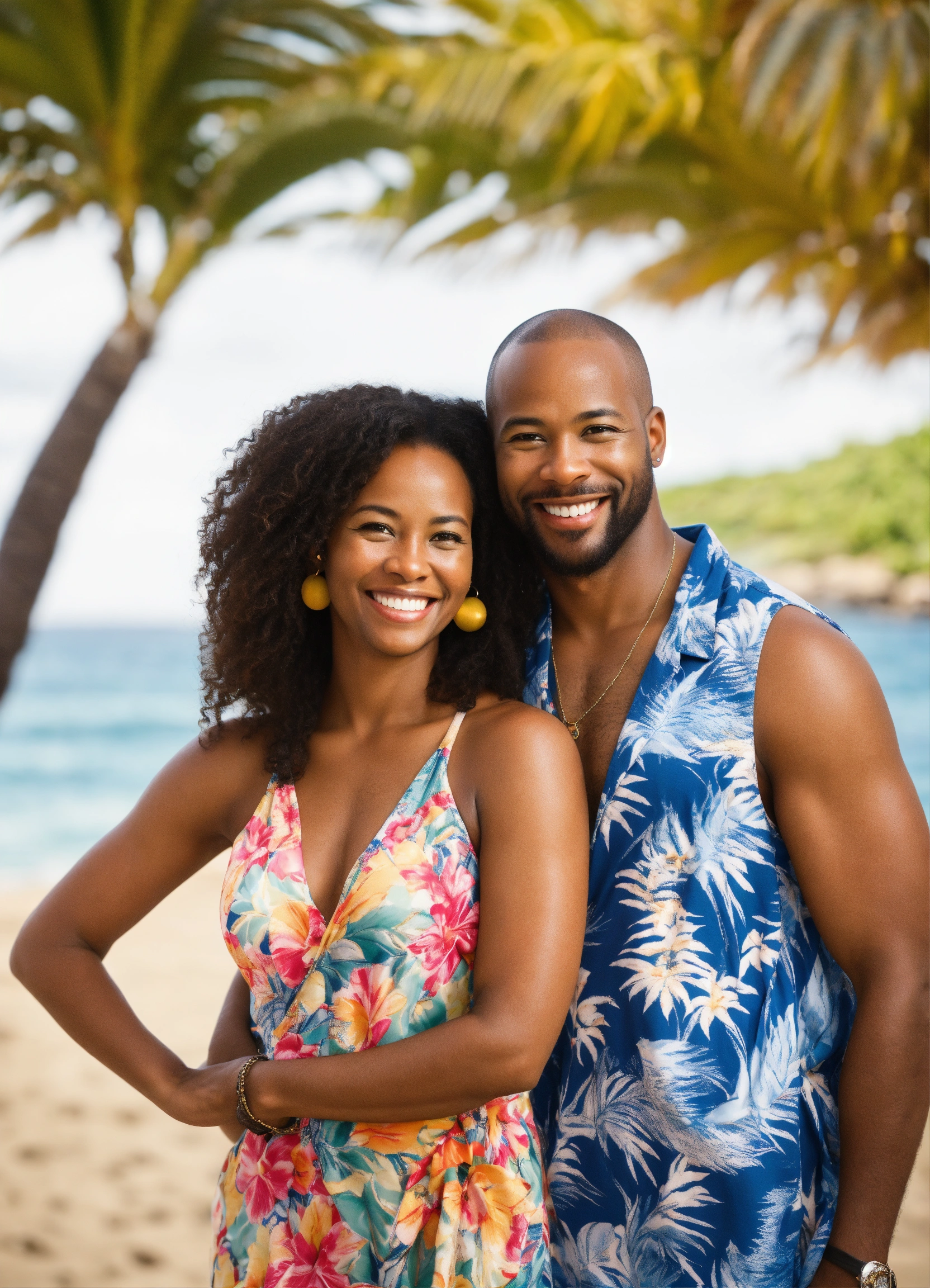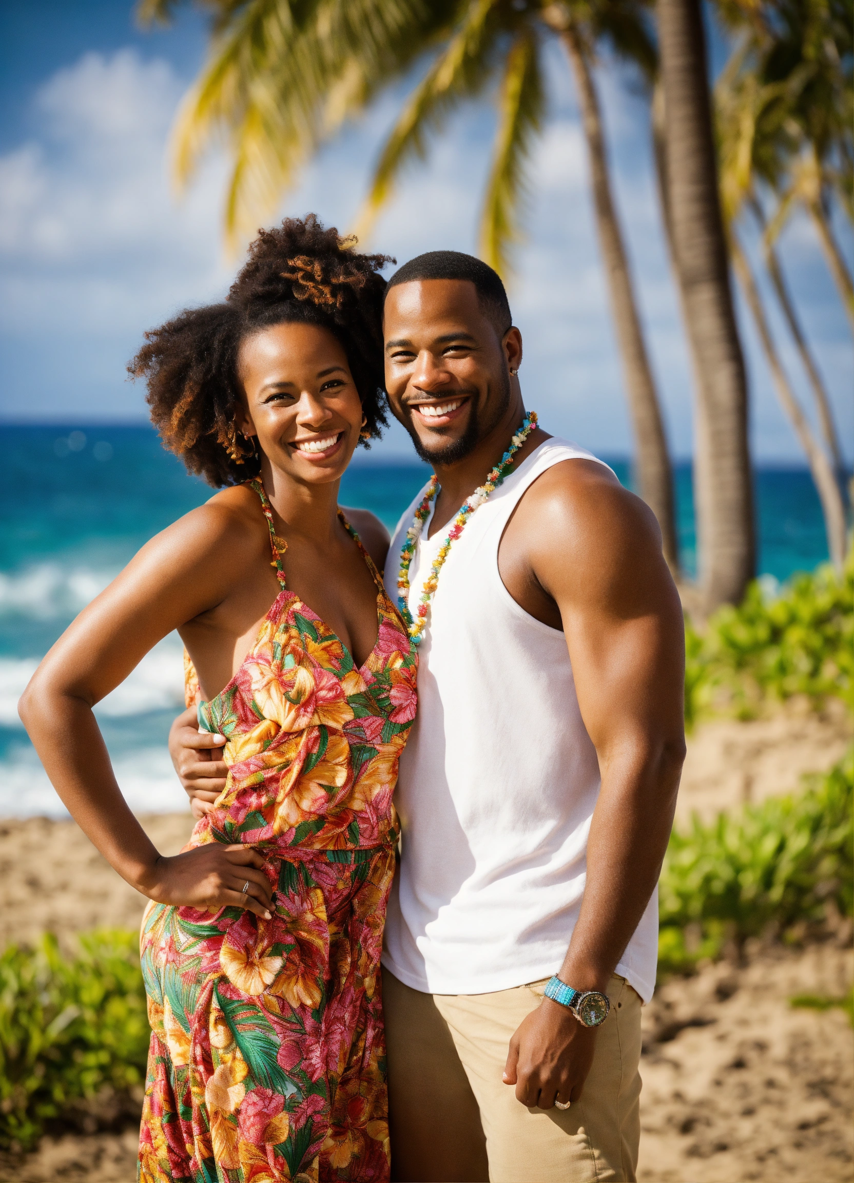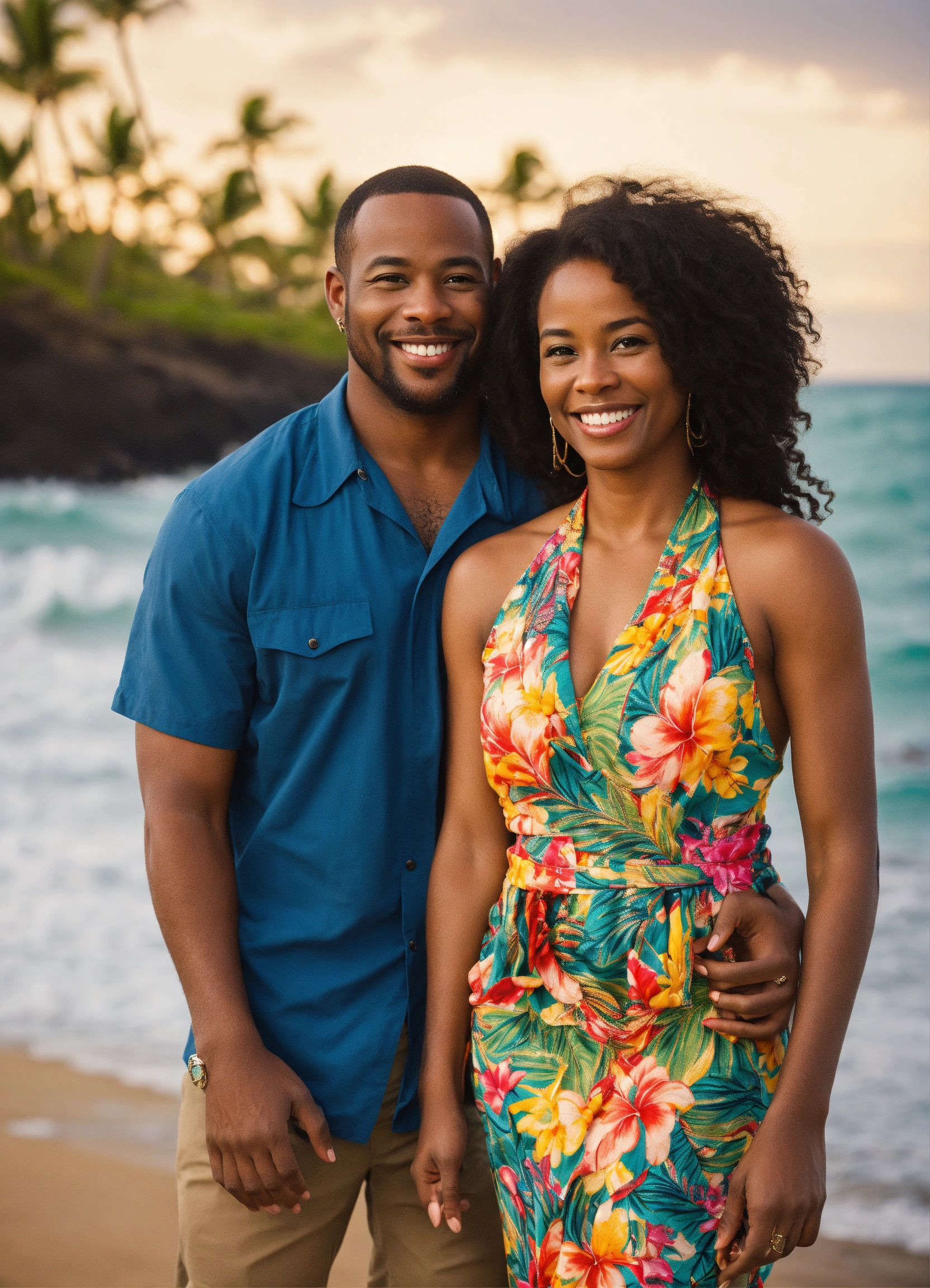 **happy african american man & woman, age 38's, dressed hawaii style smiling directly at the camera with the ocean blurred in the background --s 250** - <@1108155192748281928> (fast)