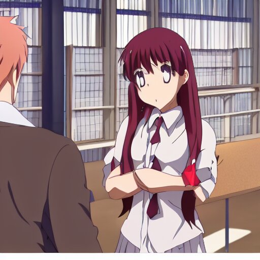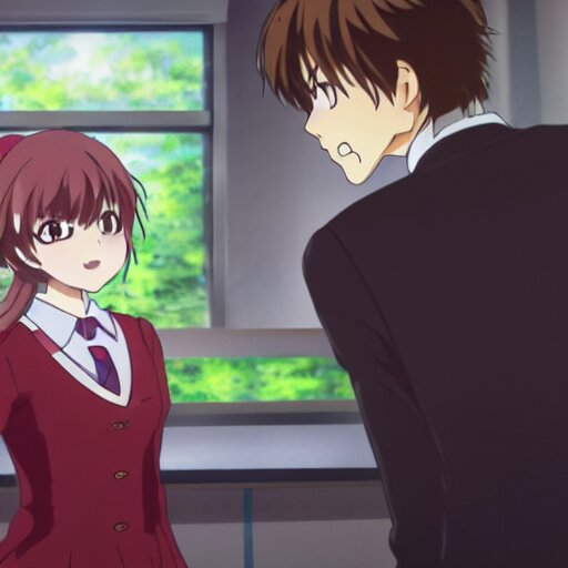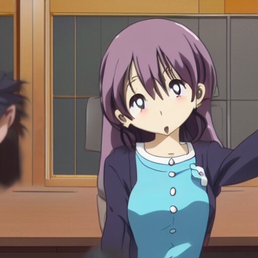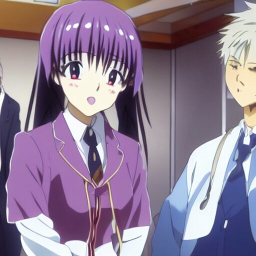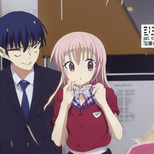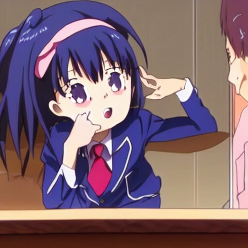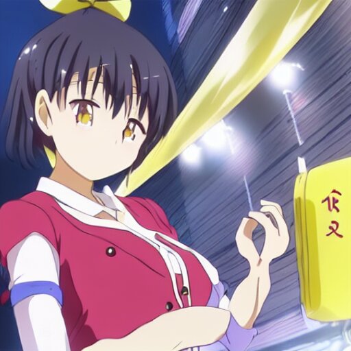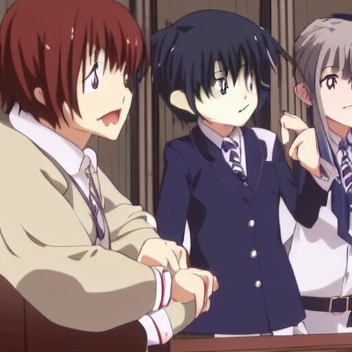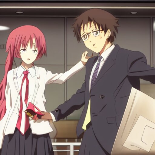 Cute anime girl bribing the district attorney. key frame, still from tv anime, kyoto animation studio, flash photography