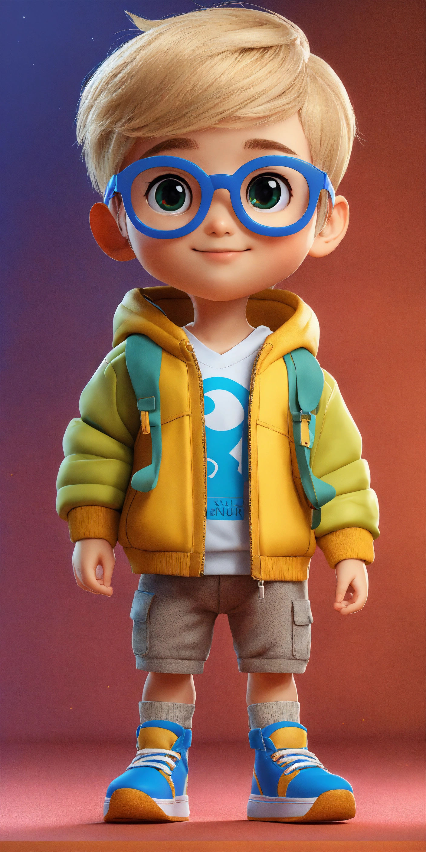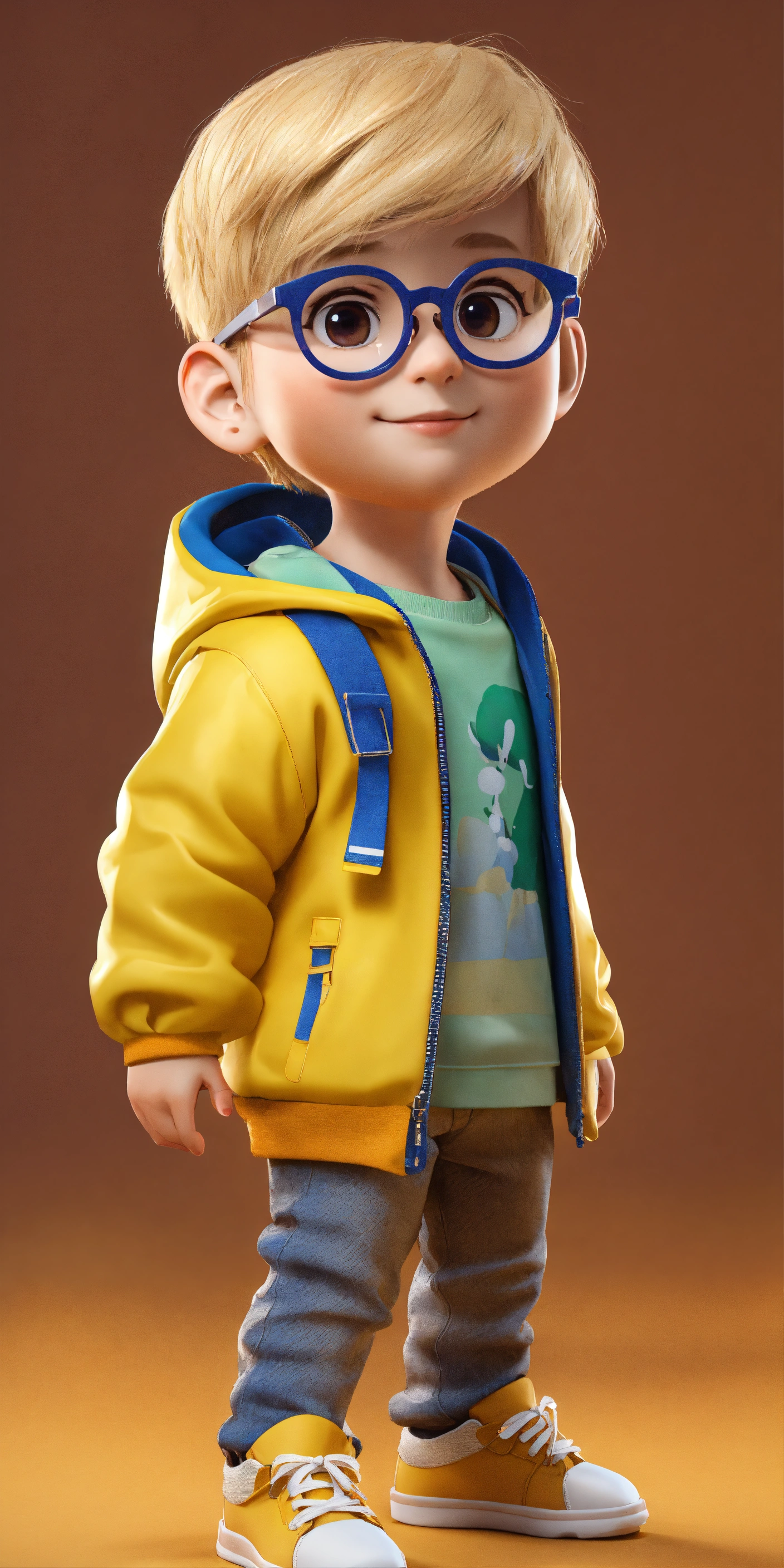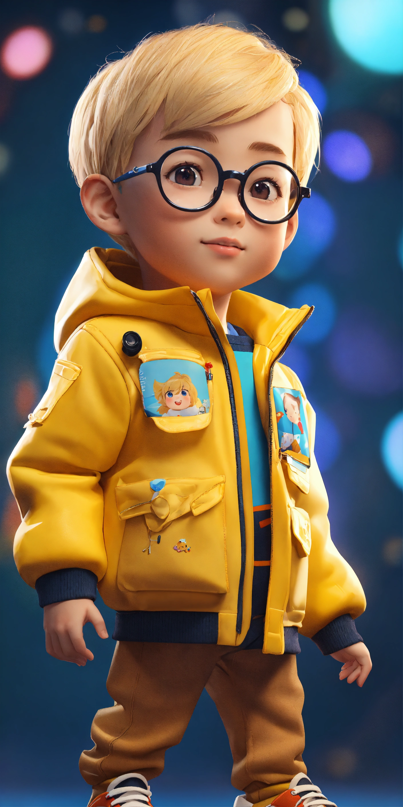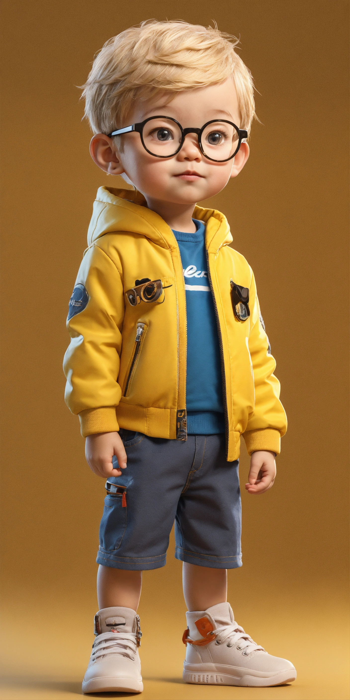 A beautiful young 3 years boy old, full body image of a cute little chibi boy realistic, vivid colors octane render trending on artstation, united colour background wall, wearing glasses and a yellow jacket, beautiful 3 d rendering, pixar cute, inspired by du qiong, blond boy, andrew dickson, realistic, 3d, cartoon style, well shaded, smooth, pixar.