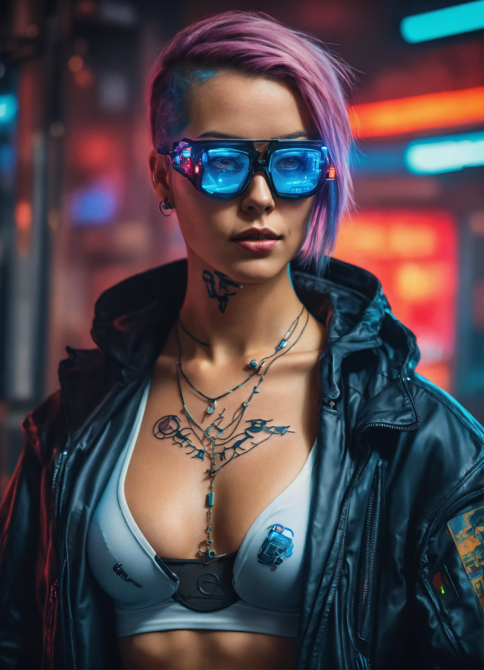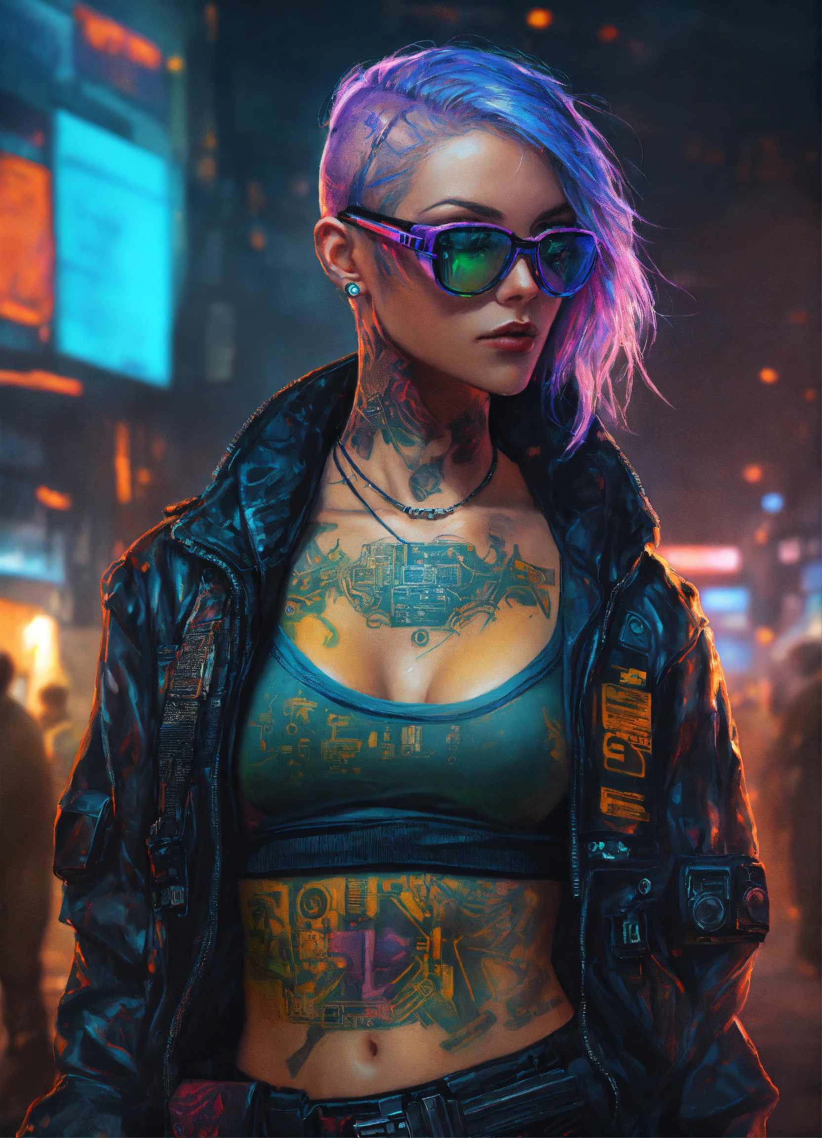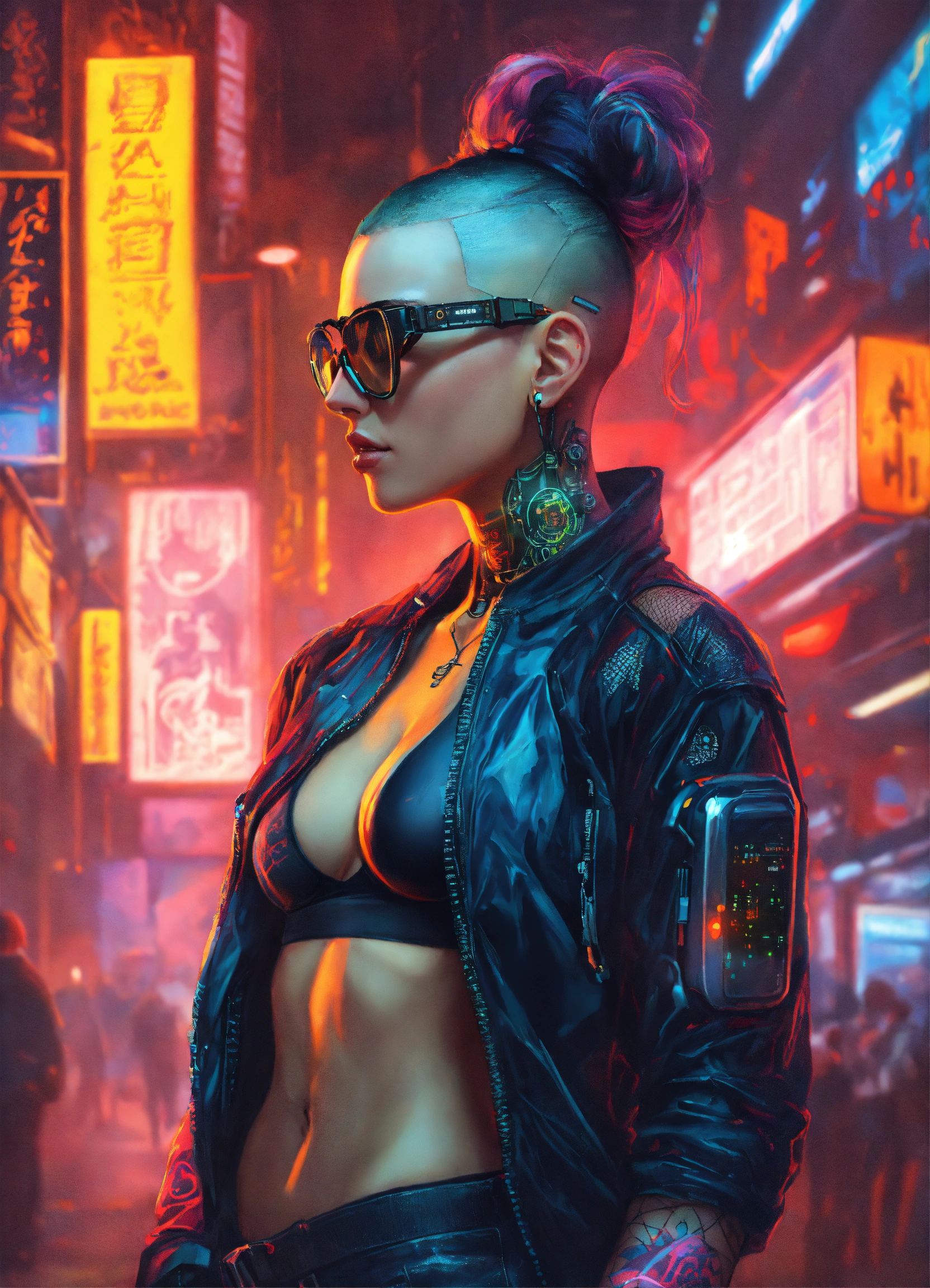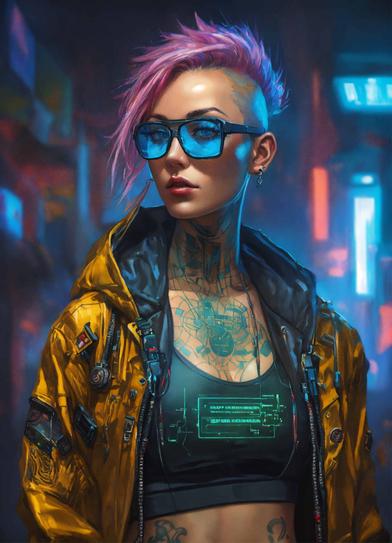 Cyberpunk cybernetic femme hacker+ bald with circuit tattoos, fishnet t-shirt, sports bra, jacket, glasses, cyberspace infiltrator with a secret agenda. high tech low life, hyper realistic oil painting style.