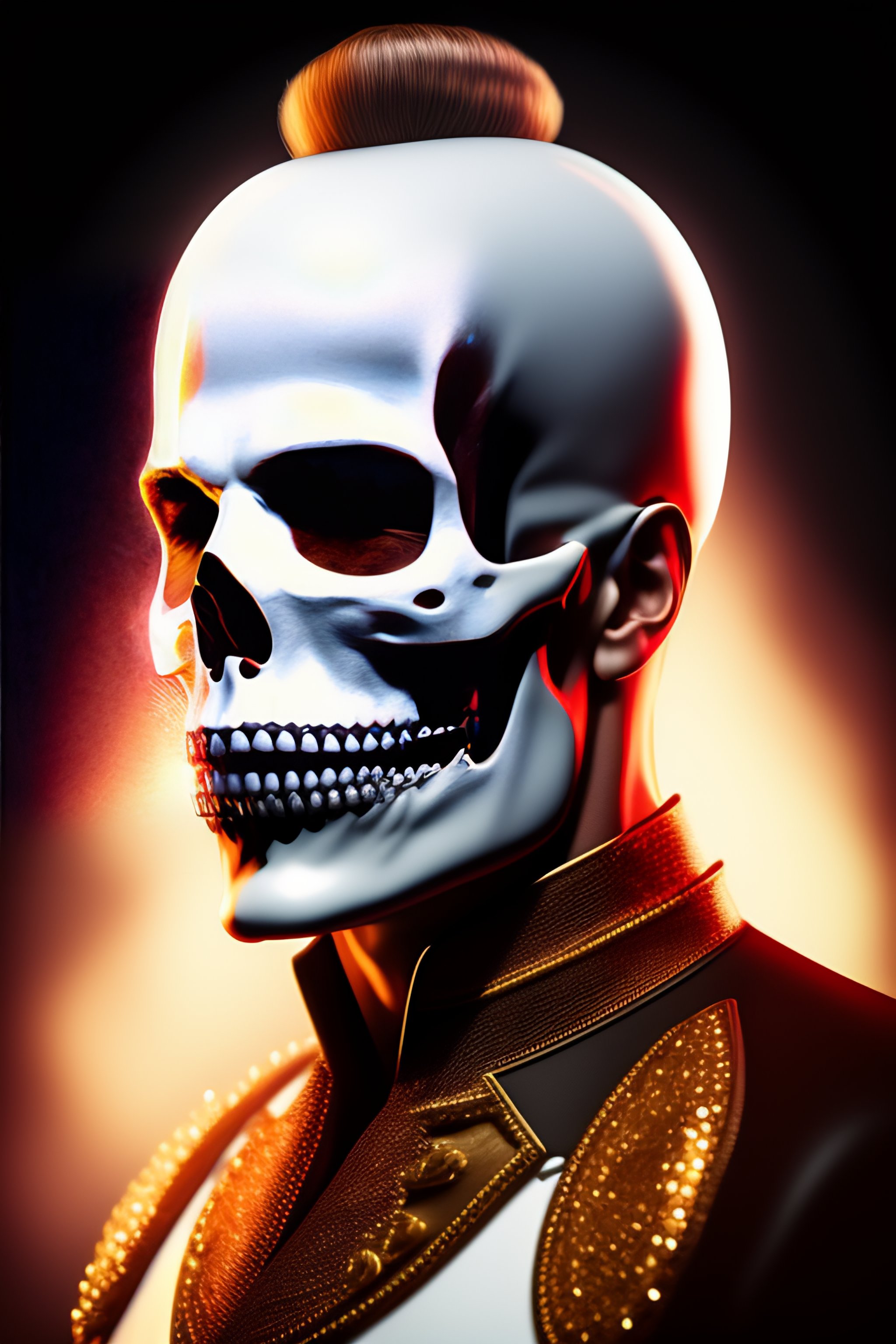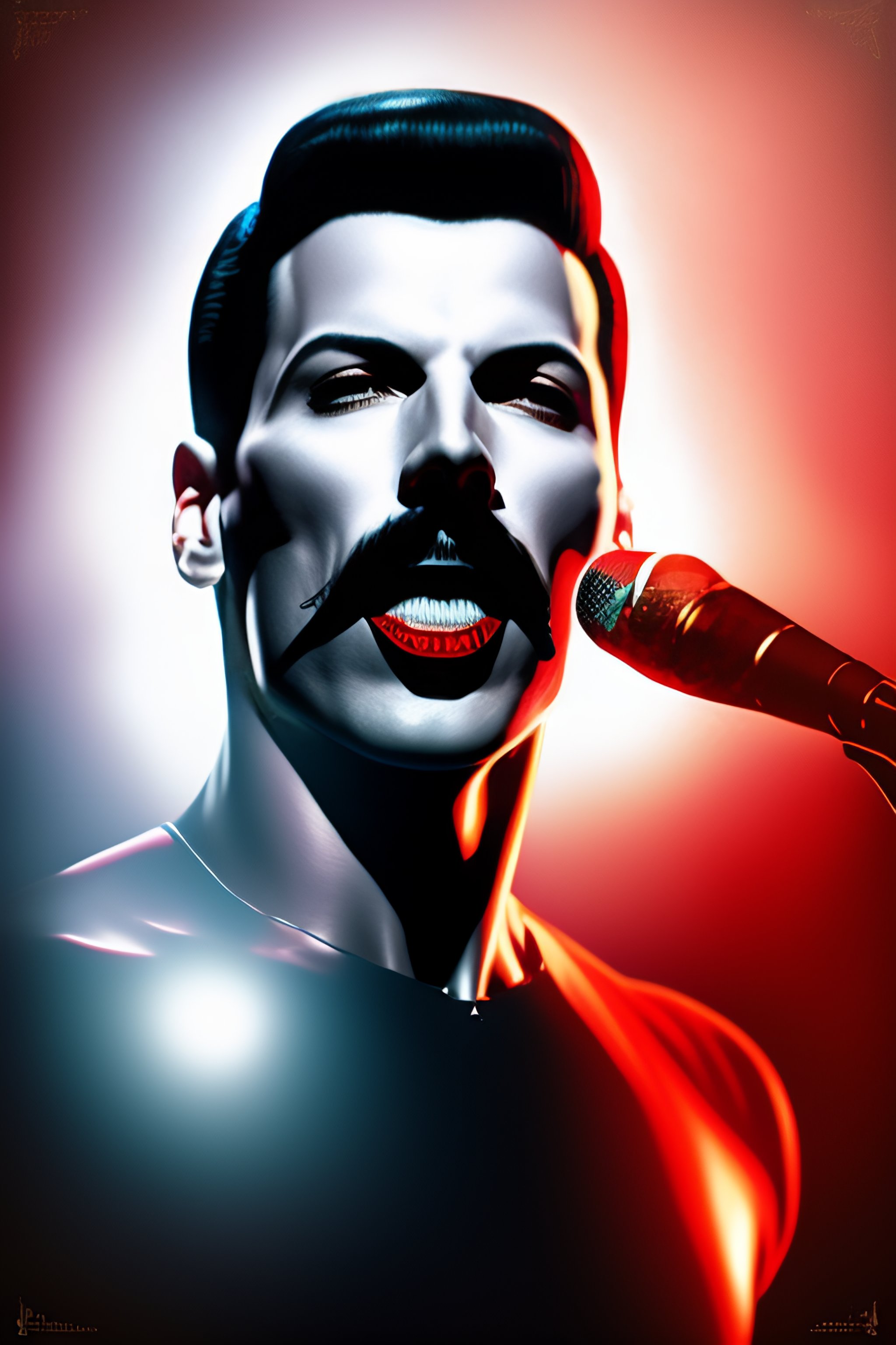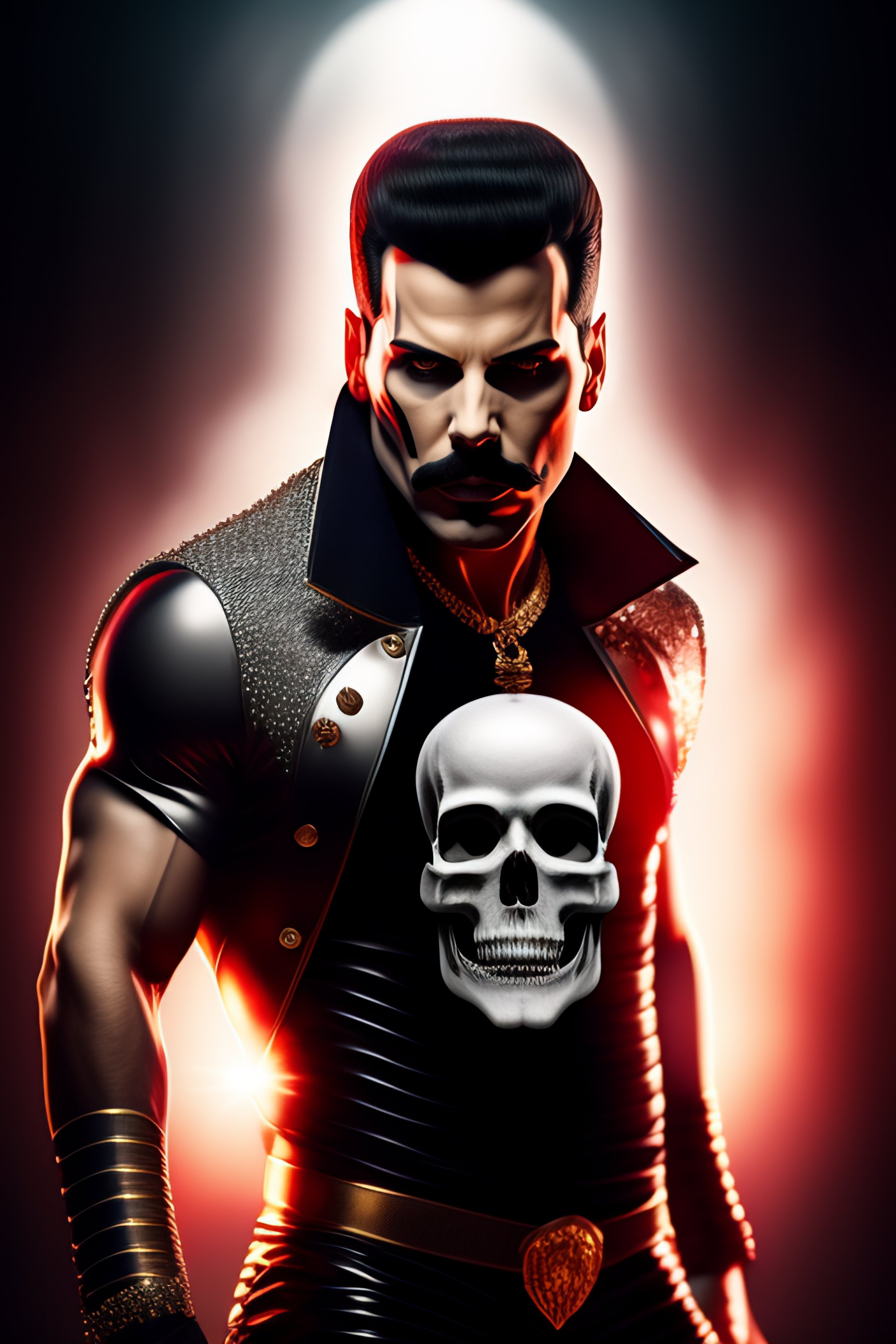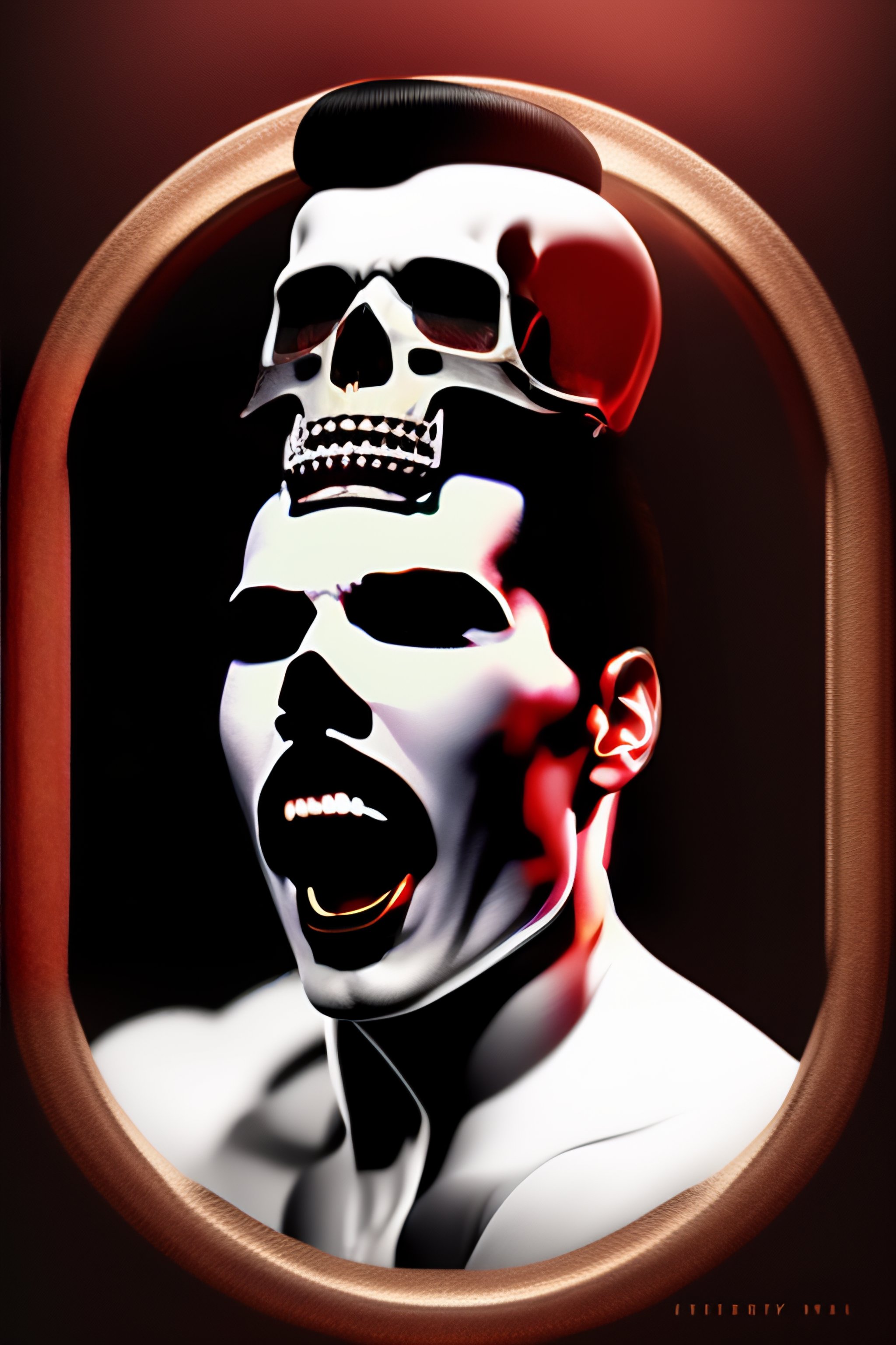 Freddy mercury in a digital paint portrait of a skull face as freddy mercury singing, skull face, white tank top, 32k, realistic, award wining photo, rim lighting, detailed hair