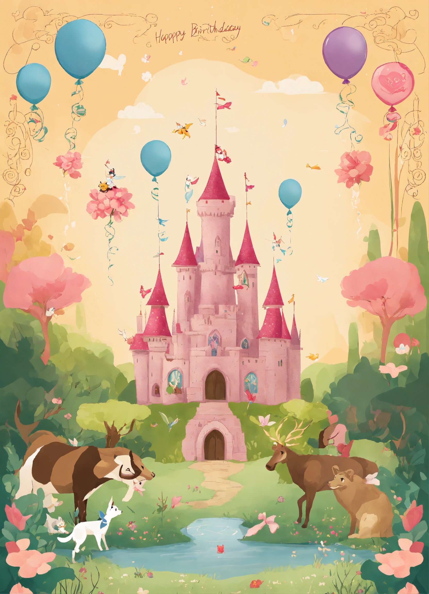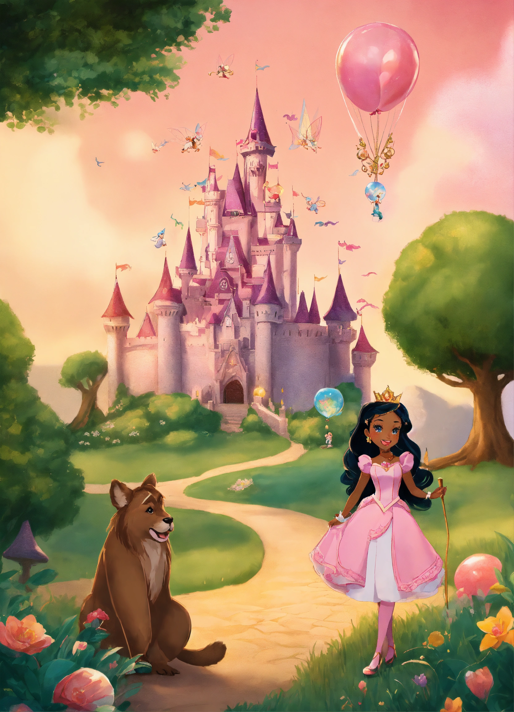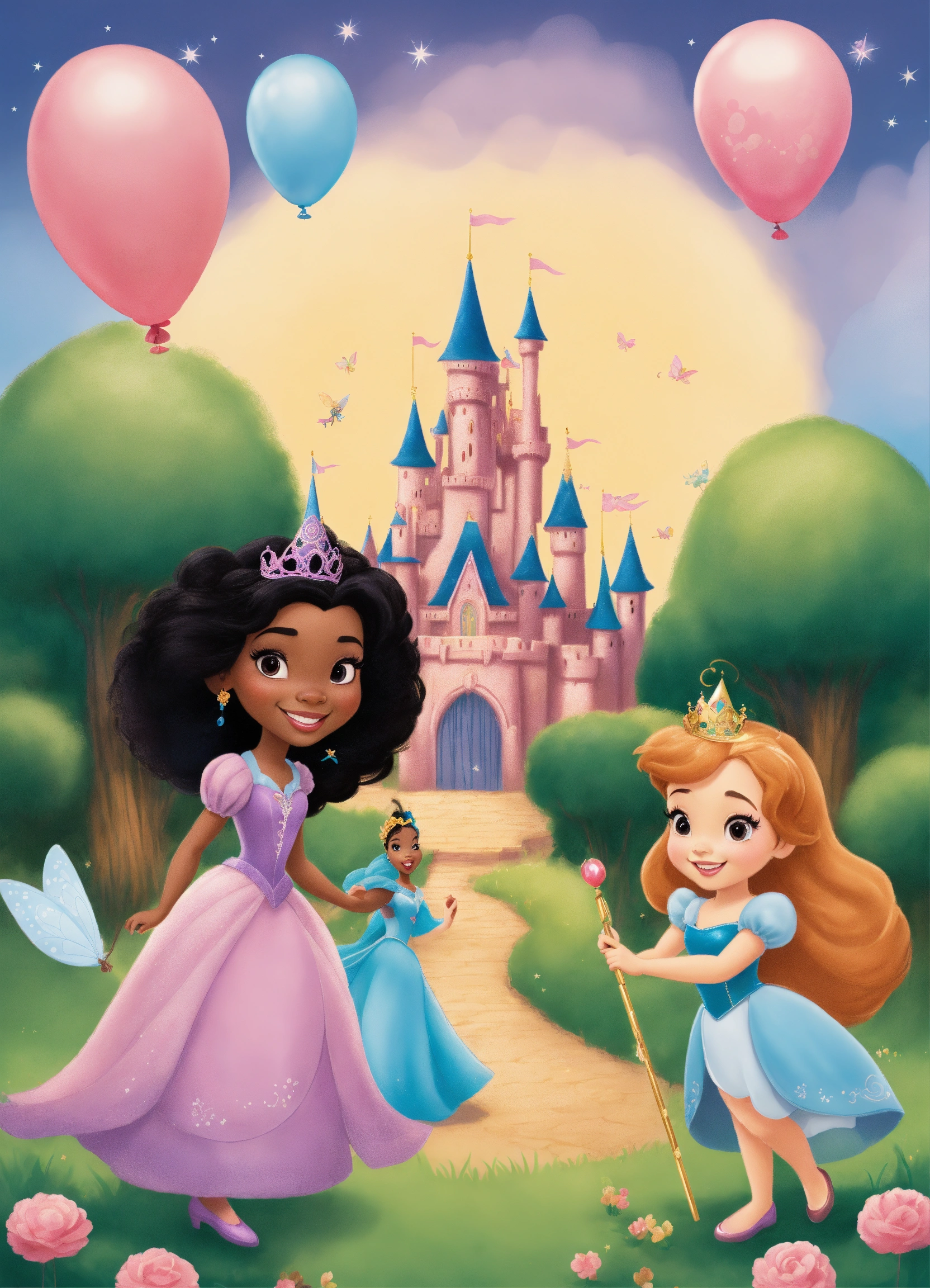 "design a birthday whimsical party invitation concept for a 5-6-year-old inspired by a beautiful african american disney pixar princesses. the theme, 'enchanted disney princess birthday adventure, ' should revolve around a specific disney princess character, enchanted magical fairytale using a soft pastel color palette and featuring fairy tale elements like castles, magical wands, and animal sidekicks. blank template. the design should be age-appropriate and exude a sense of wonder and magic. incorporate playful fonts and illustrations, including the chosen disney princess, a castle, balloons, and friendly animals. please create a captivating and delightful design that captures the essence of a fairy tale adventure