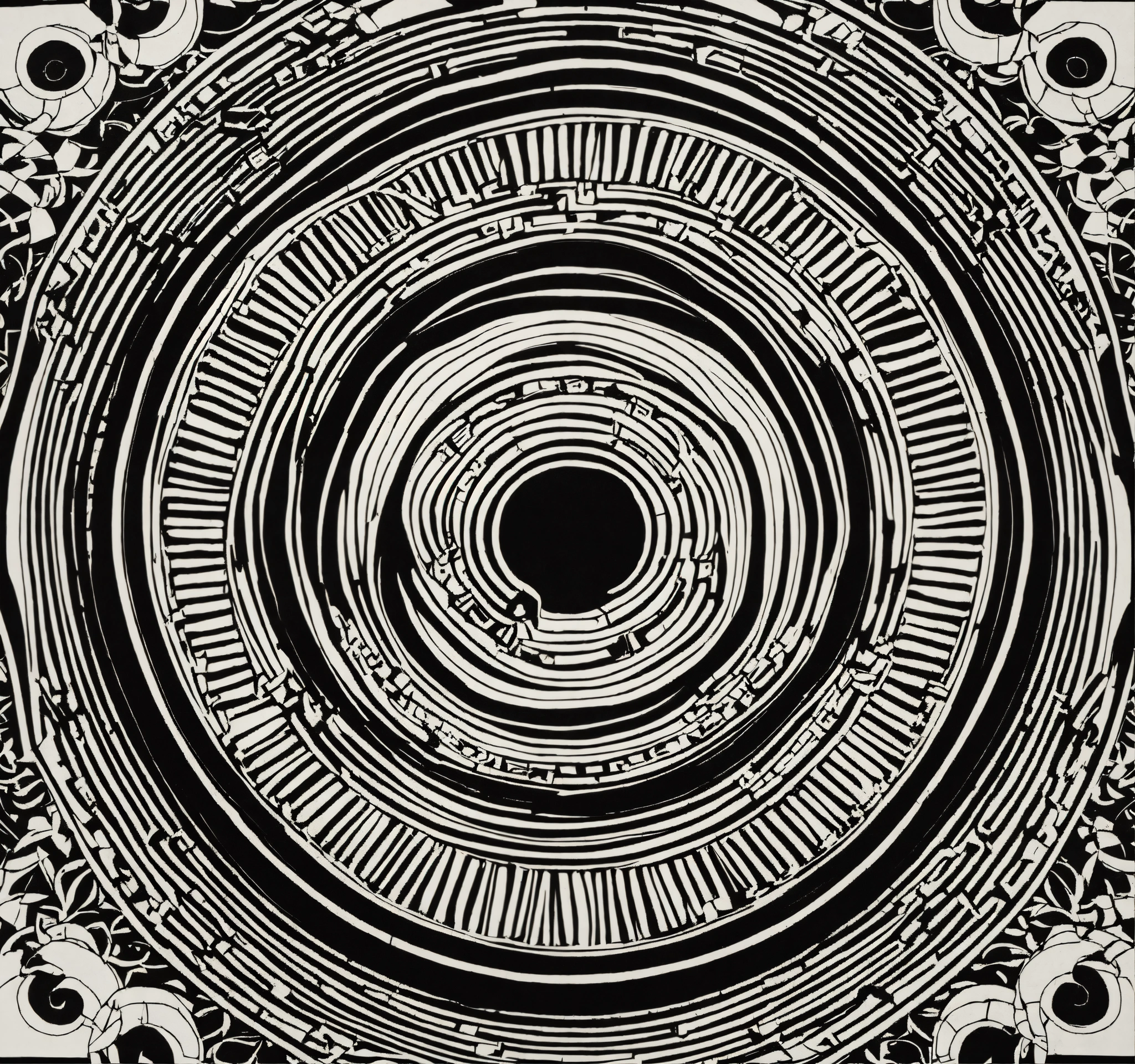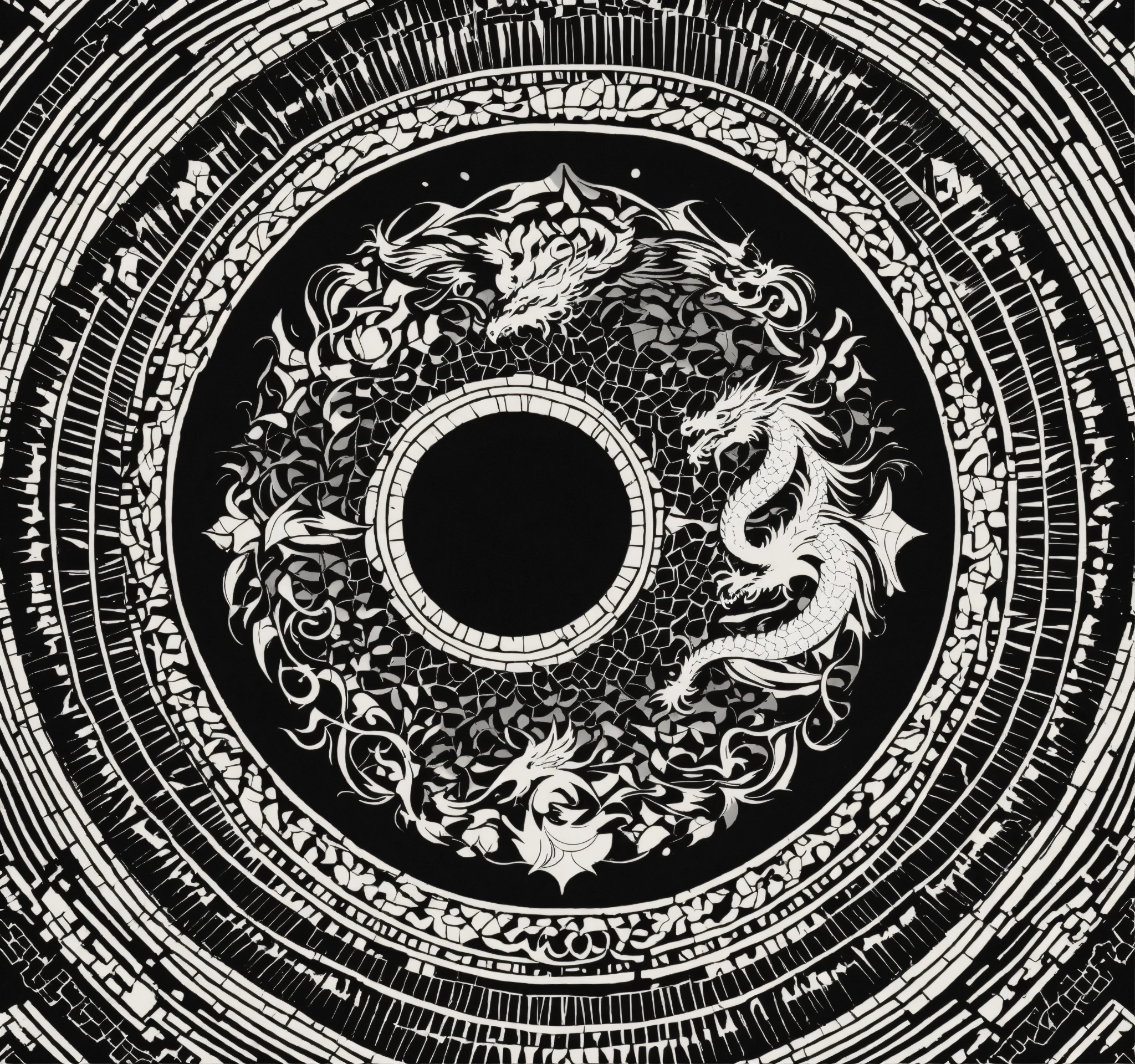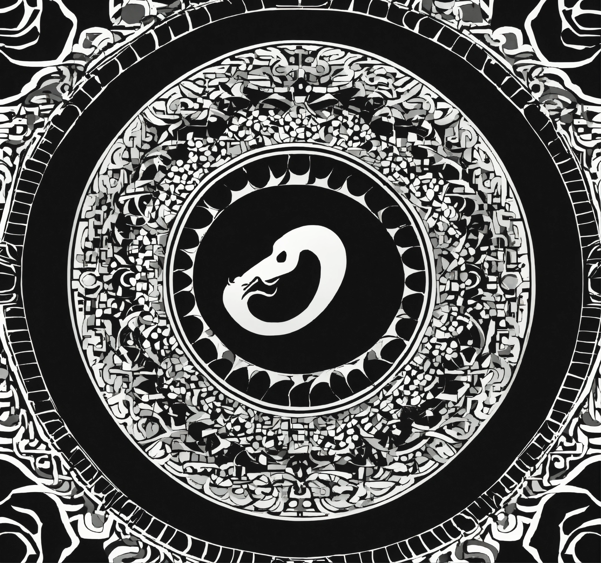 Round geometric black and white pattern in the form of a dragon biting its tail