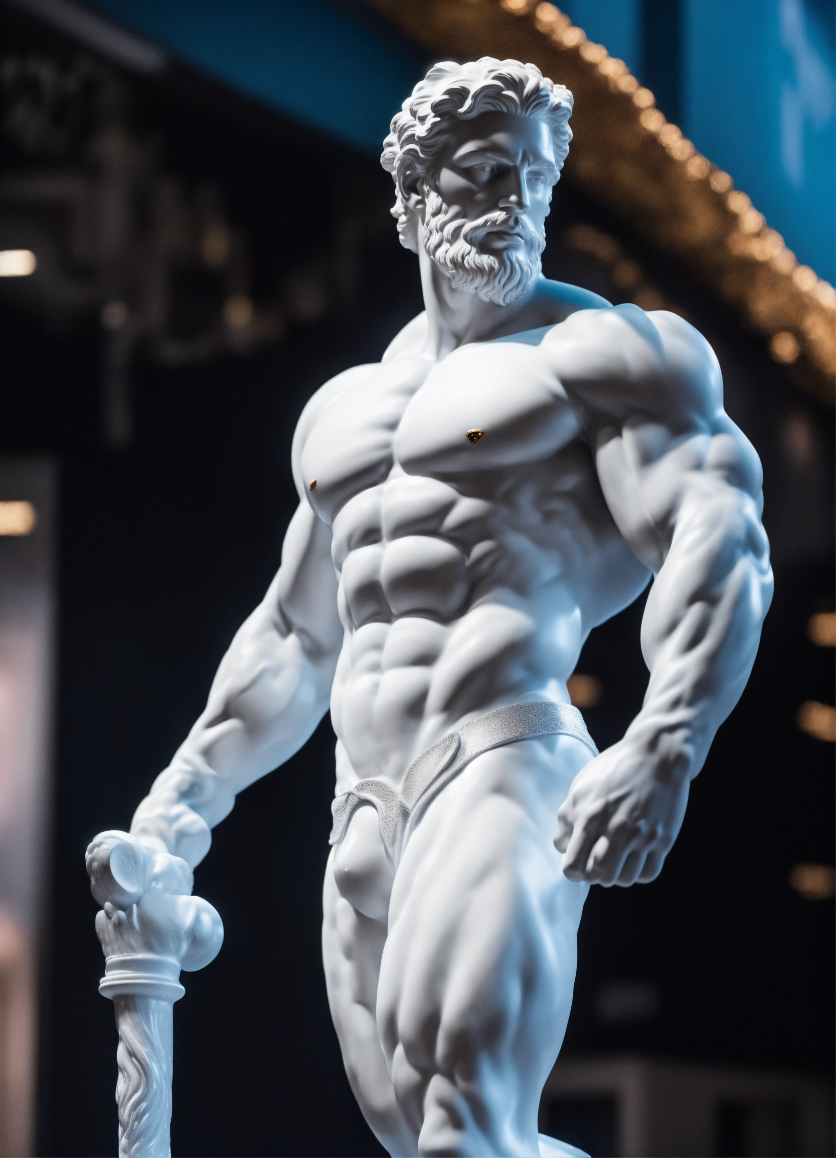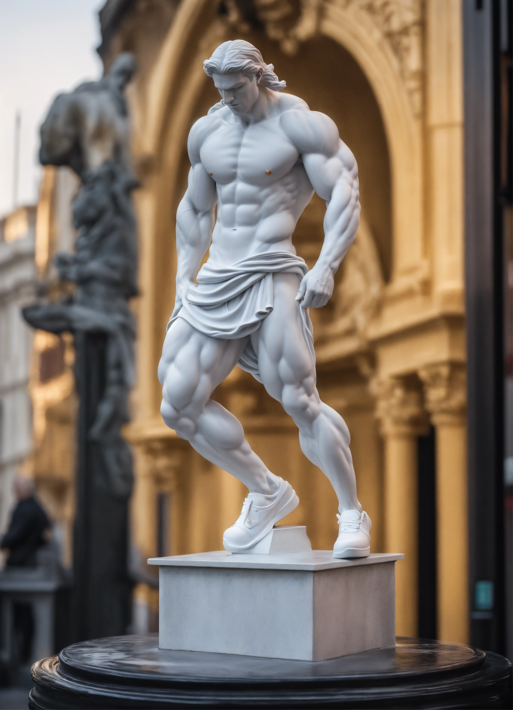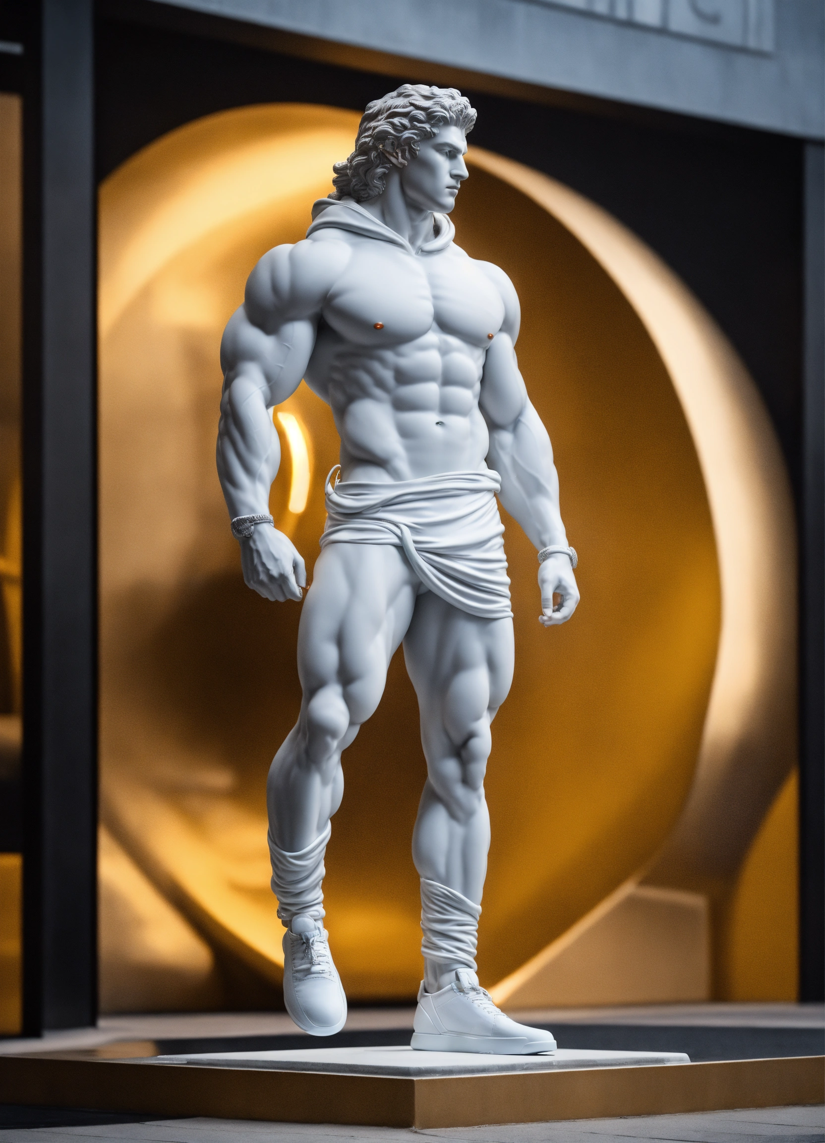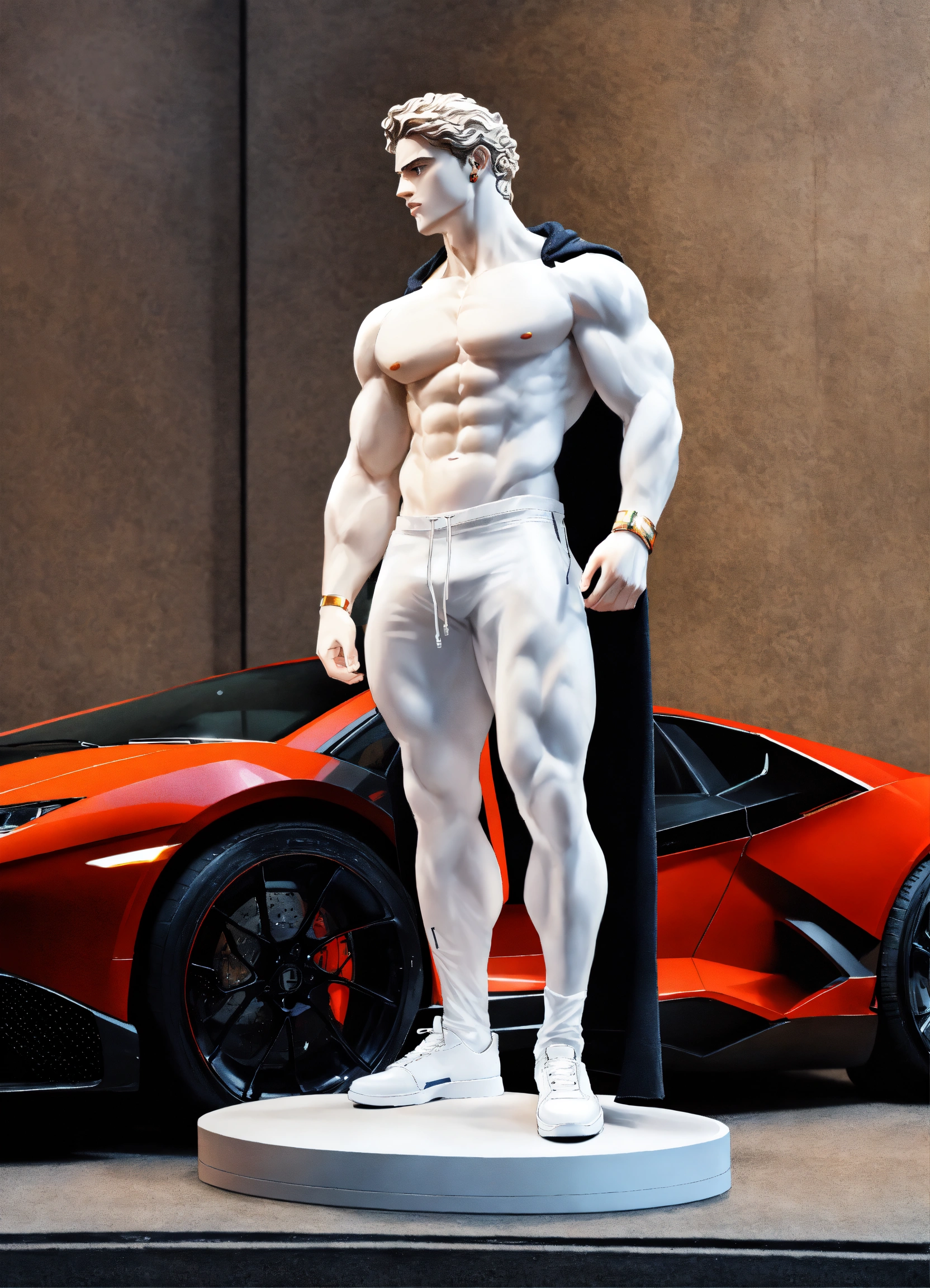 A statue from a muscular greek god statue with a wavey middel parting hair with white color on his body with a black backround standing on a podest 8k wearing airpods max and a black hoddie standing next to a lamborghini
