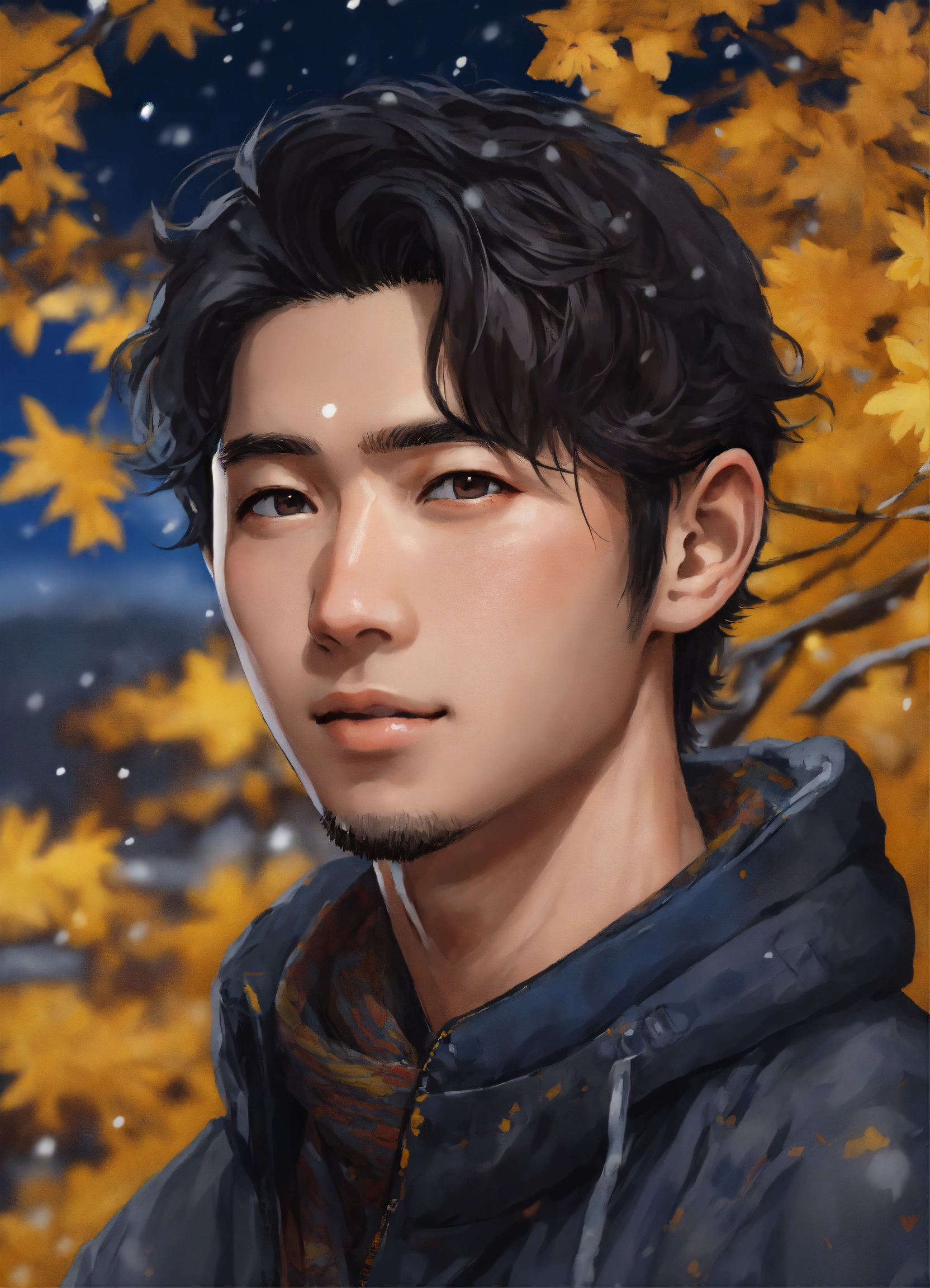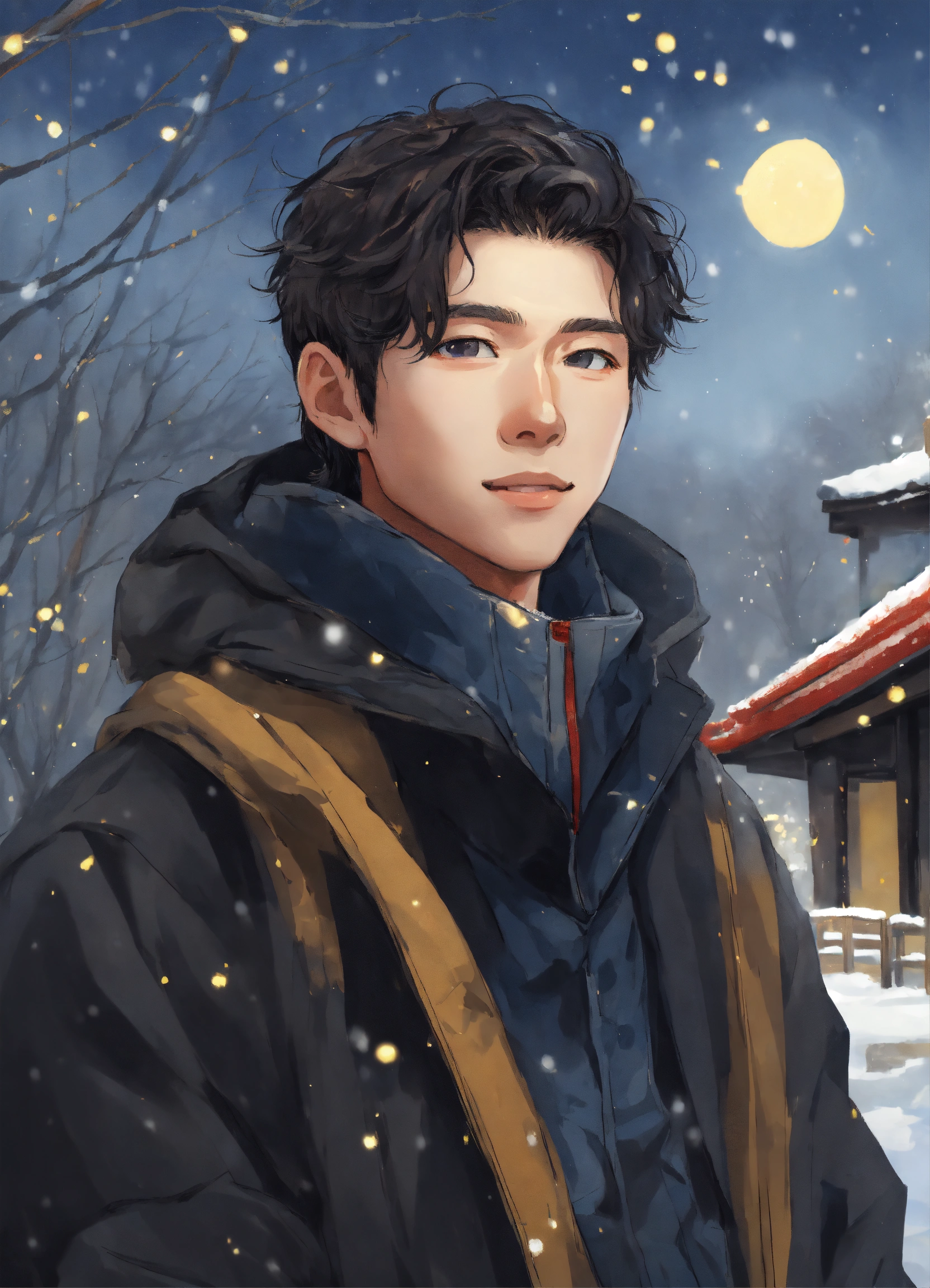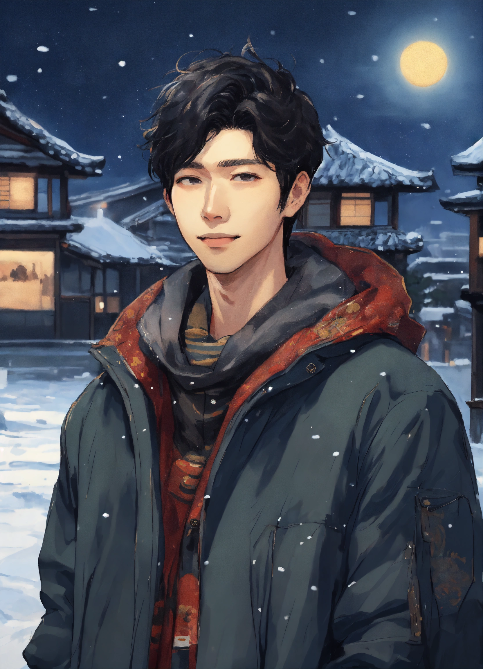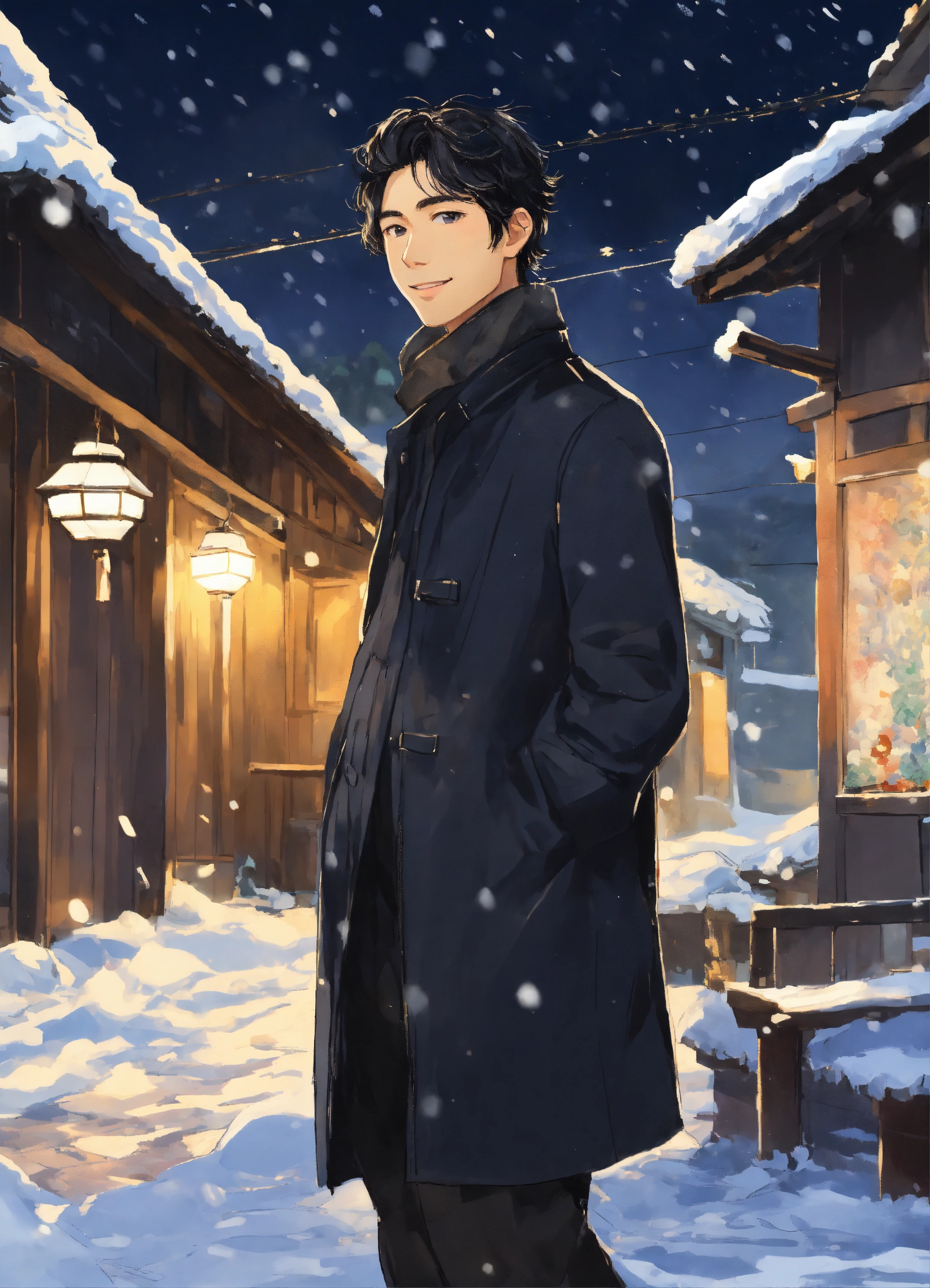 Japanese, male, 25 years old, fair skin, black permed hair, innocent smile, baby face, clothes are black, background is winter japan, van gogh style illustration, upper body is shown
