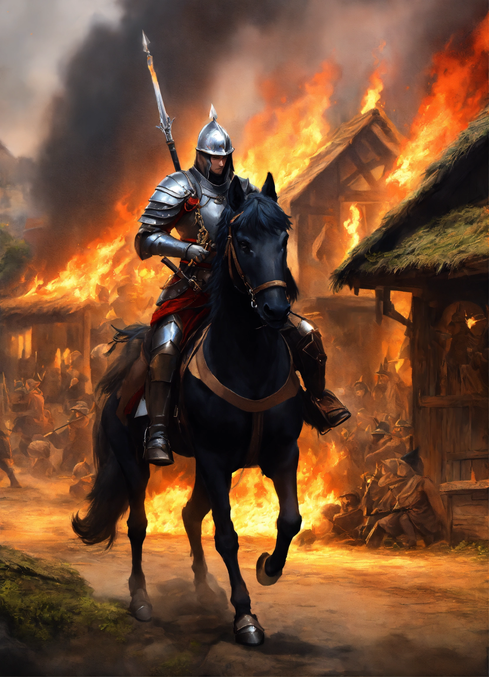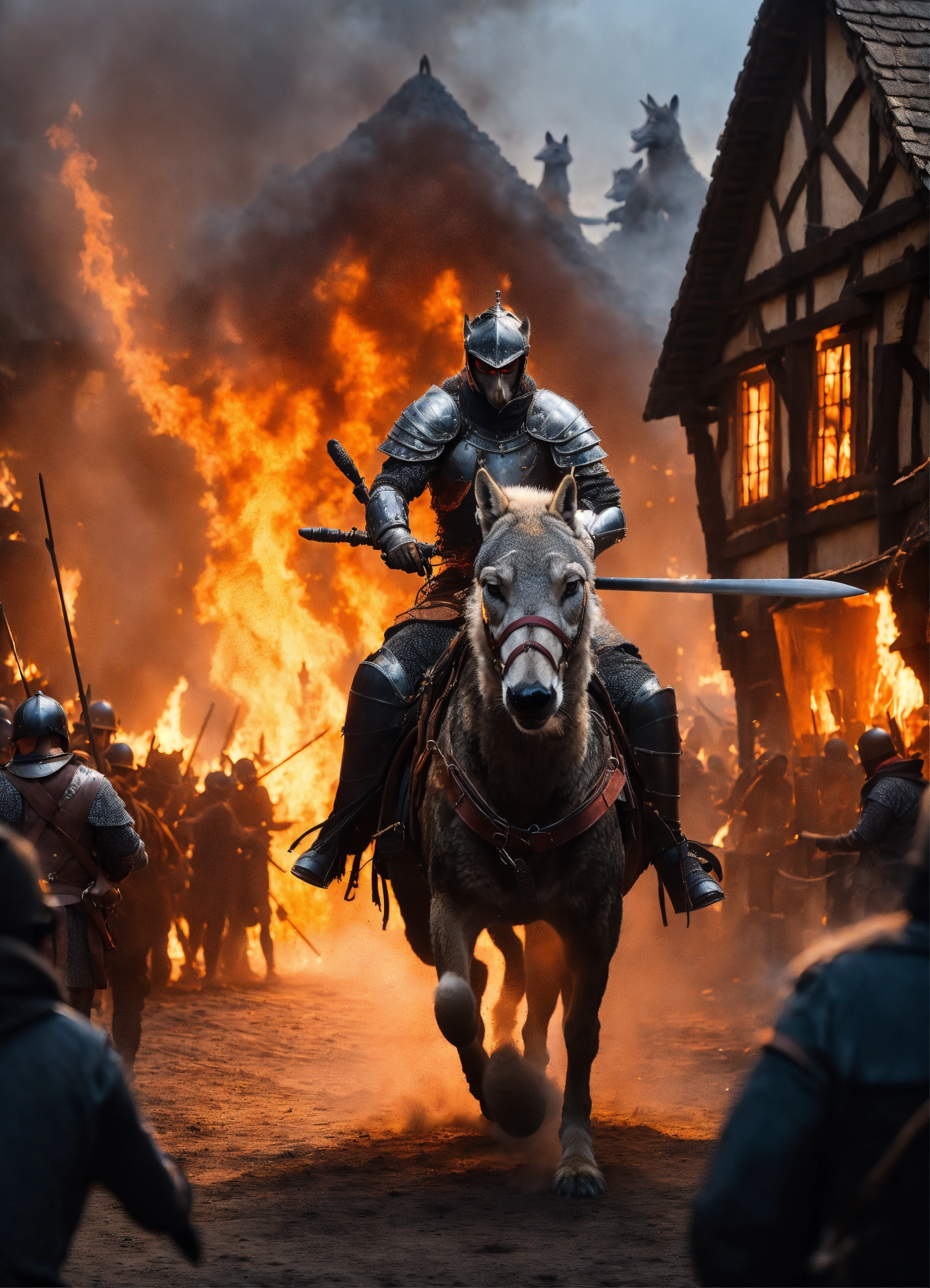 Un elfe en armure chevauchant un loup noir avec une queue enflammée dans un village médiéval
