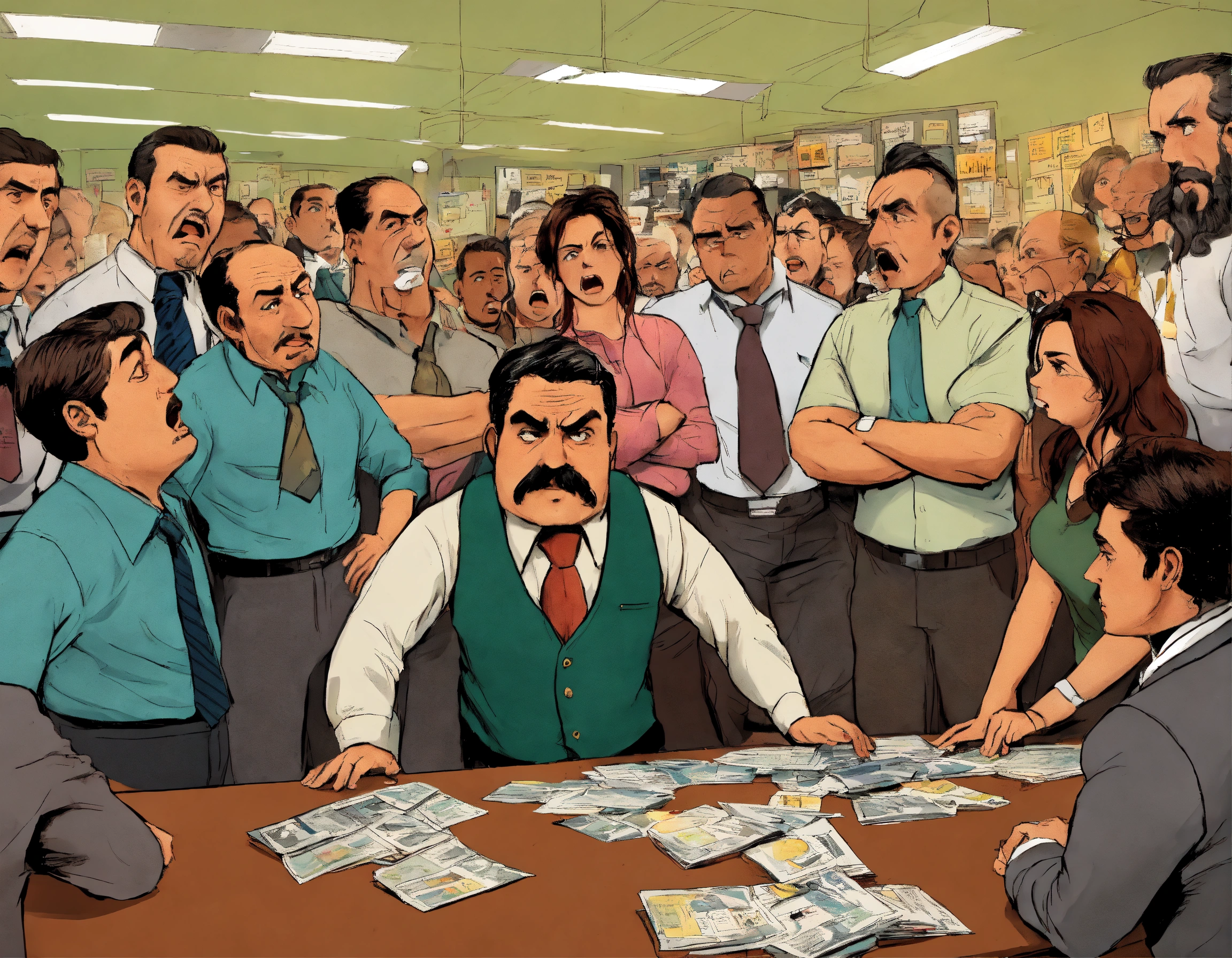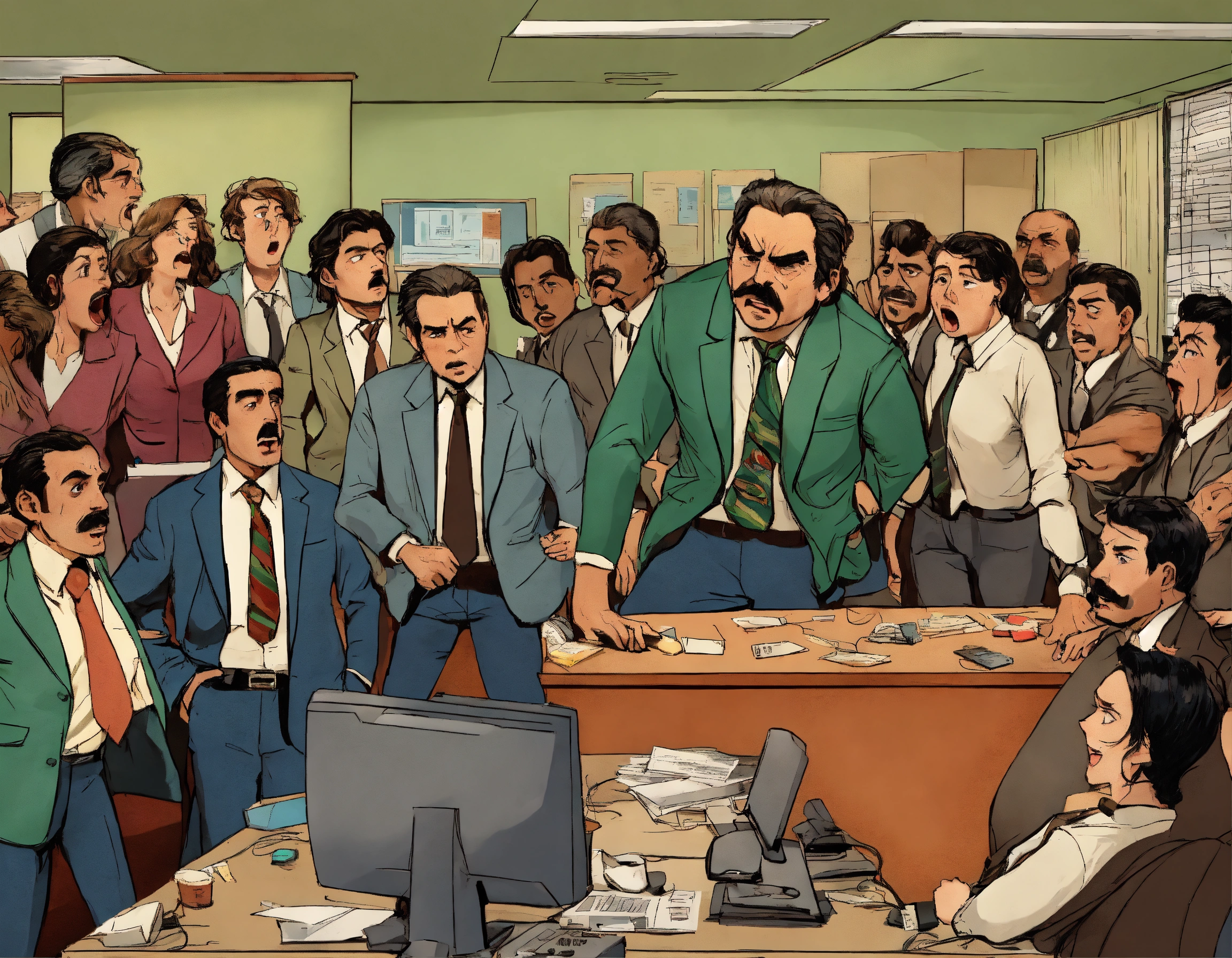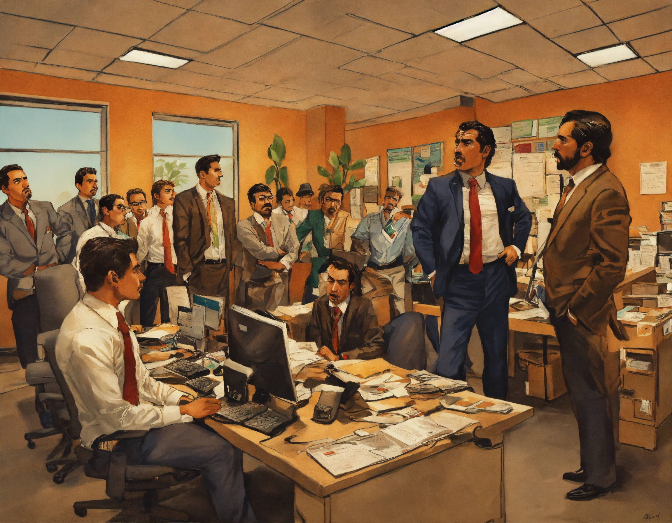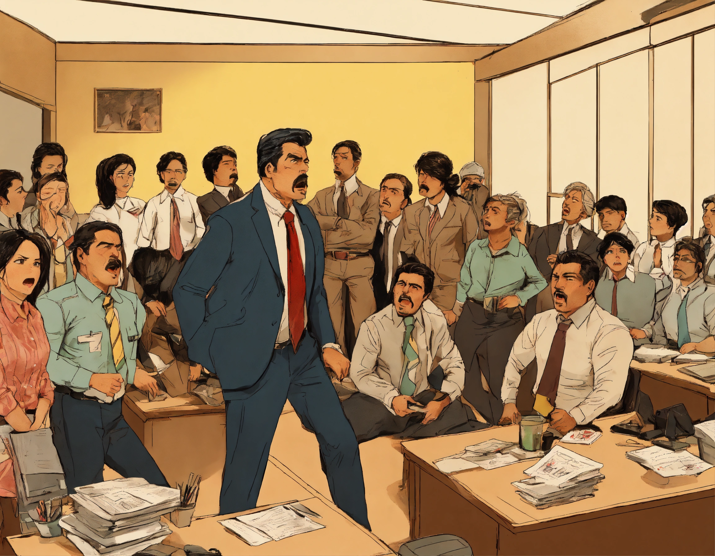 "depict a scene in an office where a mexican boss stands at the center, trying to direct 25 employees, both male and female. each employee is looking in a different direction, leading to a chaotic yet comical tableau. the boss's expression is a mix of exasperation and determination."