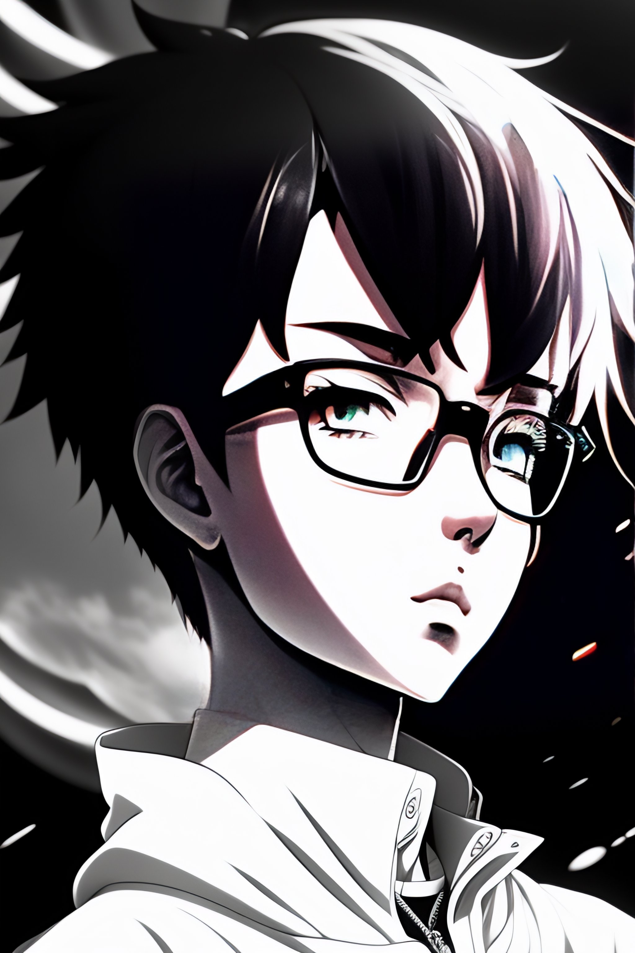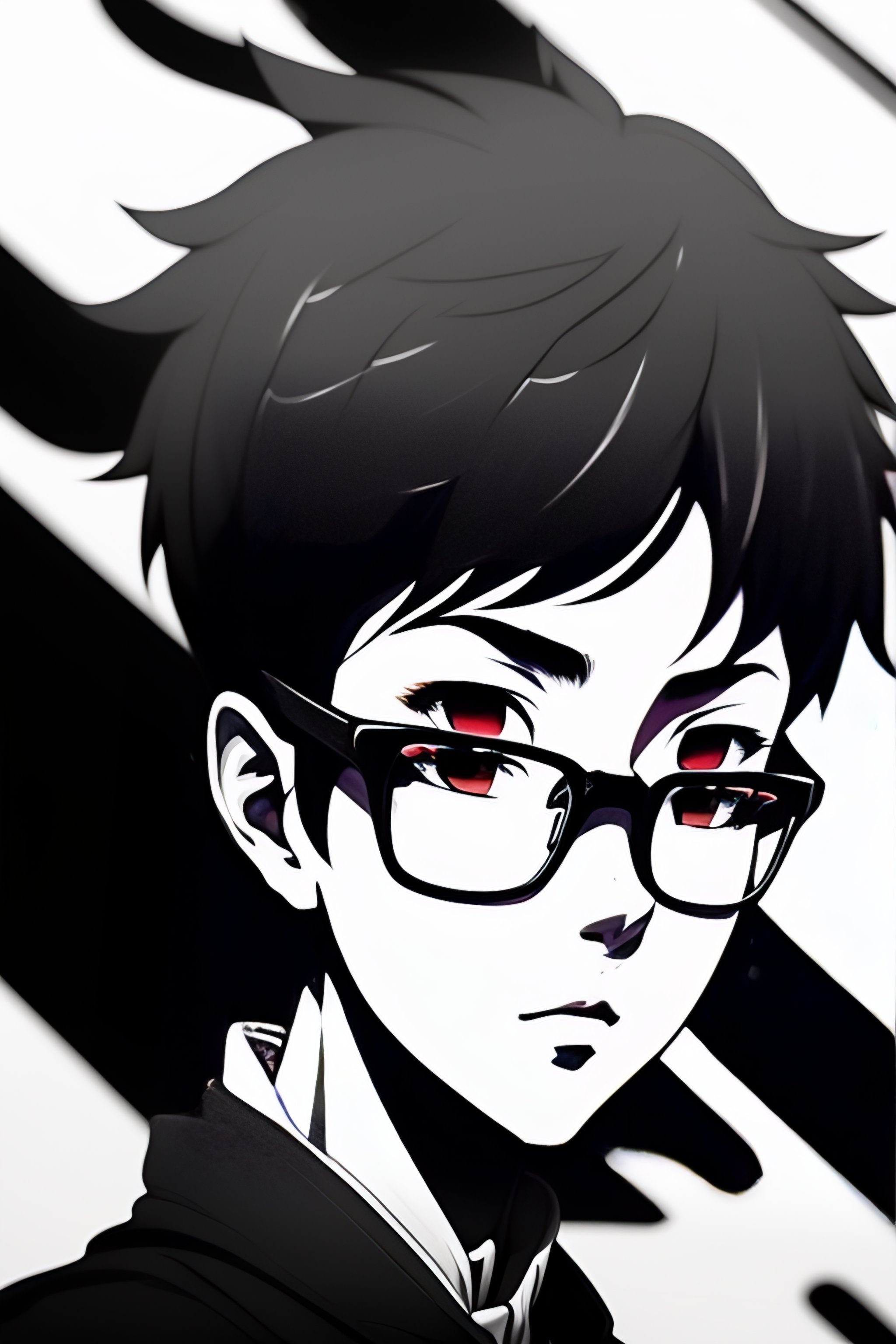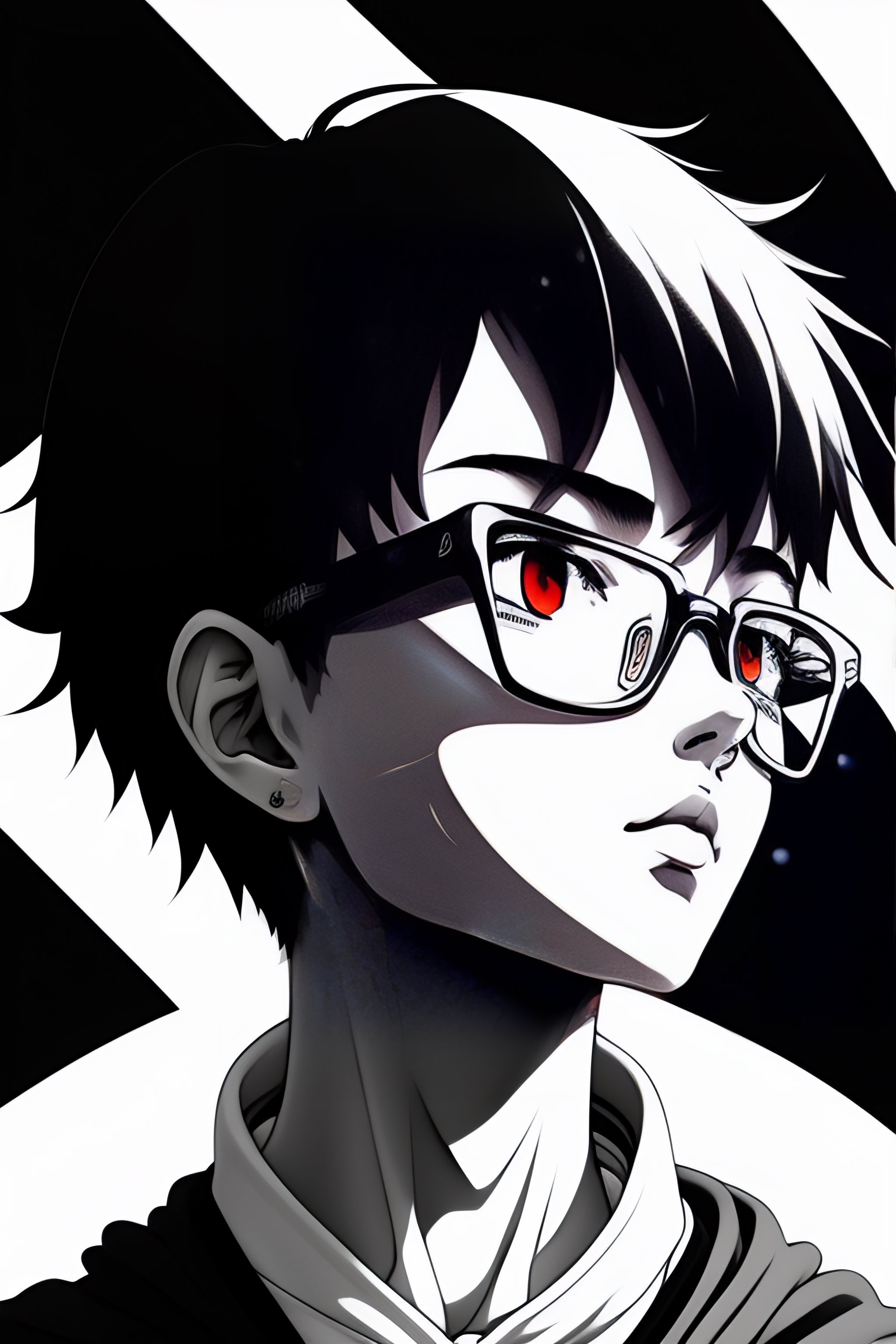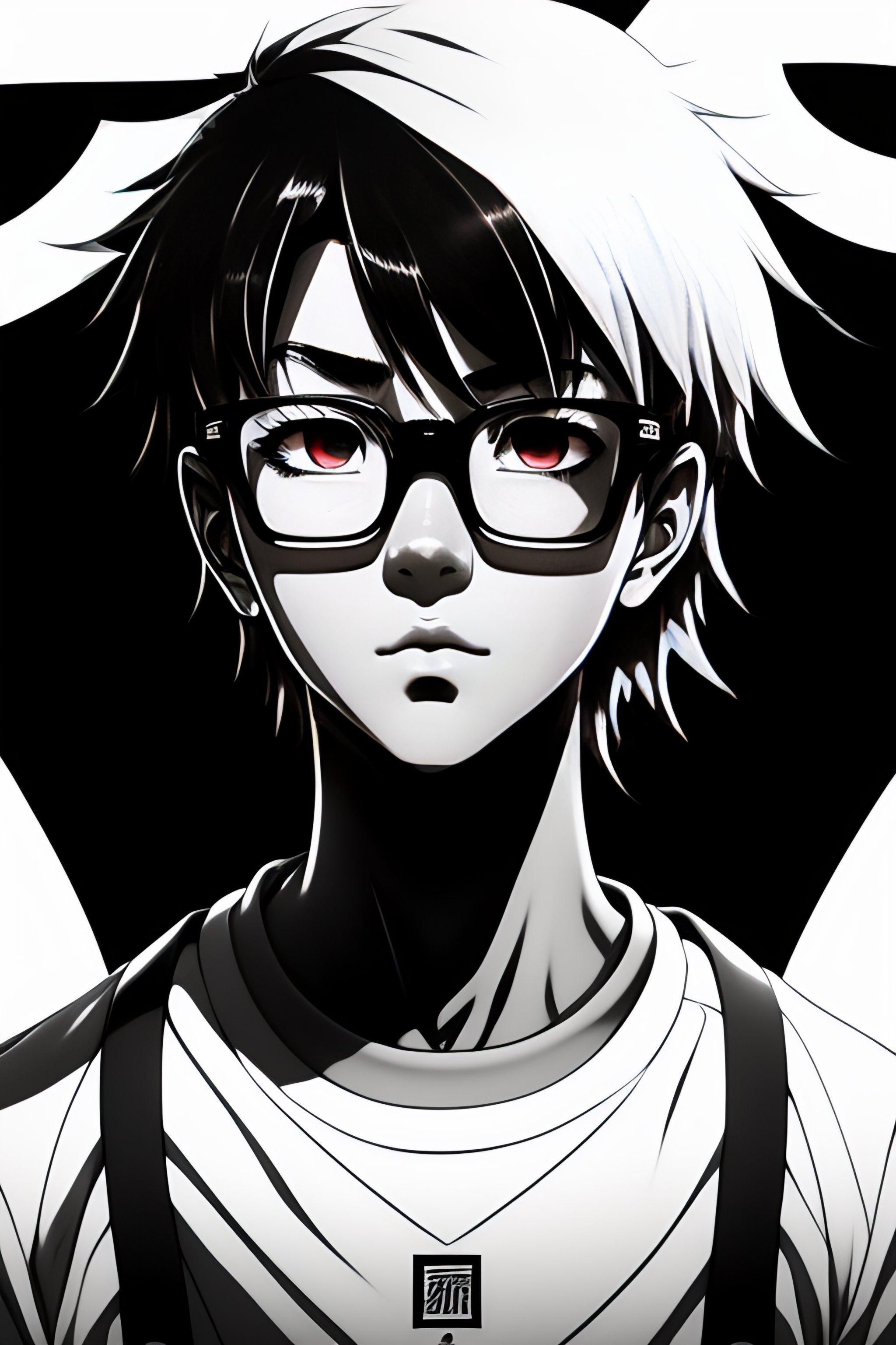Manga style, black and white, clean lines, neon genesis evangelion style, black boy, glasses reflecting light