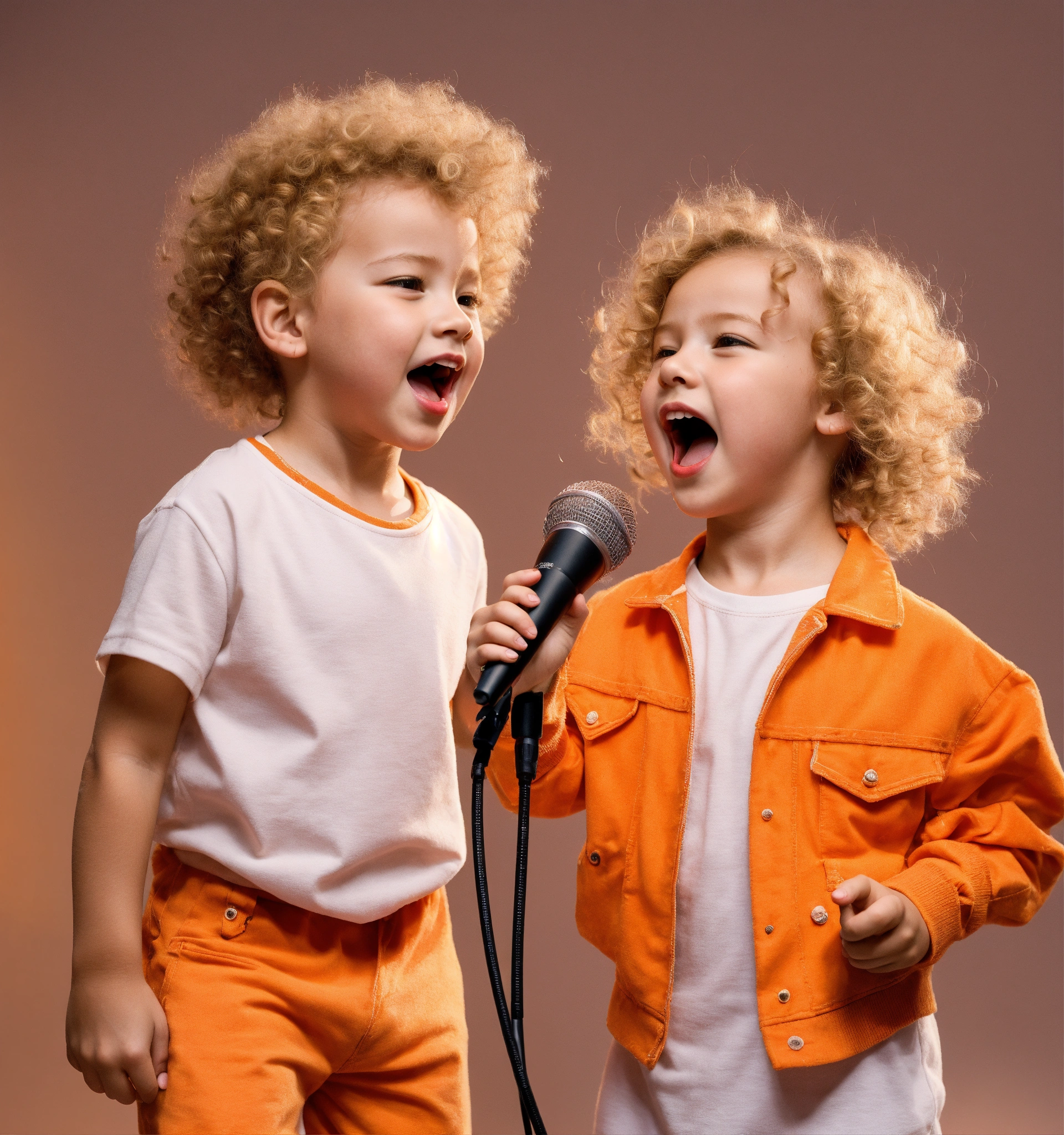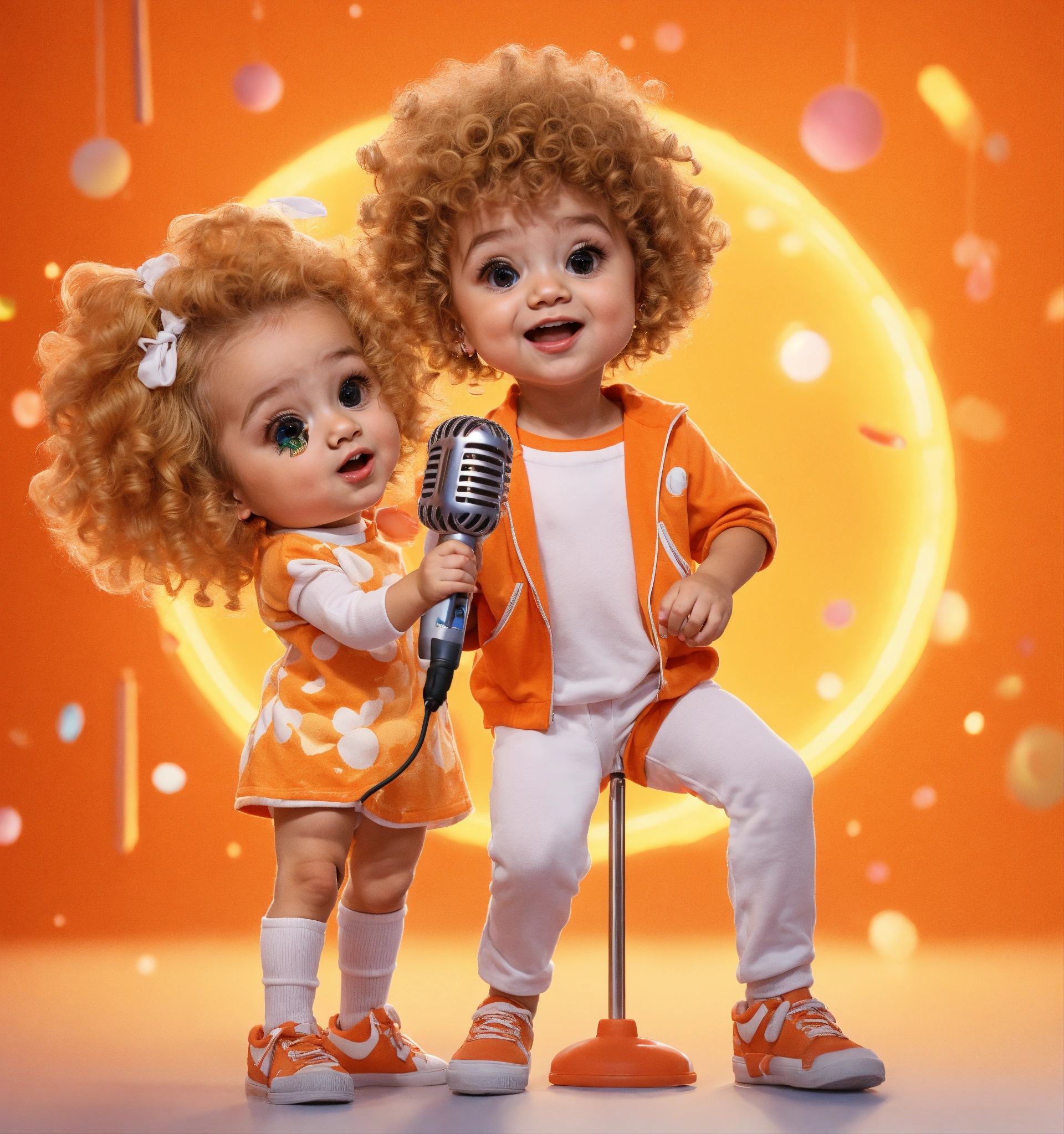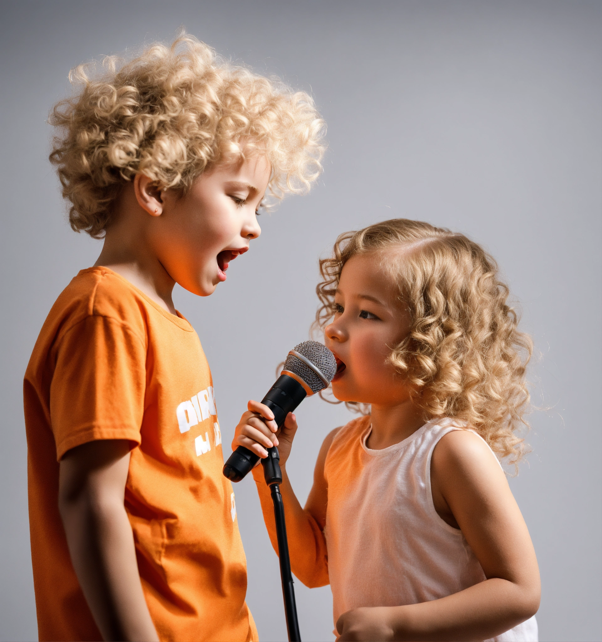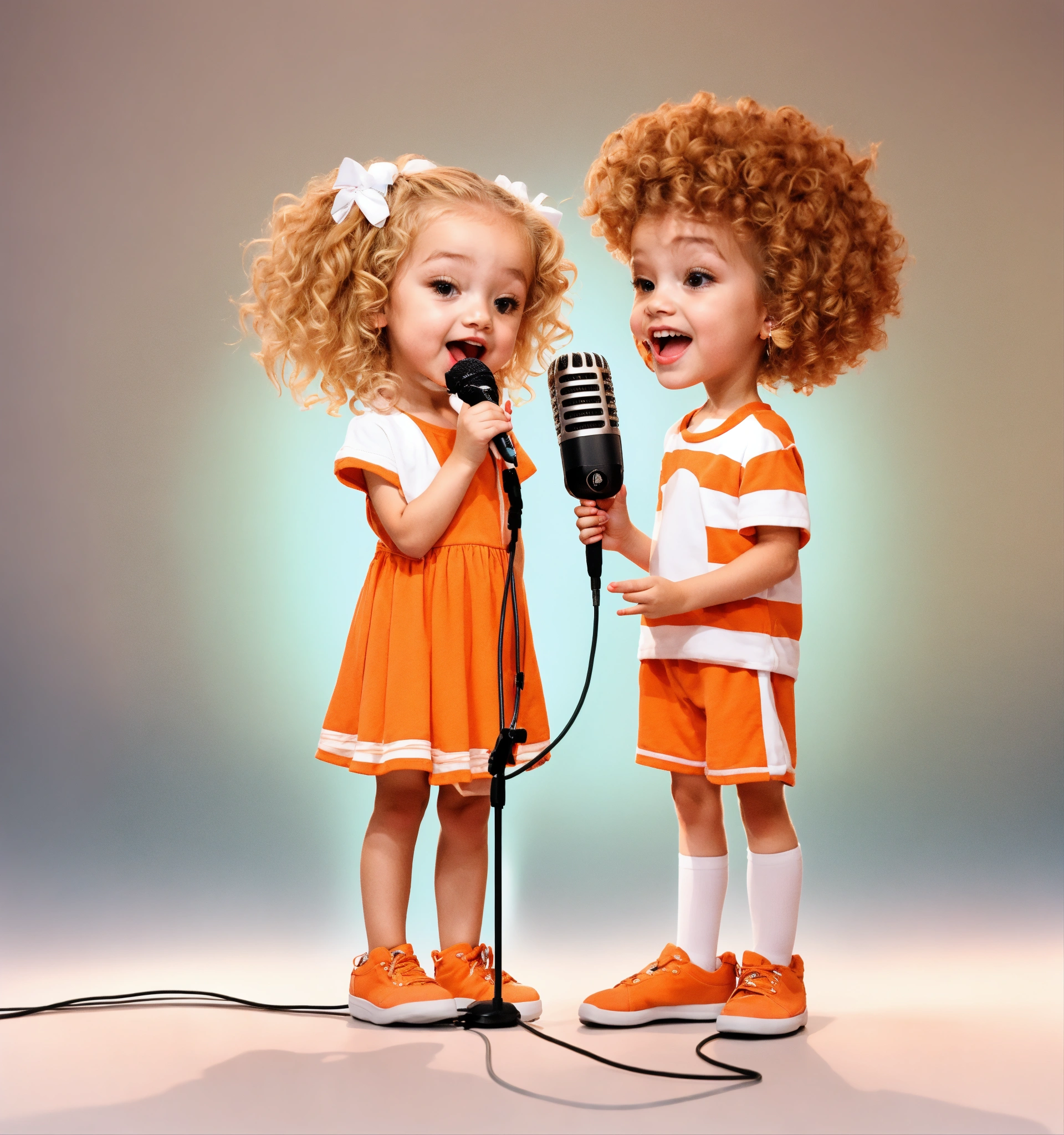 A small blond girl with curly hair and a boy singing in the microphone in the orange and white clothes on the white background