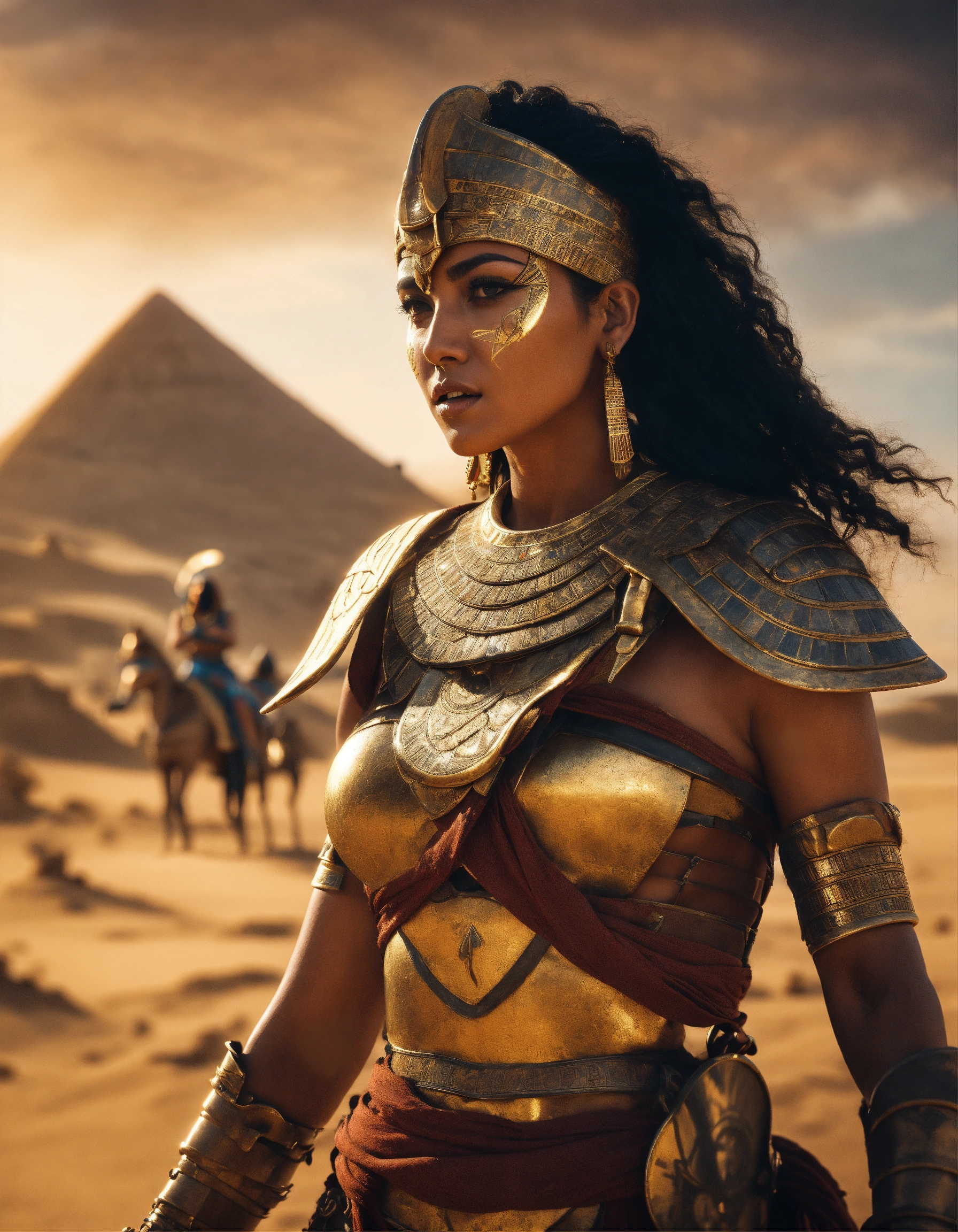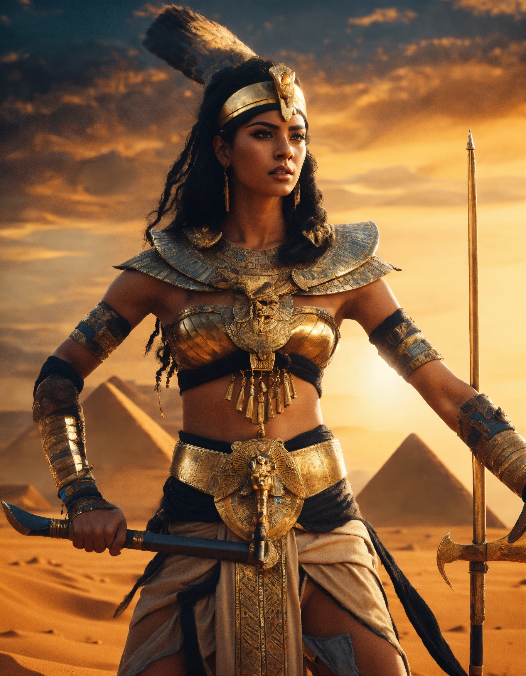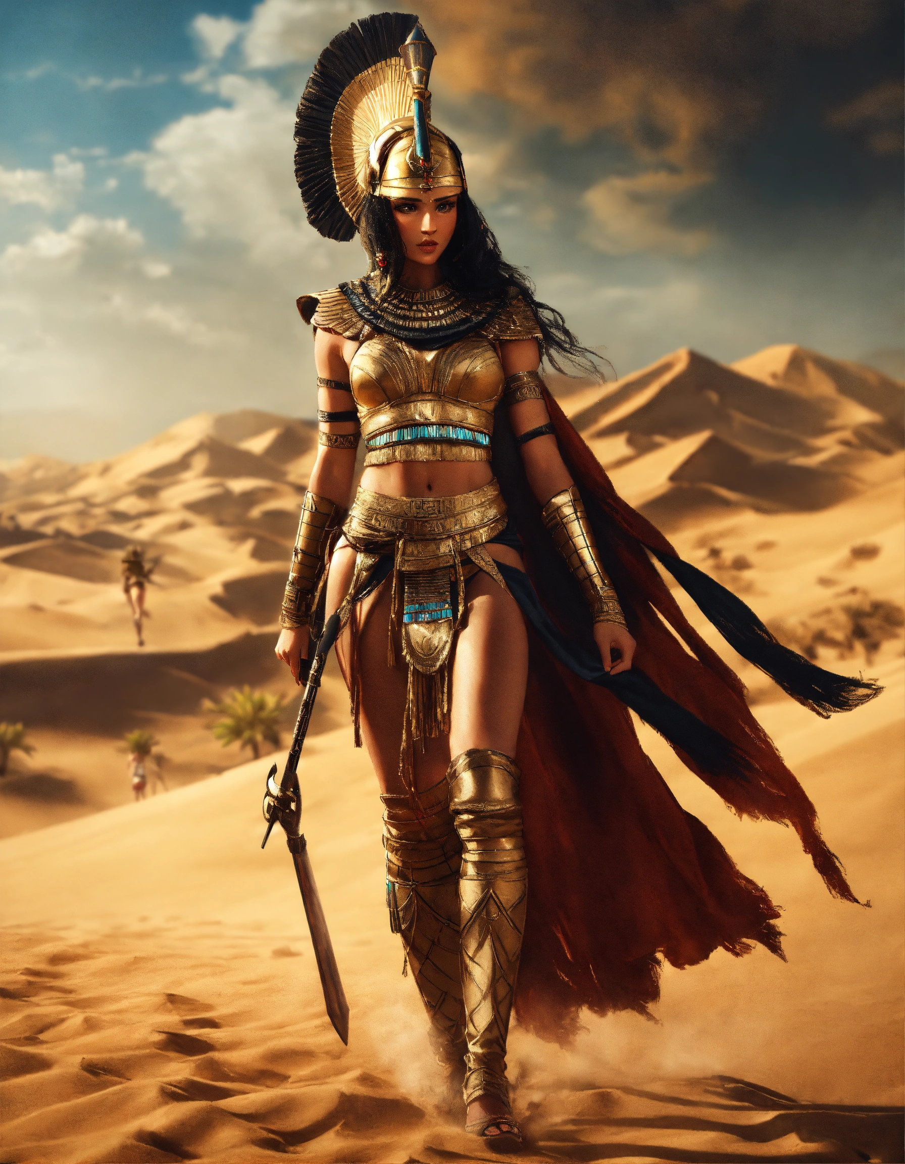 An epic fantasy scene featuring an ancient egyptian female warrior with attractive outfit, outrageous combat a couple egyptian warriors in the desert. cinematic view. sharp detail.