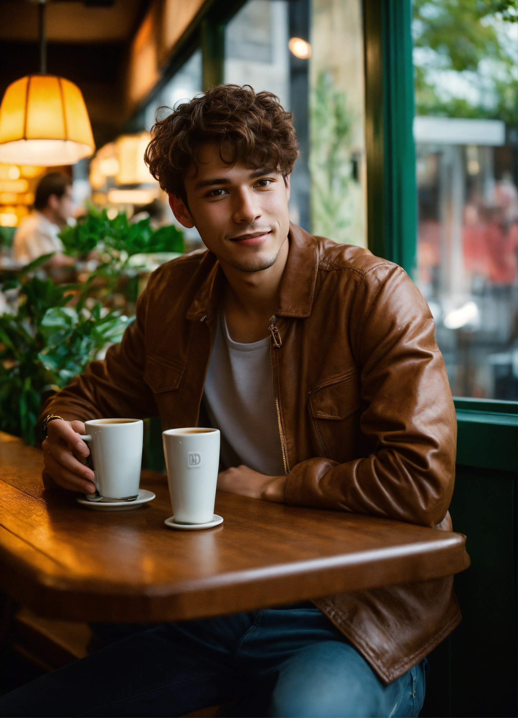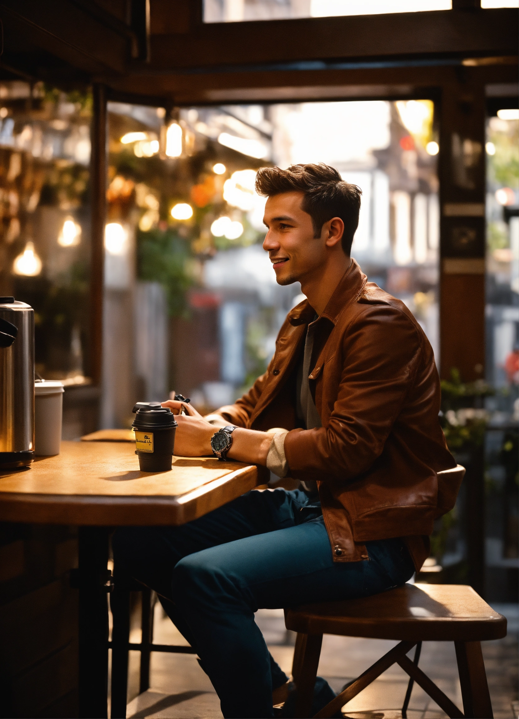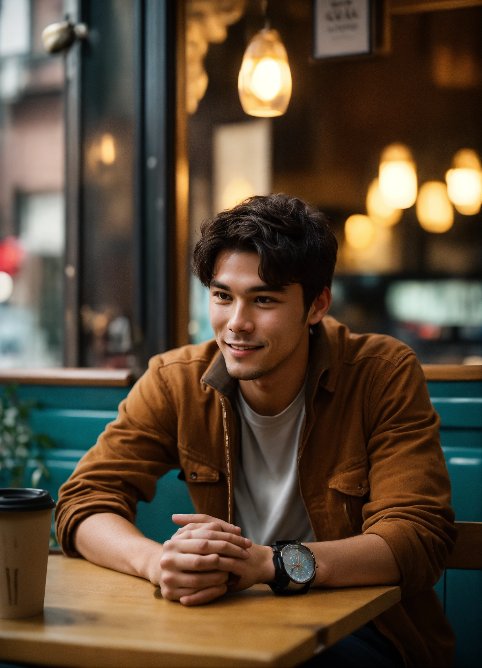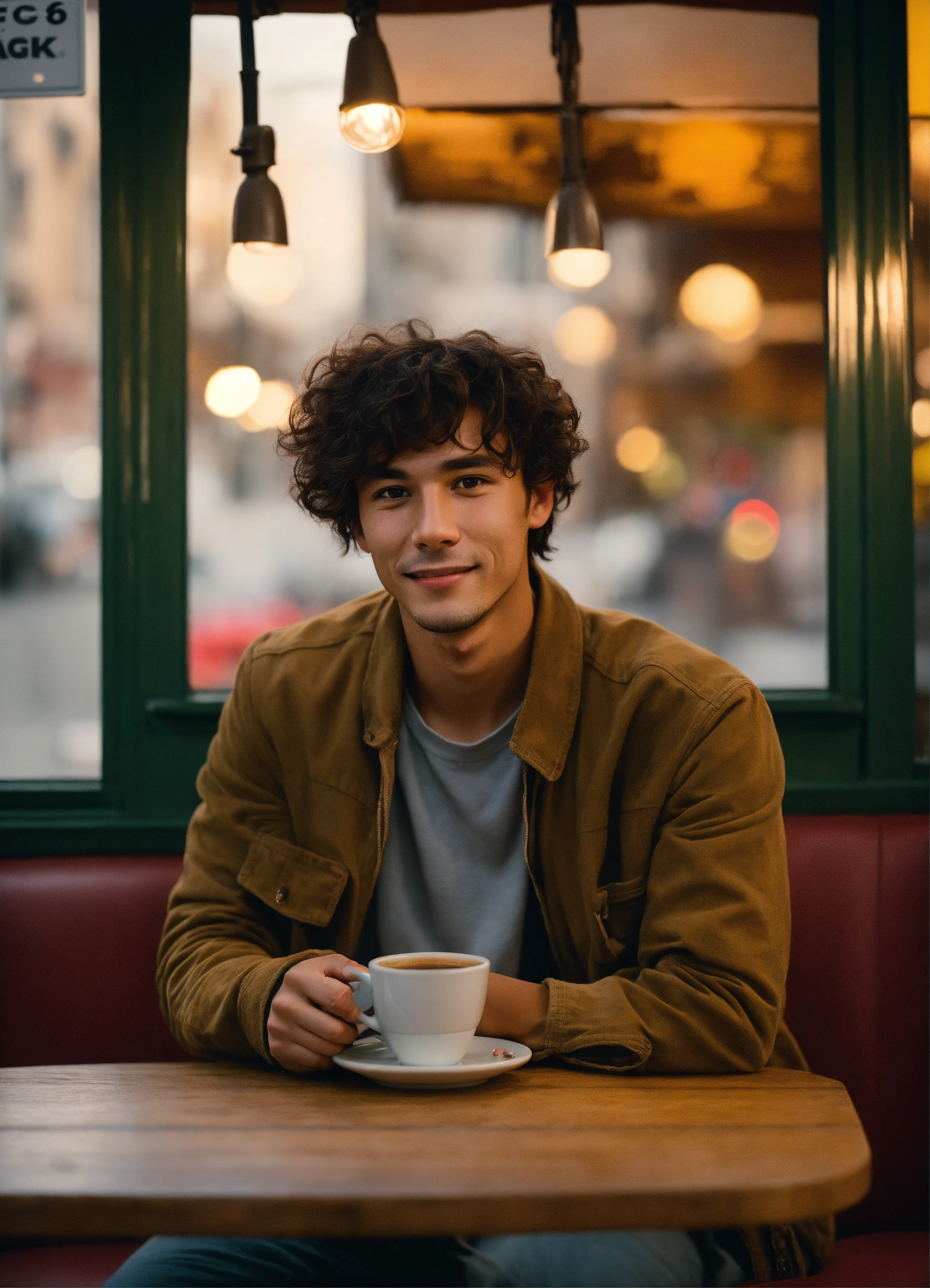 James - a young man dressed casually. he is nervous but has a kind smile. a short animation of james sitting alone at a table in a cozy coffee shop. he nervously checks his watch and looks around. james and lucy are outside the coffee shop, saying goodbye. they share a brief, but meaningful kiss before parting ways. in the style of photo real, hyper-realistic, high dynamic range, rich colors, lifelike textures, 8k uhd, high color depth, nikon d 850, kodak portra 400, fujifilm xt
