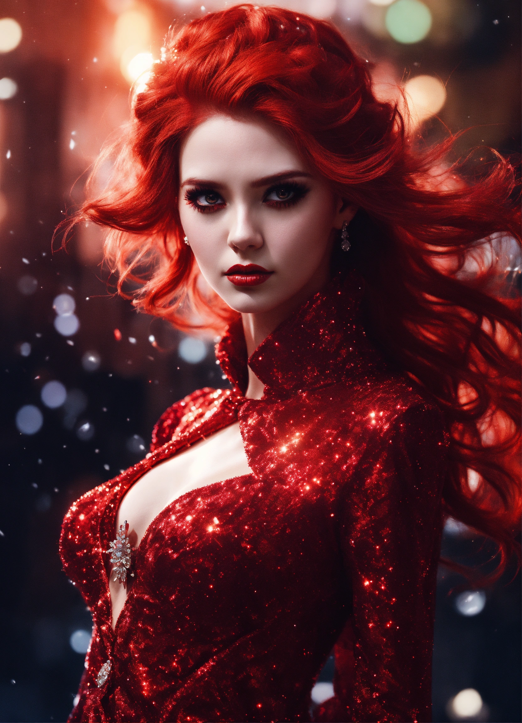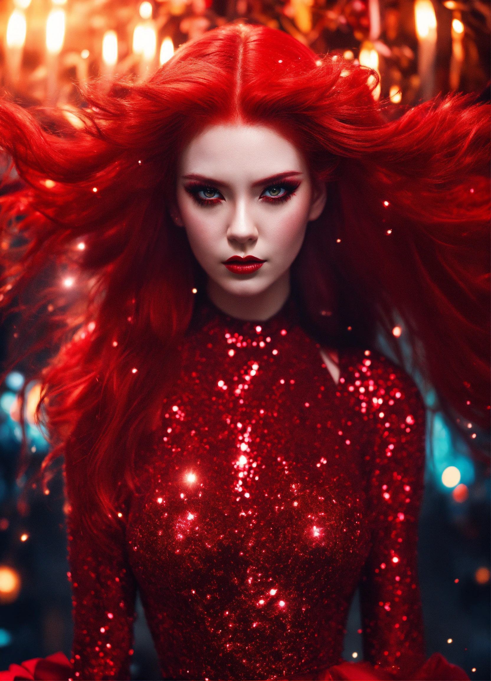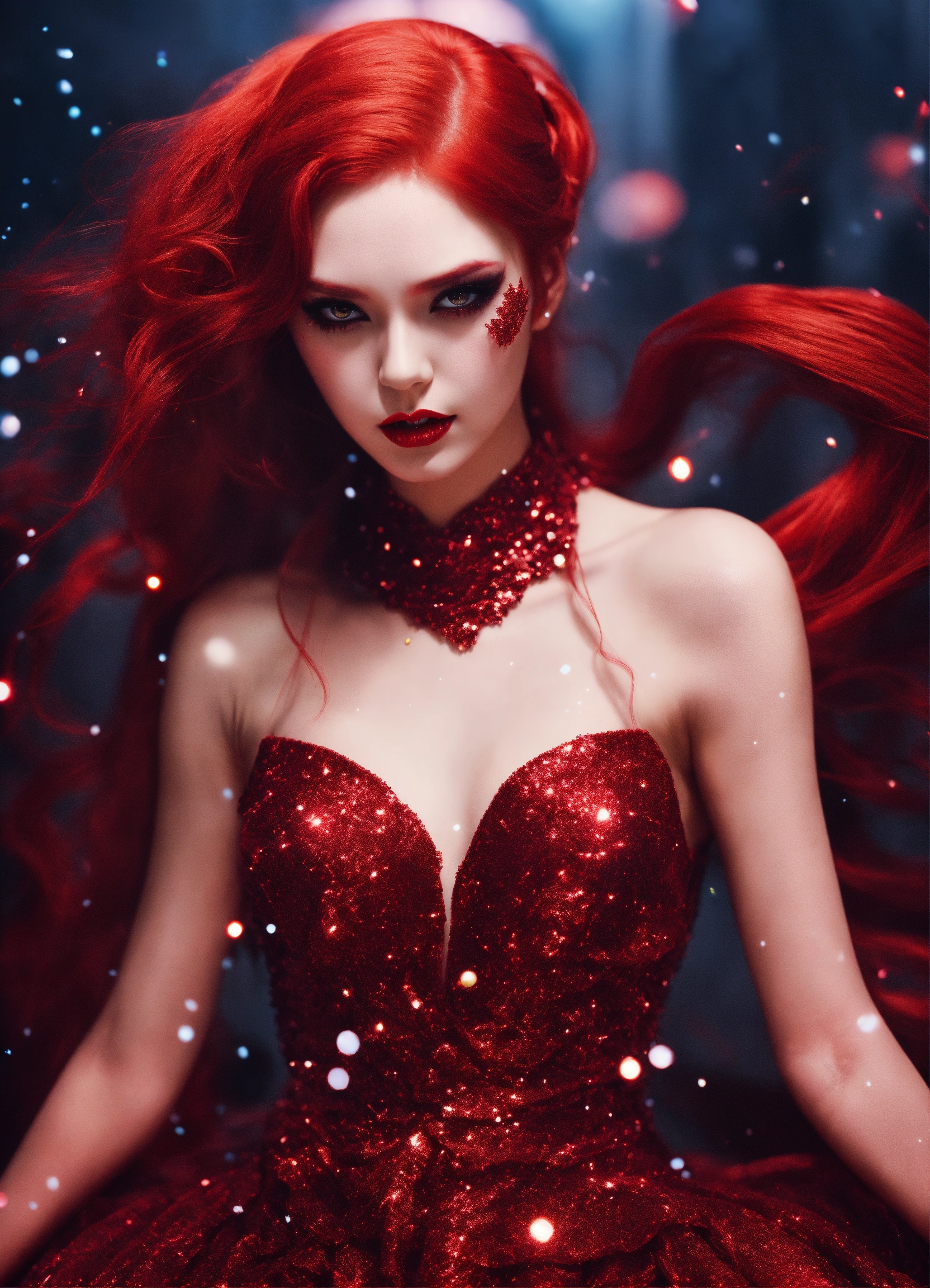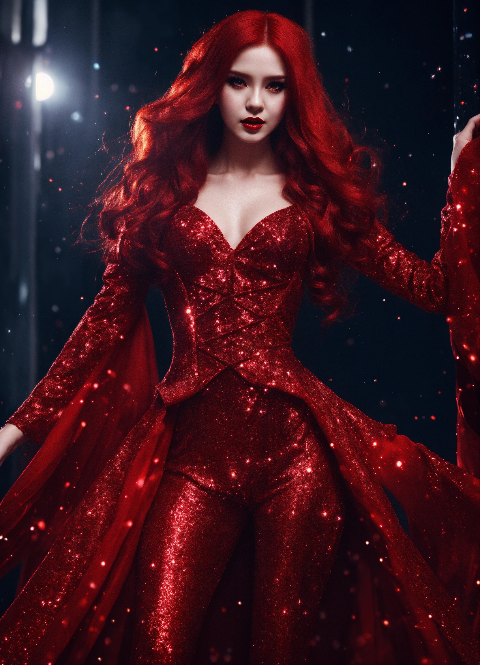 Evil female sinister movie foe, fashion, with sparkling red gown, red hair with glitter, white skin, red make-up, long hands, comic, manga, anime style