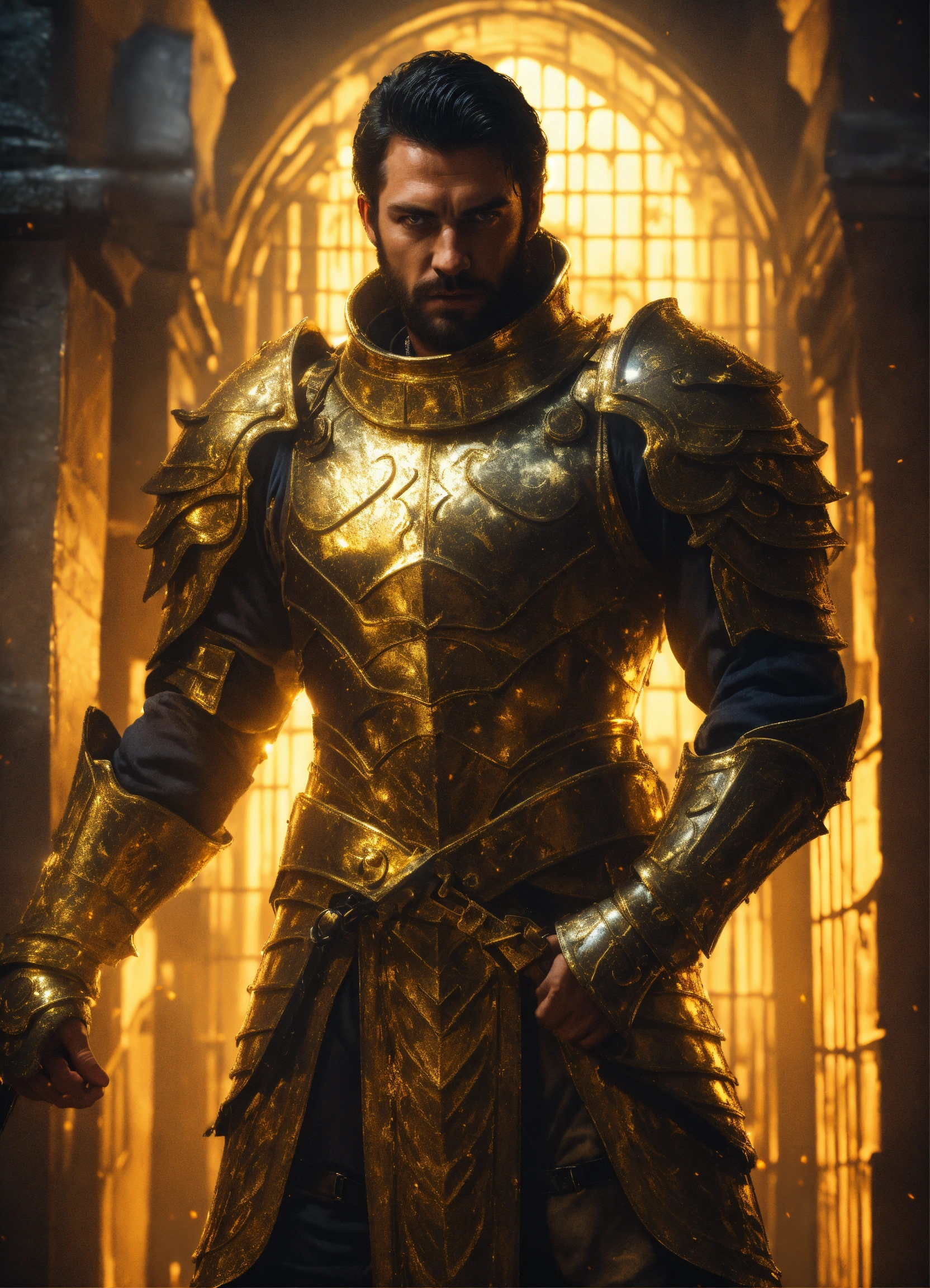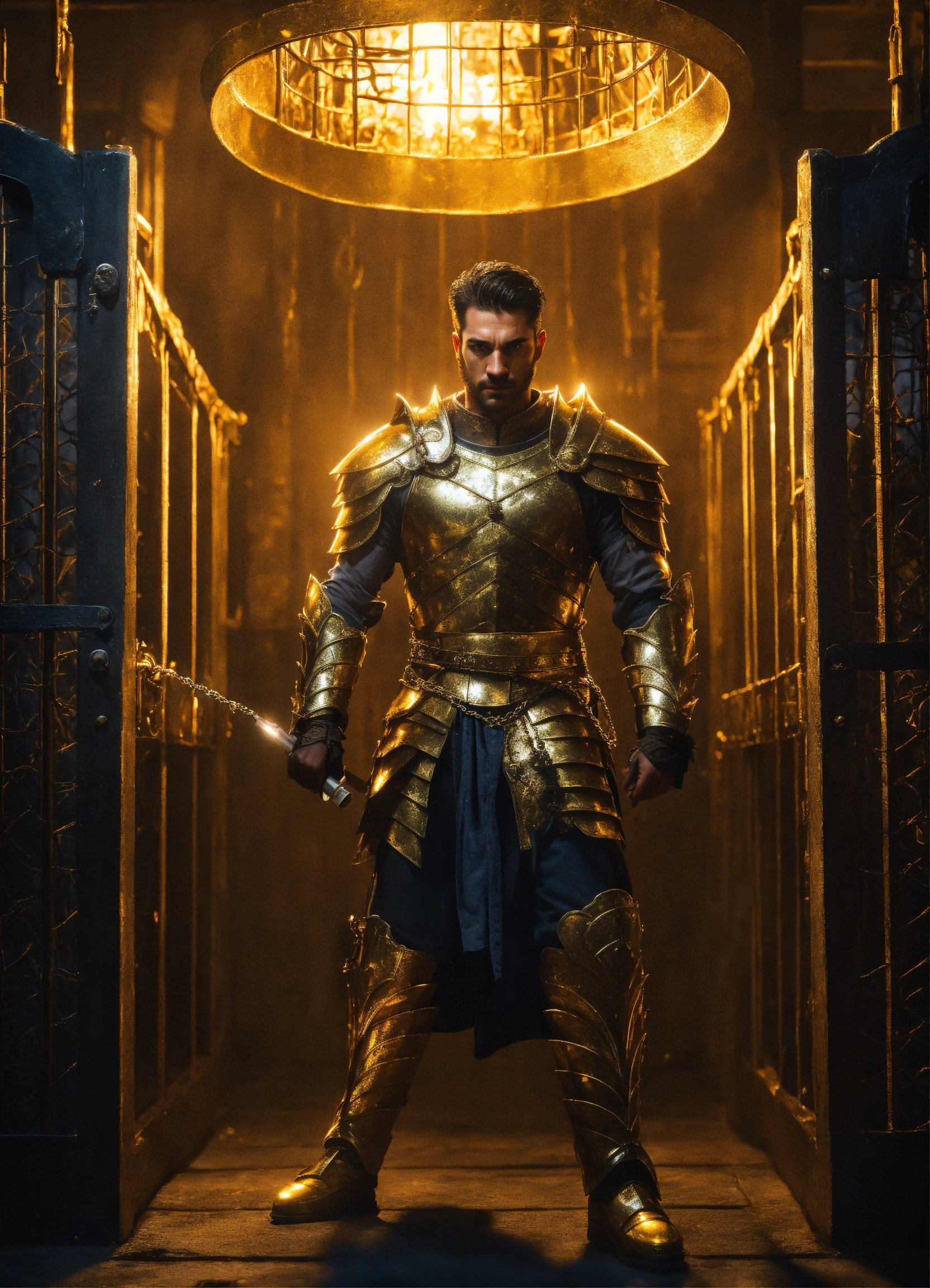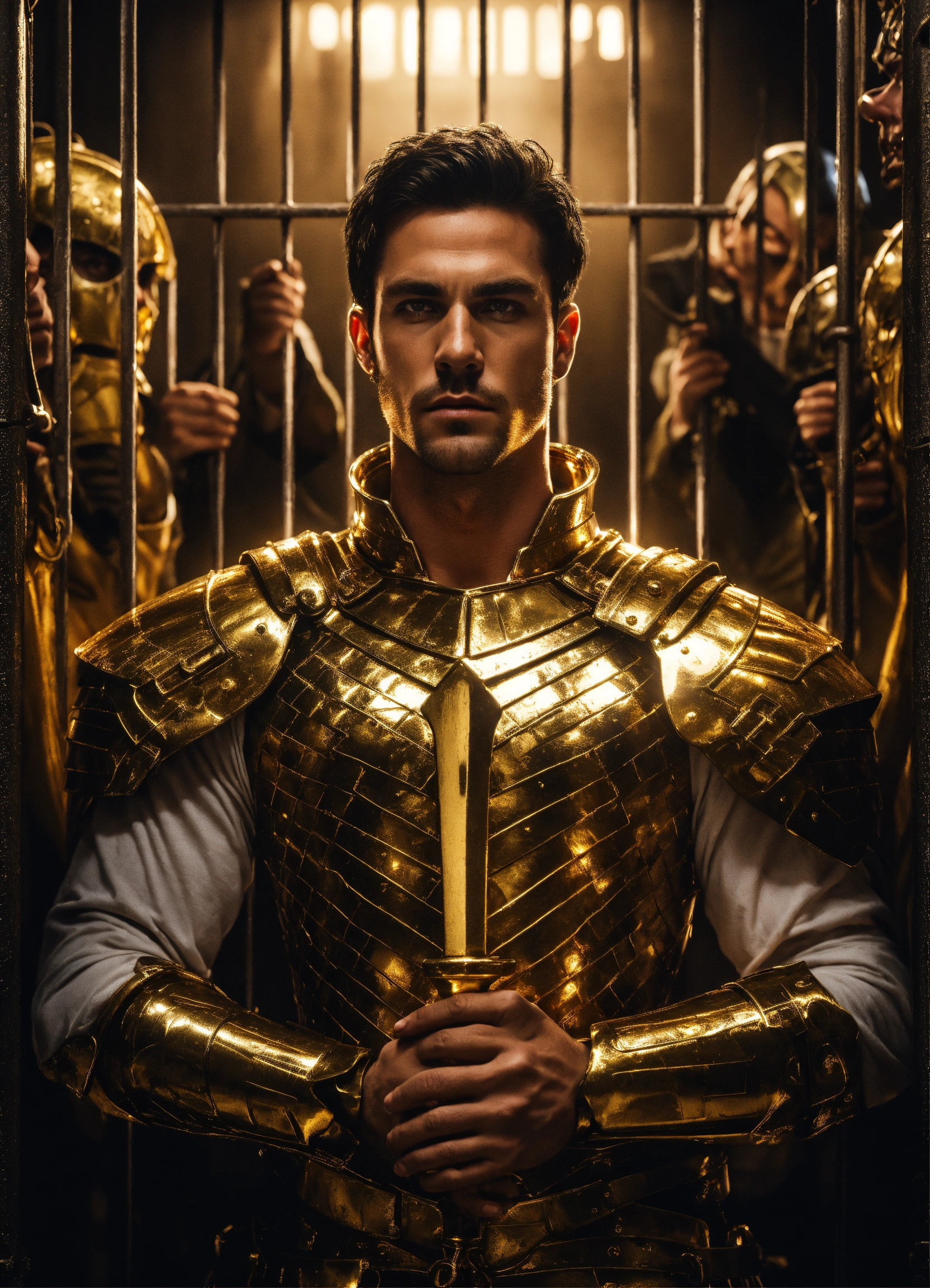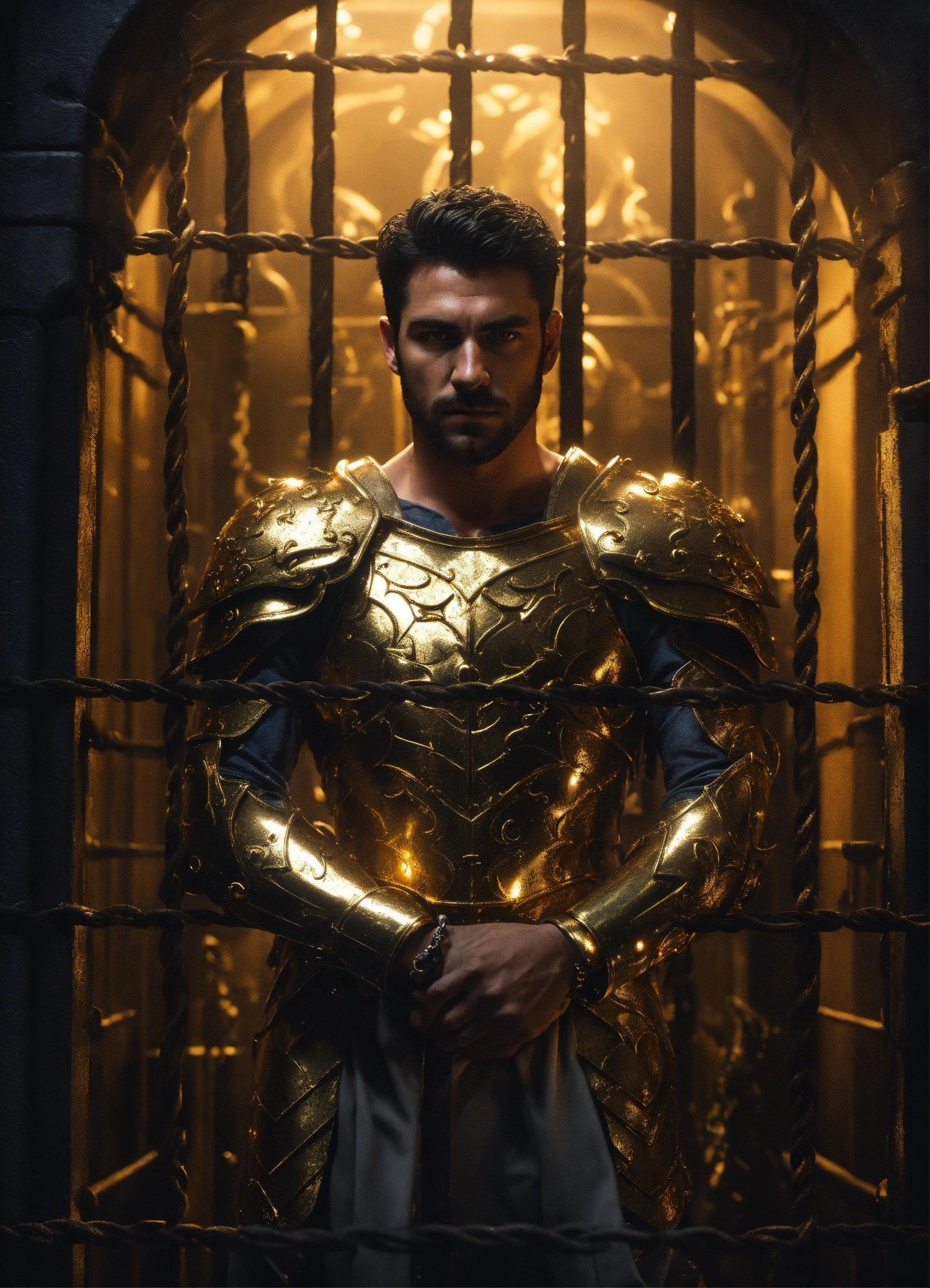 Handcuffed, a strong handsome white male god, a handsome prisoner with dark hair wearing gold armor, held captive in a spooky dark cell with monstrous guards in the backgrounds, resolution 8k, insanely detailed