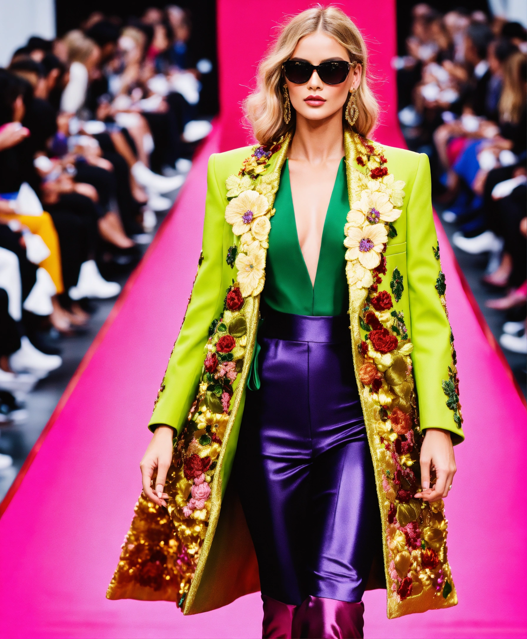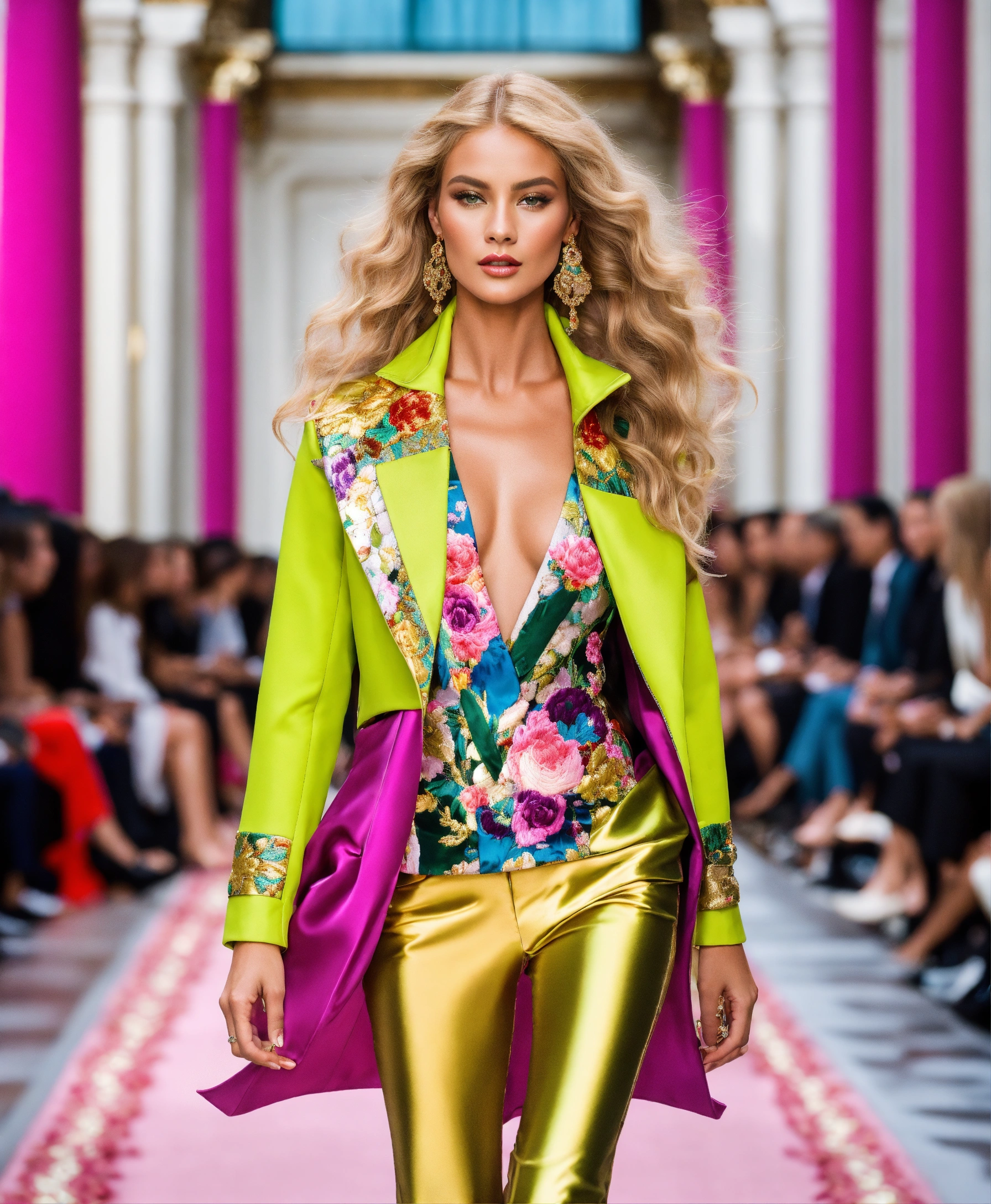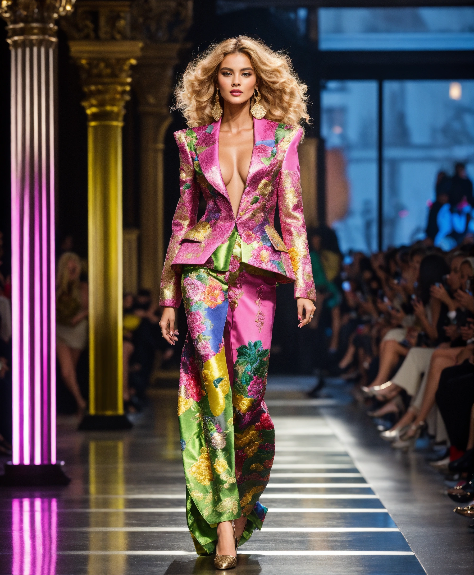 Ultra realistic full body photo of a stylish beautiful elegant blonde supermodel voluminous wavy hair walking the runway modeling summer cruise designer wear brave, paris versailles details cutouts and gold geometric pattern floral structured tailored jacket pink gold green lilac peridot silver magenta lime fuchsia yellow blue black gray copper mauve bronze haute couture embroidered contrasting colors vivid intricate bold vibrant glamorous ultimate elegance beautiful luxurious awesome wealthy opulent exquisite resplendent magnificent sublime 12k
