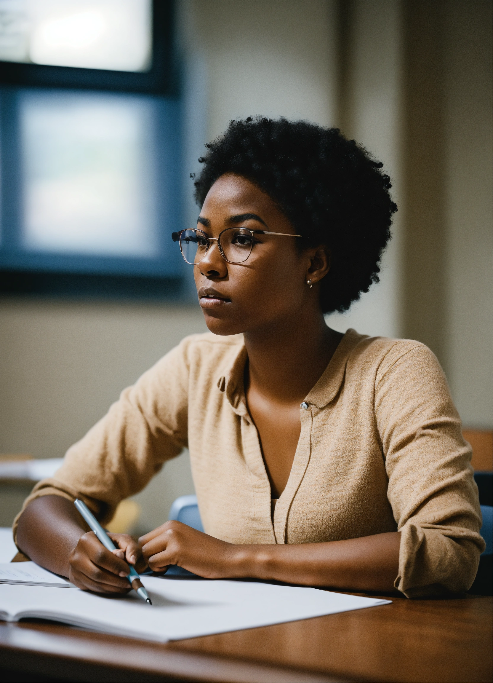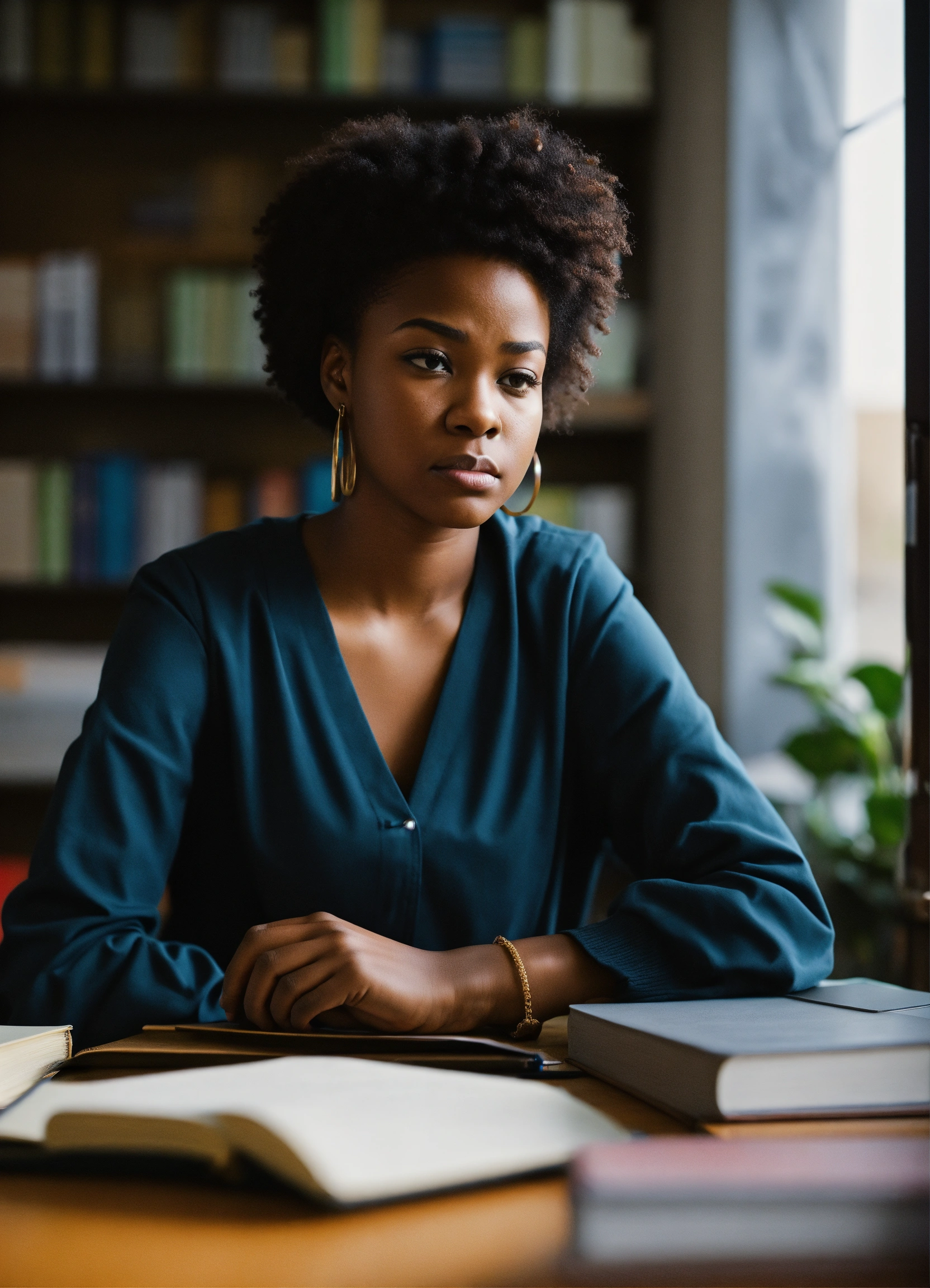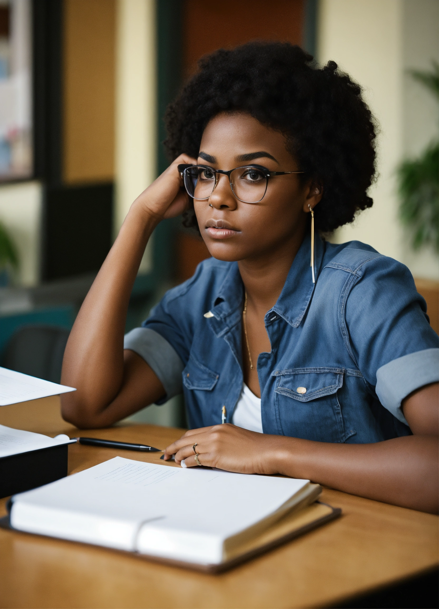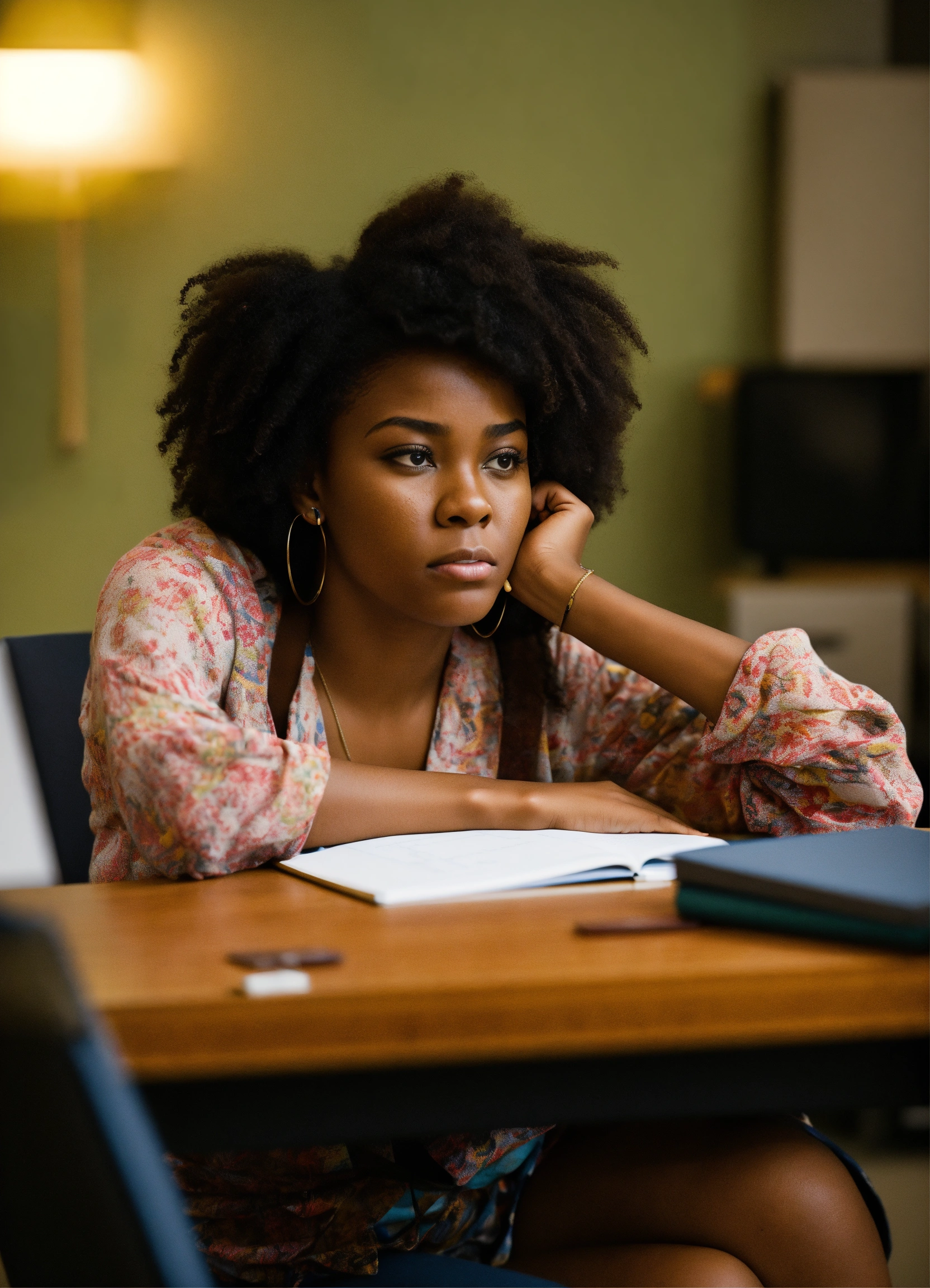 A black woman college student sitting at a desk with in deep thought very attractive, make her look upset from all the studying