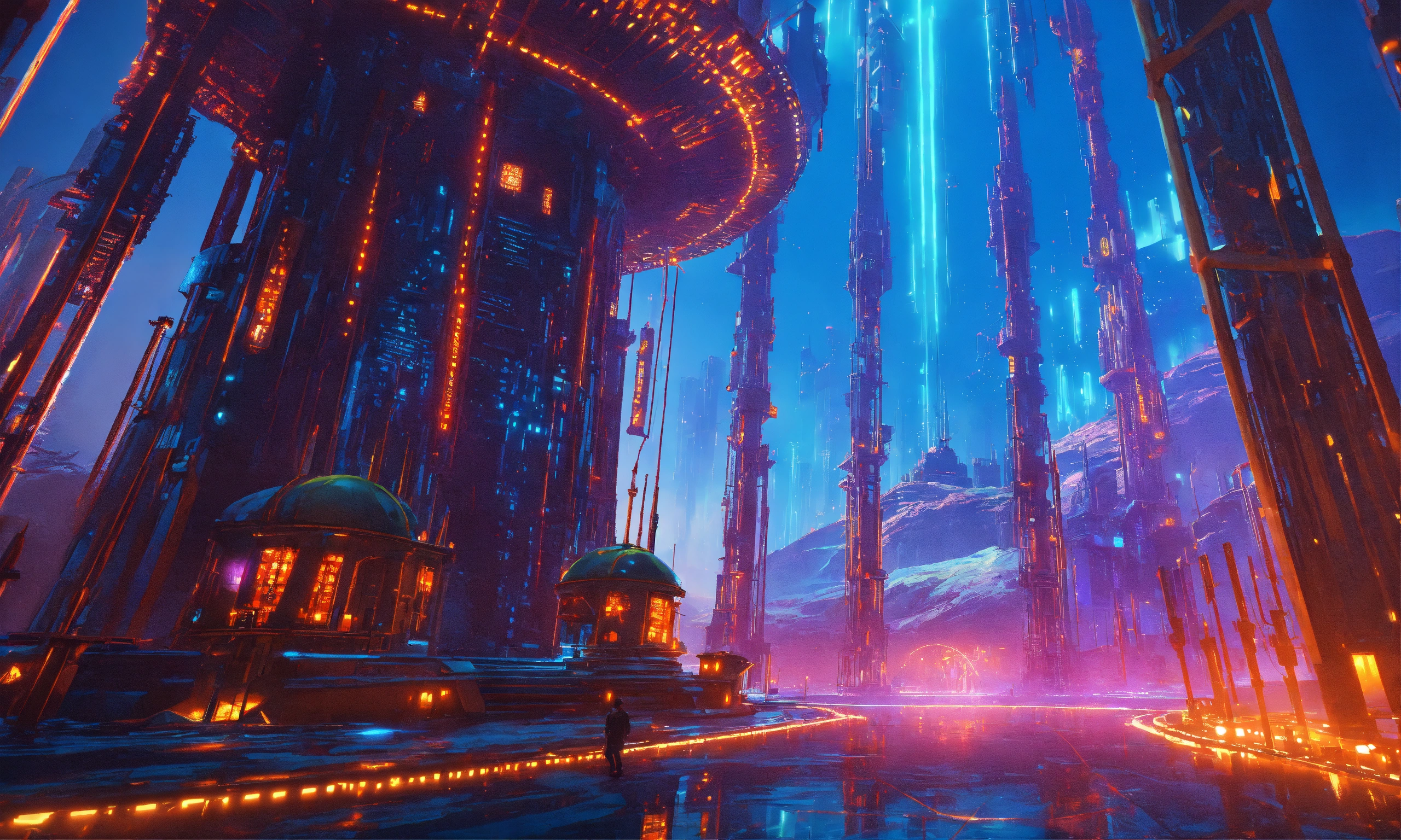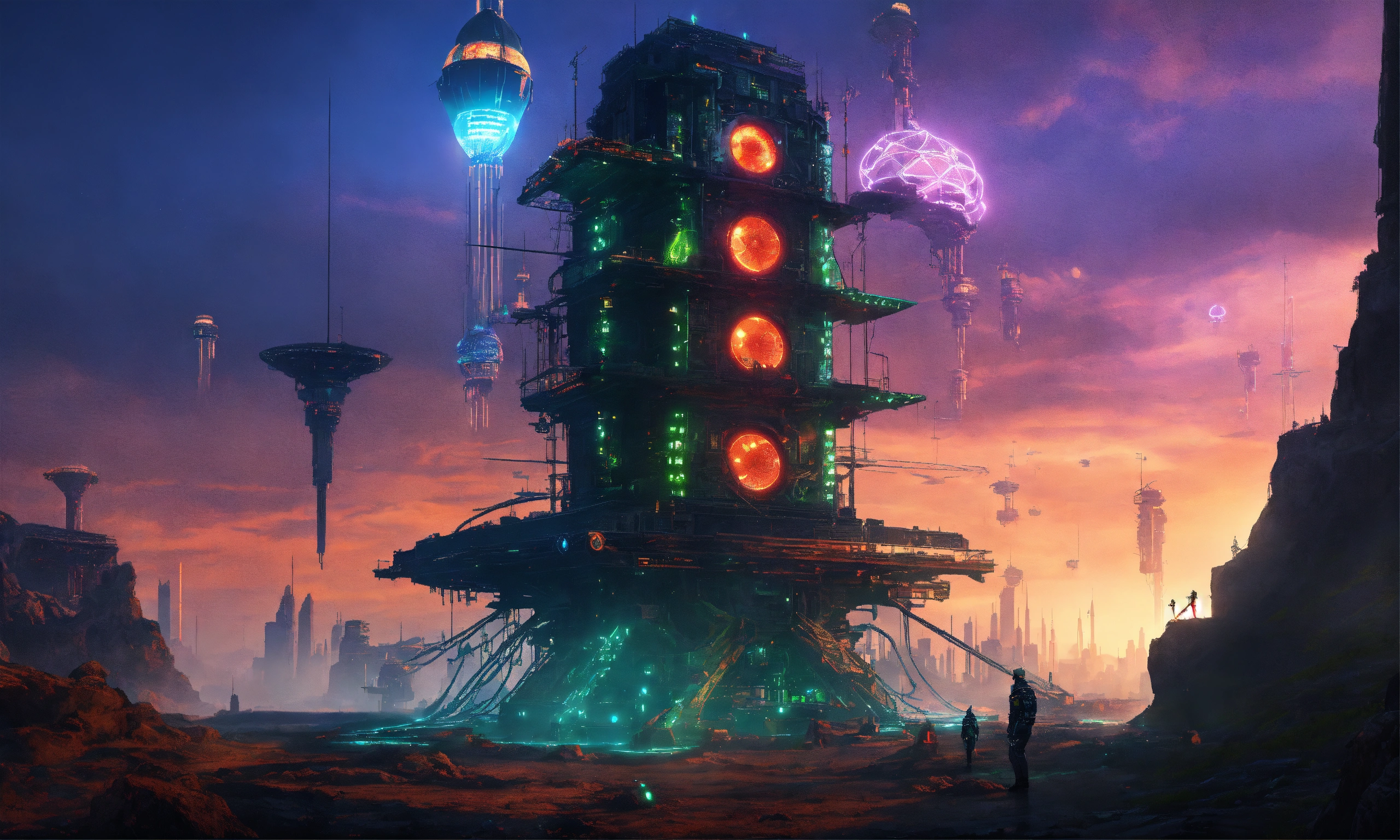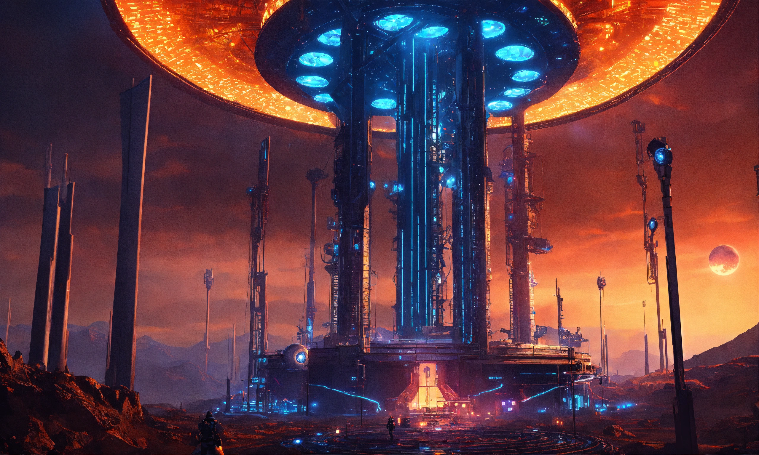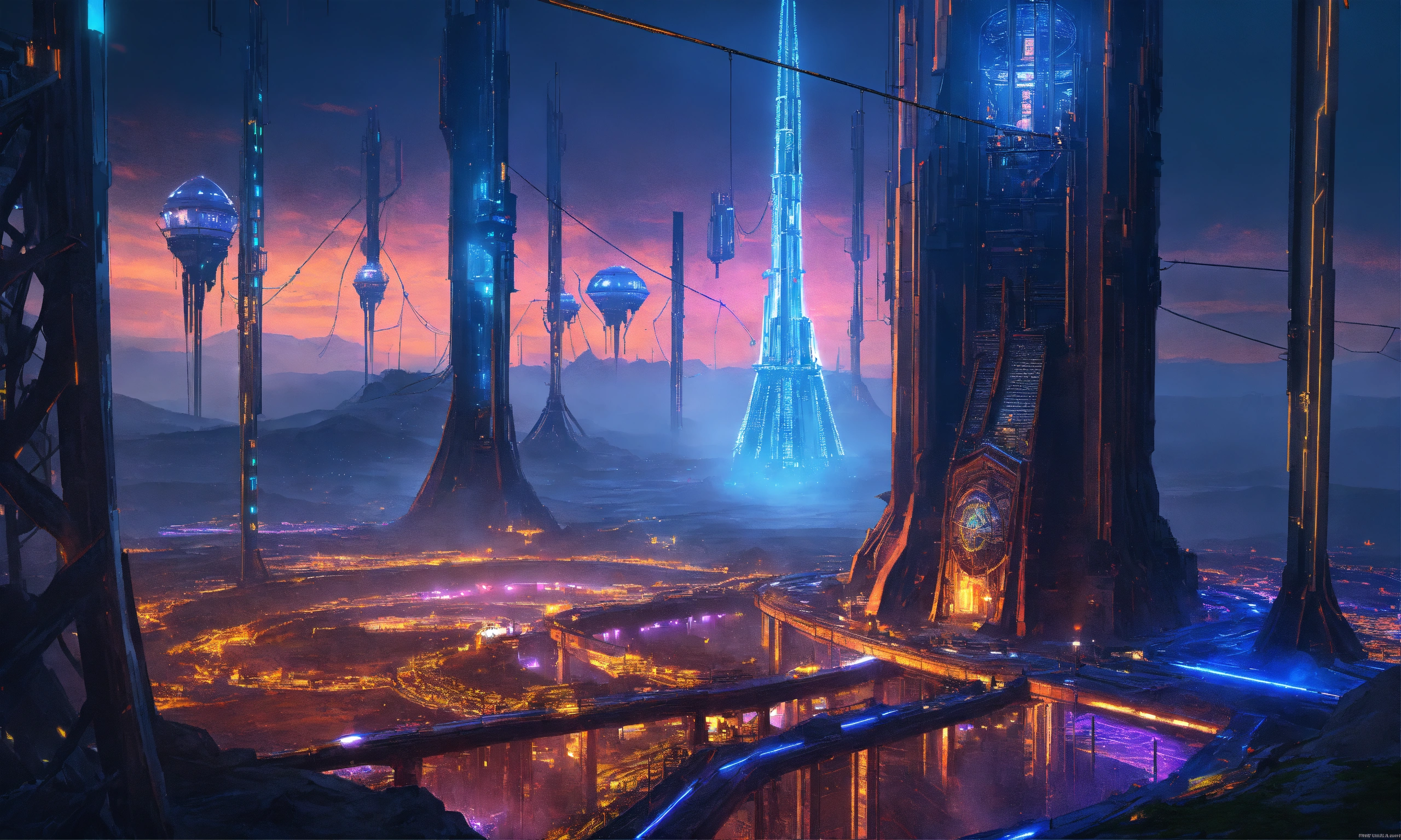 Flying octapus like tentacle machines robots from the movie the matrix fly toward their base at a tall futuristic tower of sauron on an energy vortex, temple with coils and circuitry going up the structure, powerful blue electricity is striking from sub towers to the top of the evil tower, energy surges, colorful lights, tron style, spider robot are on patrol, secure compound, crystal circuitry, giant speakers on elaborate stands around the tower, in the middle of a wasteland, unreal engine, 8k, vibrant neon illumination up the tower, quantum processors