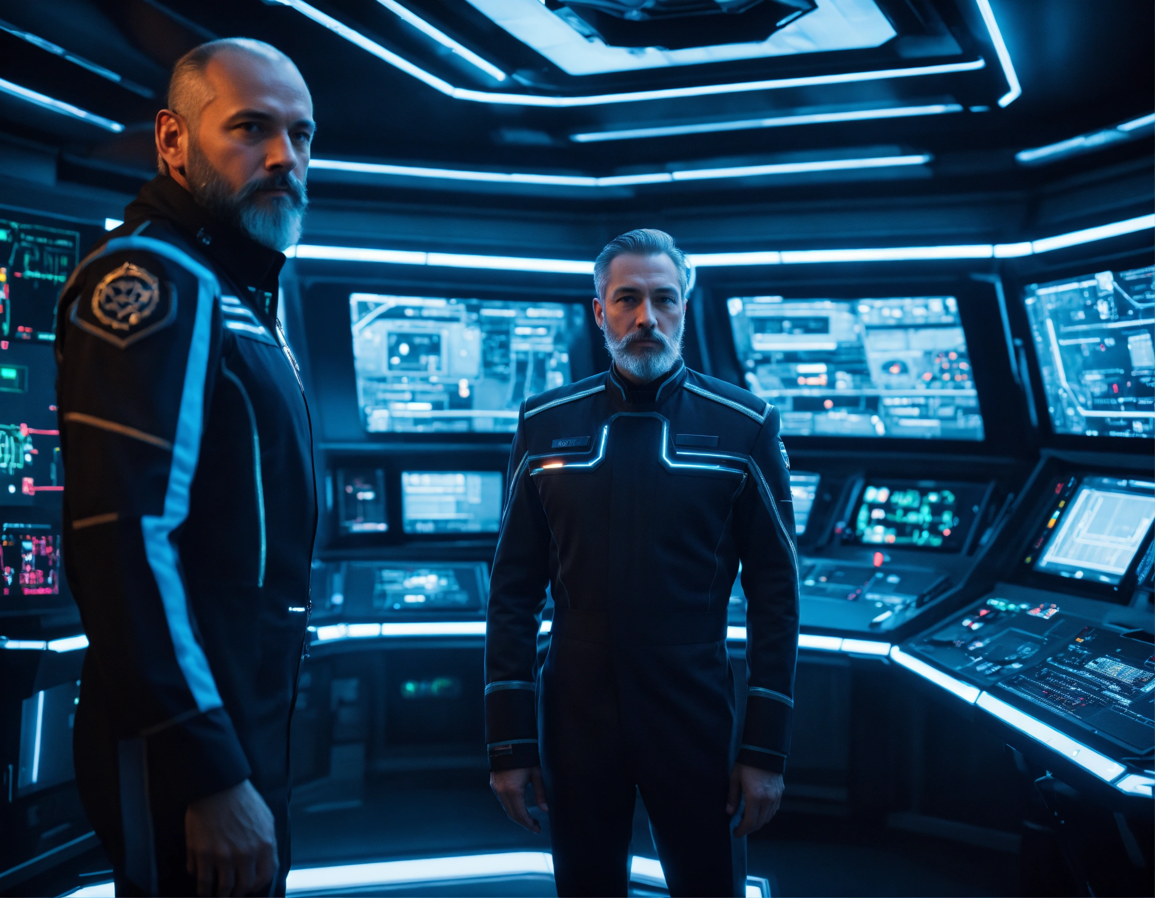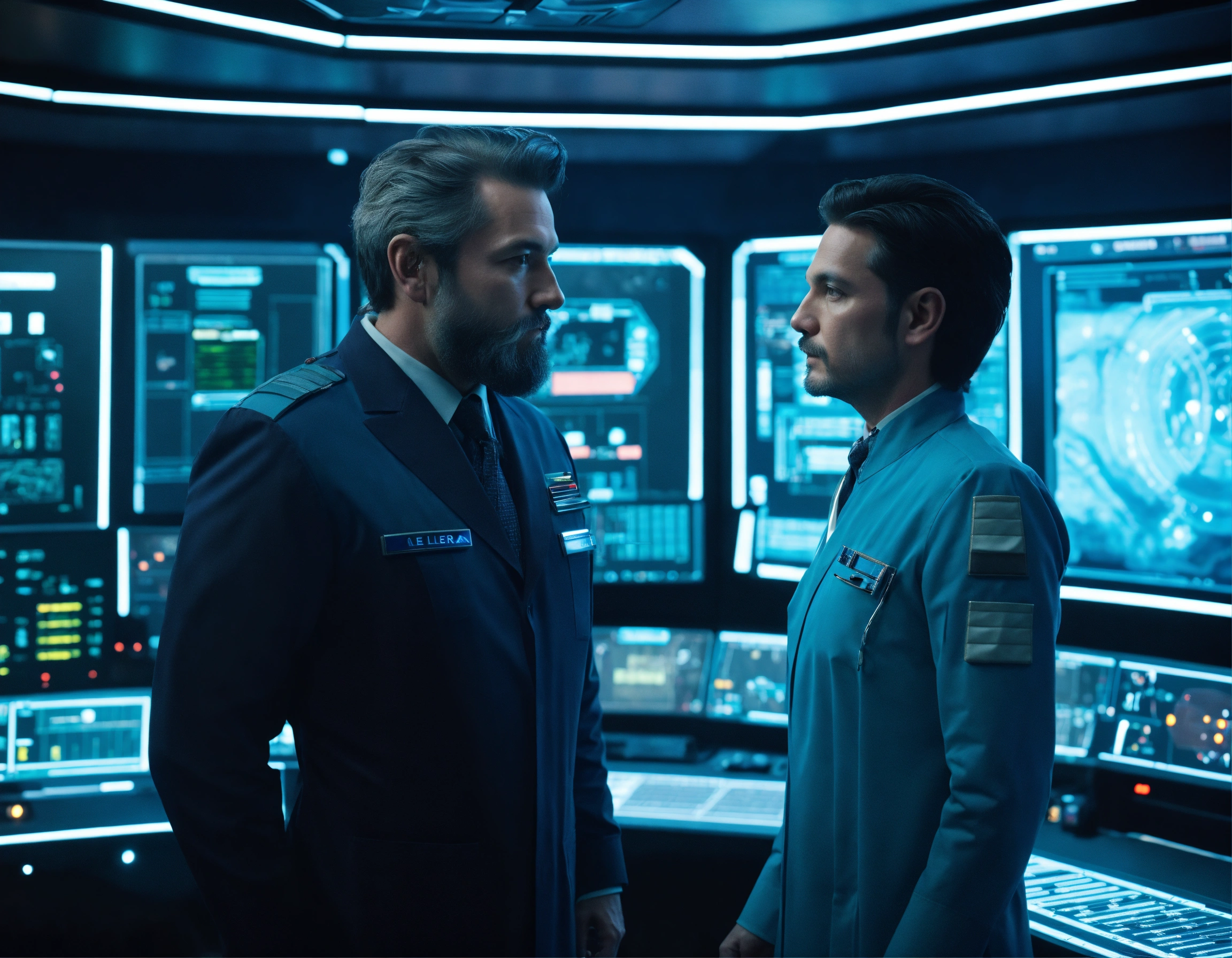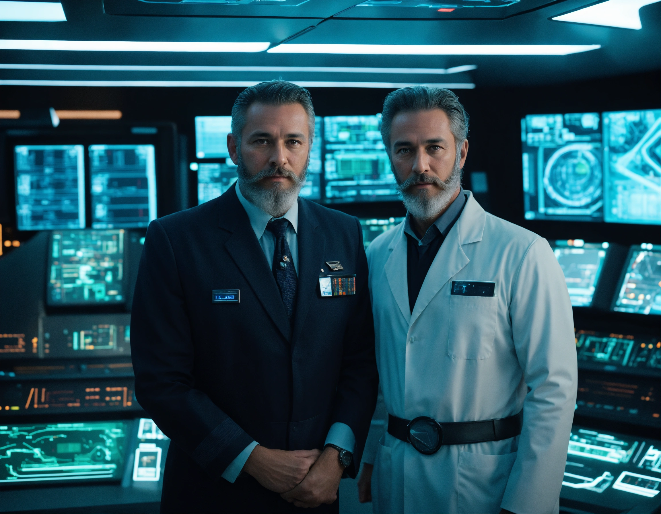 50 year old masculine alien star commander and nice trim beard standing with a younger doctor with no beard wearing a sleek uniform in a hi tech control room of a alien mother ship, 8k, tron, realistic