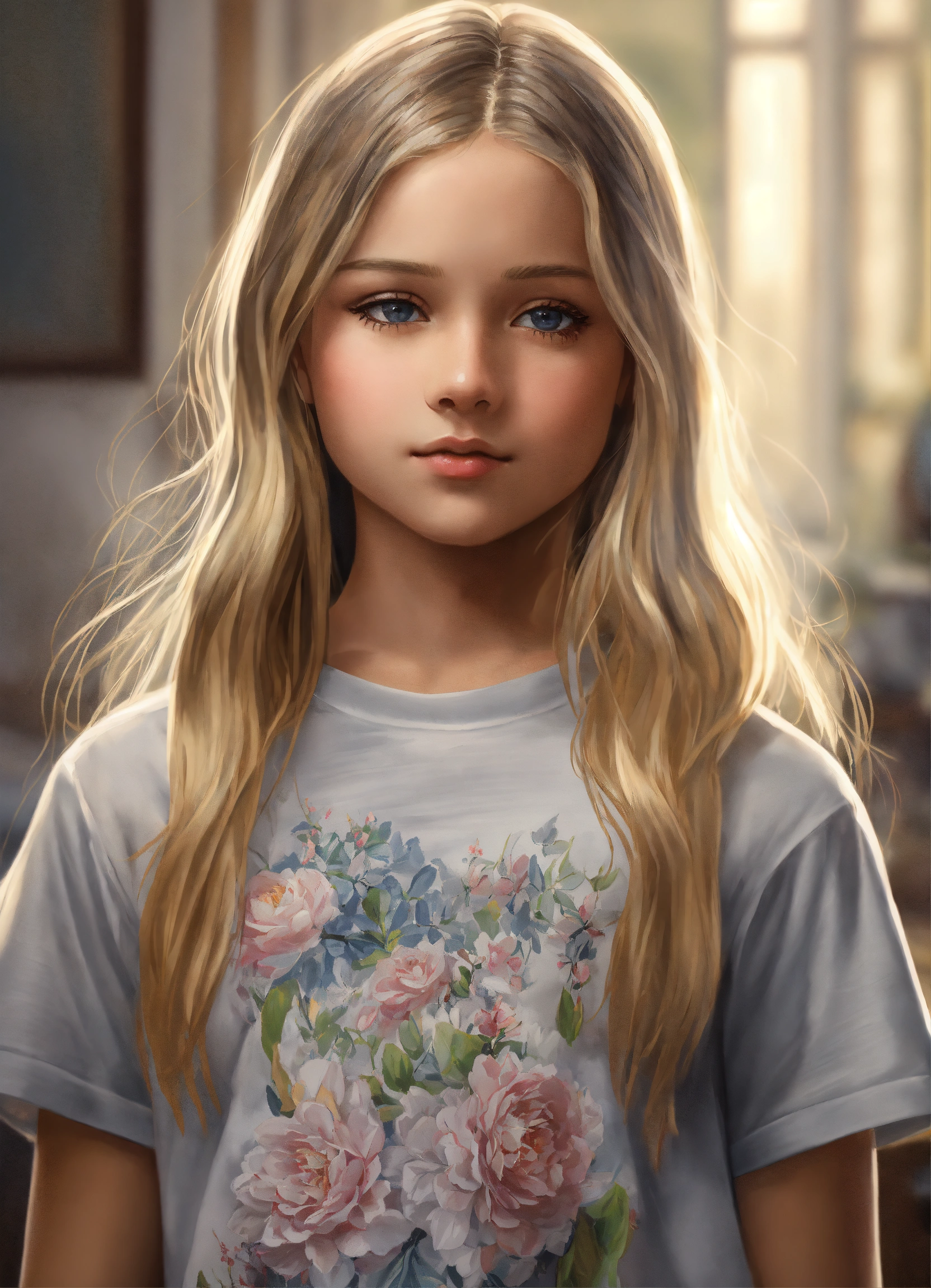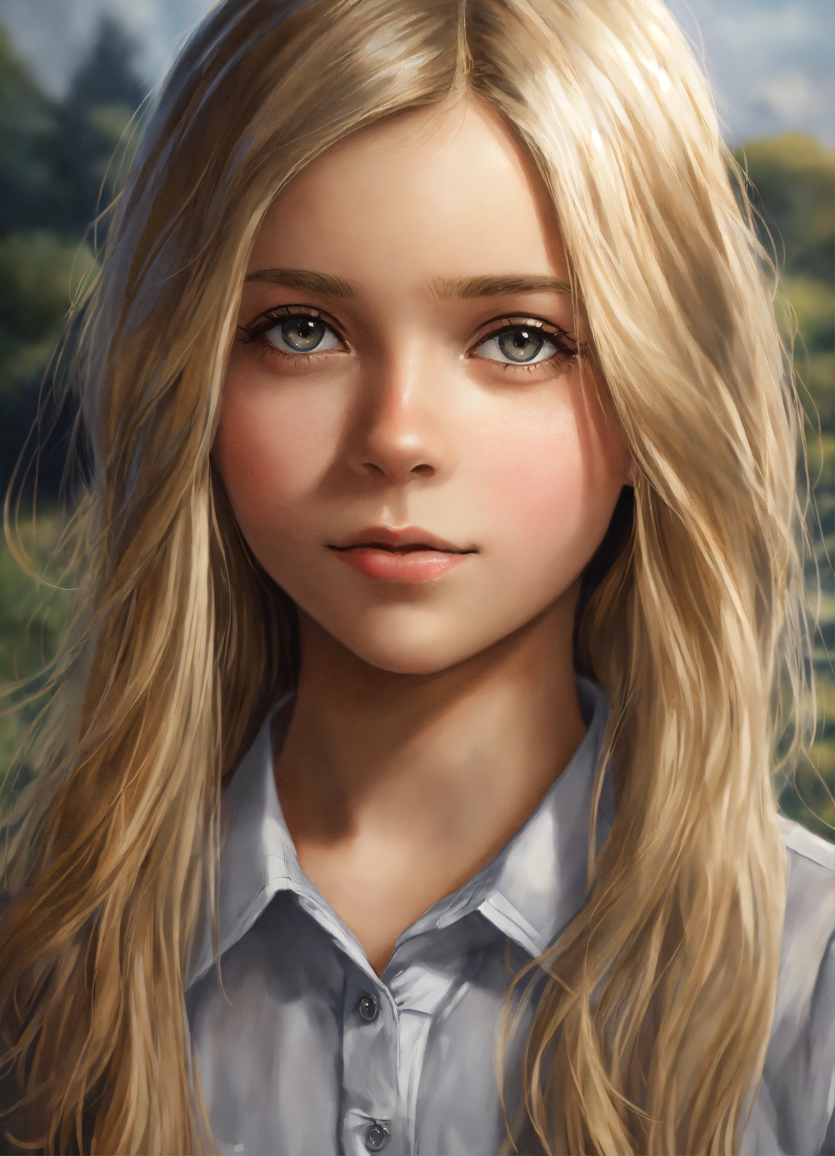 A detailed portrait of a blonde tween girl, short sleeve white cotton shirt, grey skirt, straight long hair, centre parting, art illustration, incredibly highly detailed and realistic, 8 k, sharp focus