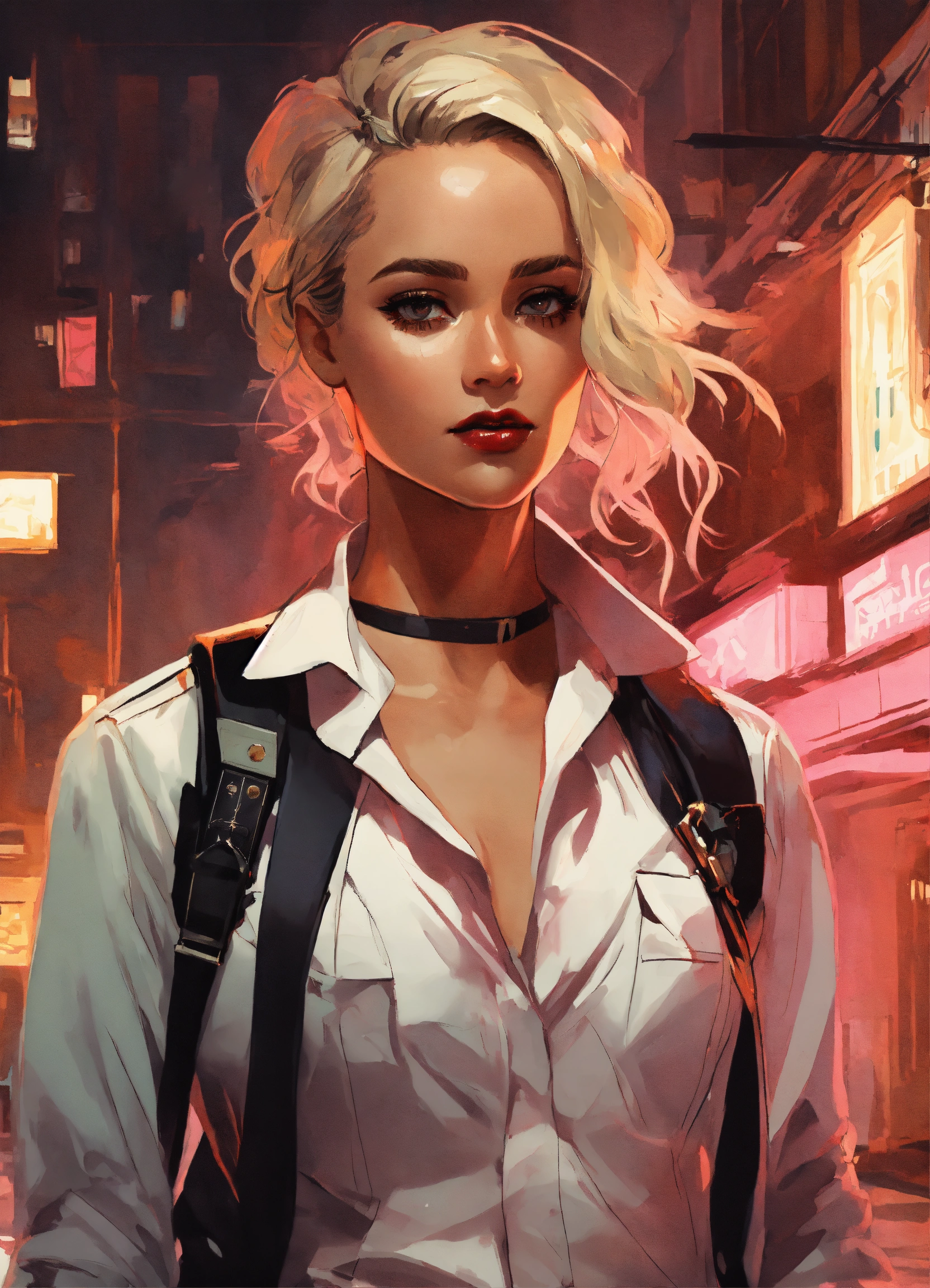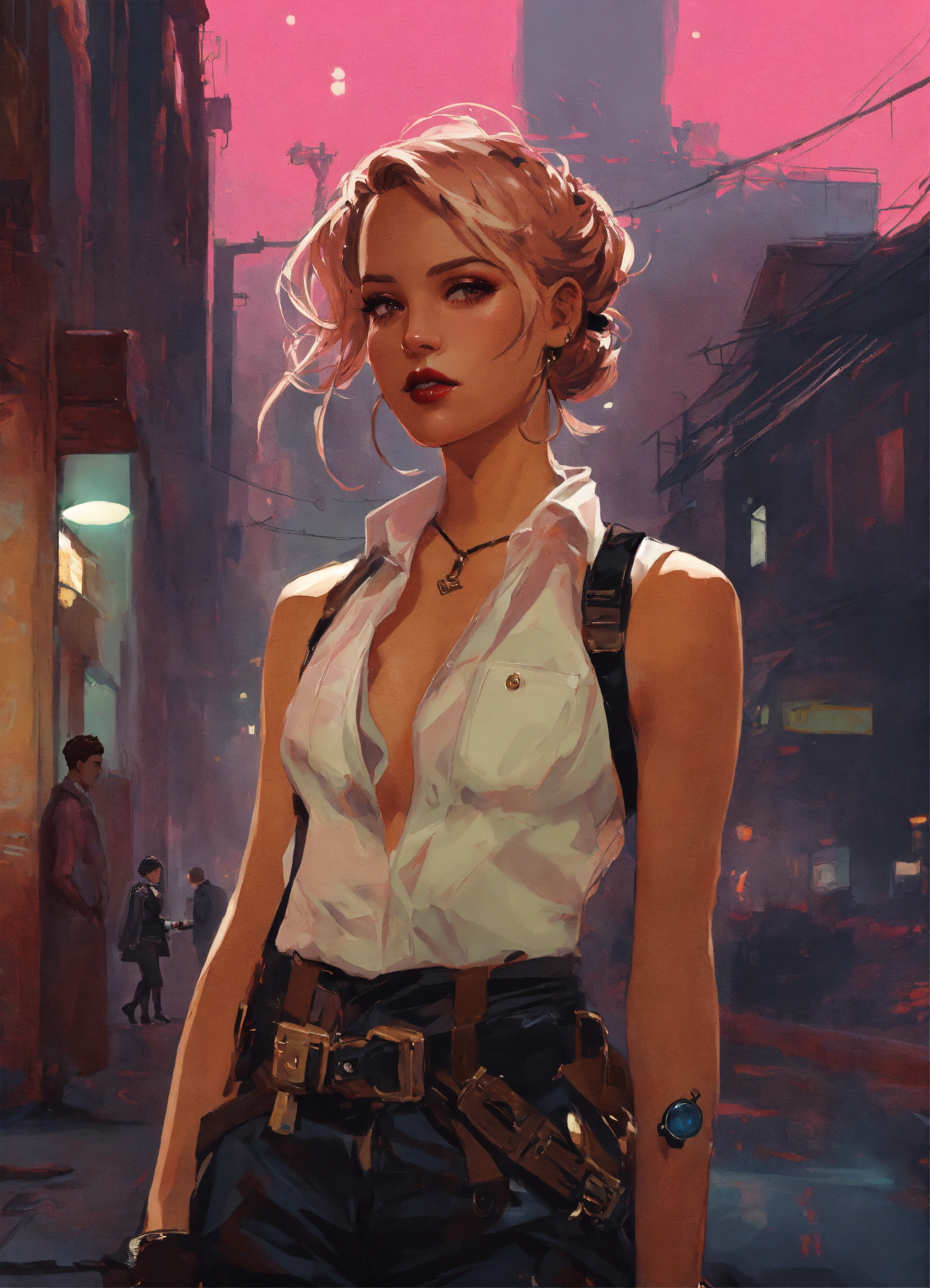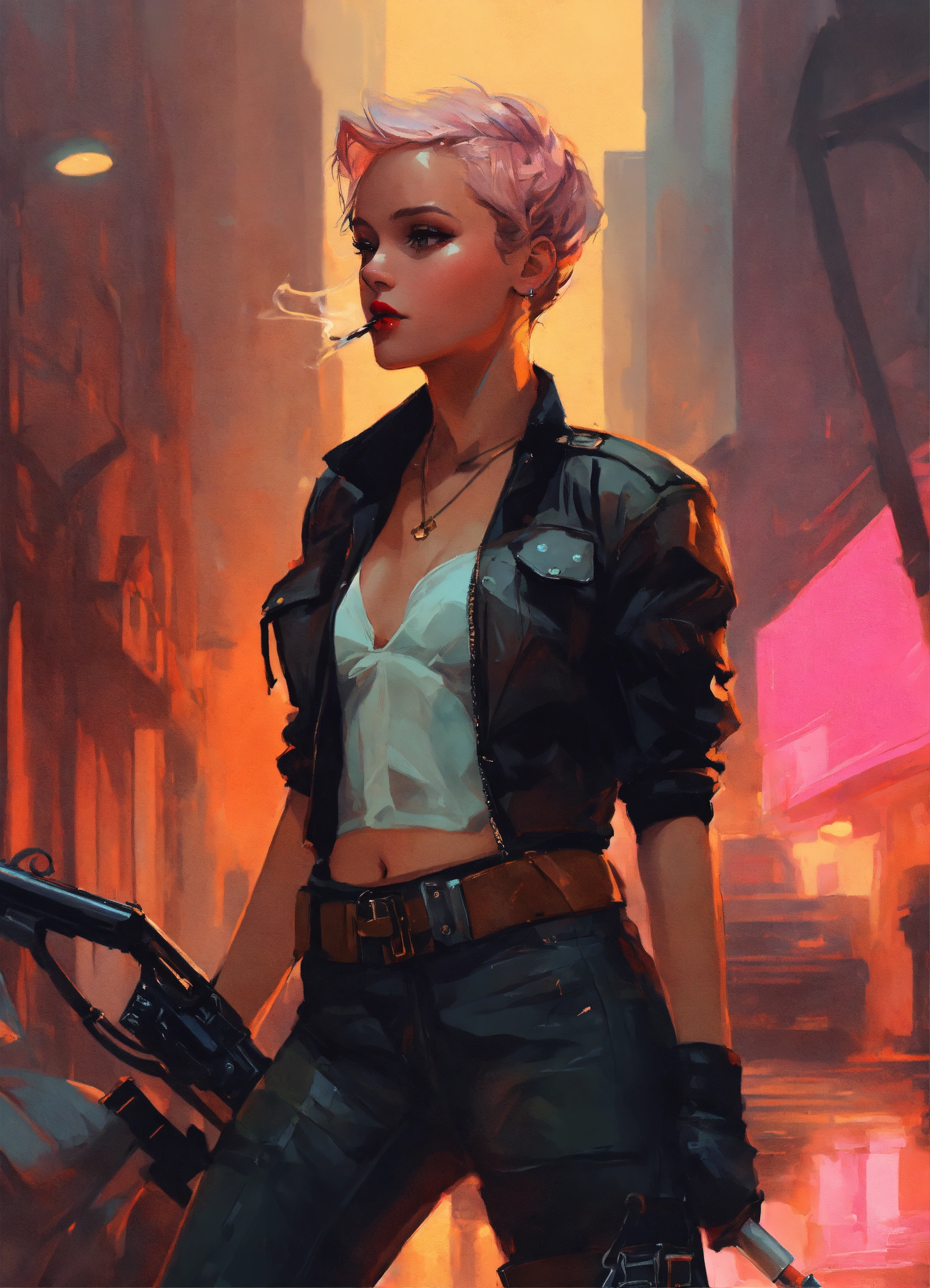 Highly detailed portrait of a sewer emo punk lady mercenary, alicia vikander, smoking cigarette, gloves, black corset, white blouse, tight trousers, black combat boots, pink lipstick, updo haircut, blonde hair, by atey ghailan, by greg rutkowski, by greg tocchini, by james gilleard, by joe fenton, by kathe butcher, gradient black, brown, umber color scheme, goth aesthetic!!! 1920s city raining background