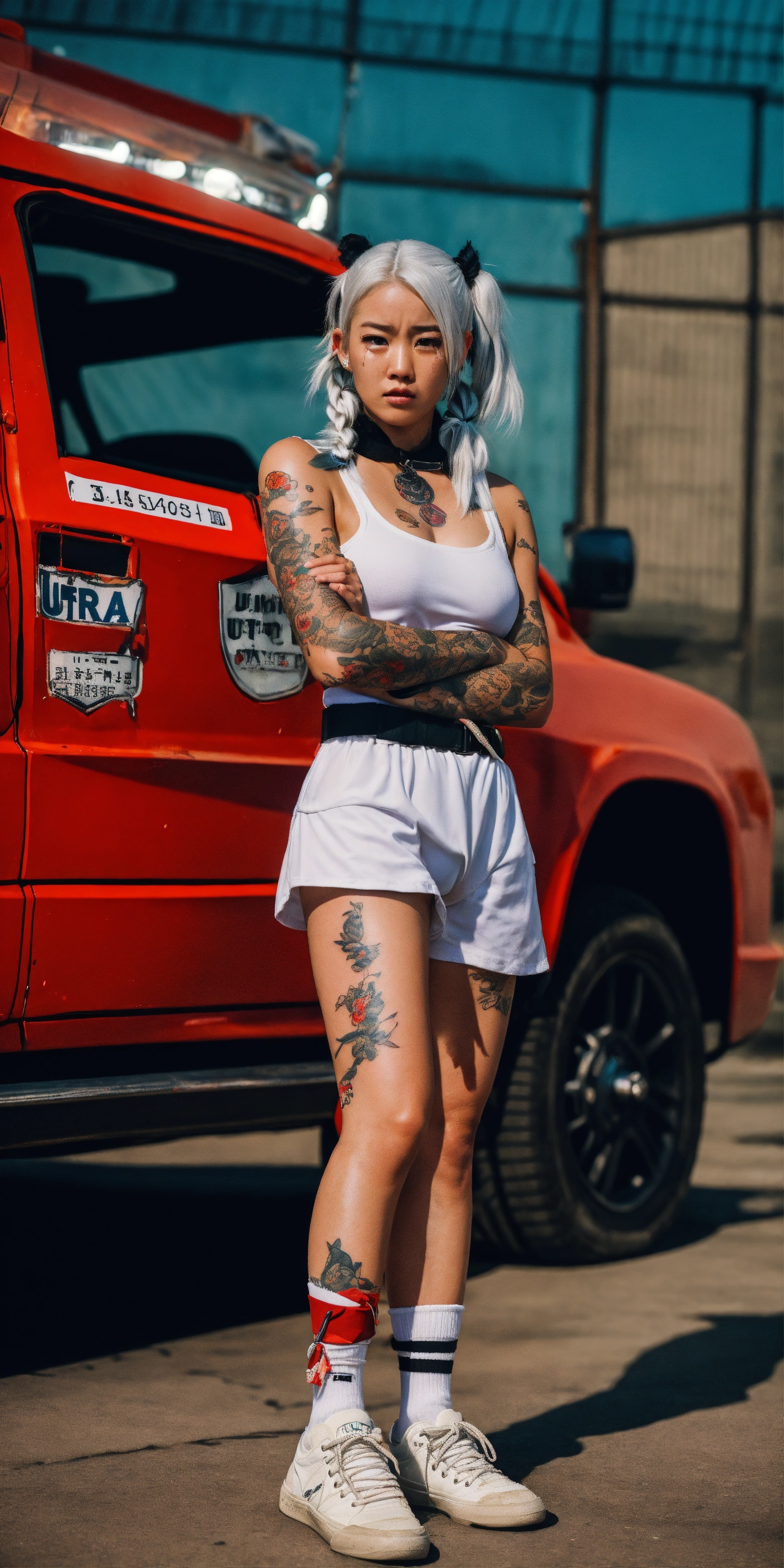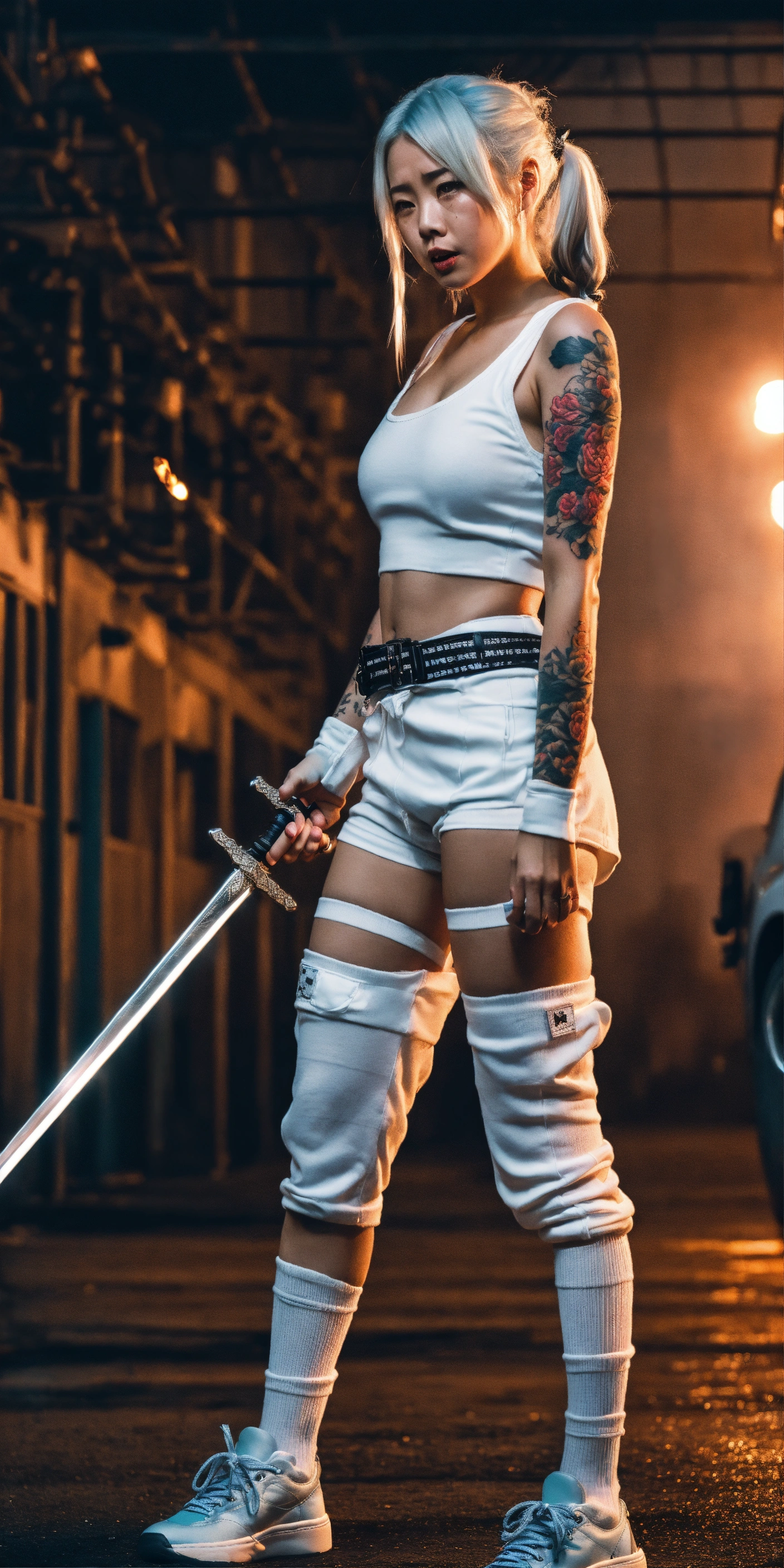 In a prison, tattoos, asian, movie scene, dramatic photo, white hair in pigtails, very realistic, photoshoot, human, plastic undergarments, young girls, cargo belt, cape, kawaii, cute, crying, cars, holding two swords, ultra realistic, uhd, nighttime, prison, many women in background, fire, white high top sneakers, knee socks
