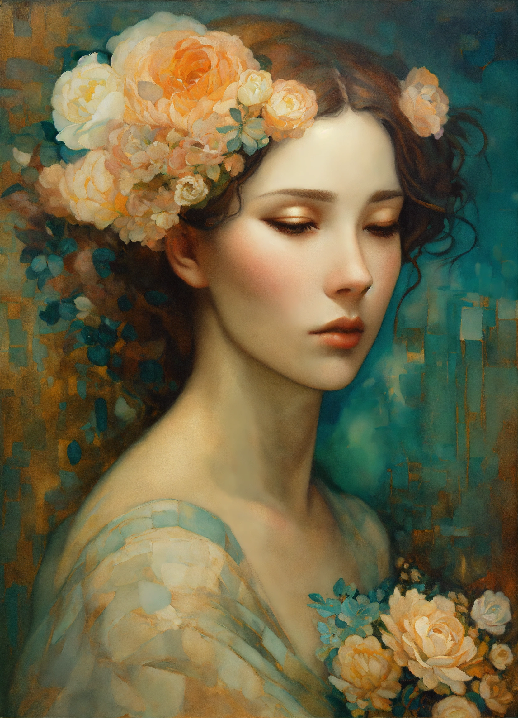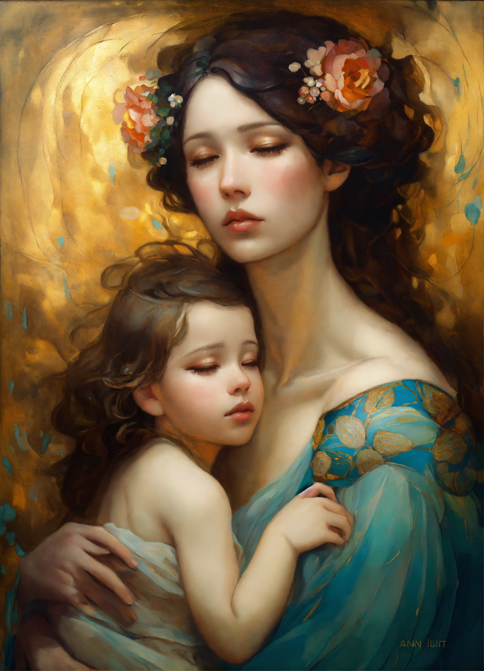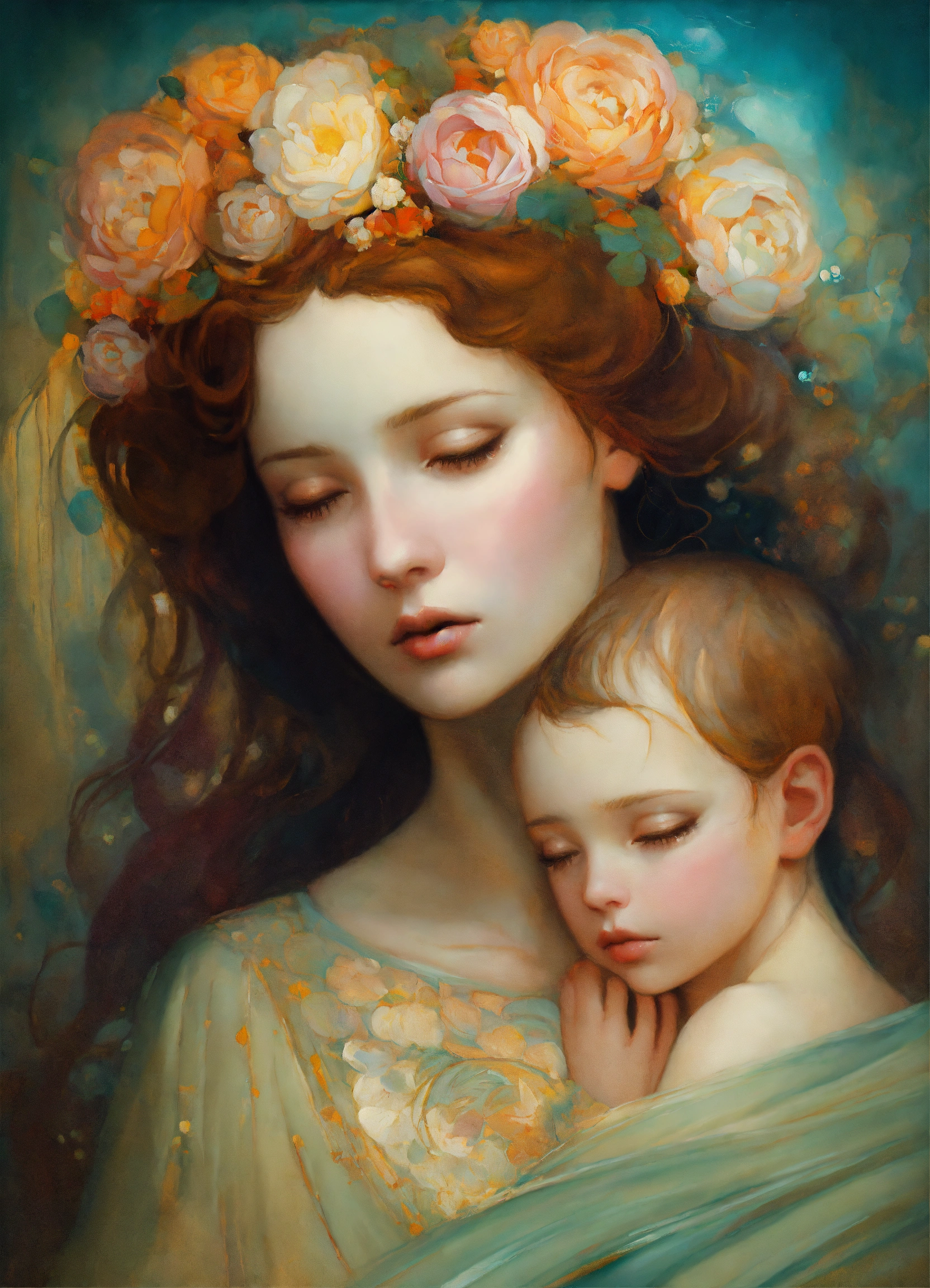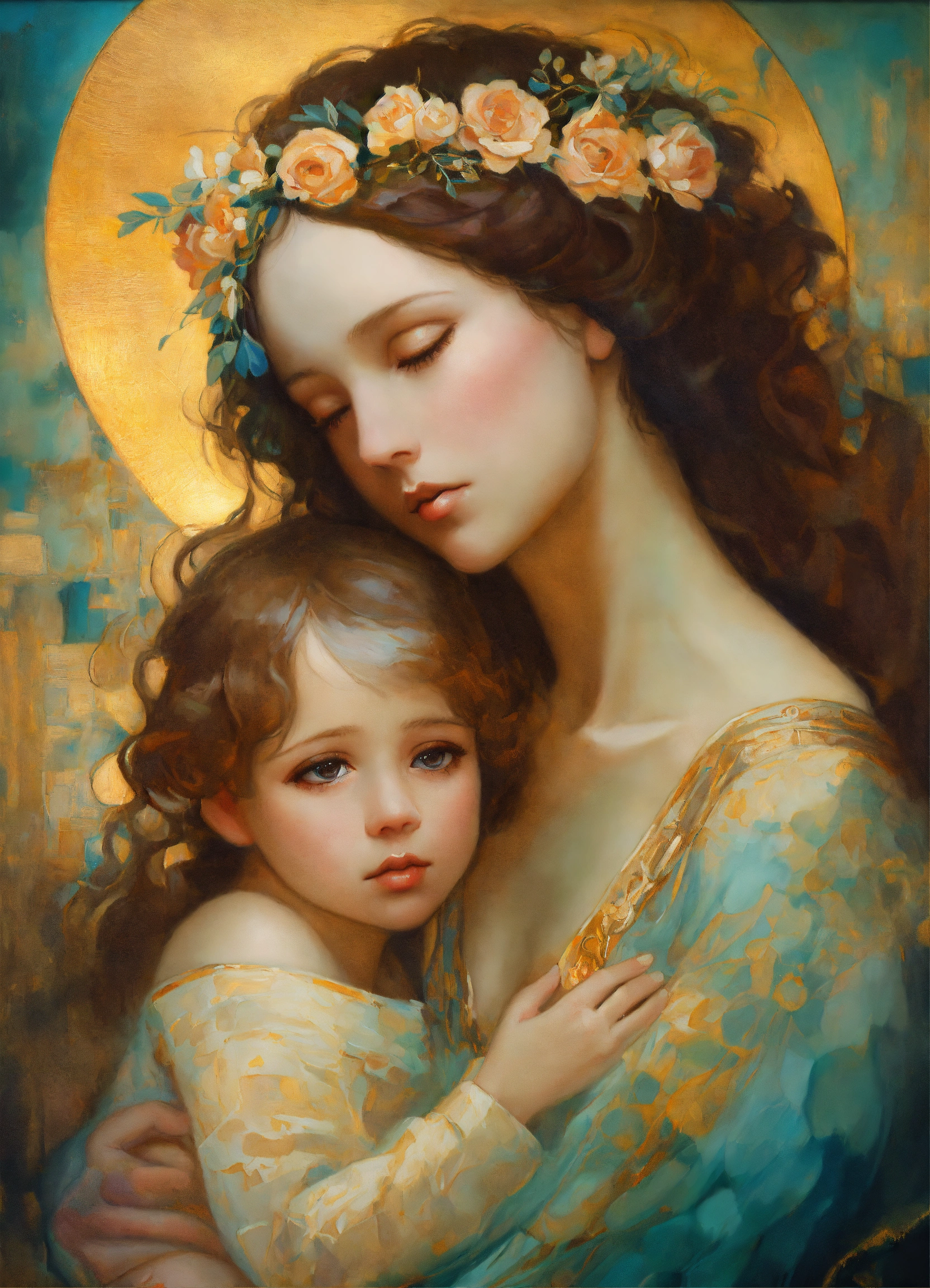 Oil painting head and shoulders portrait of a mother with child, sad, dreamy, beautiful, amazing, by anna dittman, by gustav klimt