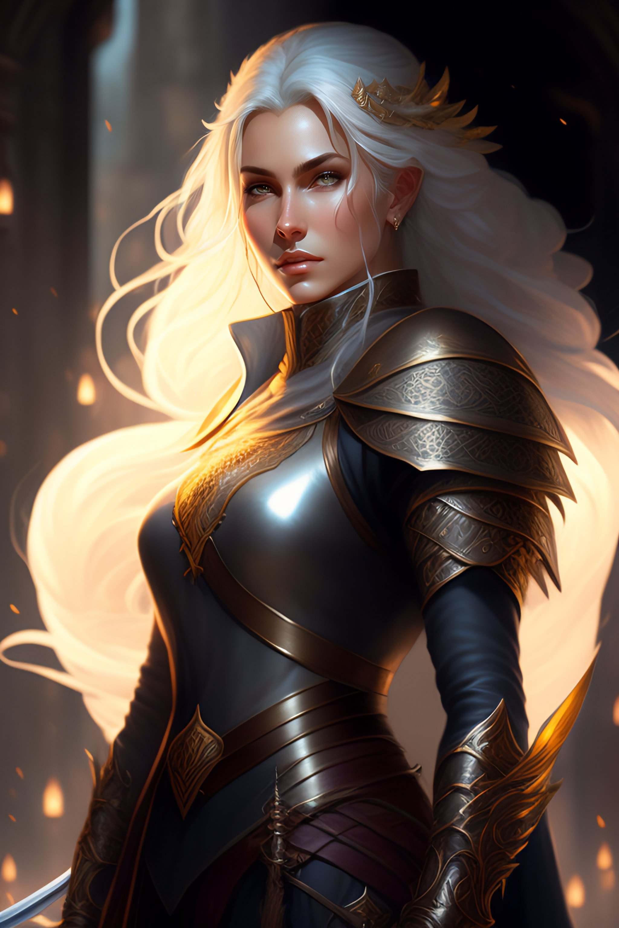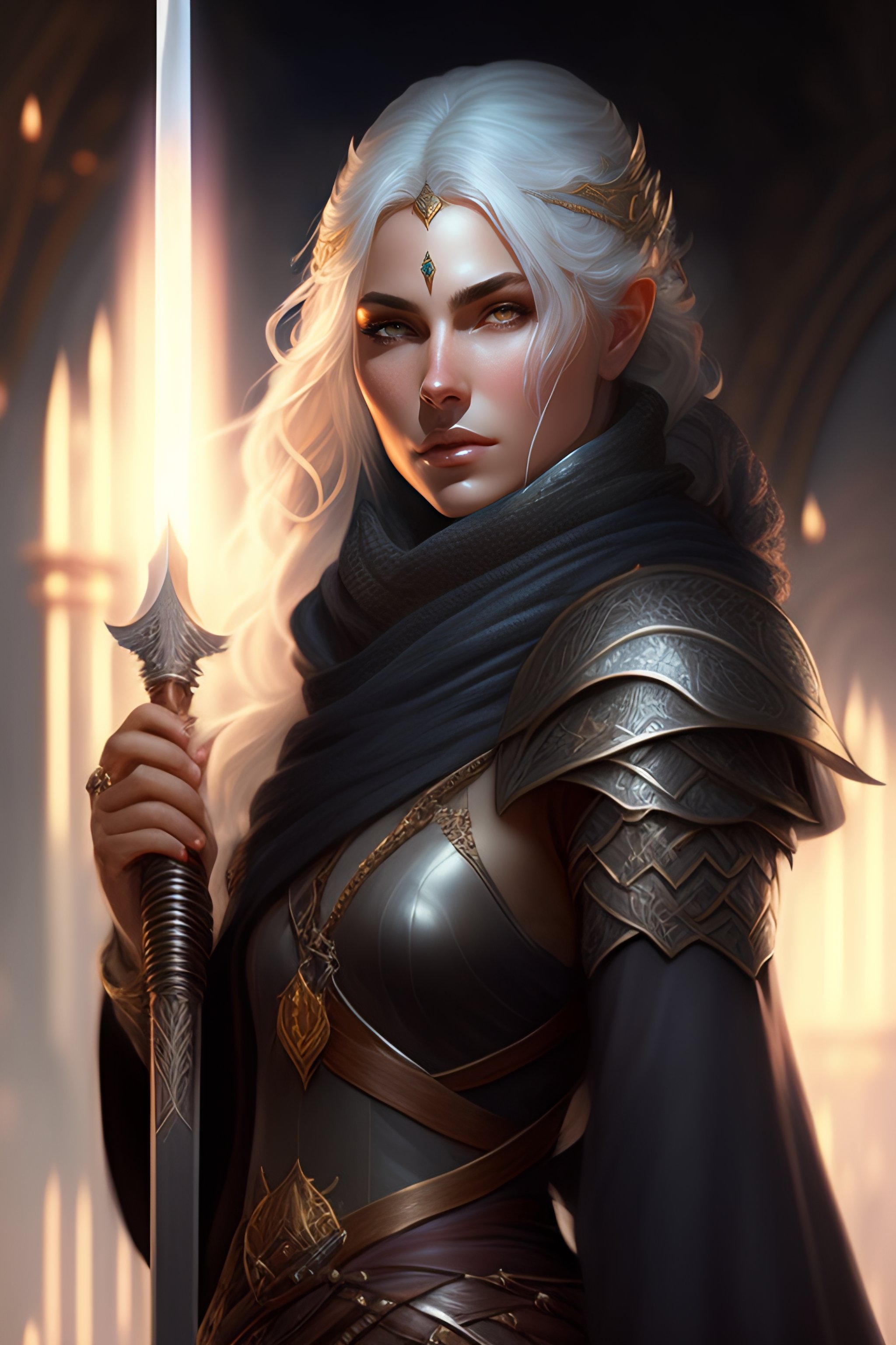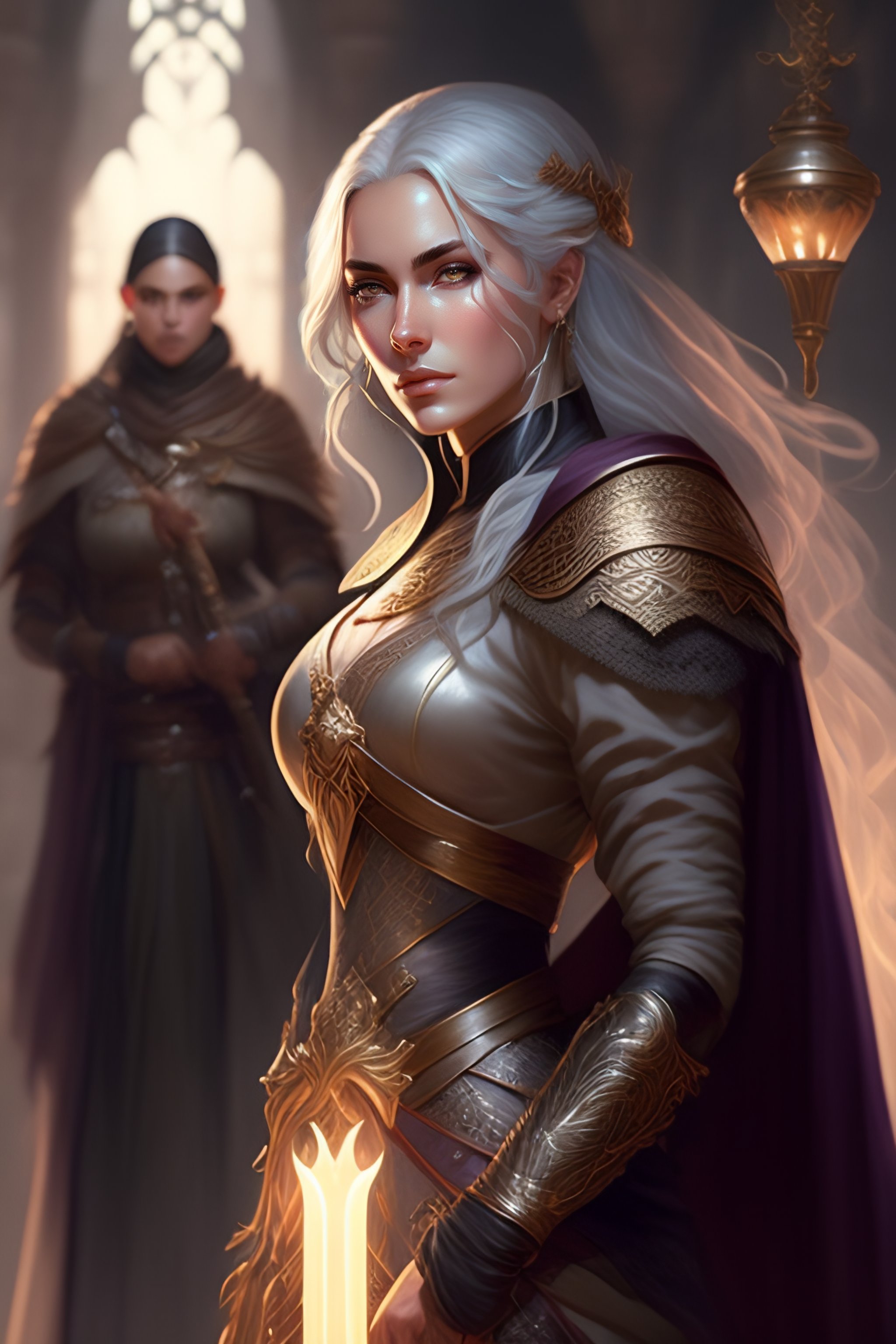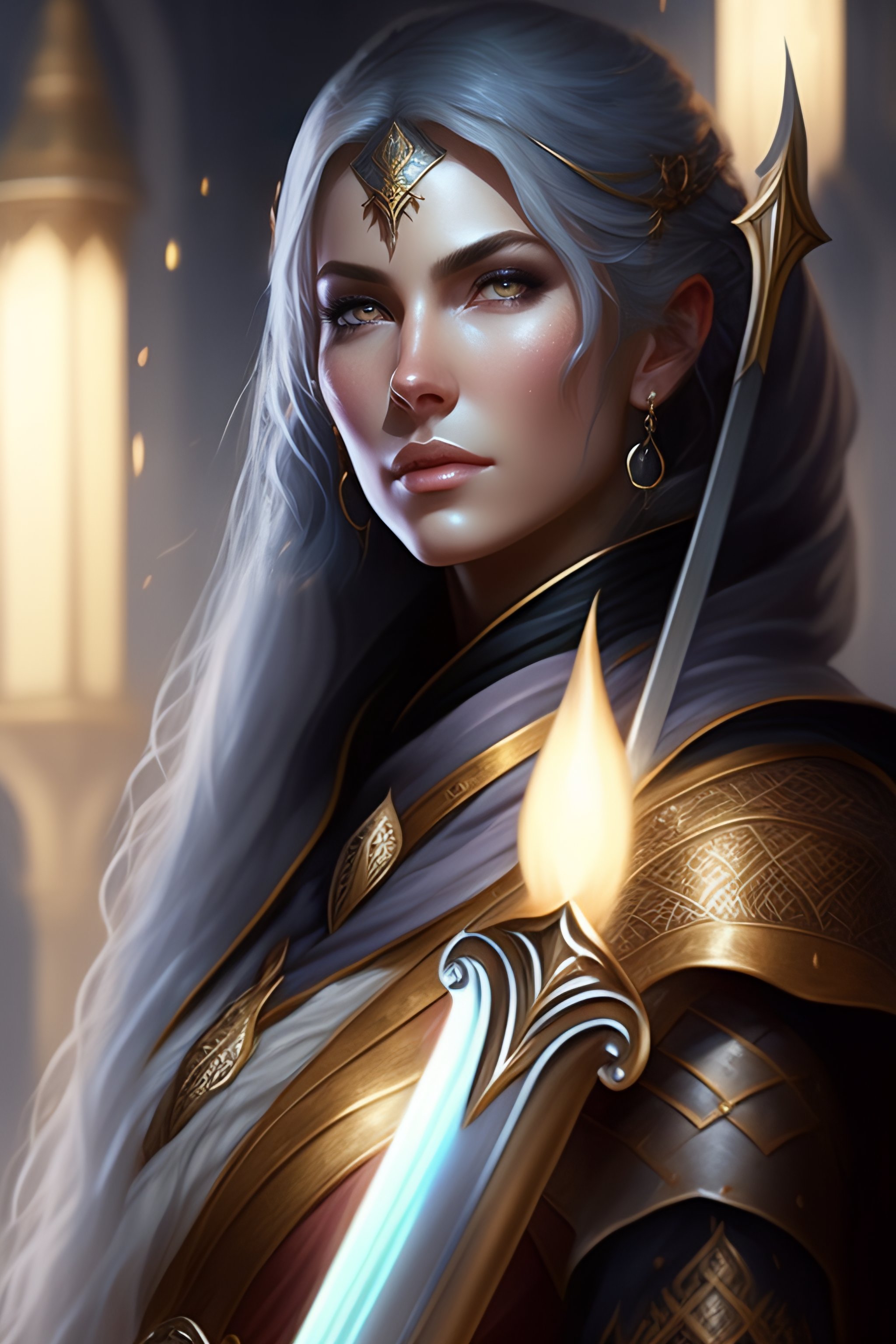 Female cleric in center, dnd, fantasy, gray hair, short hair, holding sword, dark light night, intricate, elegant, sharp focus, illustration, highly detailed, dark lighting, full body, digital painting, concept art, matte, art by wlop and artgerm and greg rutkowski and alphonse mucha, masterpiece
