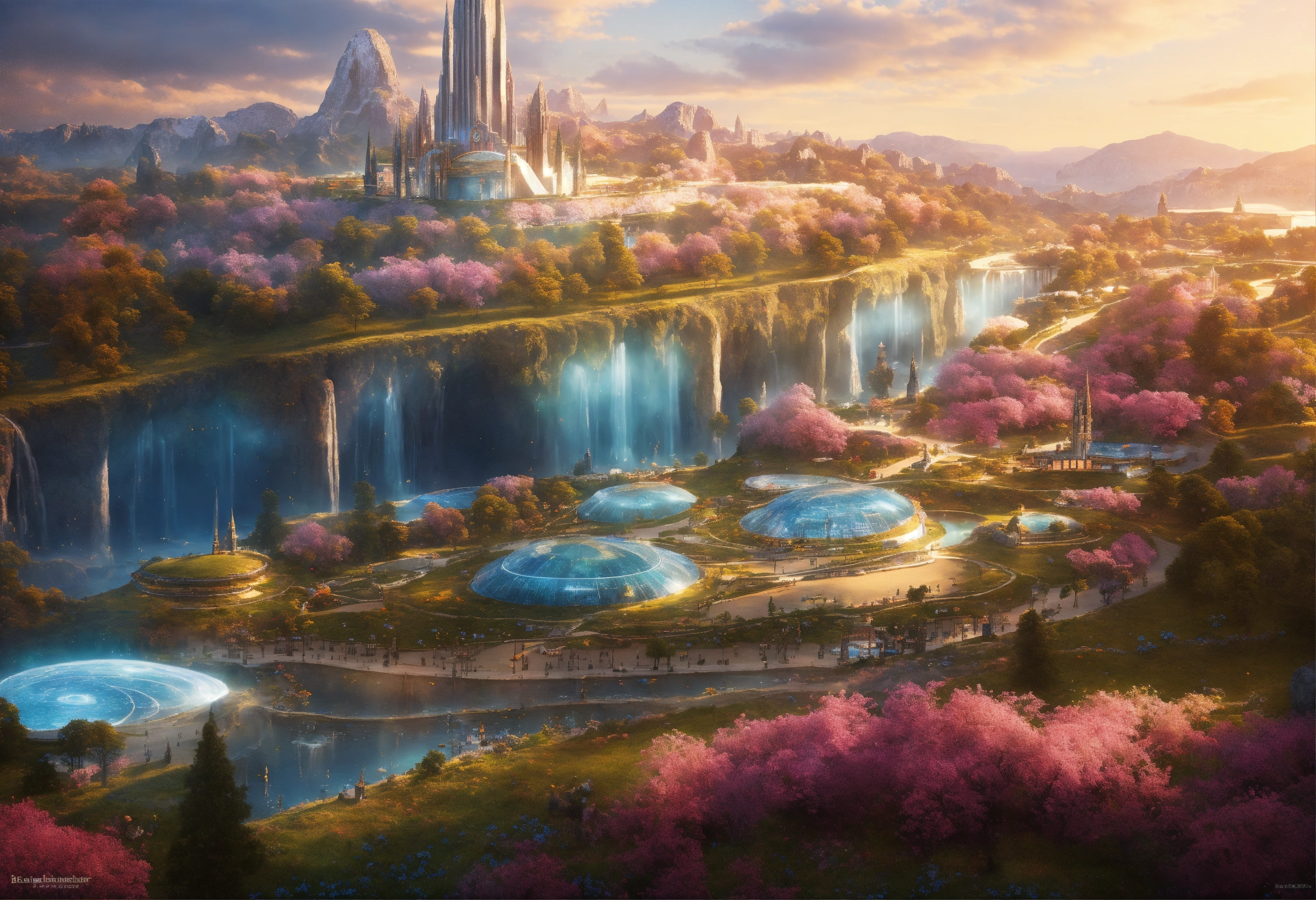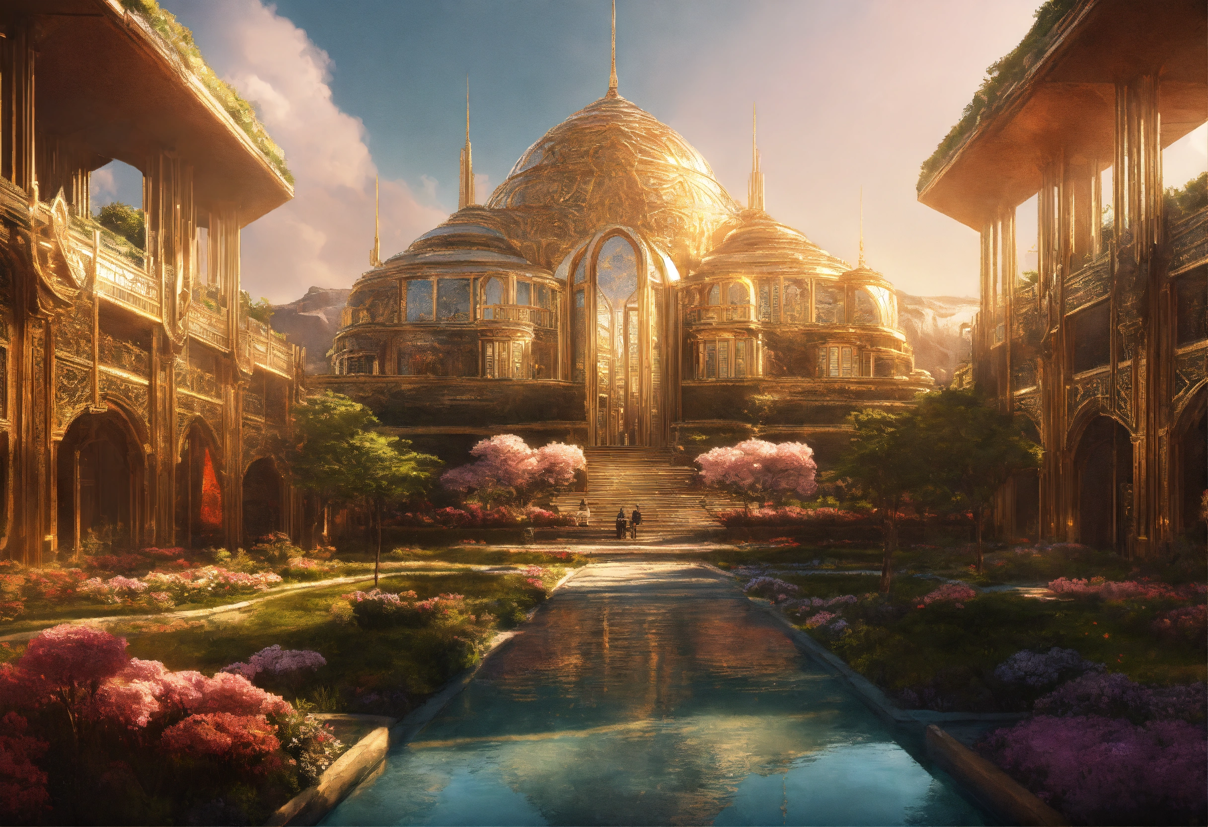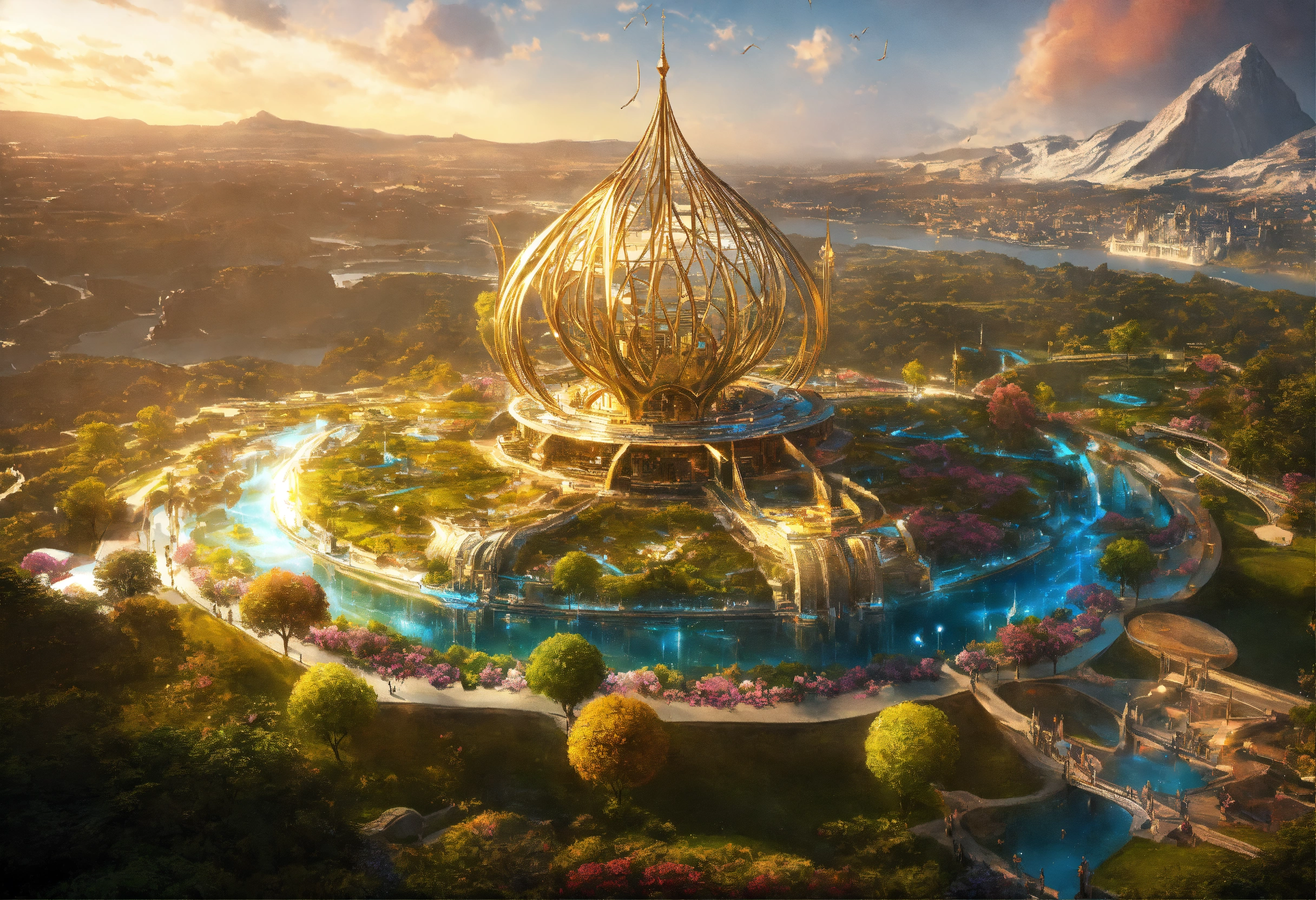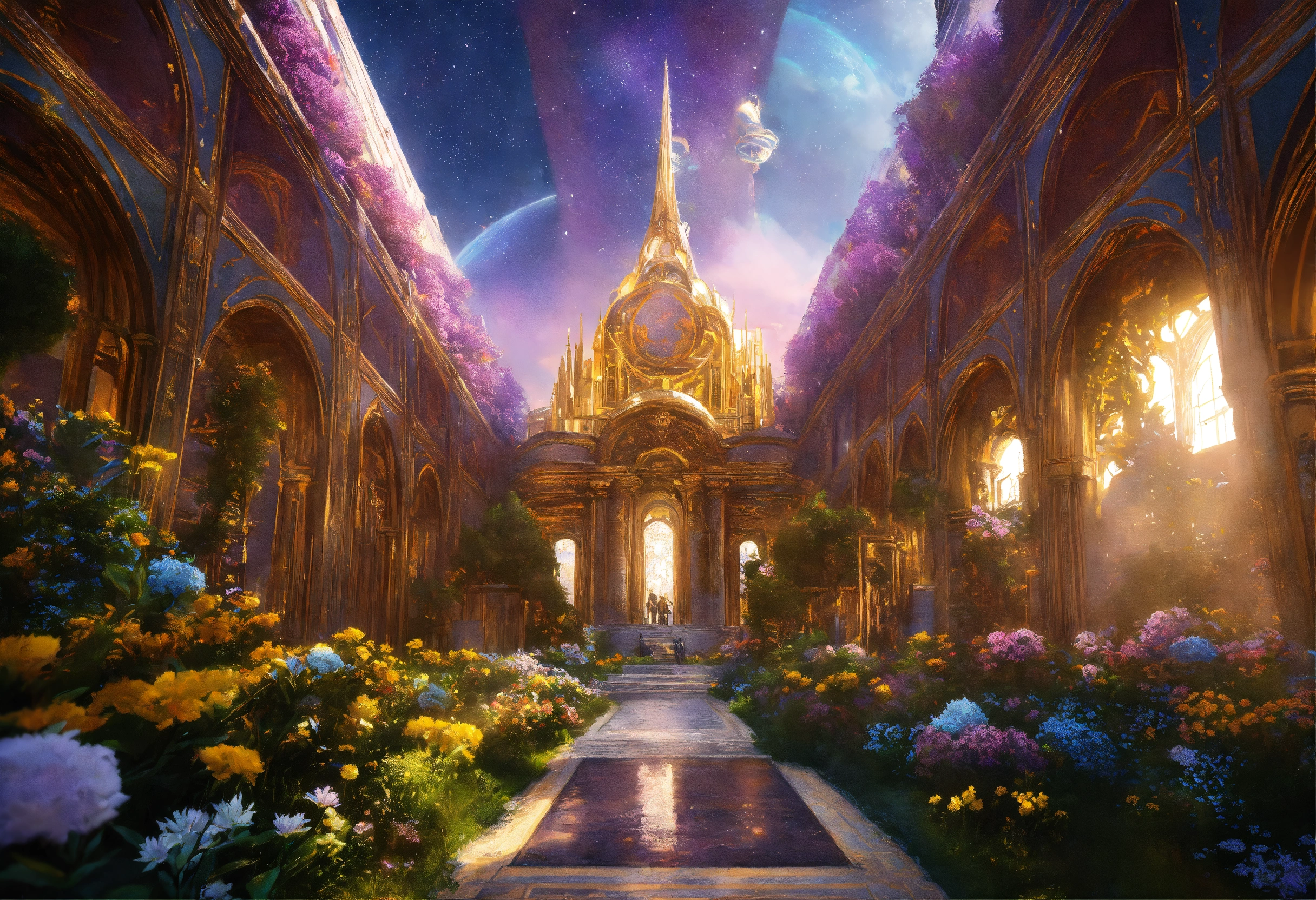 Asgard la cité celeste futuriste ou vivait les dieux faite d'une cité céleste futur avec des batisses et des temples d'or et de cristaux suspendu dans les étoiles, lieu de grande beauté et de luxe et une nature luxuriante de fleurs et colorées, glycines, 16k