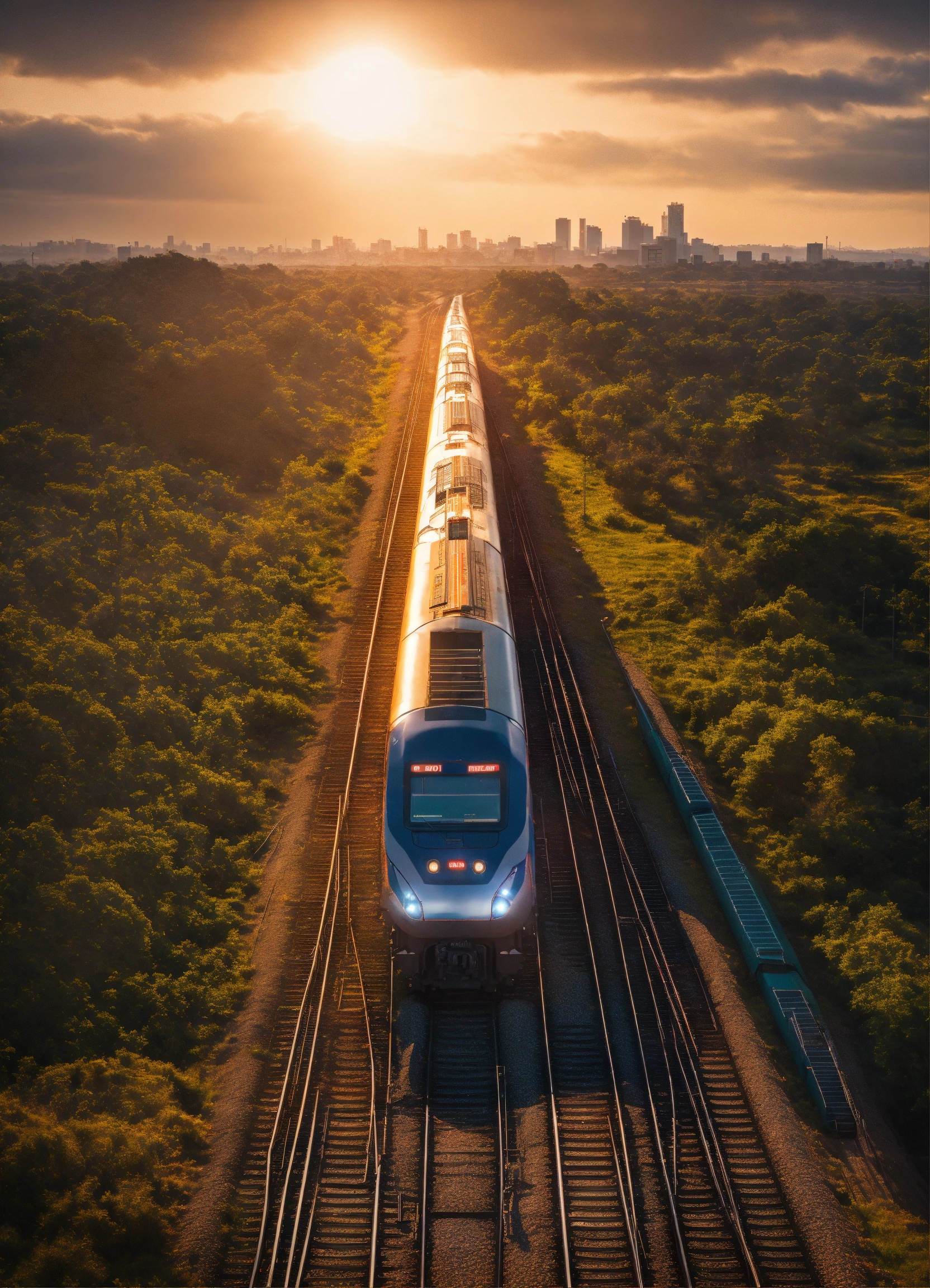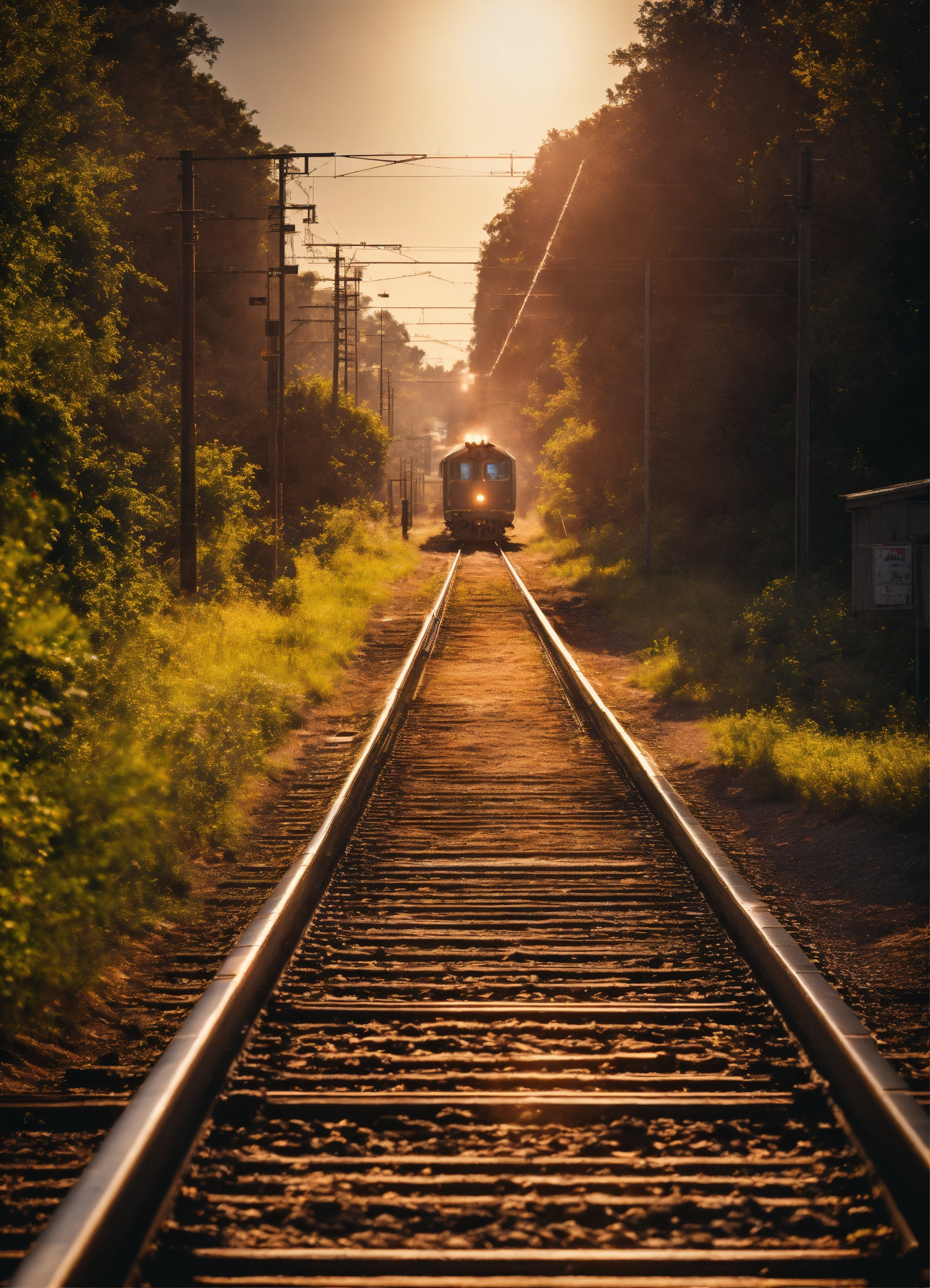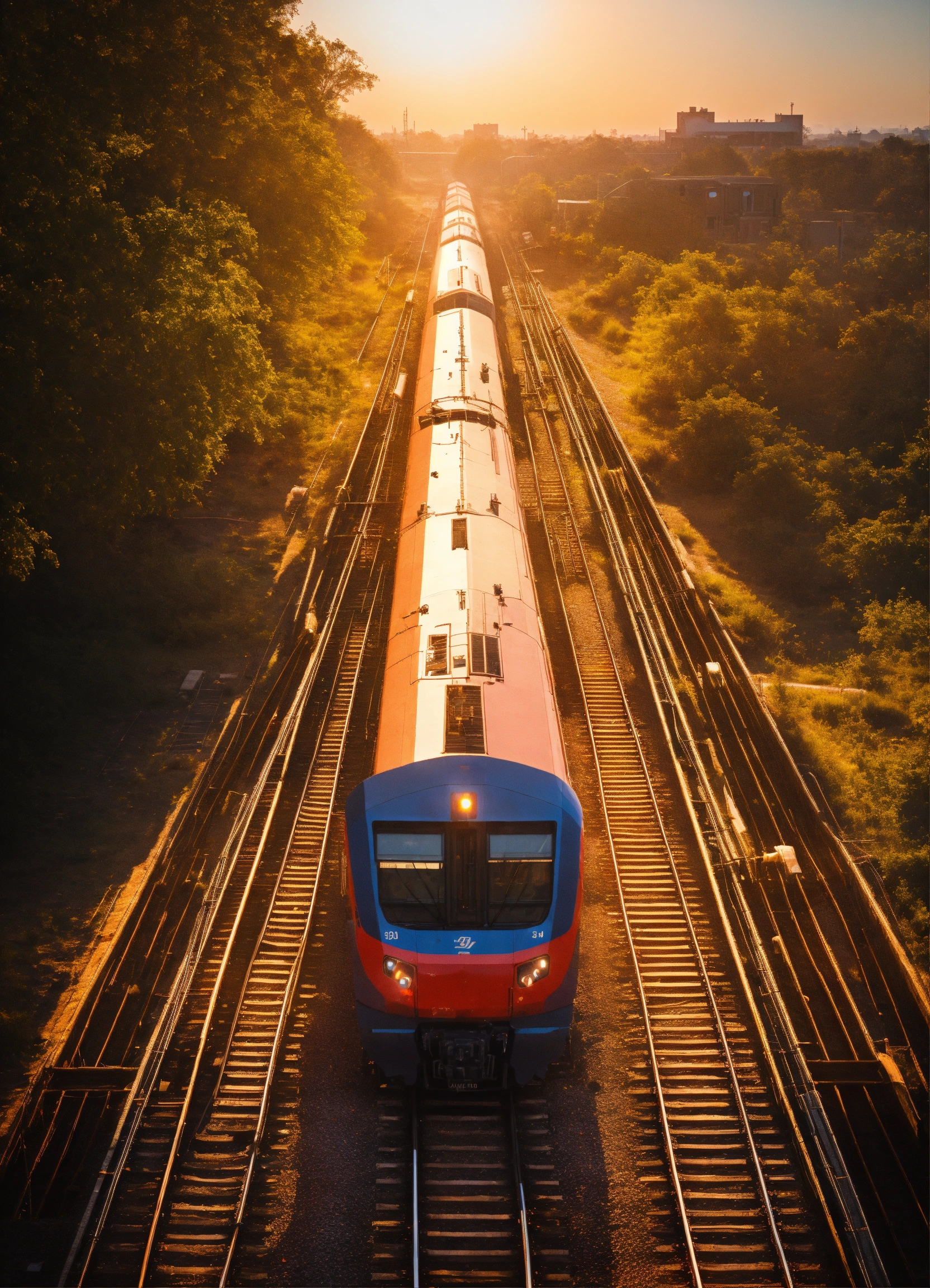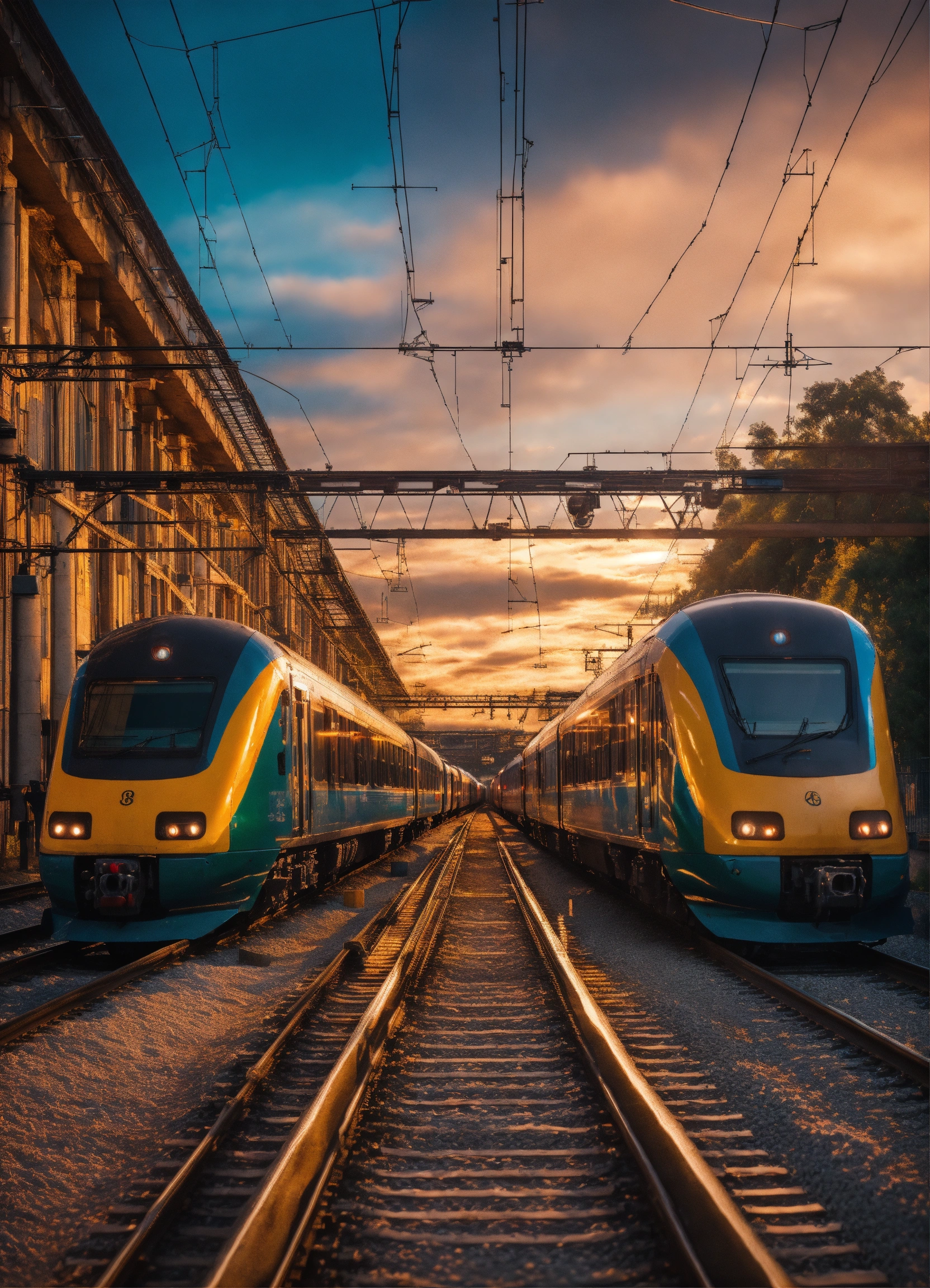 Two trains running in different directions on different tracks, surreal photo, fujifilm xt3, outdoor, good lighting, raw photo, 8k uhd, film grain, unreal engine 5, ray trace