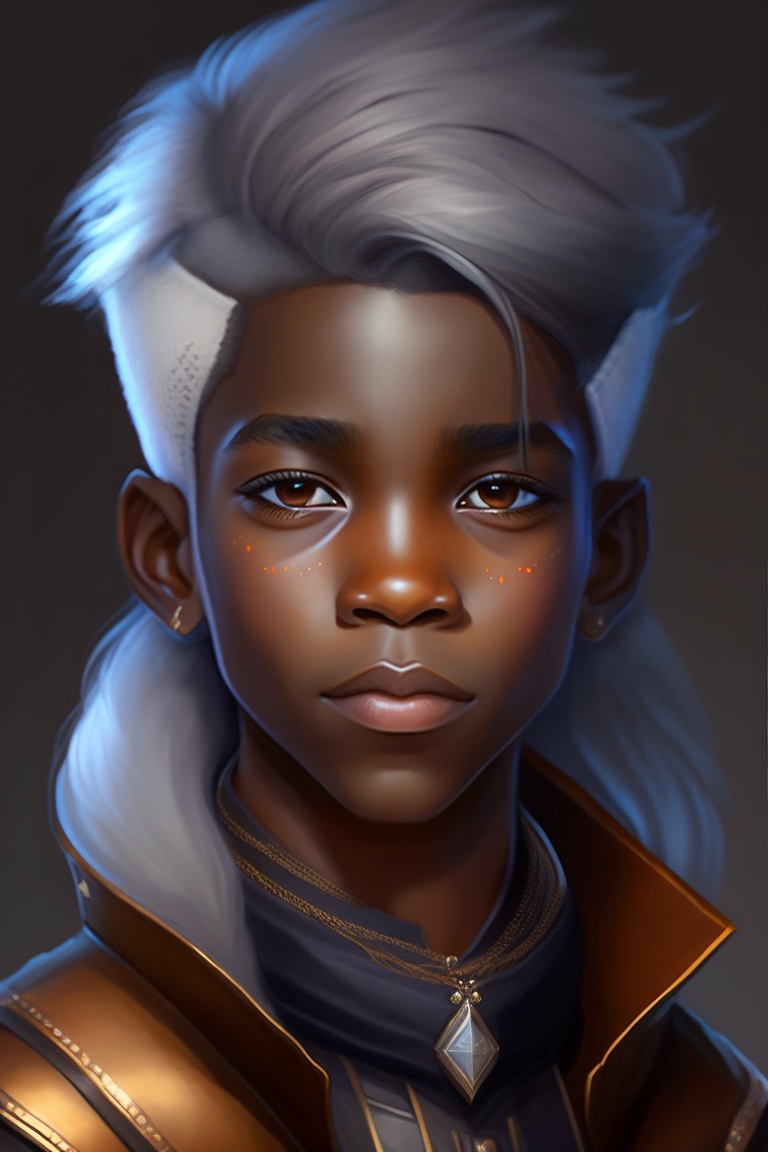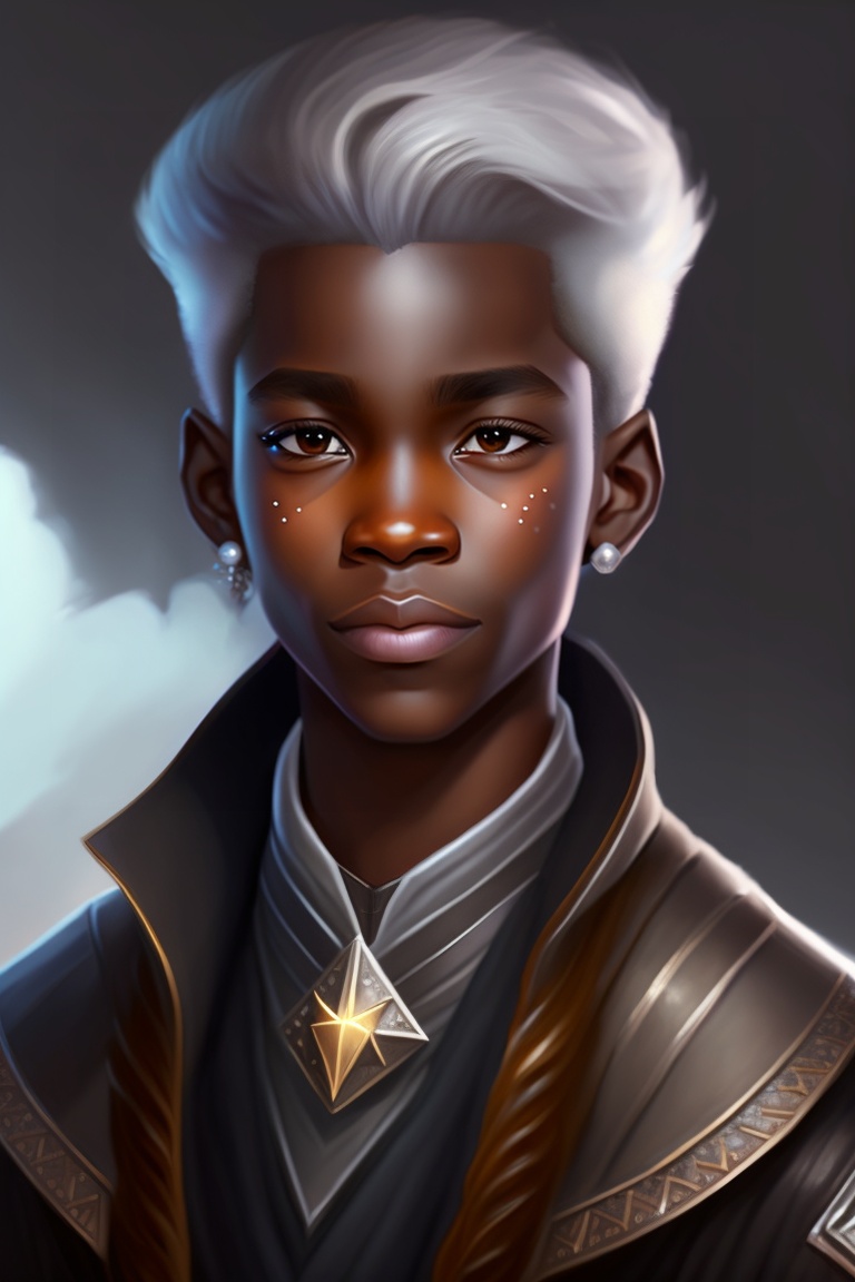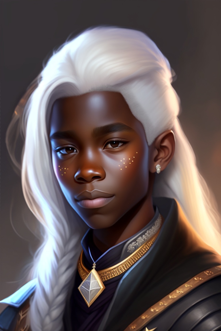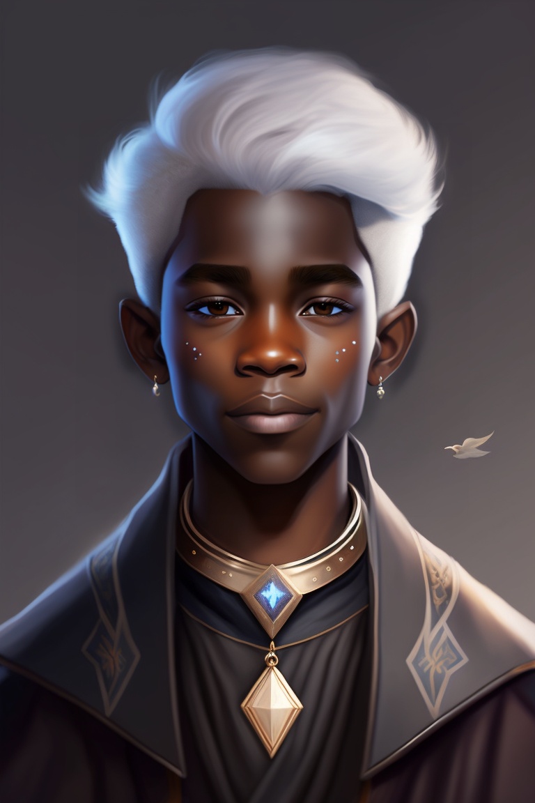 Greyscale dnd character art, young drow druid boy, portrait, white hair, brown skin, child, necklace with 3 stars, oil painting, digital art