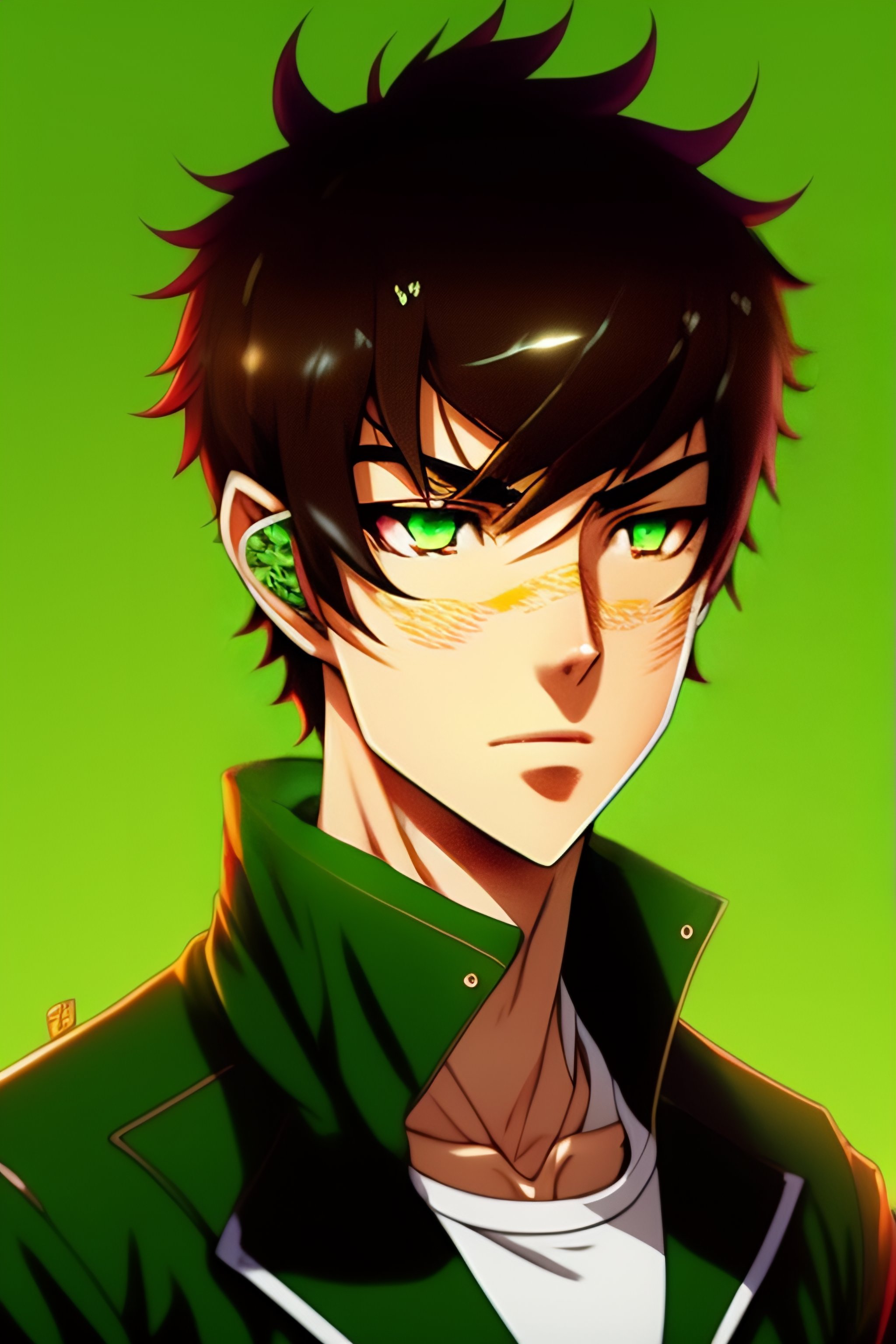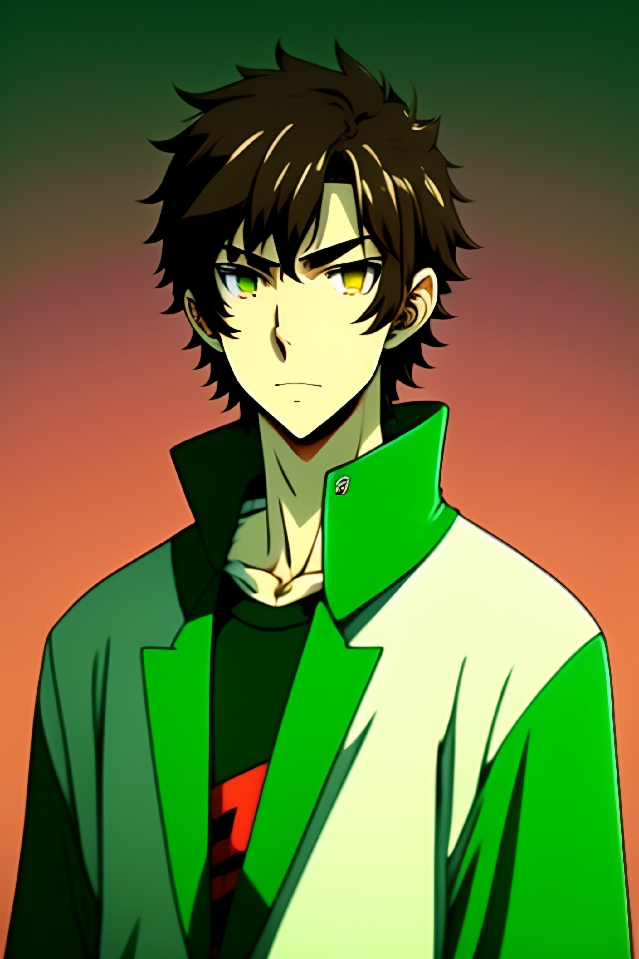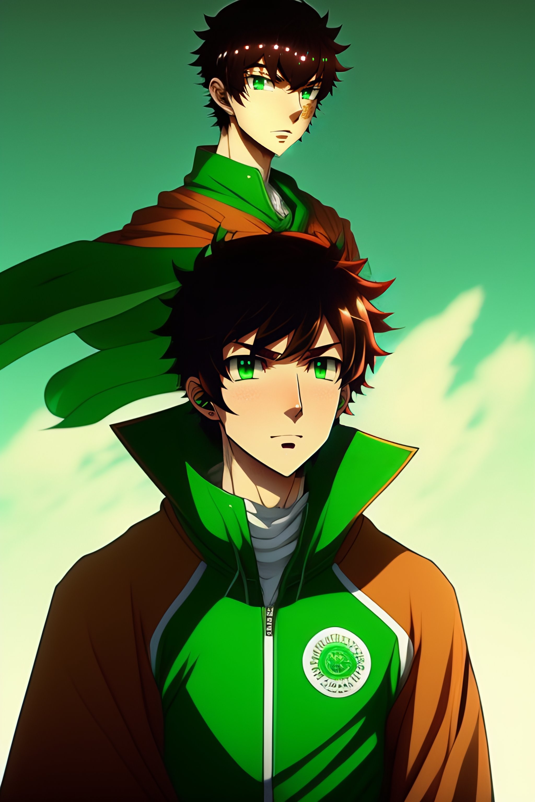 Anime guy, 19 years old, wearing a green colored t-shirt, brown hair, green eyes, light green eyes, green colored eyes, serious, anime style, cool, wearing a green jacket as a cape