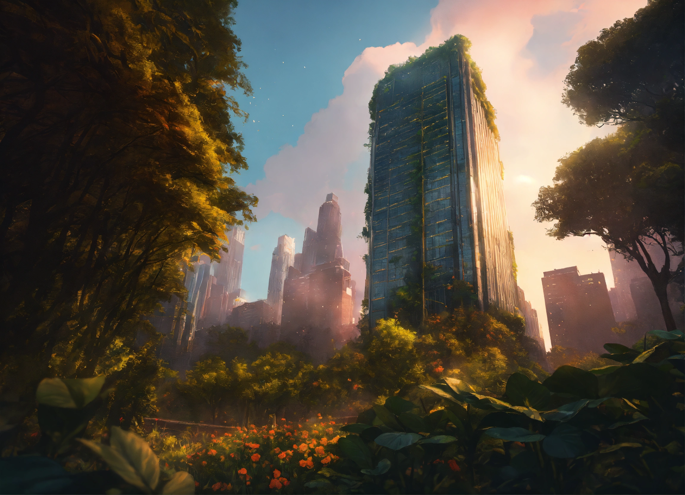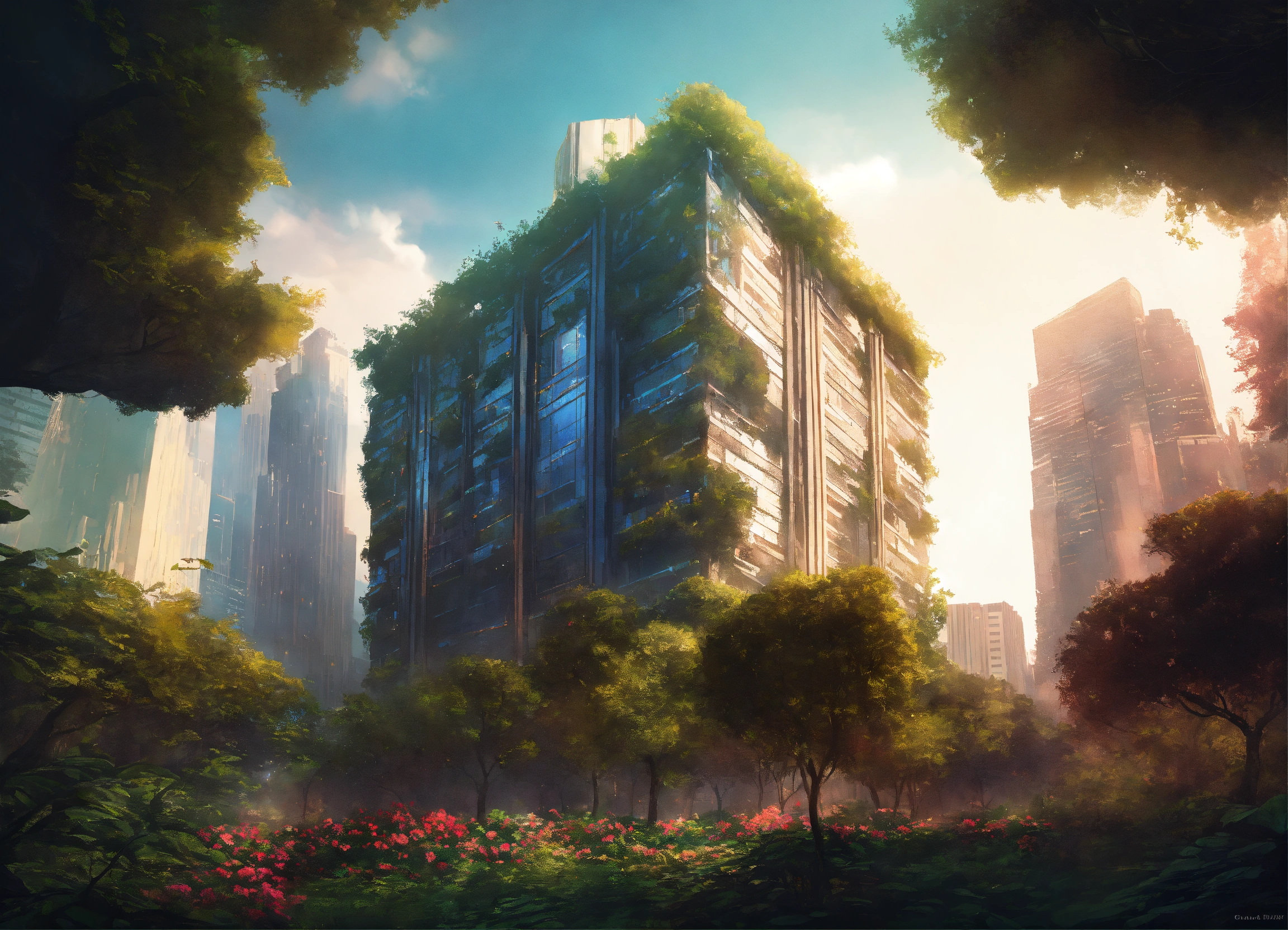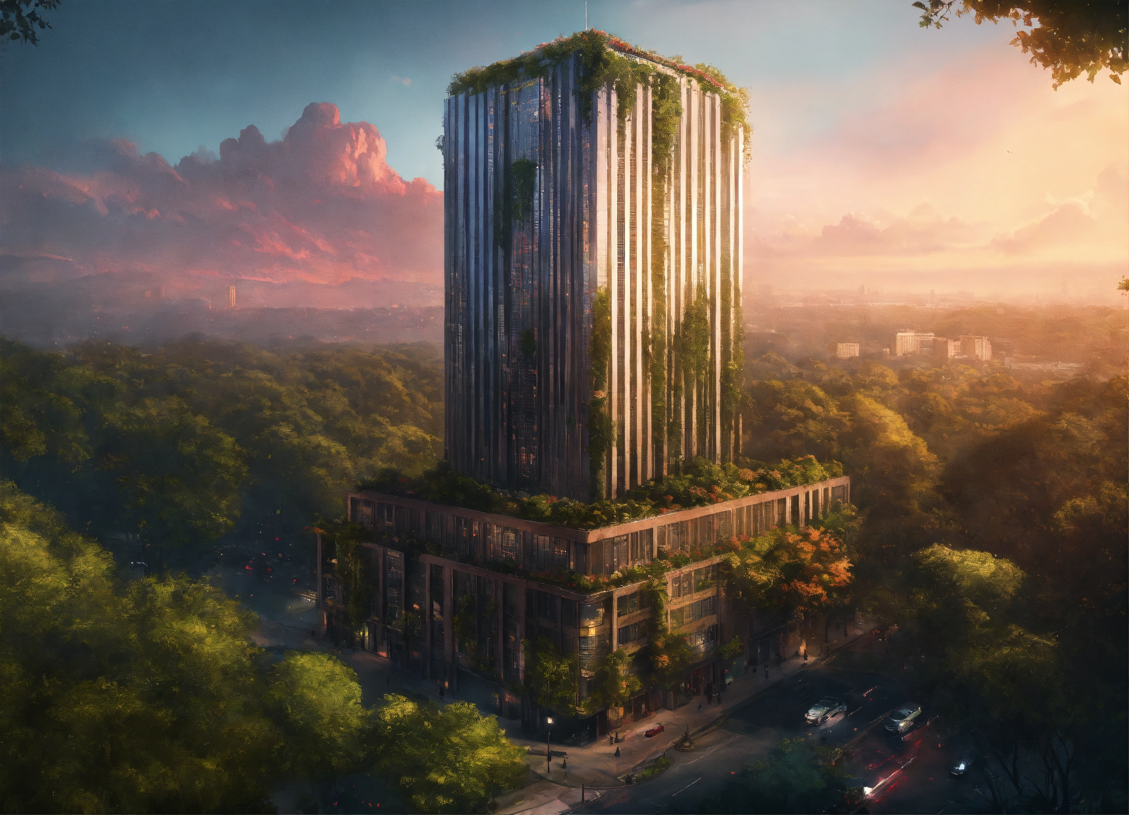 A skyscraper building in the middle of plants and trees by charlie bowater