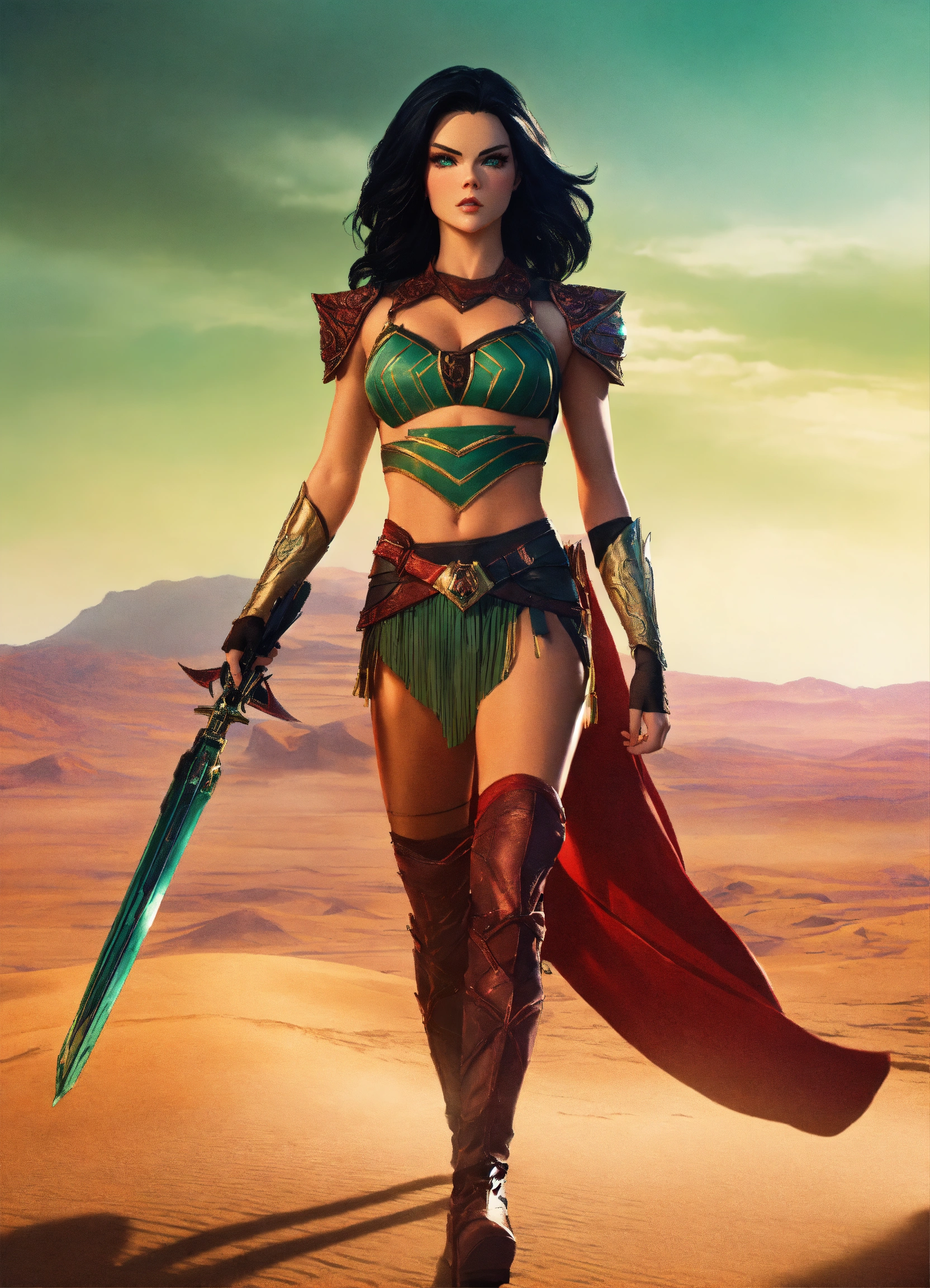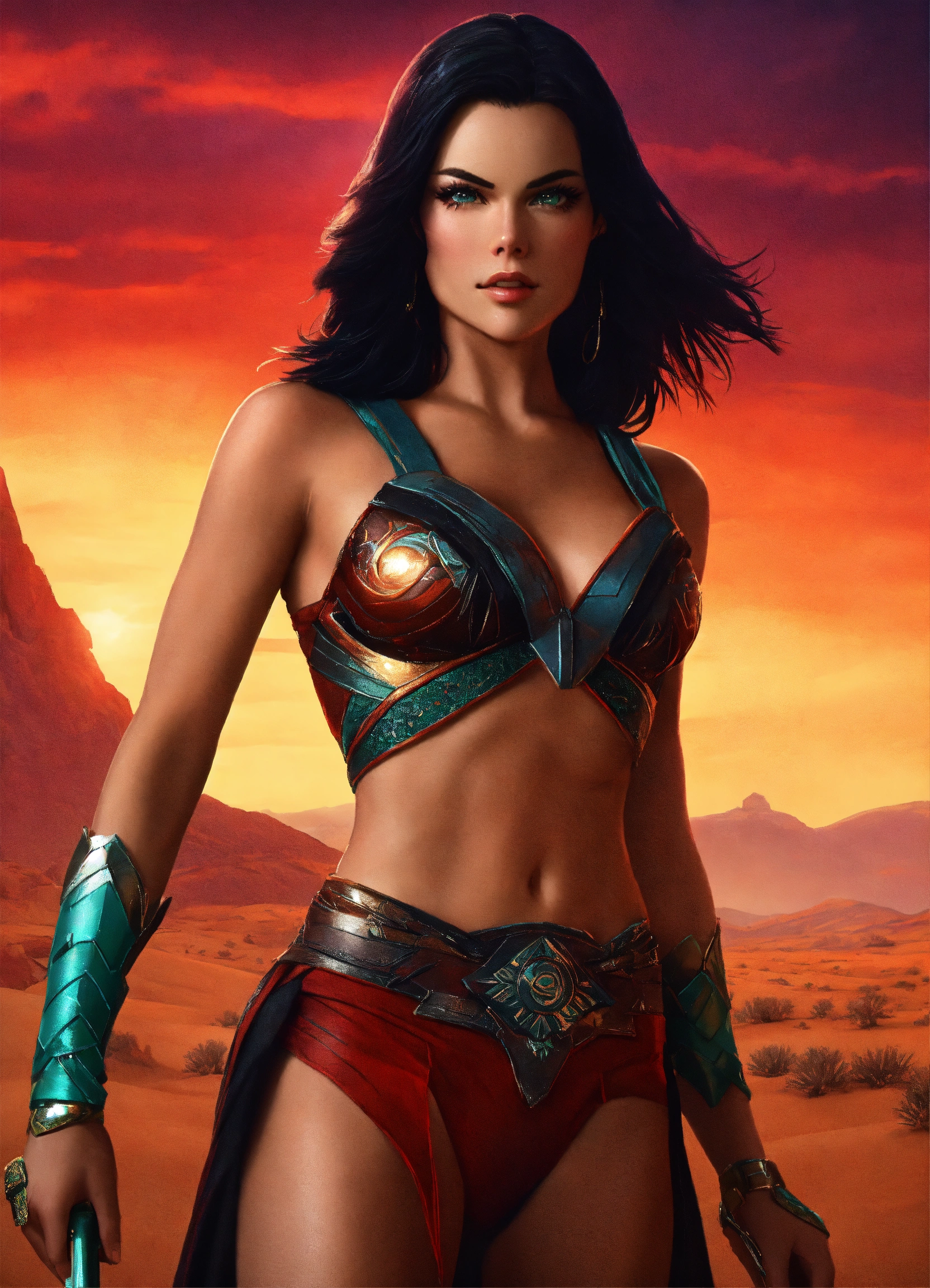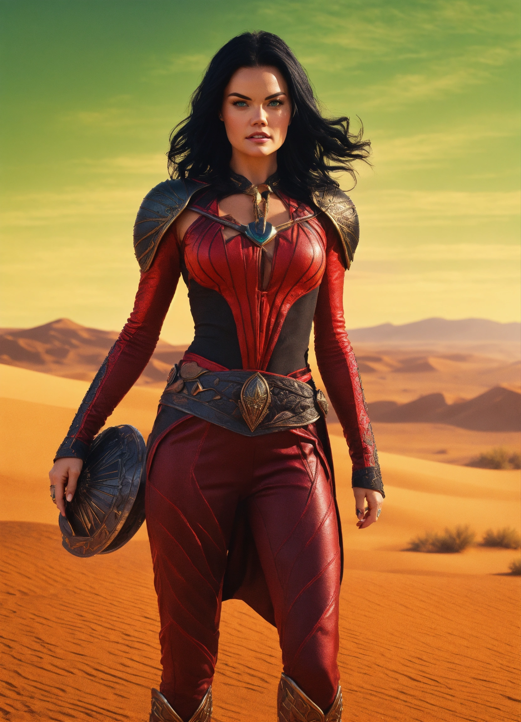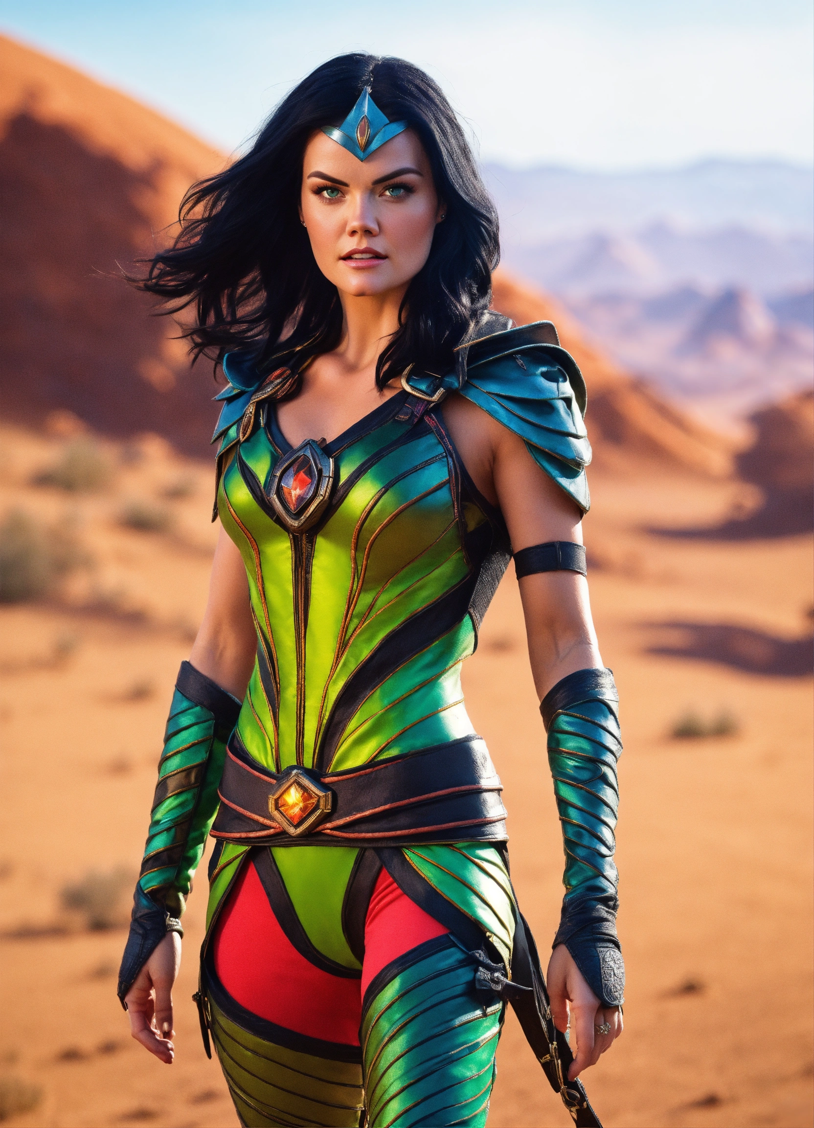 Beautiful jaimie alexander with light green eyes and long black hair, as catra of masters of the universe, dressed like catra of masters of the universe, full body, camera look, walking in a desert, 8k resolution, photorealistic, hard light photo, hyper detailed, intricately detailed