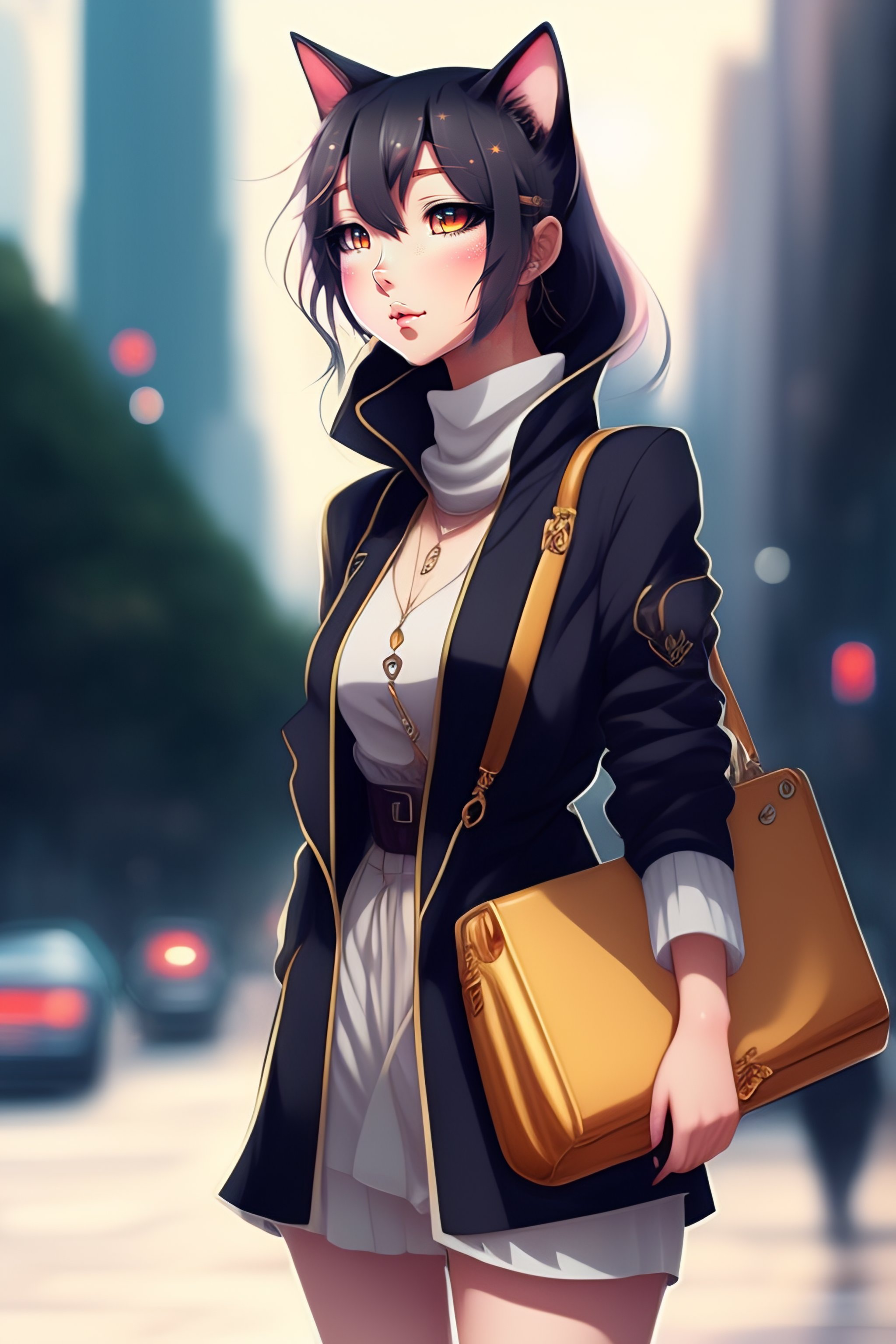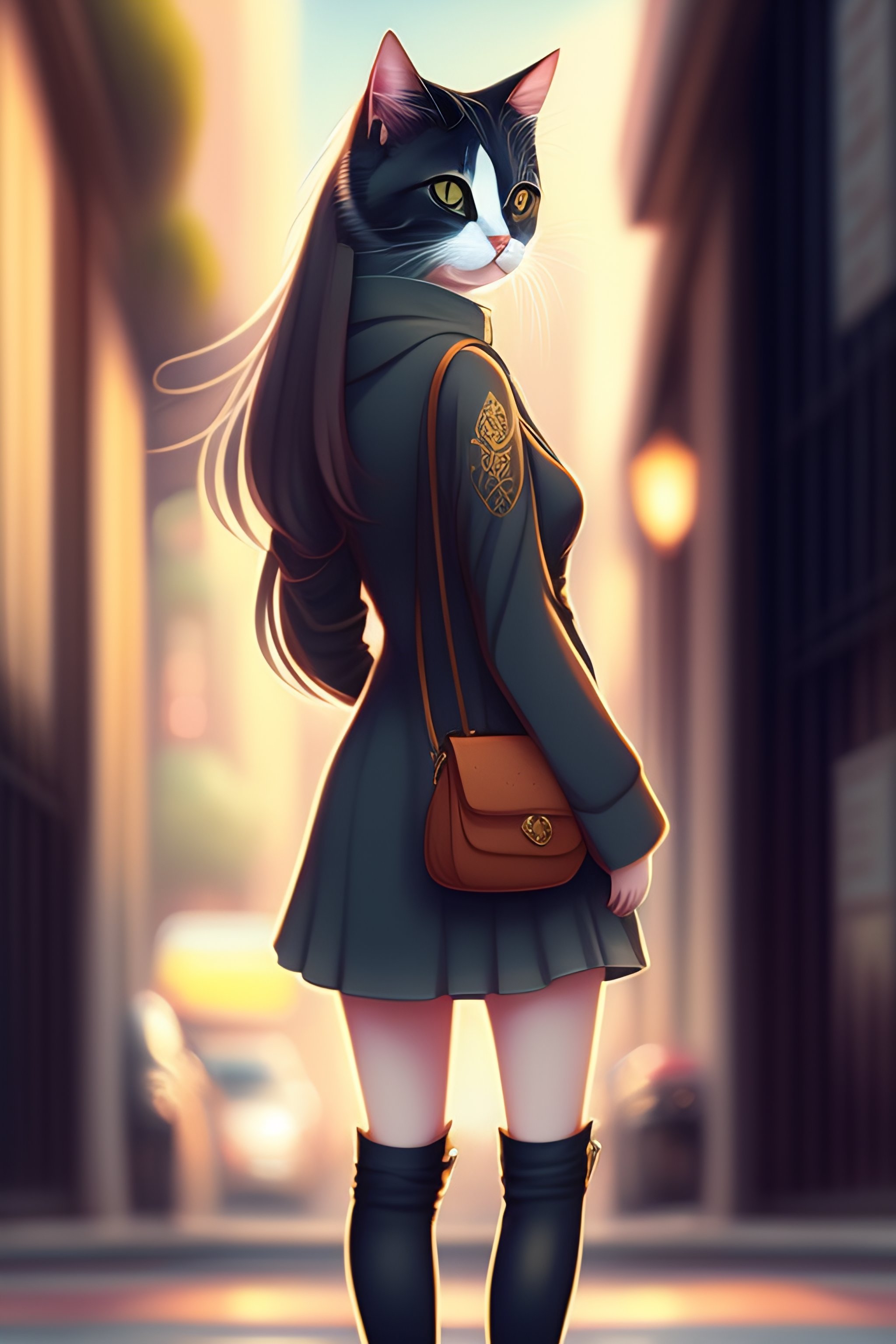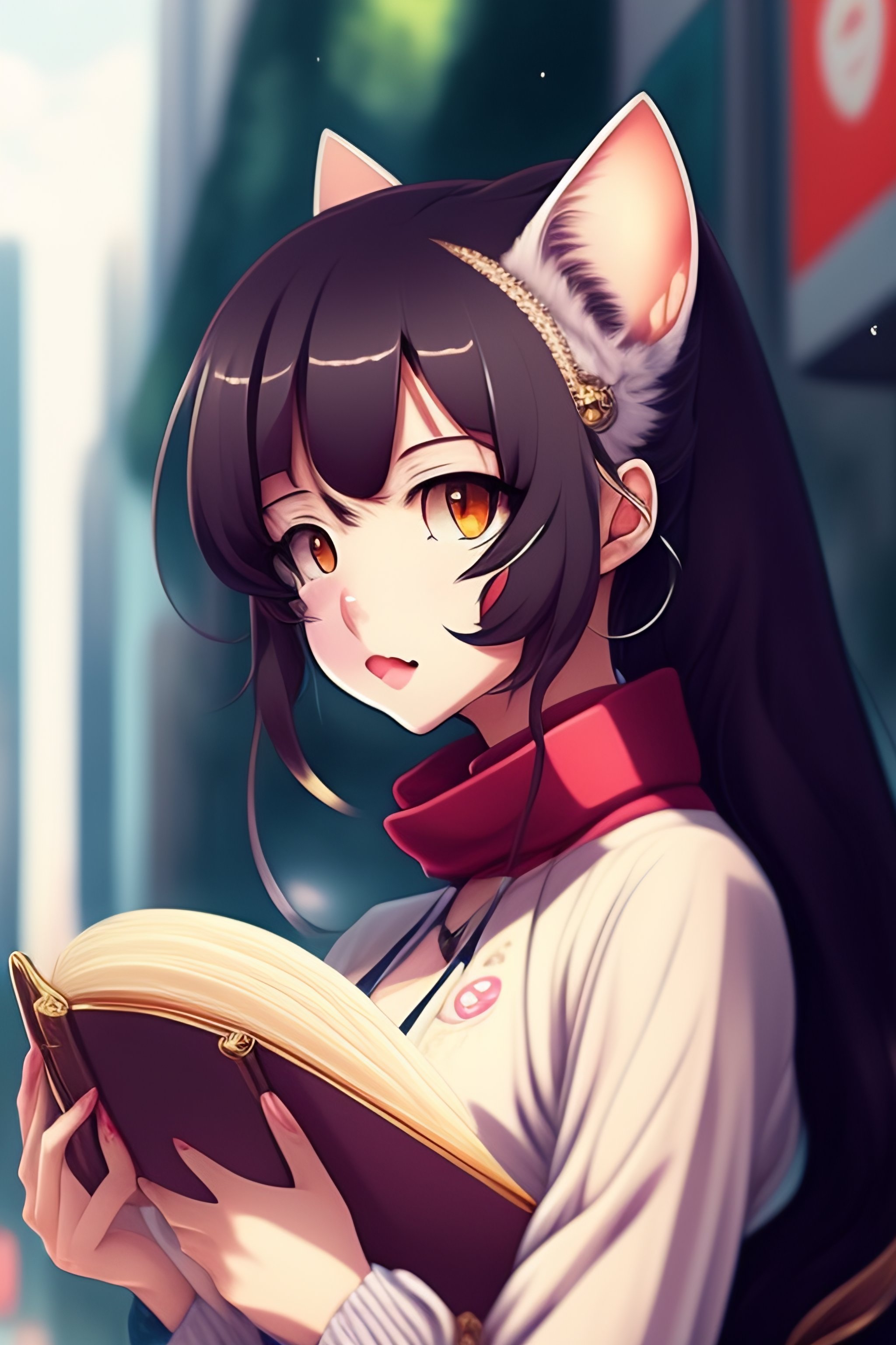 Anime style elegant cat in urban outfit, cute fine face, rounded eyes, digital painting, fan art, pixiv, with a book in hand