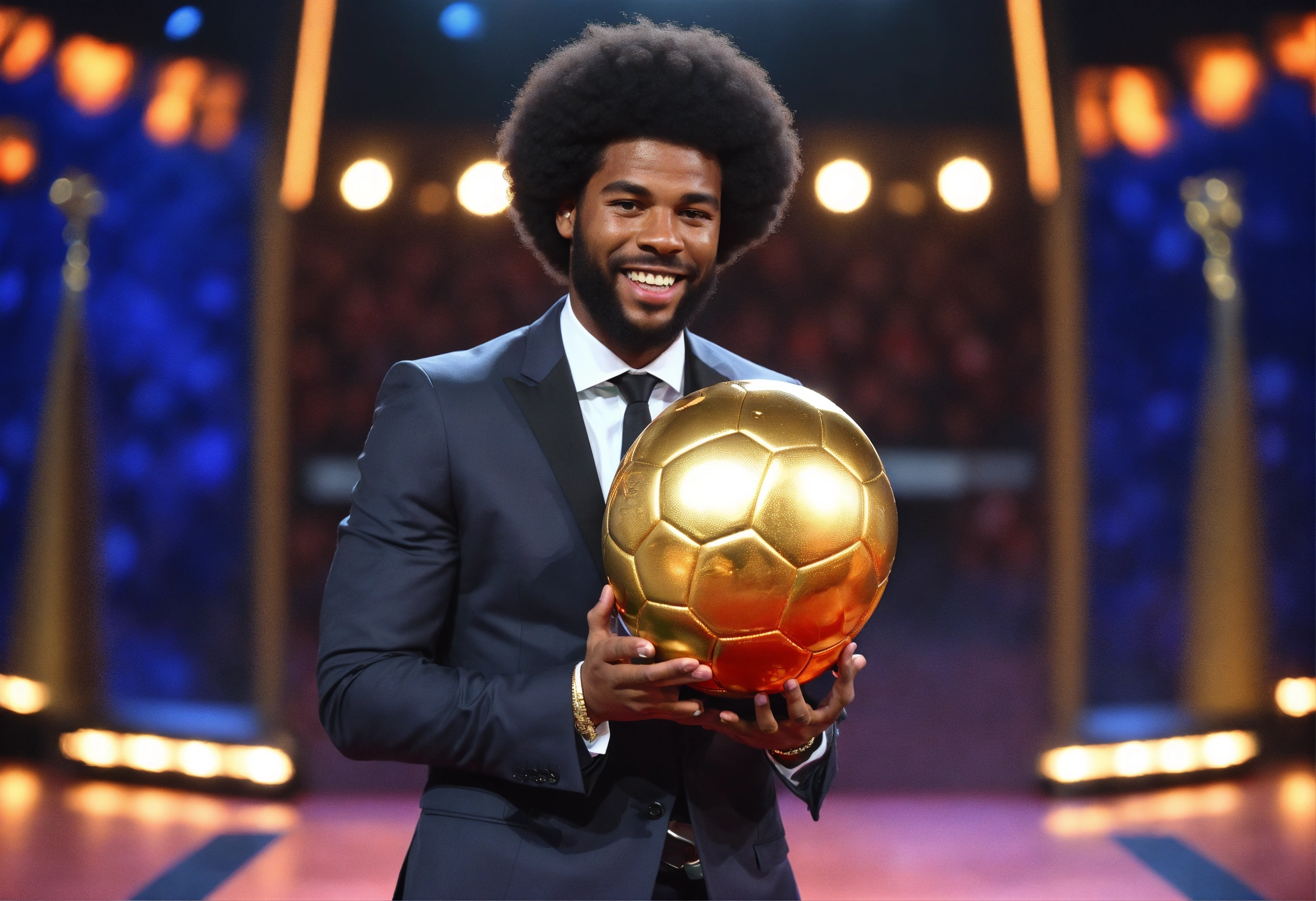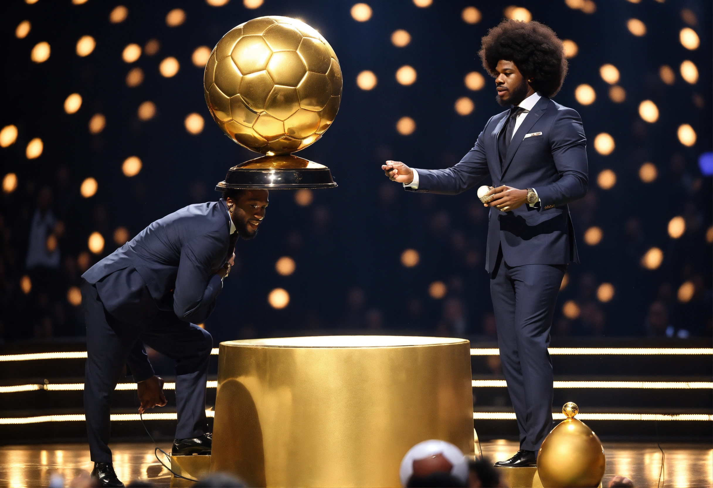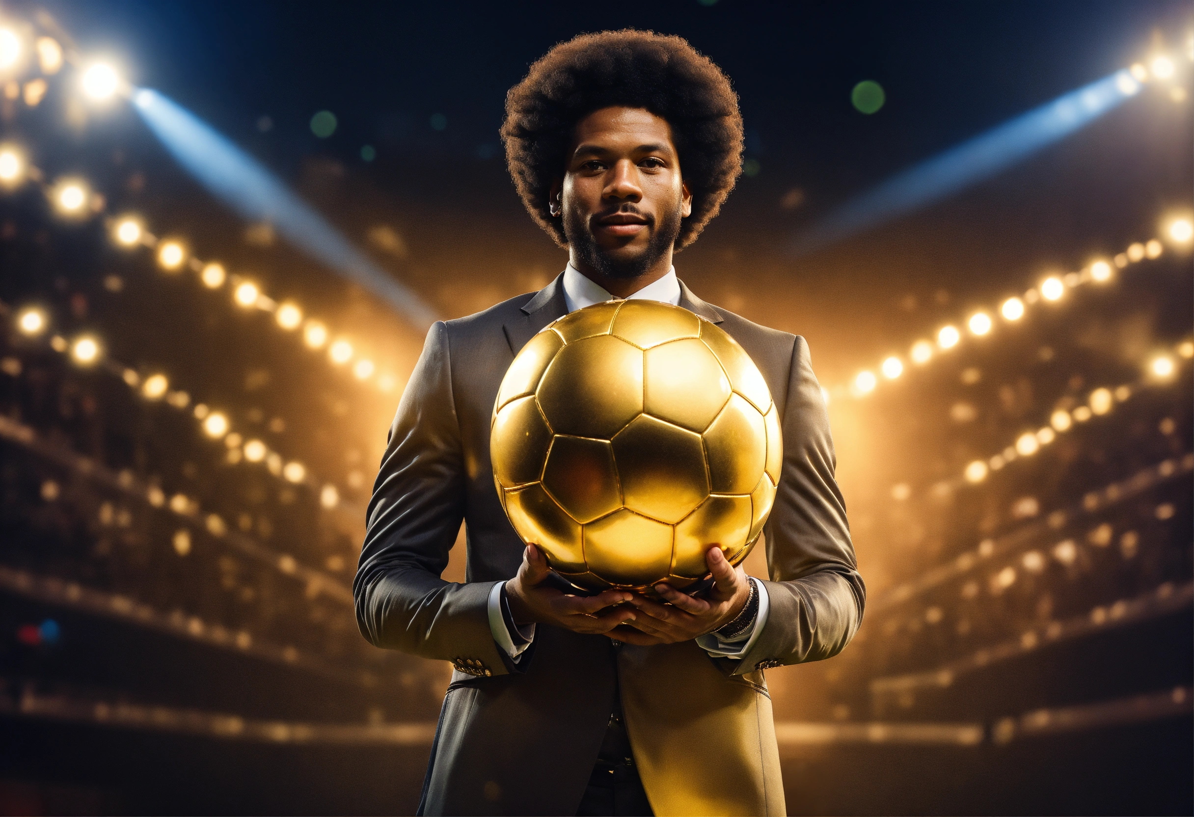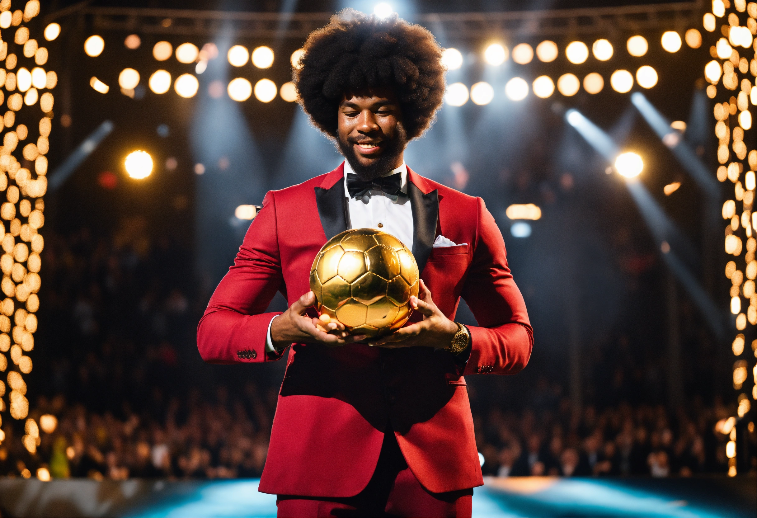 Awarding the golden ball to the best football player, on stage, half of the body is visible, a cute man in a suit, black hair, afro man