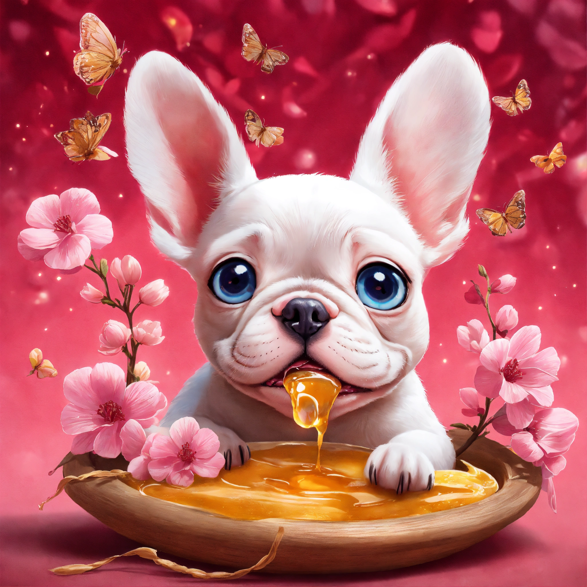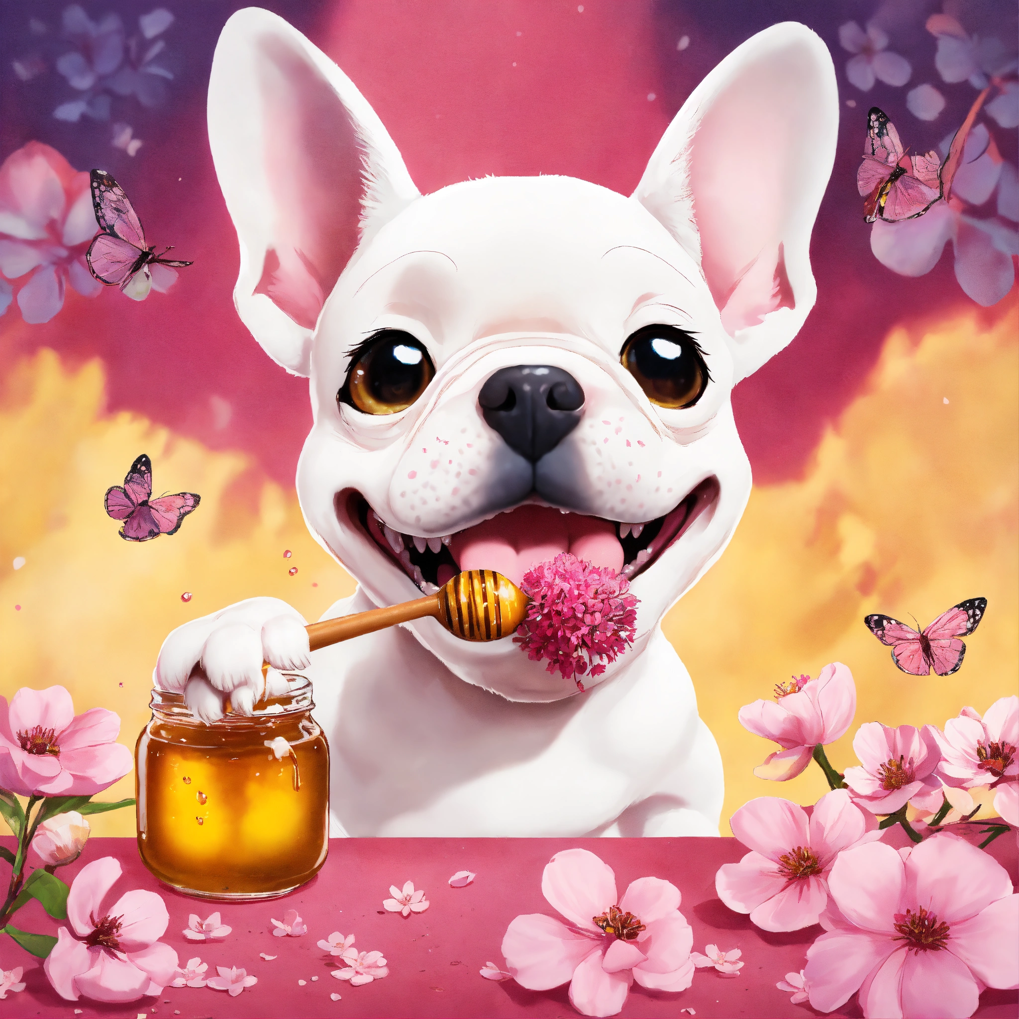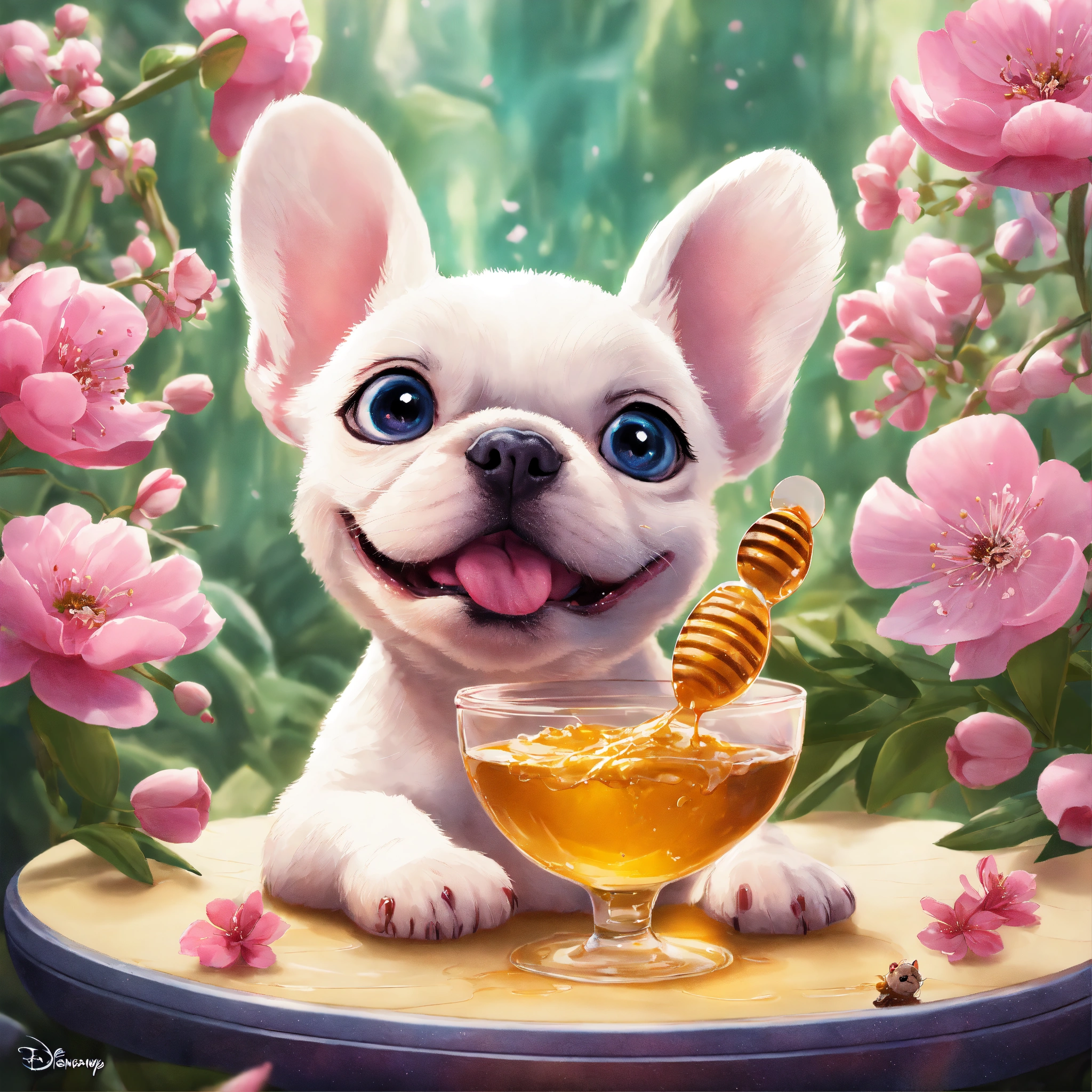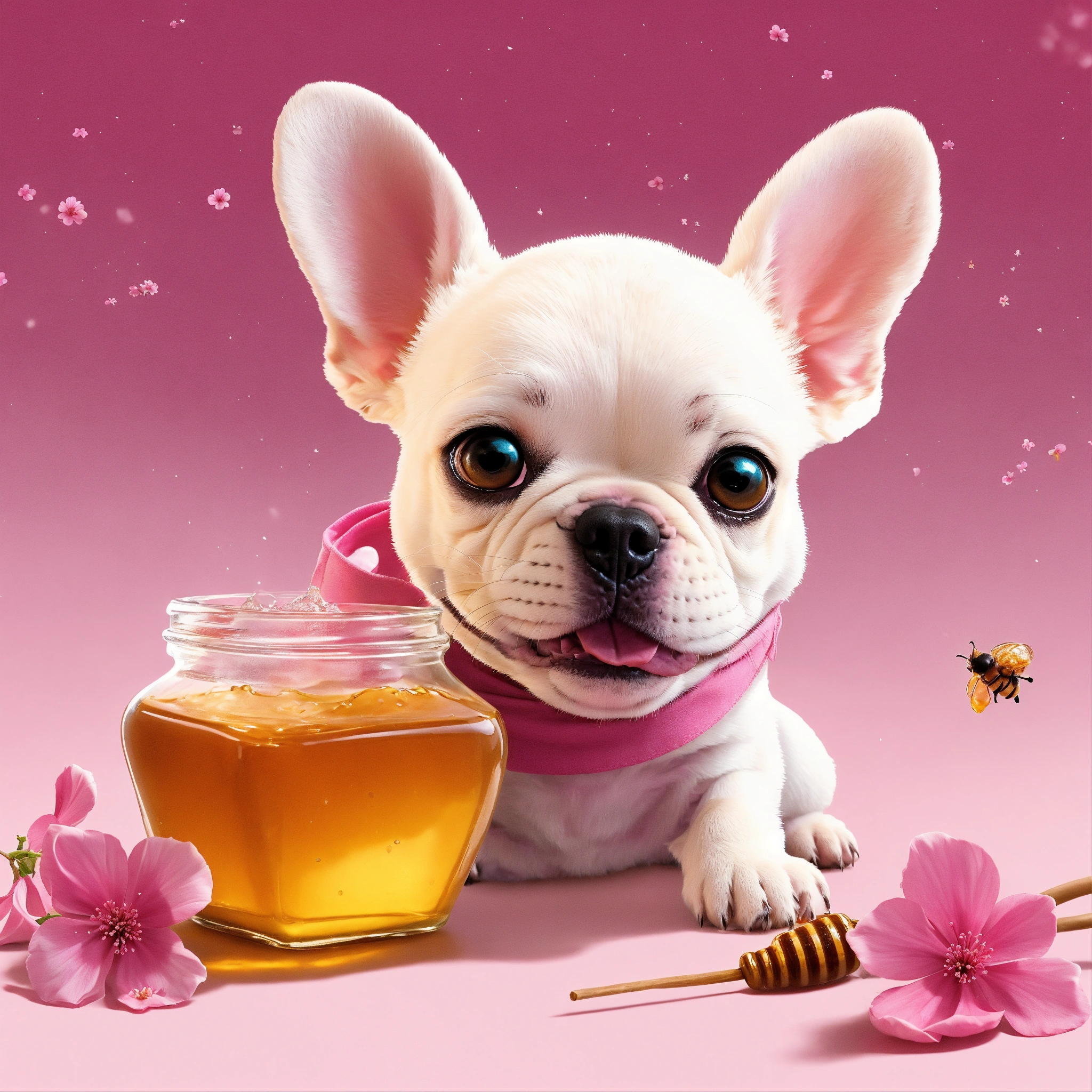 A disney pixar inspired surrealistic movie poster. a white french bulldog puppy, that is licking honey. the scene should be in pixar's digital art style, emphasizing the characters expressions, pink manuka flowers, white background, big eyes, detailed characteristics of their animations.