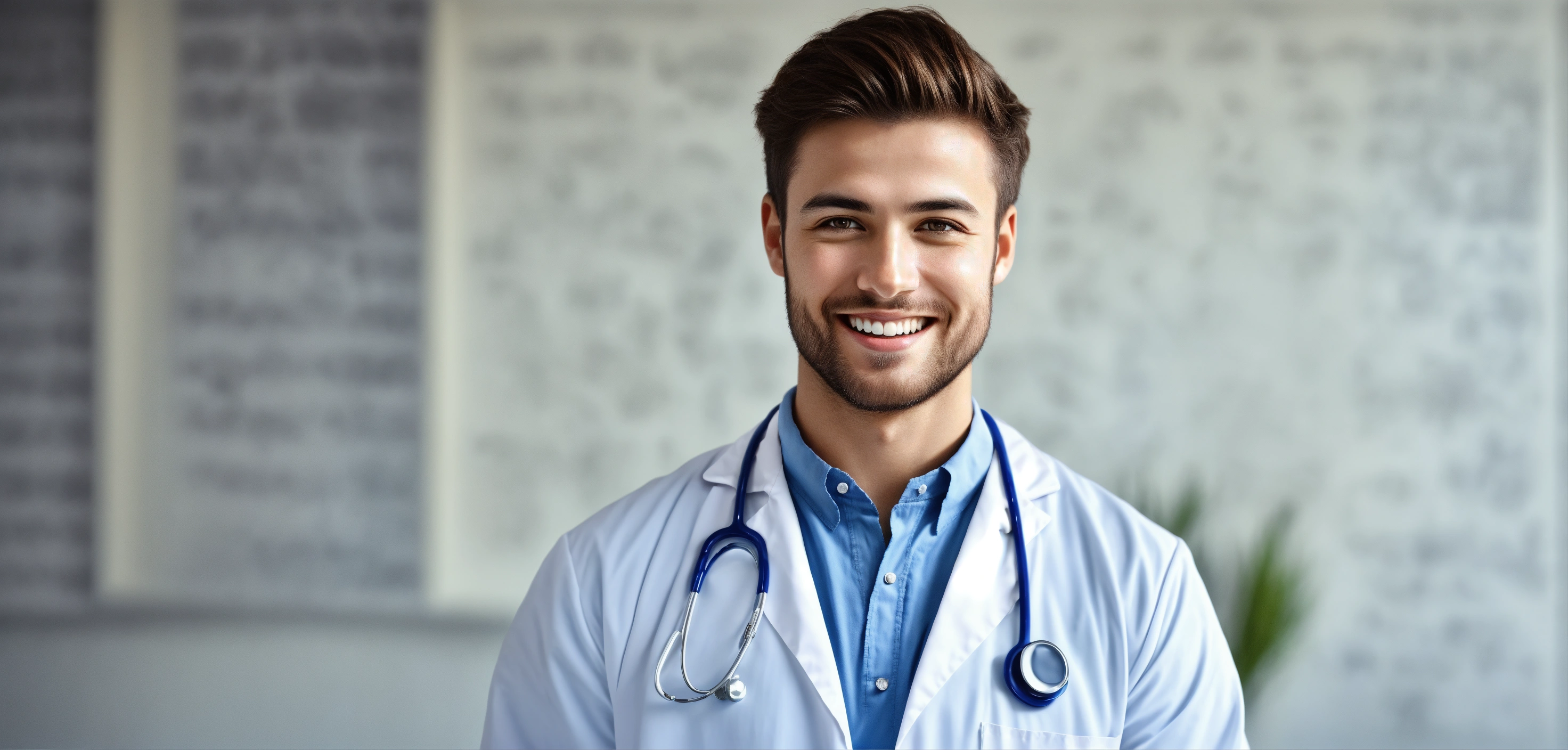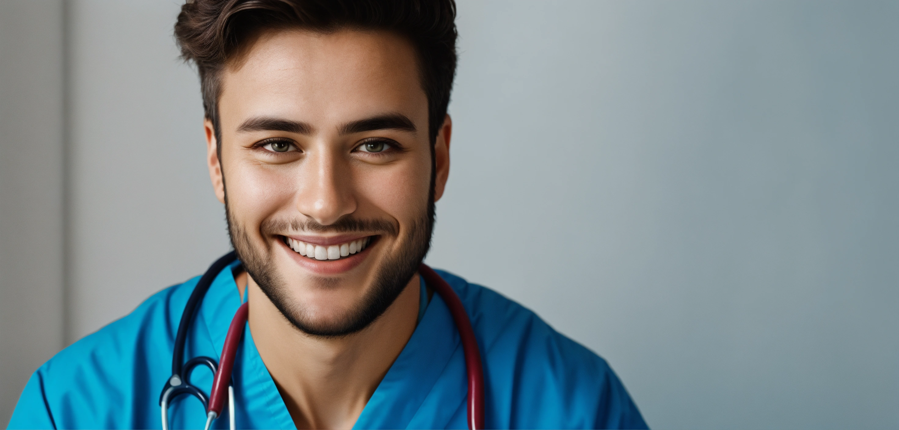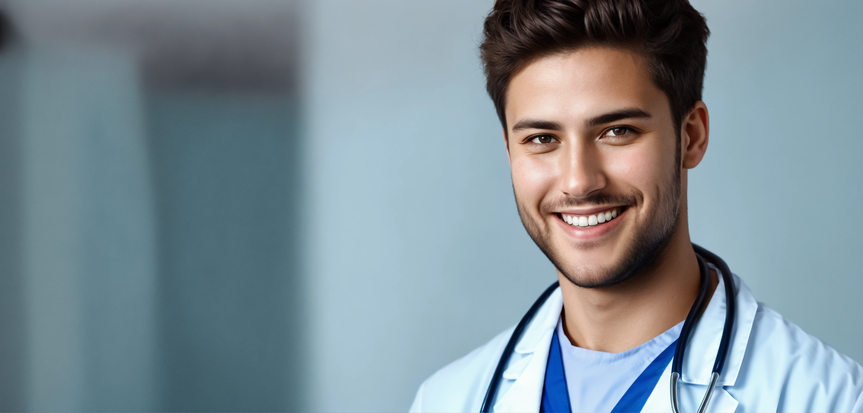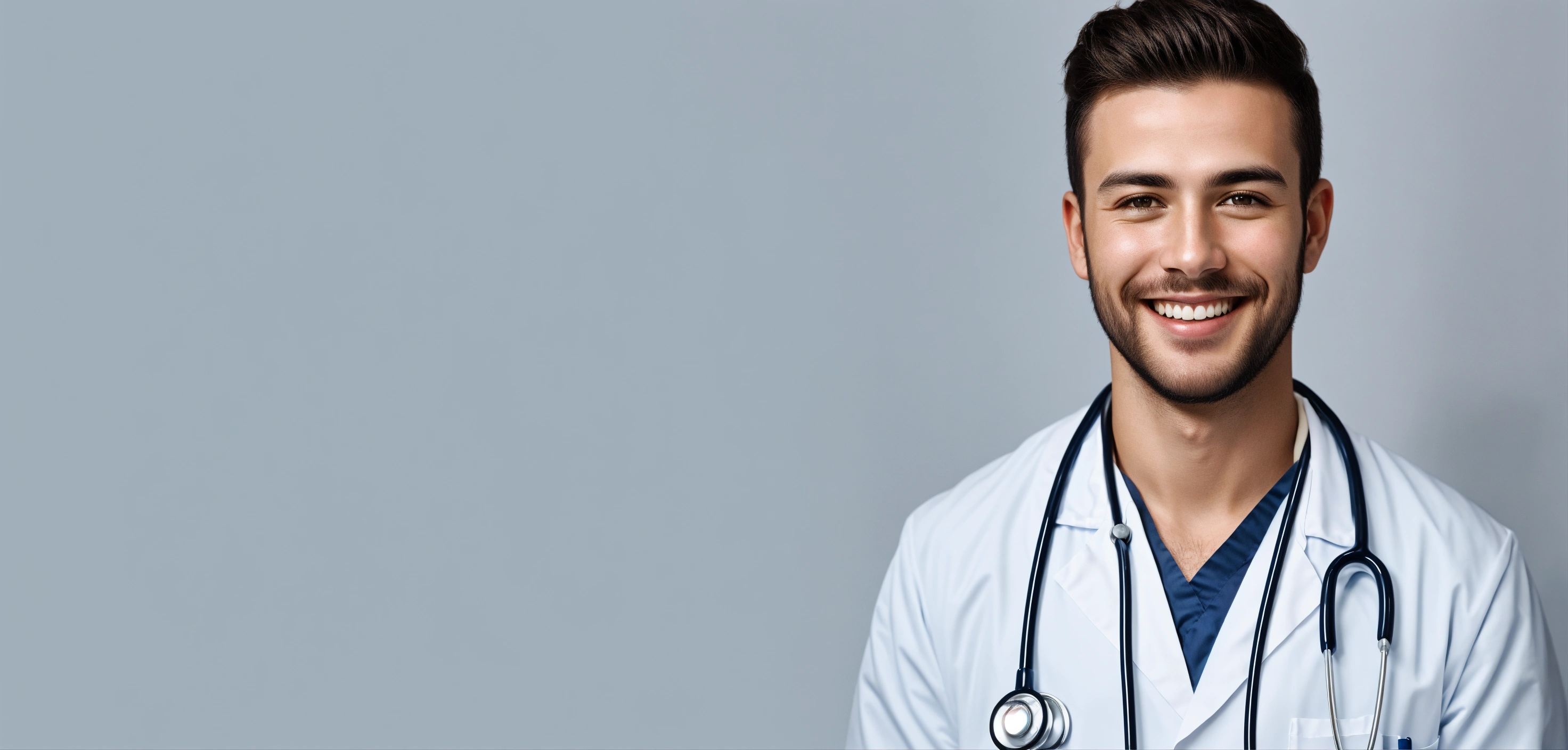Headshot portrait of smiling young doctor looking at camera over studio background against white studio wall background with copy space for text advertisement, max photorealism, photography style, max face realism