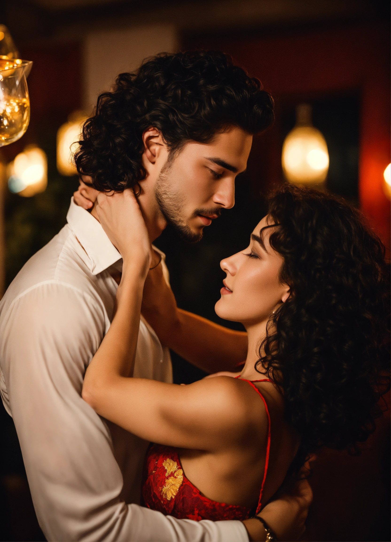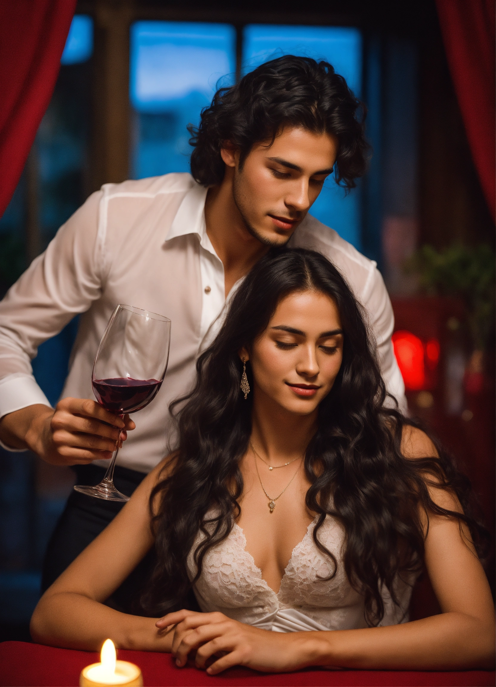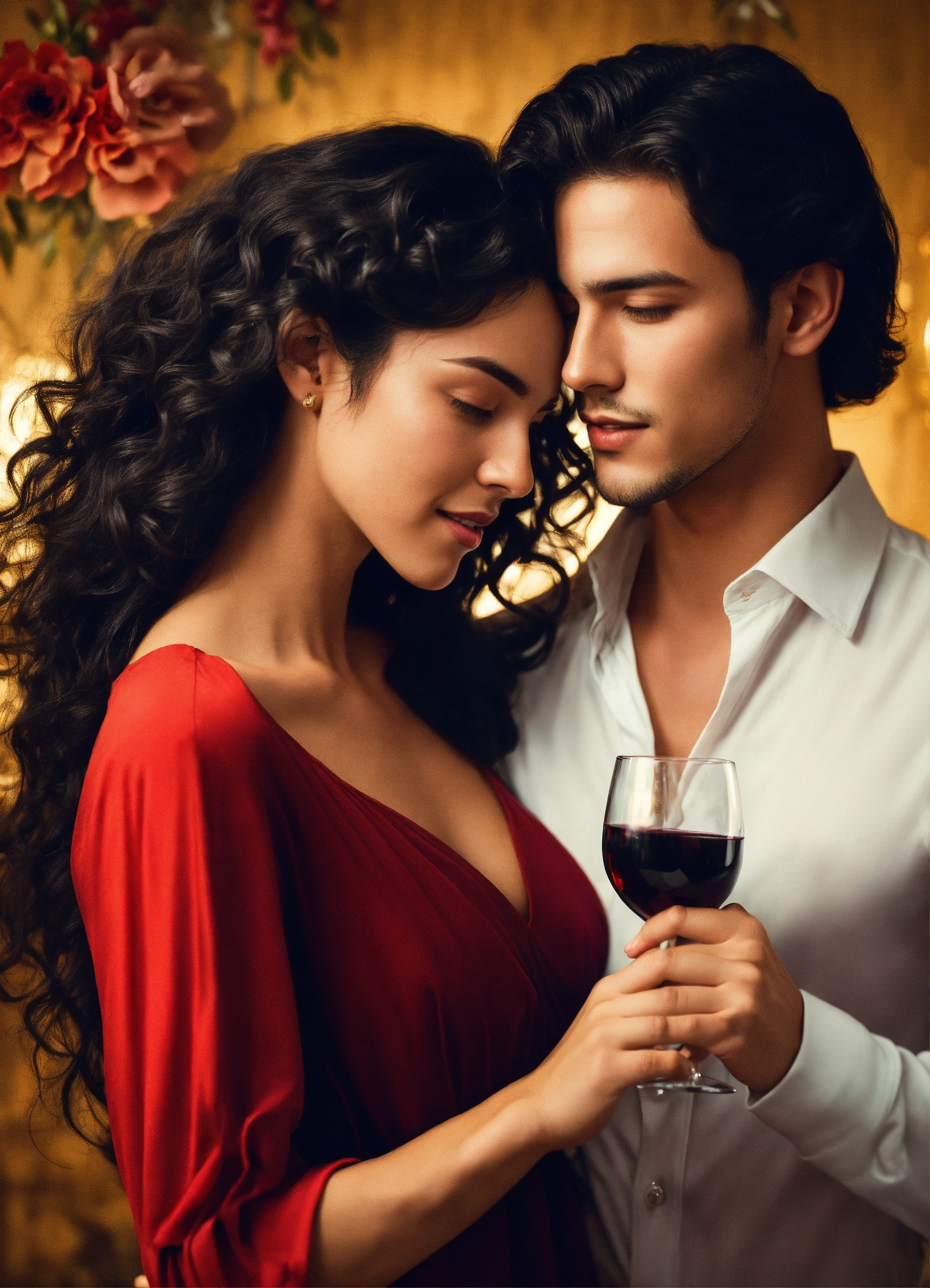 A young handsome man with black hair, 30 years, he wears a white shirt, spain, young beautiful woman, 30 years, the woman has long black curly hair, dress with carmen neckline, she holds a filled glass of red wine in her hand, she looks dreamily into the eyes of a young man